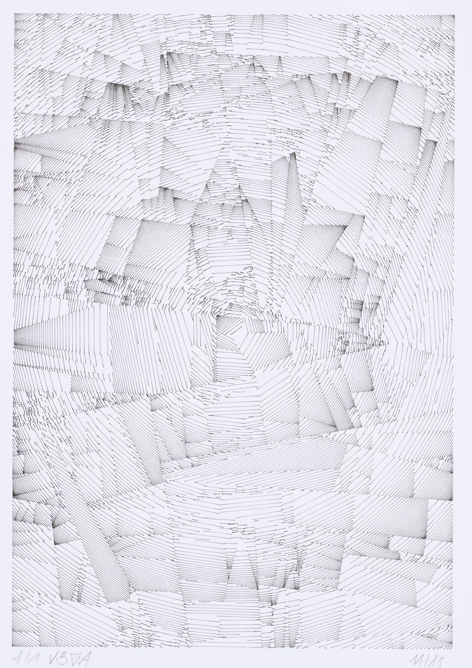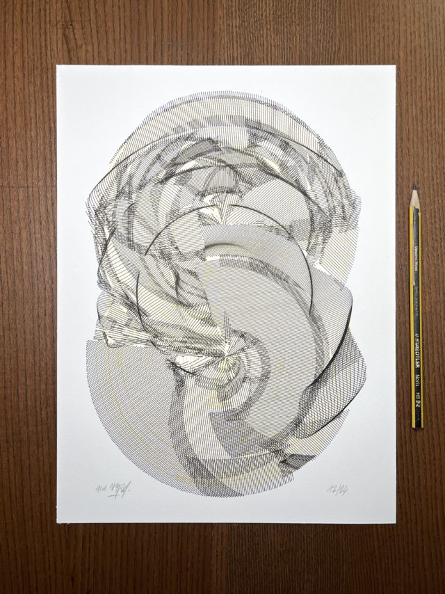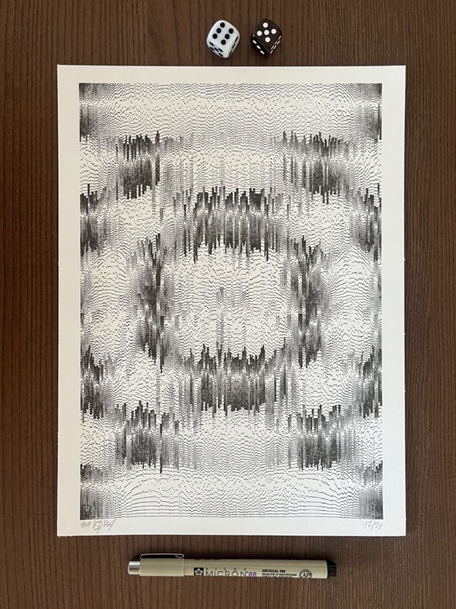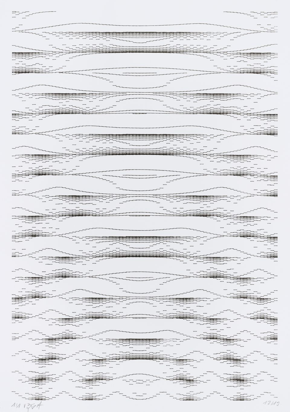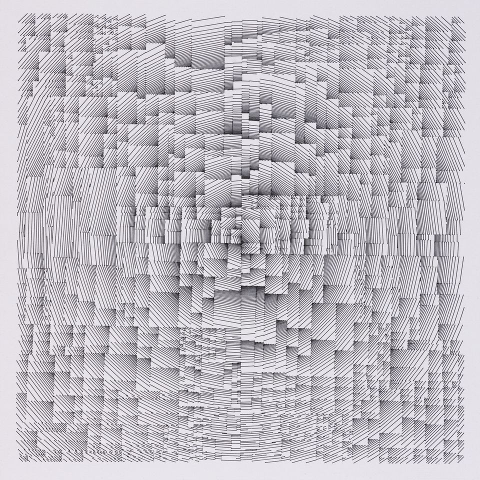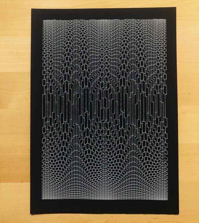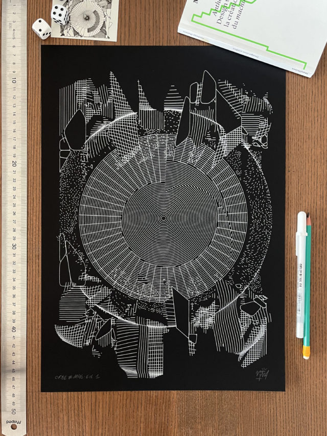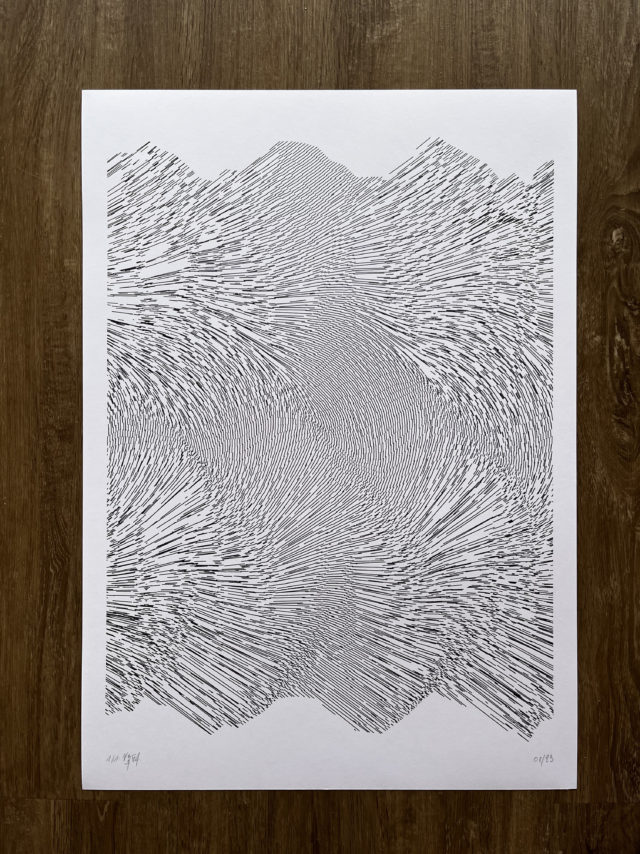 The algorithm used in these artworks starts from a rectangular grid whose cells are filled with lines, the density and orientation of which are modulated depending on their position relative to a epicentre, leading to those rhythmic and symmetrical compositions evoking the propagation of an abstract wave onto the drawing surface.