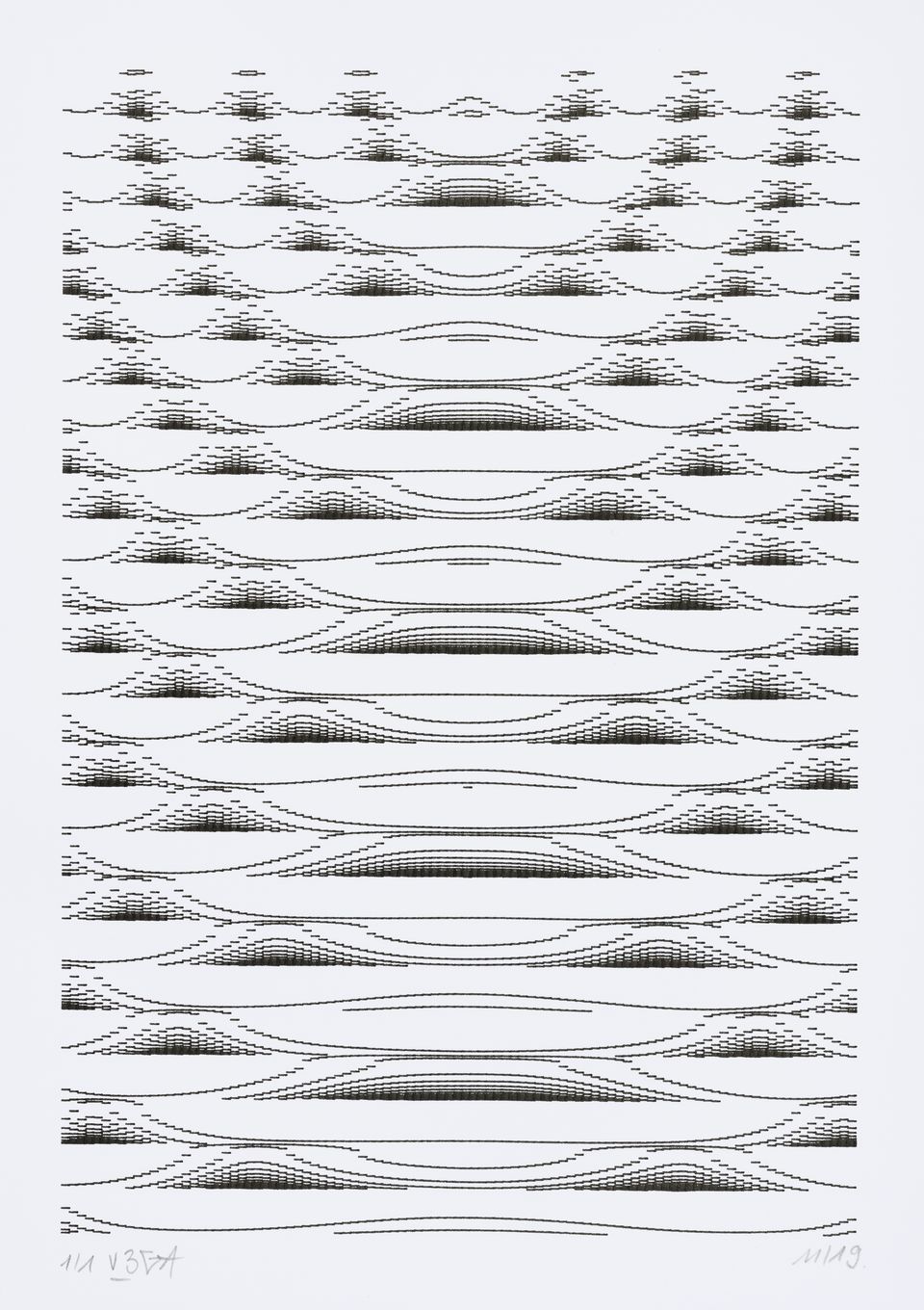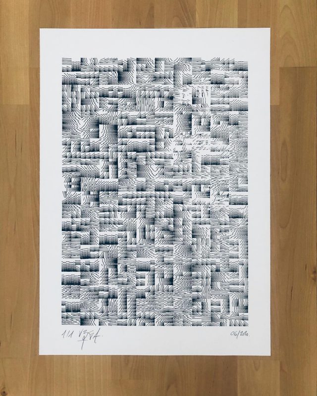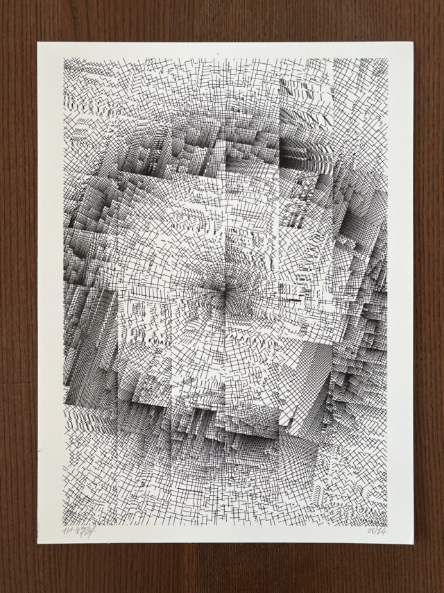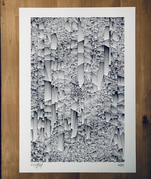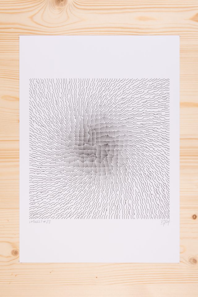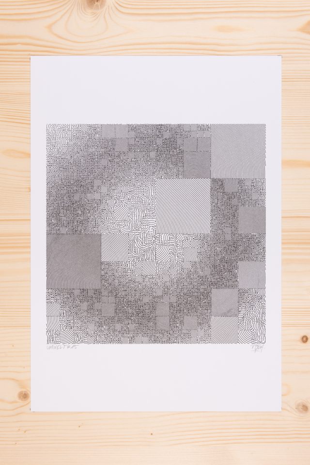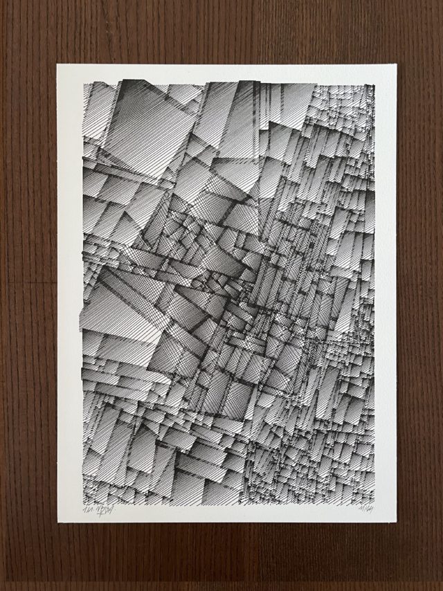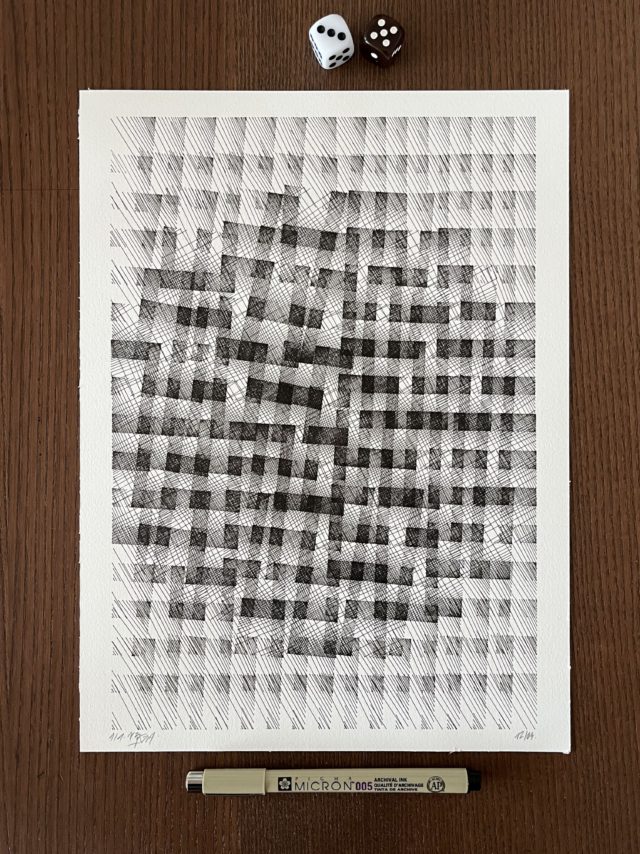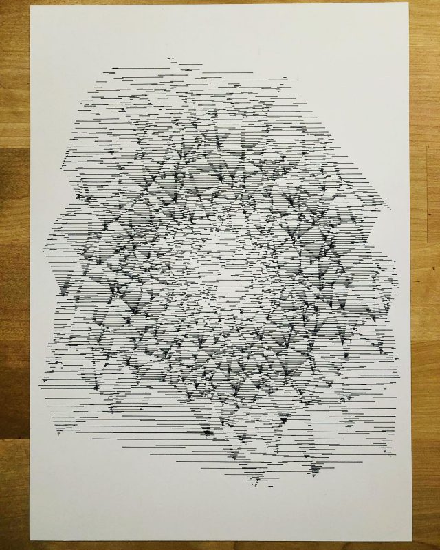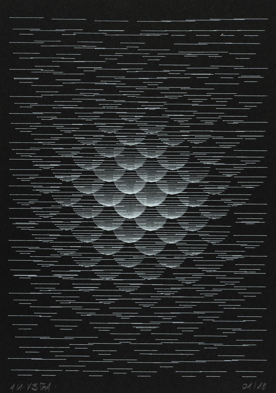 The algorithm used in these artworks starts from a rectangular grid whose cells are filled with lines, the density and orientation of which are modulated depending on their position relative to a epicentre, leading to those rhythmic and symmetrical compositions evoking the propagation of an abstract wave onto the drawing surface.