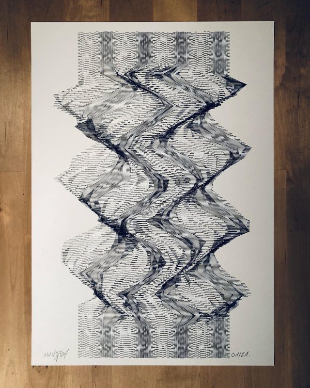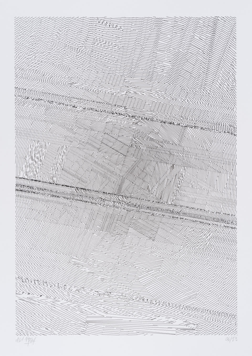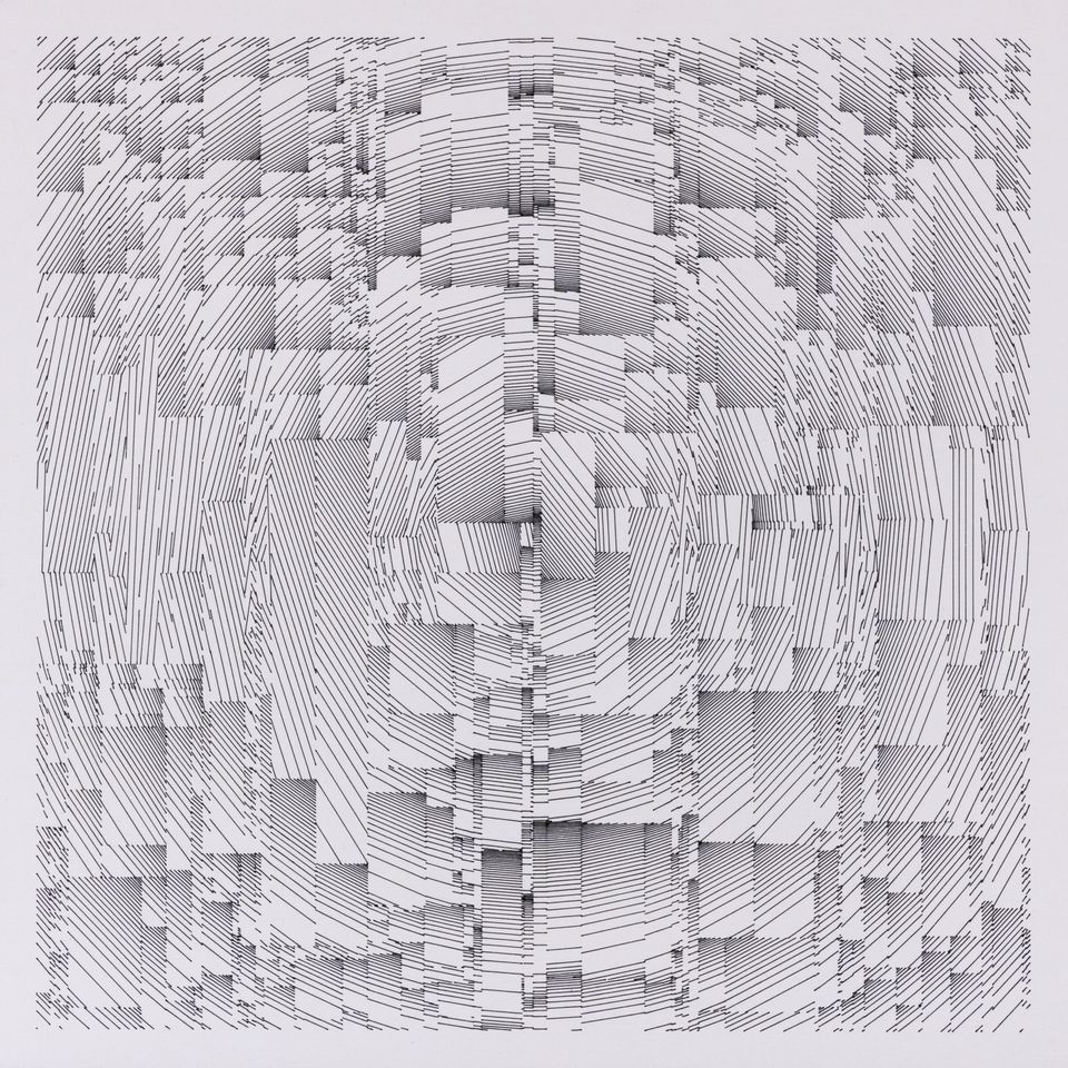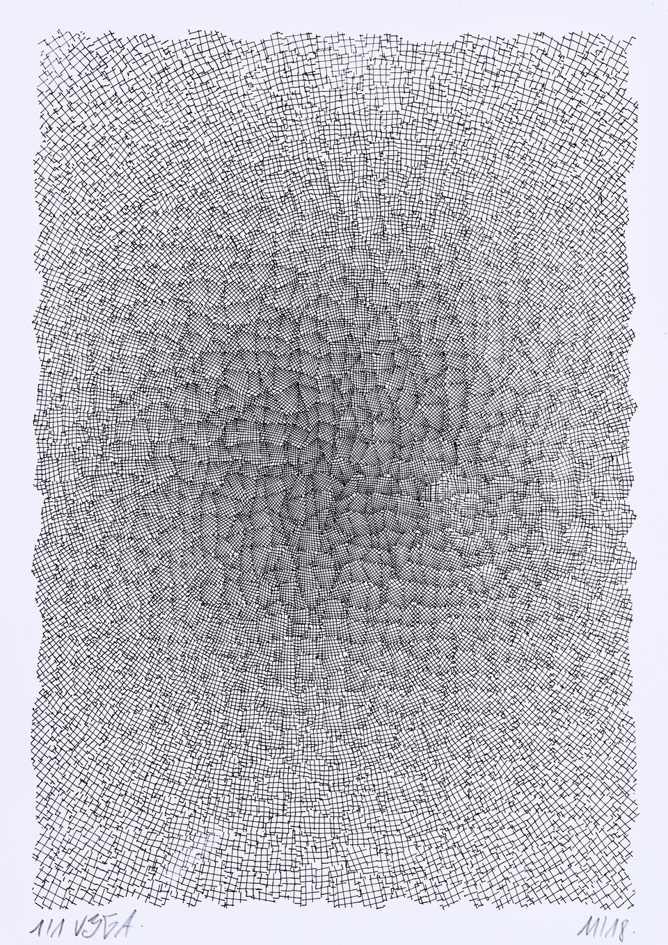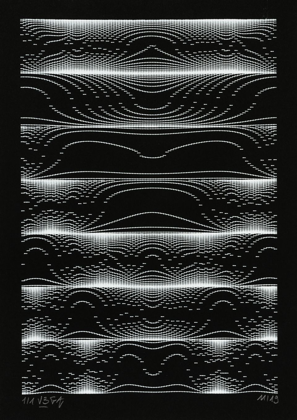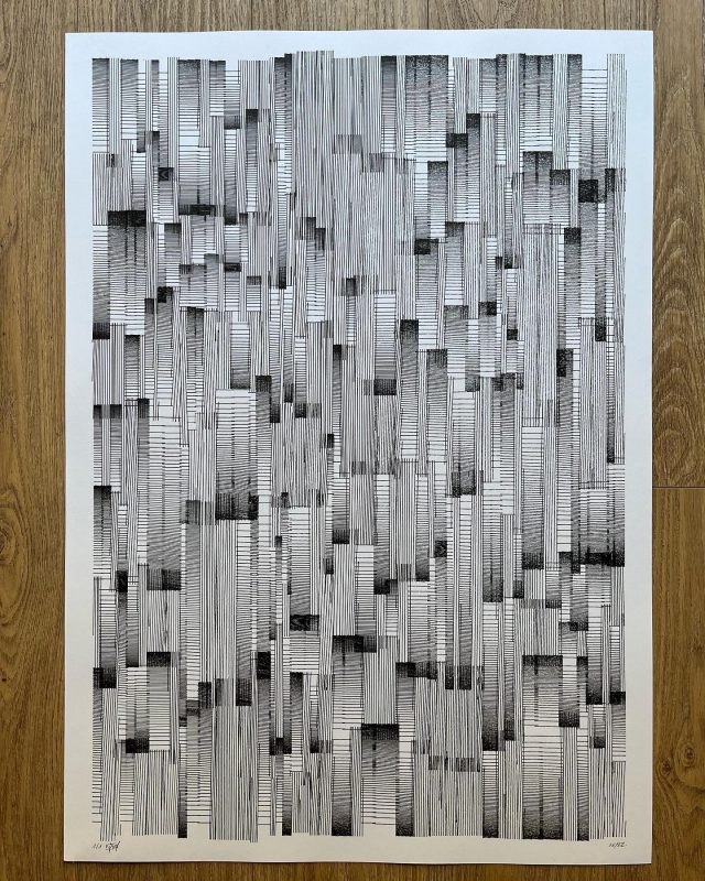 The algorithm used in these artworks starts from a rectangular grid whose cells are filled with lines, the density and orientation of which are modulated depending on their position relative to a epicentre, leading to those rhythmic and symmetrical compositions evoking the propagation of an abstract wave onto the drawing surface.