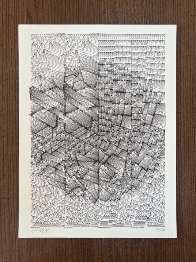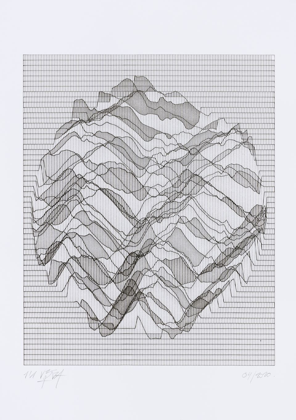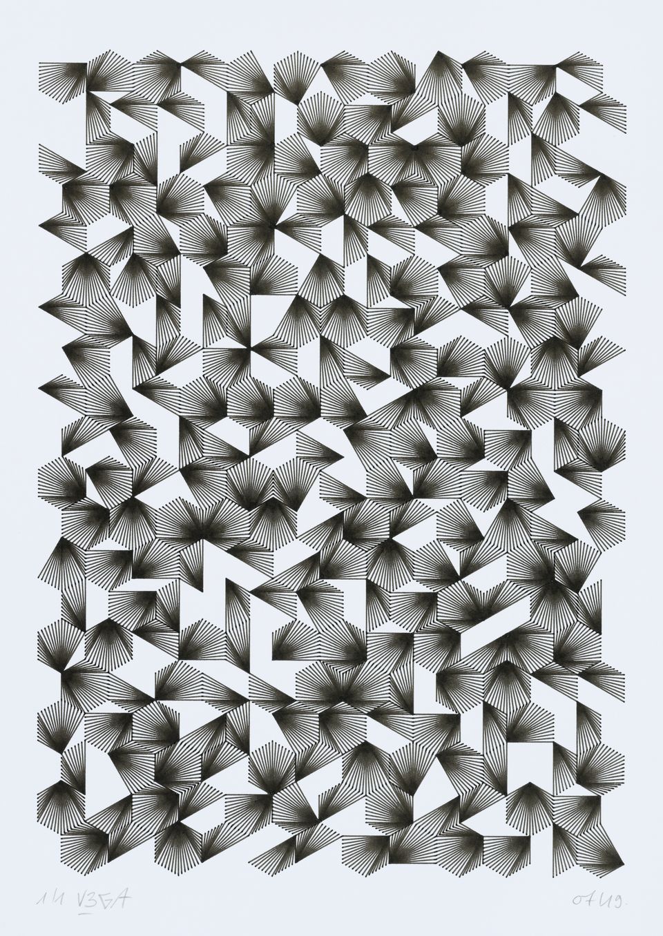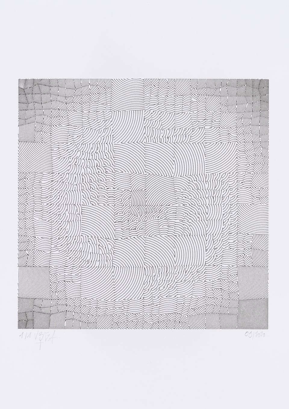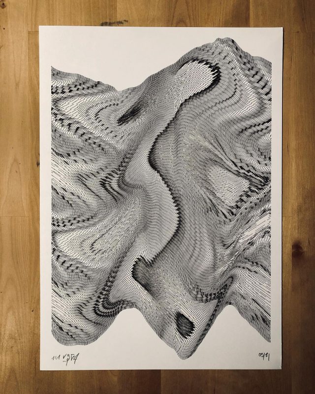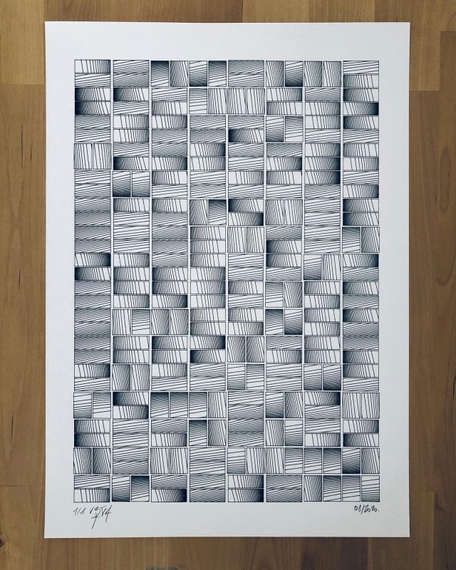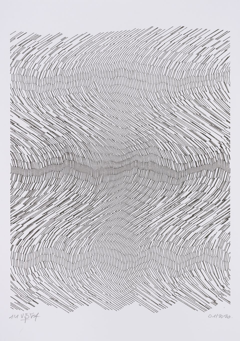 The algorithm used in these artworks starts from a rectangular grid whose cells are filled with lines, the density and orientation of which are modulated depending on their position relative to a epicentre, leading to those rhythmic and symmetrical compositions evoking the propagation of an abstract wave onto the drawing surface.