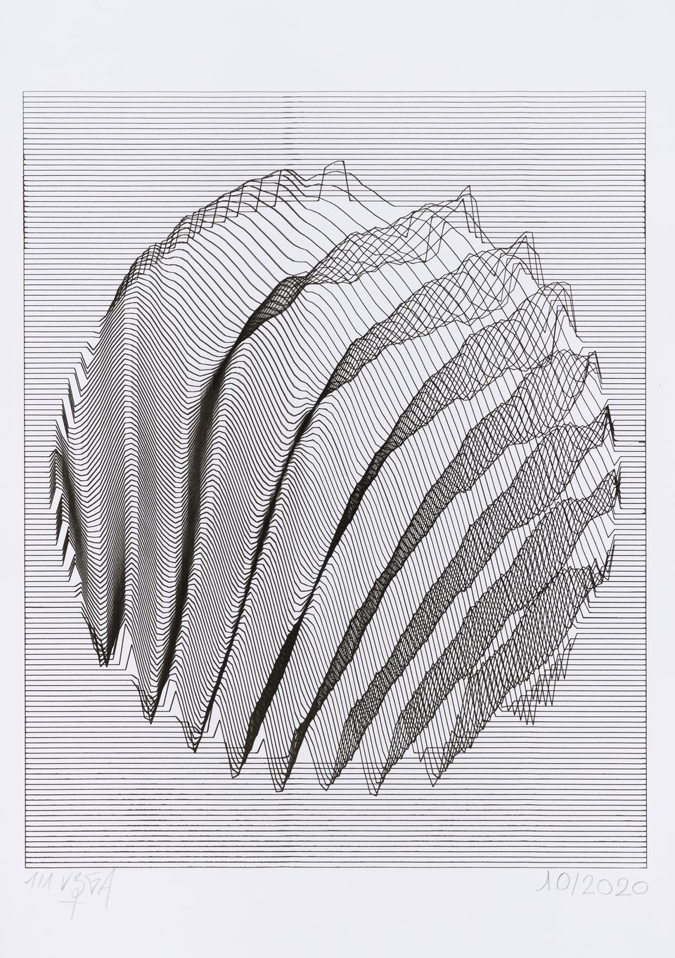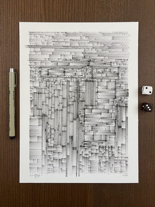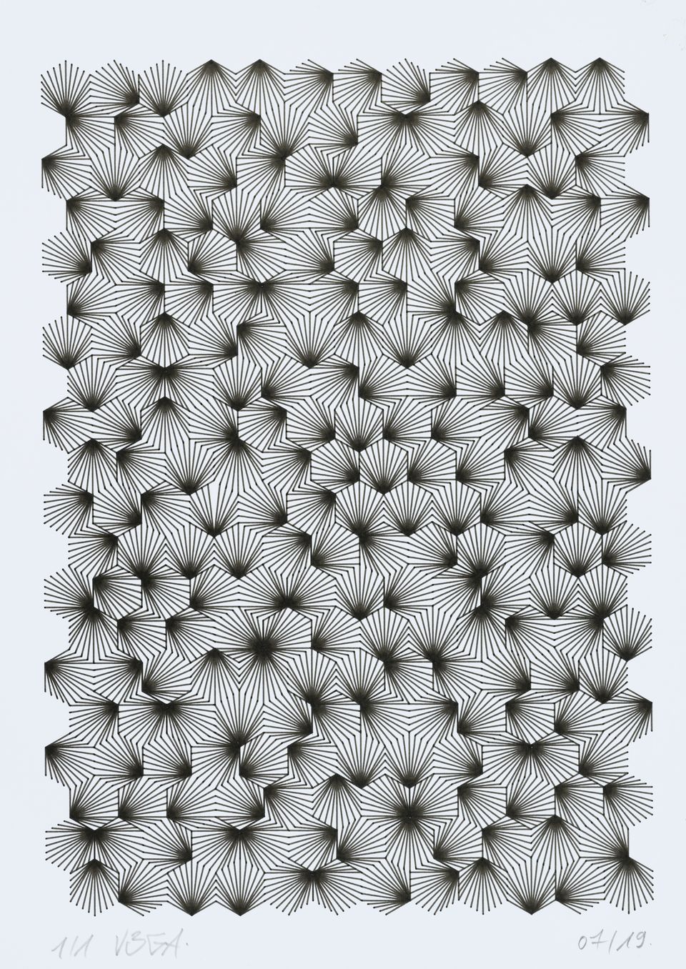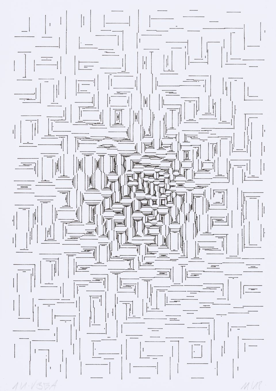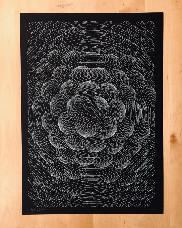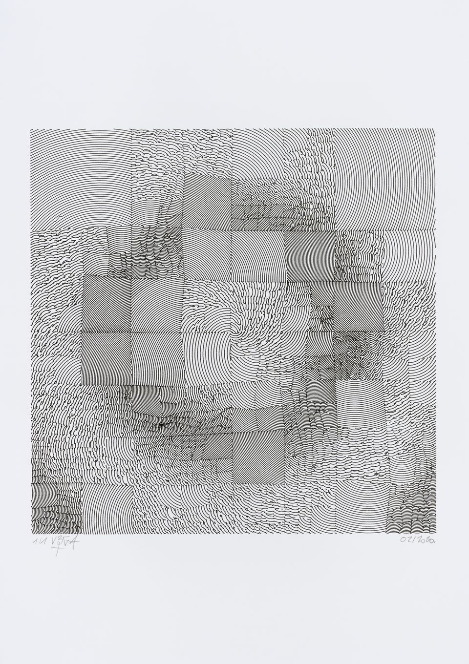 The algorithm used in these artworks starts from a rectangular grid whose cells are filled with lines, the density and orientation of which are modulated depending on their position relative to a epicentre, leading to those rhythmic and symmetrical compositions evoking the propagation of an abstract wave onto the drawing surface.