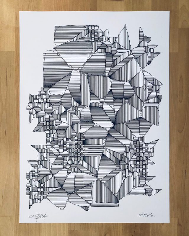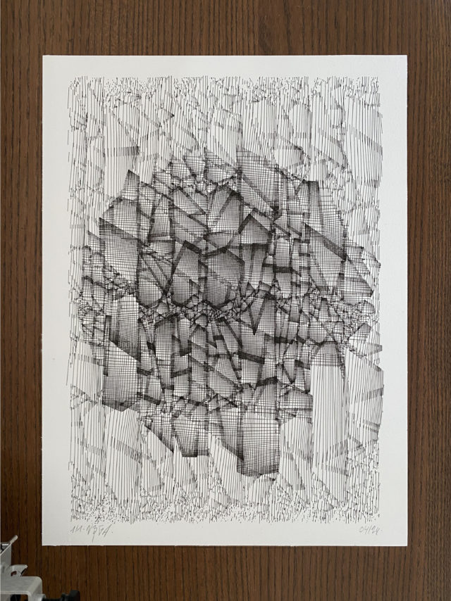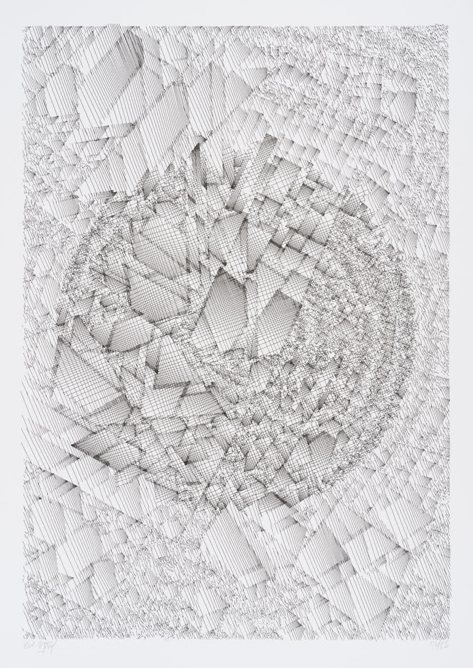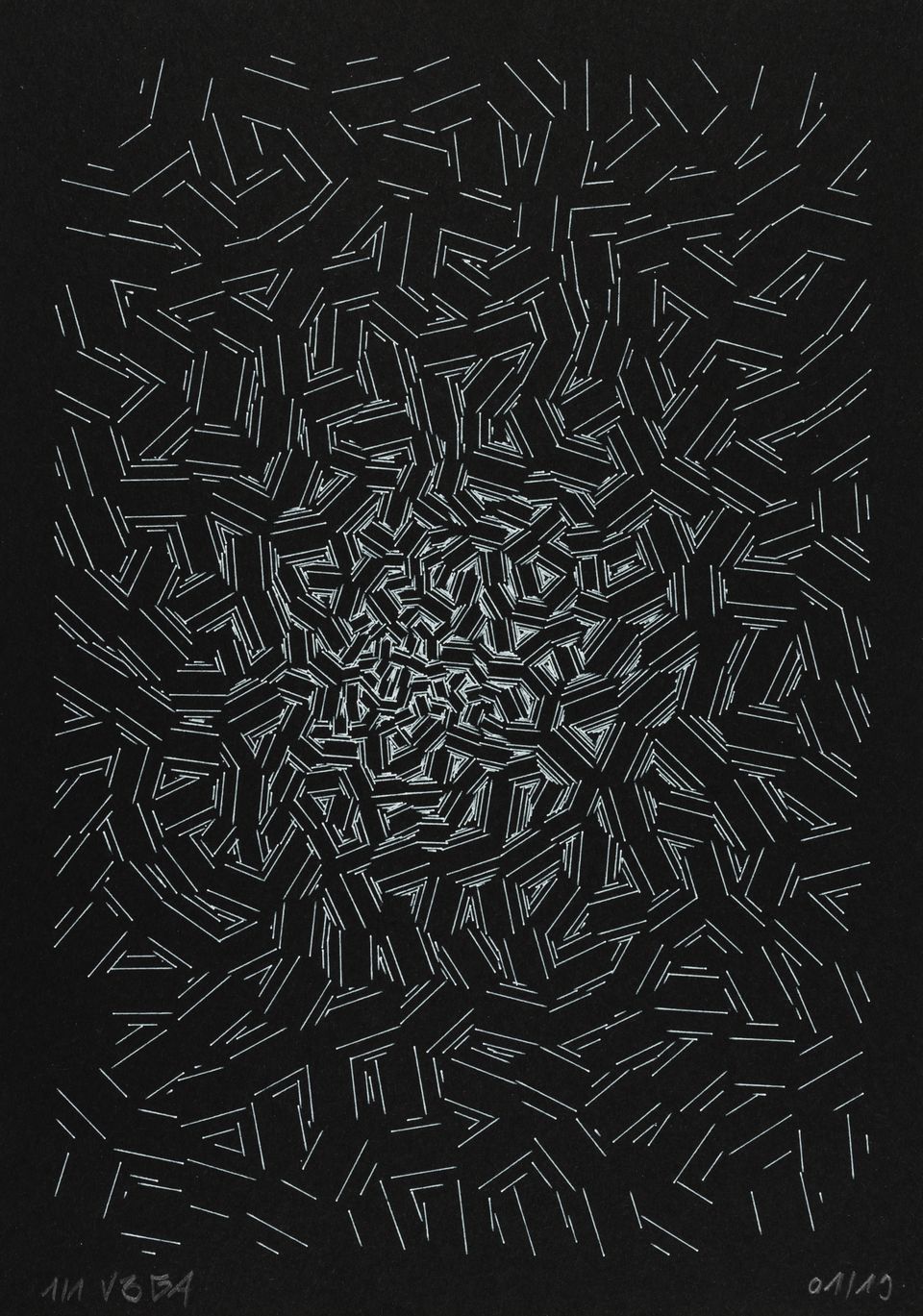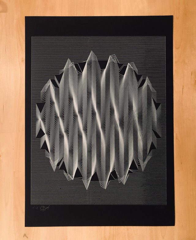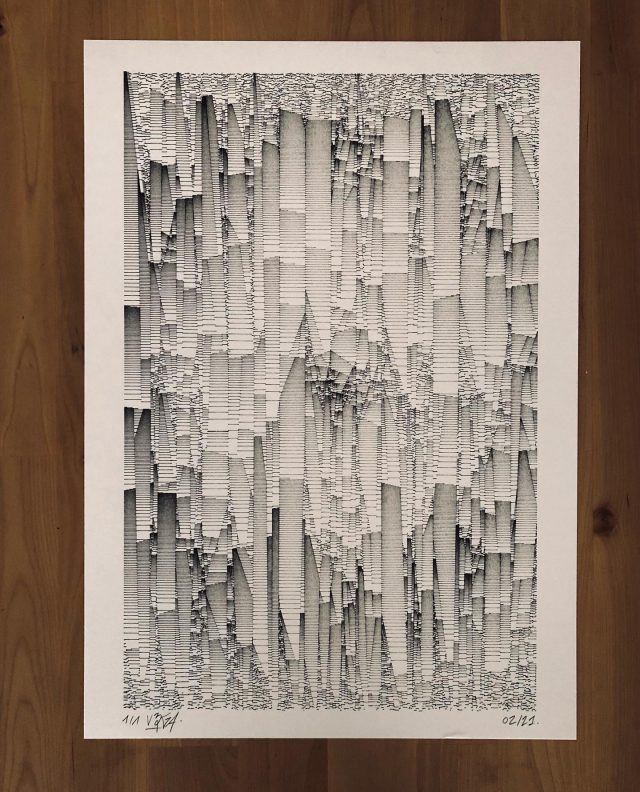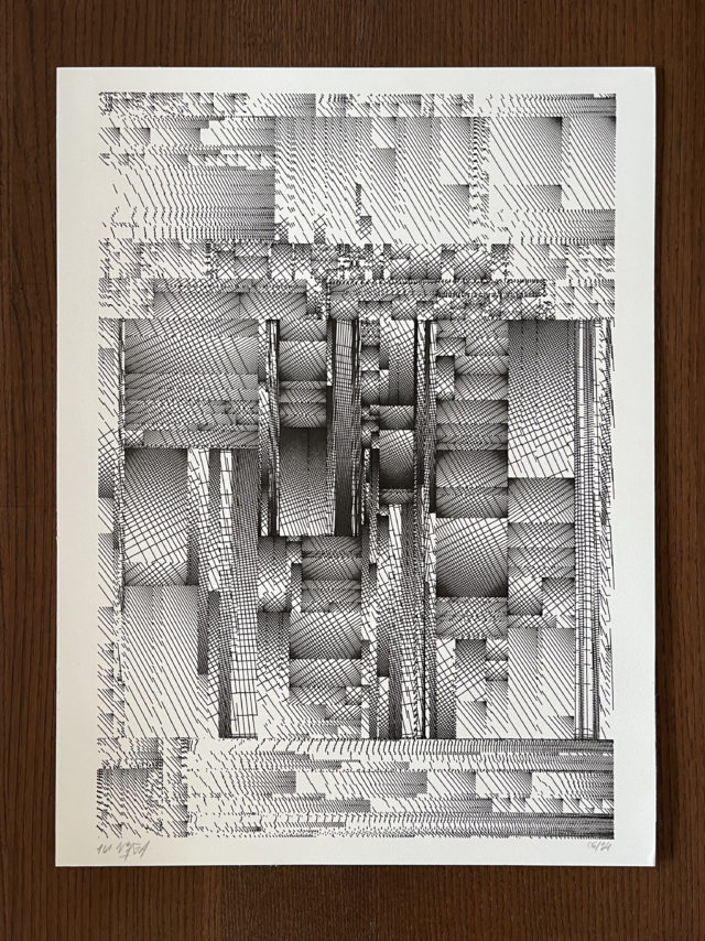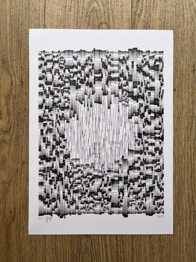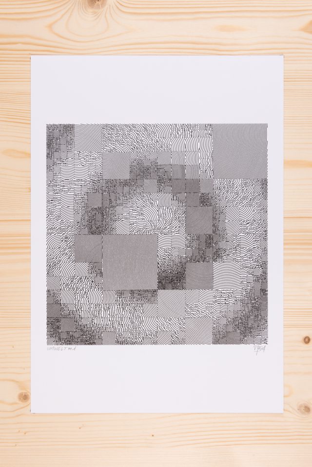 The algorithm used in these artworks starts from a rectangular grid whose cells are filled with lines, the density and orientation of which are modulated depending on their position relative to a epicentre, leading to those rhythmic and symmetrical compositions evoking the propagation of an abstract wave onto the drawing surface.