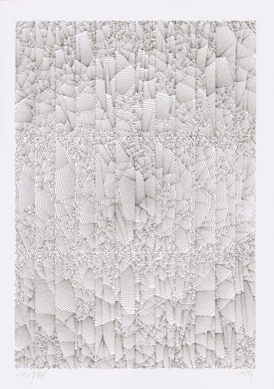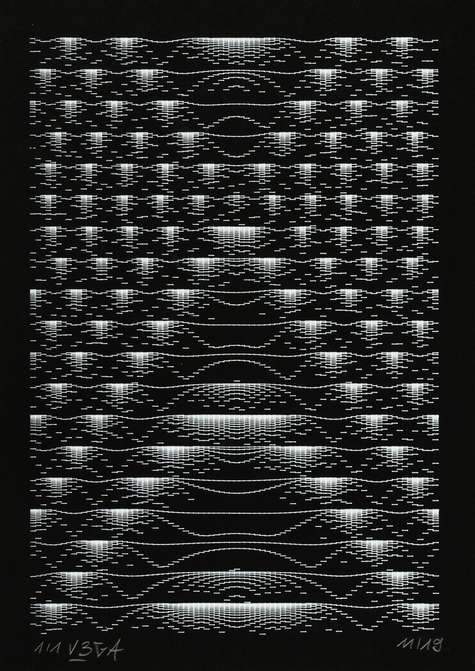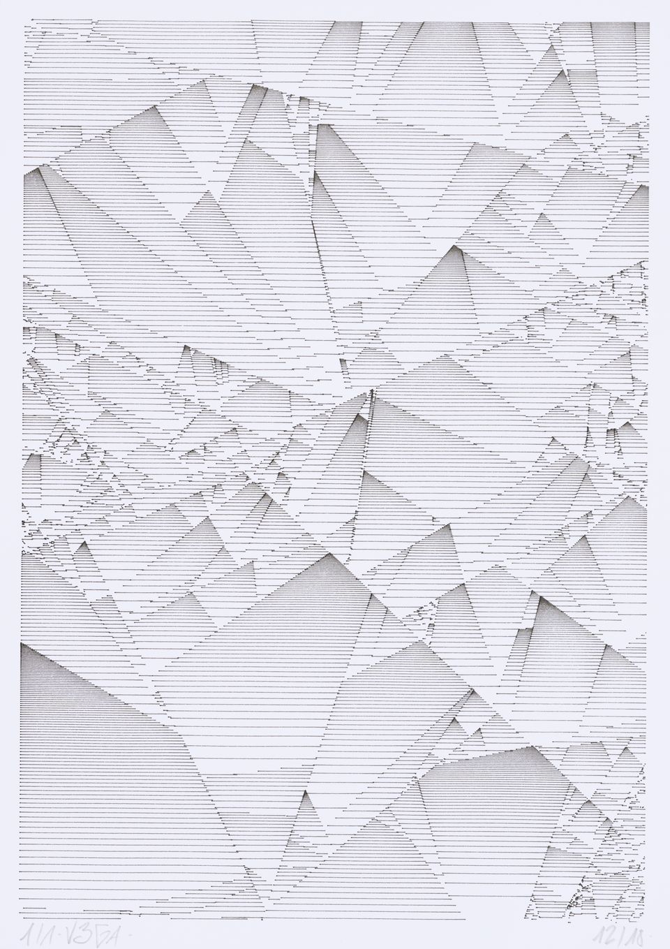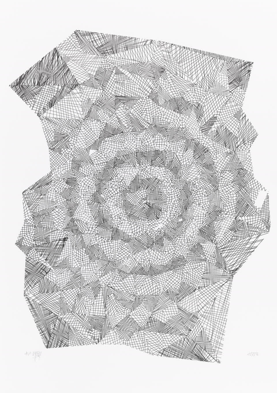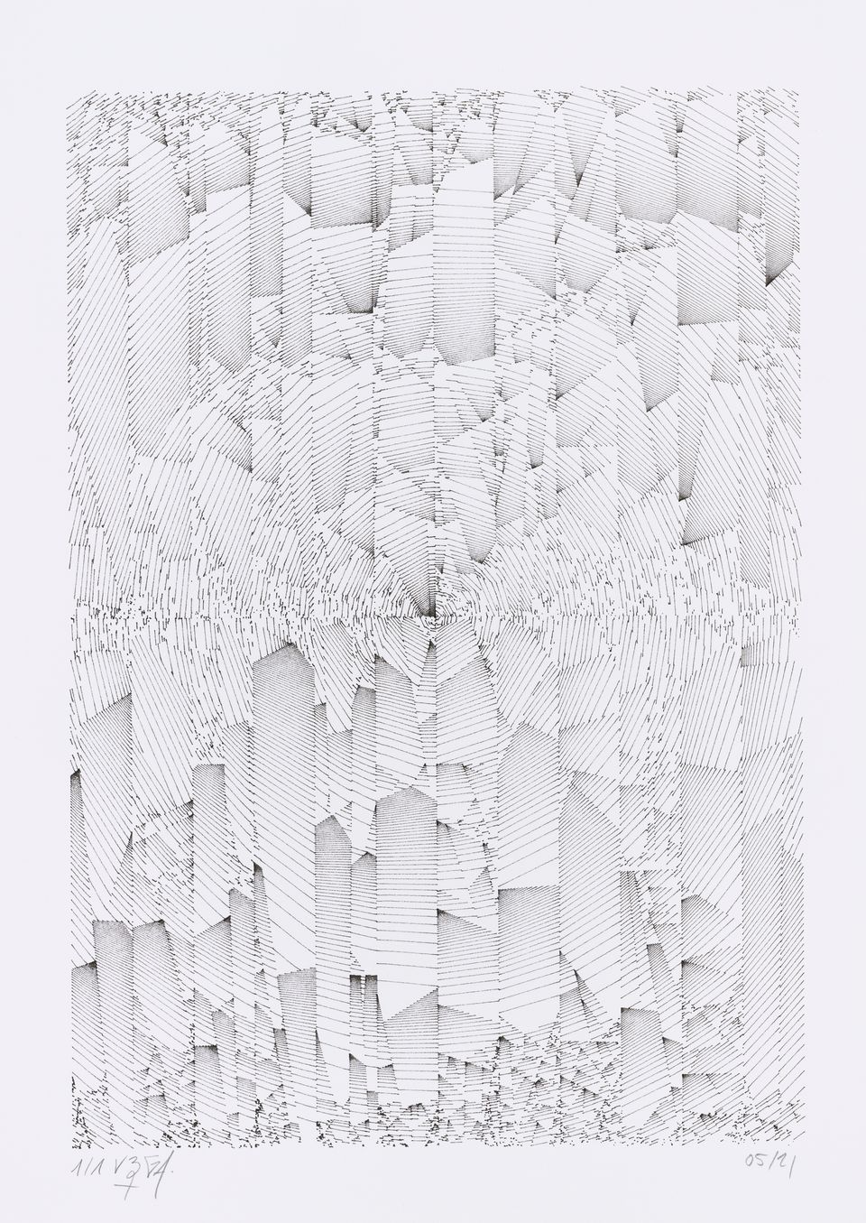 The algorithm used in these artworks starts from a rectangular grid whose cells are filled with lines, the density and orientation of which are modulated depending on their position relative to a epicentre, leading to those rhythmic and symmetrical compositions evoking the propagation of an abstract wave onto the drawing surface.