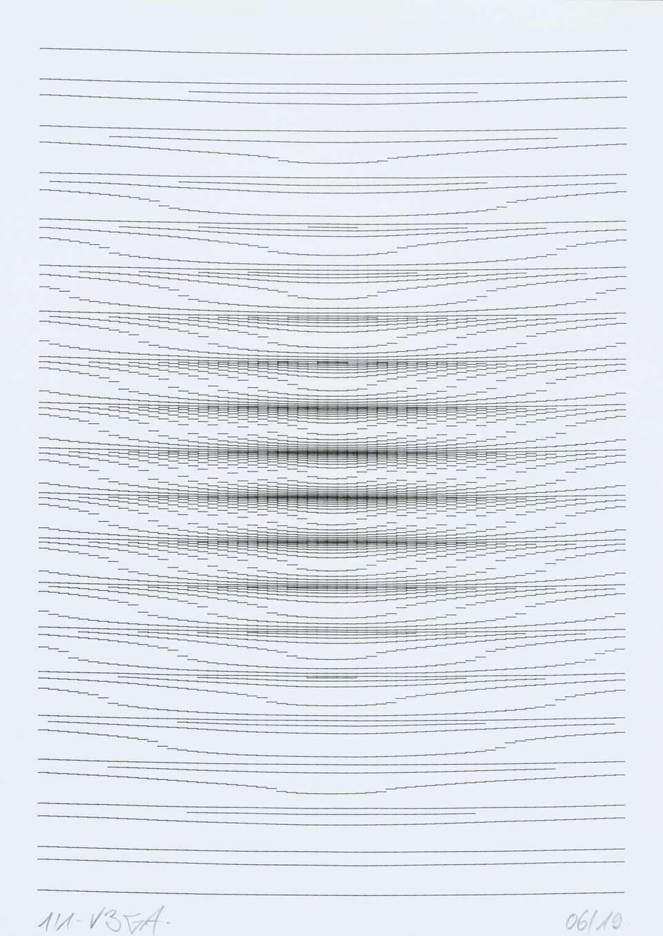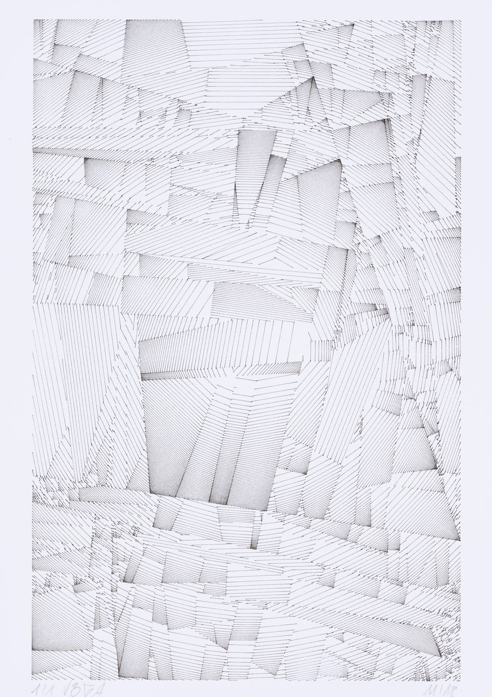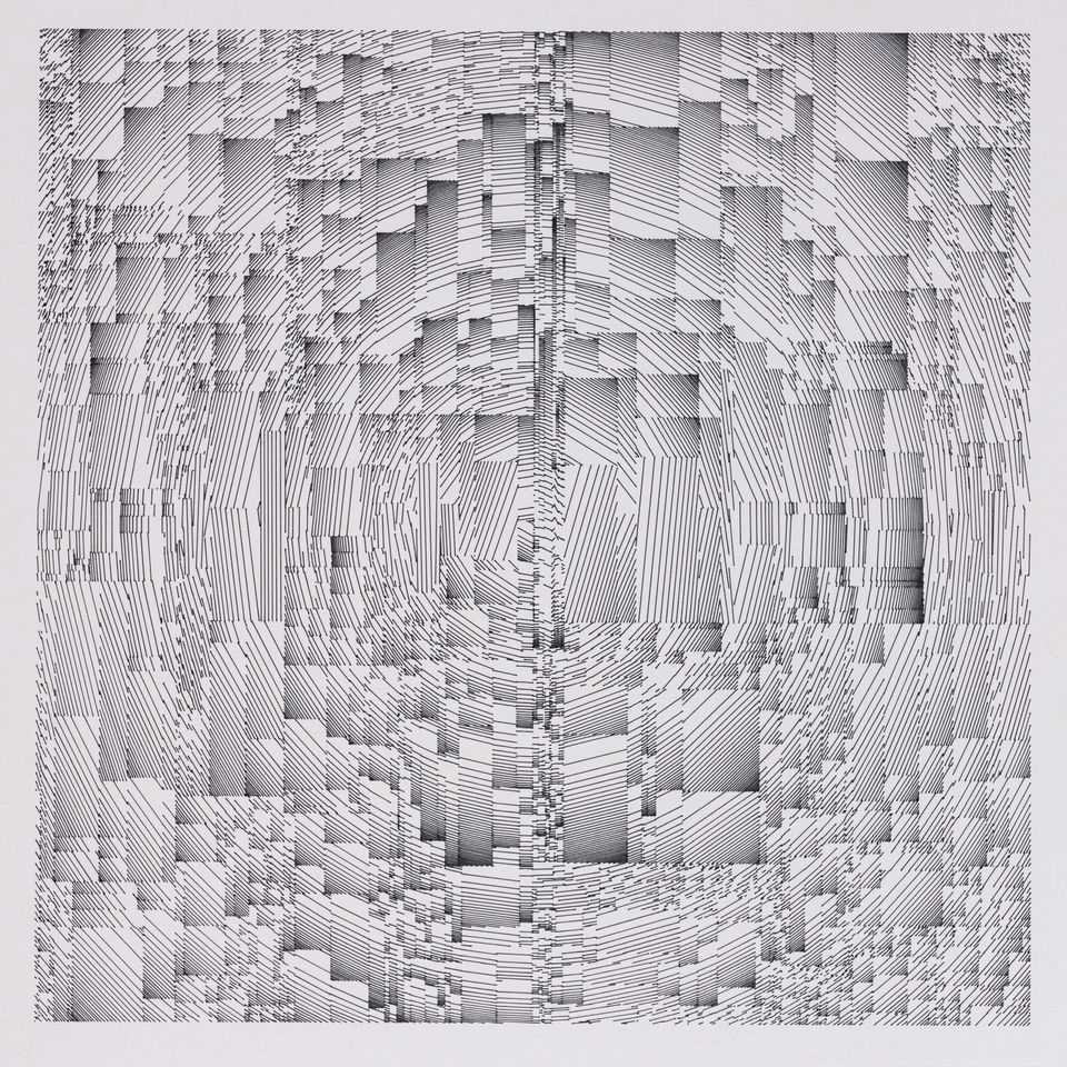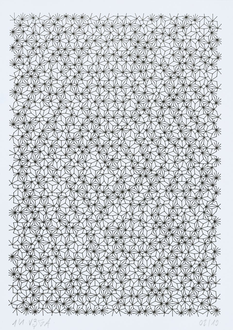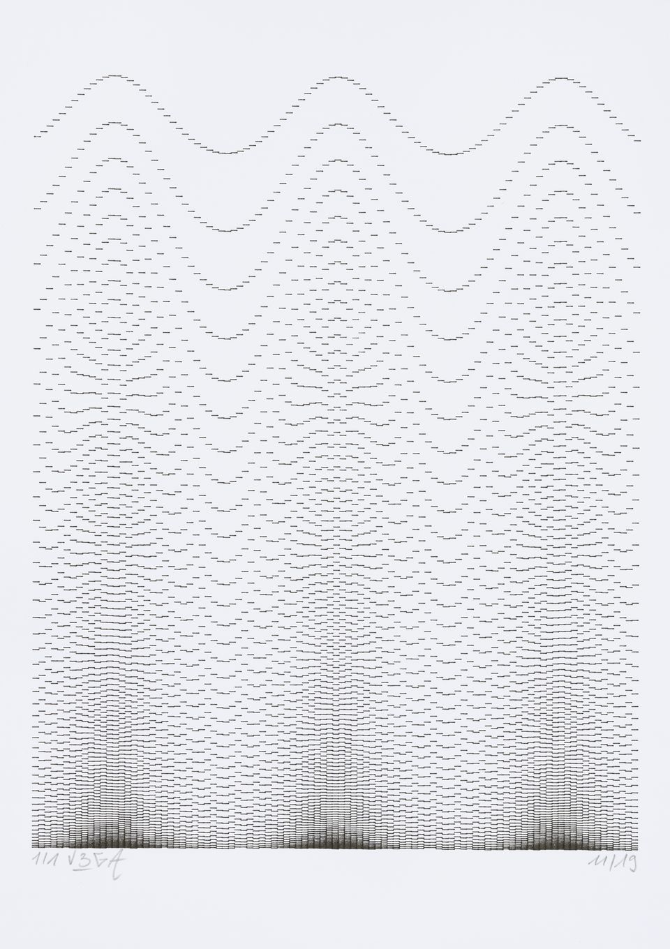 The algorithm used in these artworks starts from a rectangular grid whose cells are filled with lines, the density and orientation of which are modulated depending on their position relative to a epicentre, leading to those rhythmic and symmetrical compositions evoking the propagation of an abstract wave onto the drawing surface.