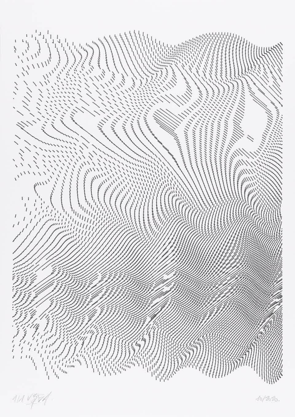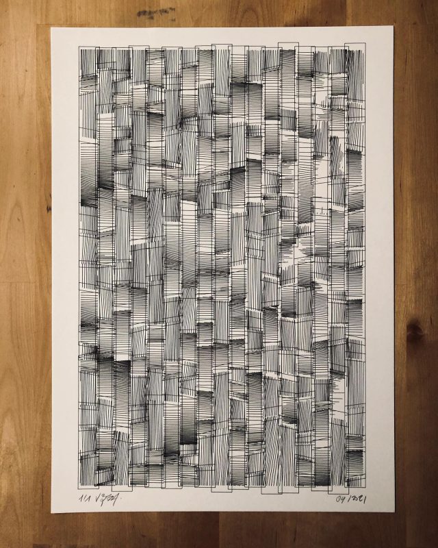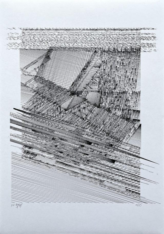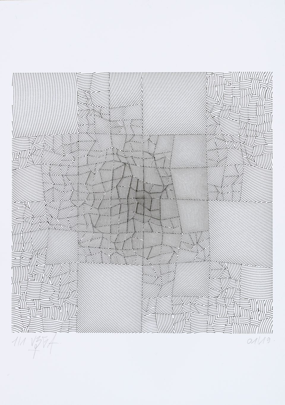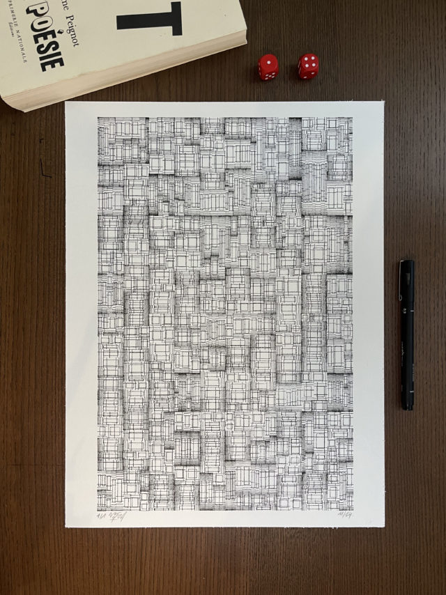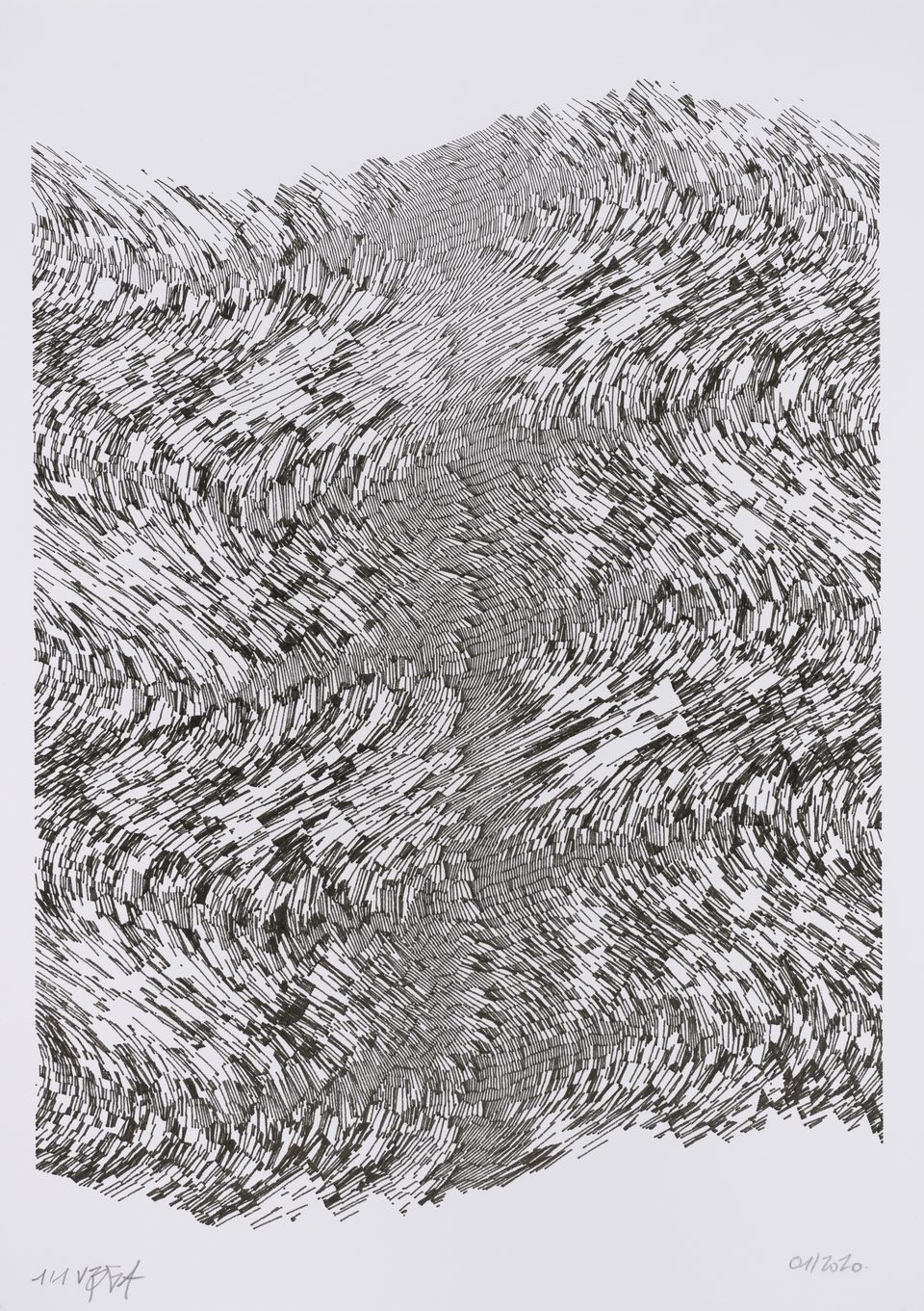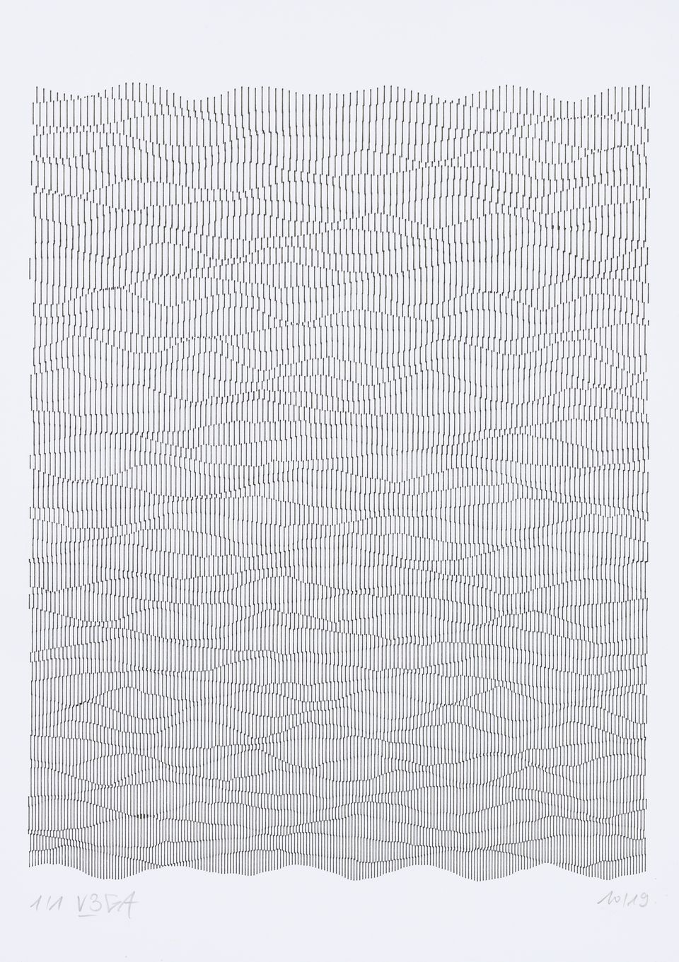 The algorithm used in these artworks starts from a rectangular grid whose cells are filled with lines, the density and orientation of which are modulated depending on their position relative to a epicentre, leading to those rhythmic and symmetrical compositions evoking the propagation of an abstract wave onto the drawing surface.
