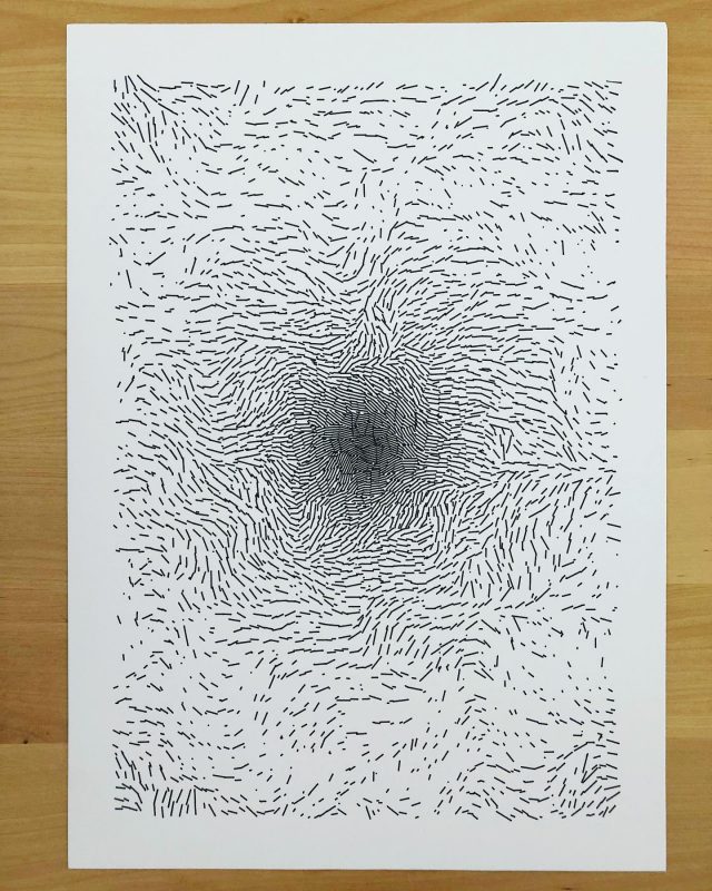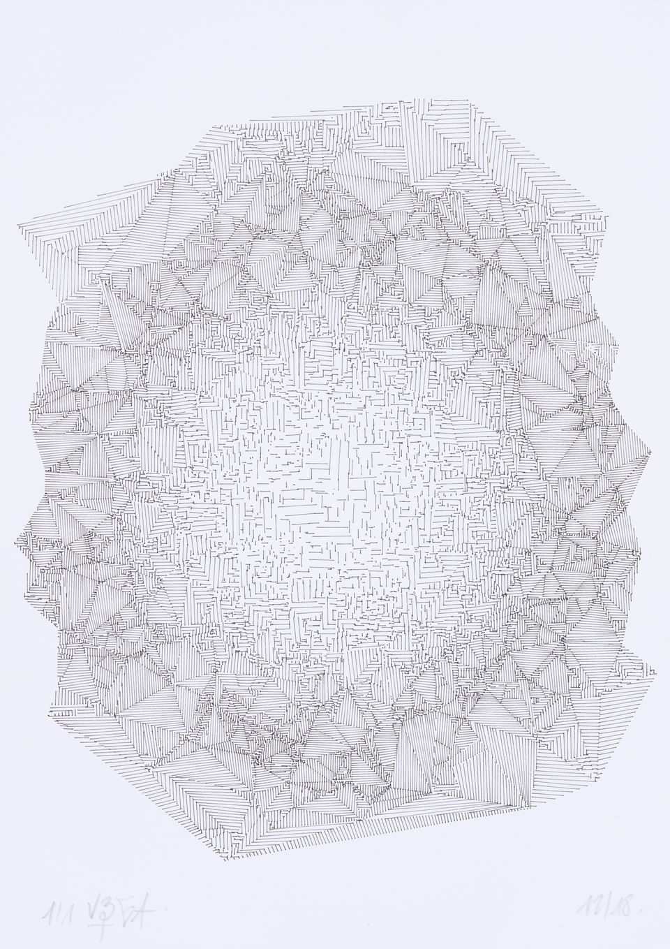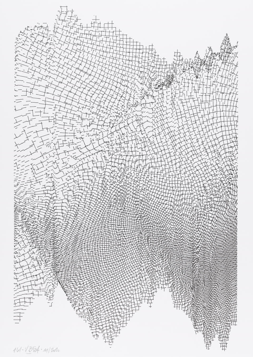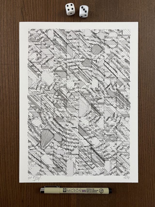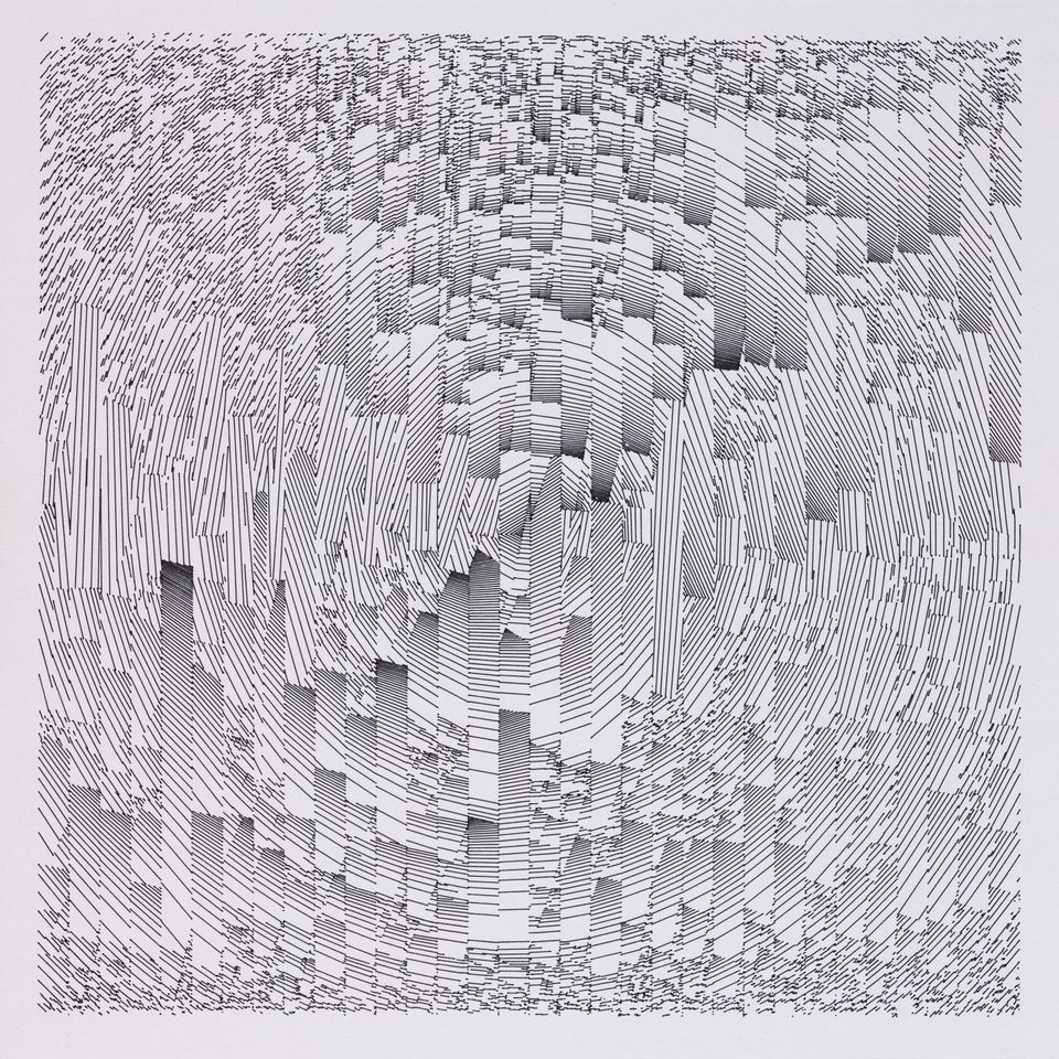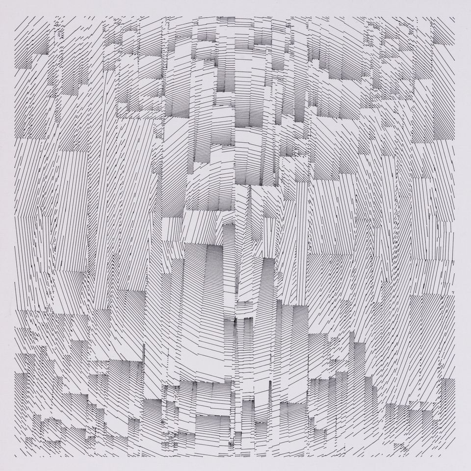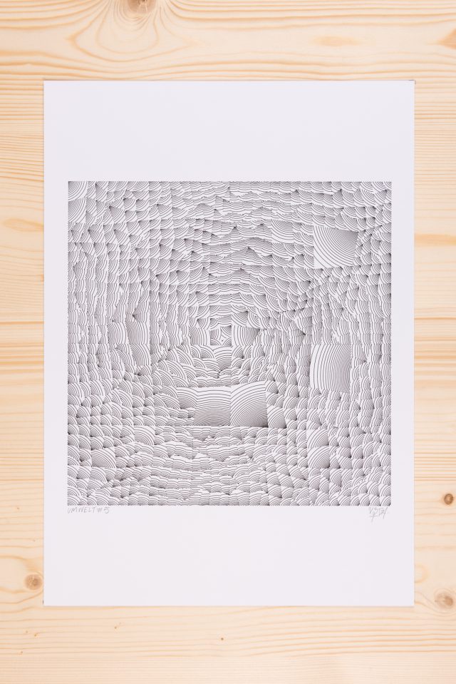 The algorithm used in these artworks starts from a rectangular grid whose cells are filled with lines, the density and orientation of which are modulated depending on their position relative to a epicentre, leading to those rhythmic and symmetrical compositions evoking the propagation of an abstract wave onto the drawing surface.