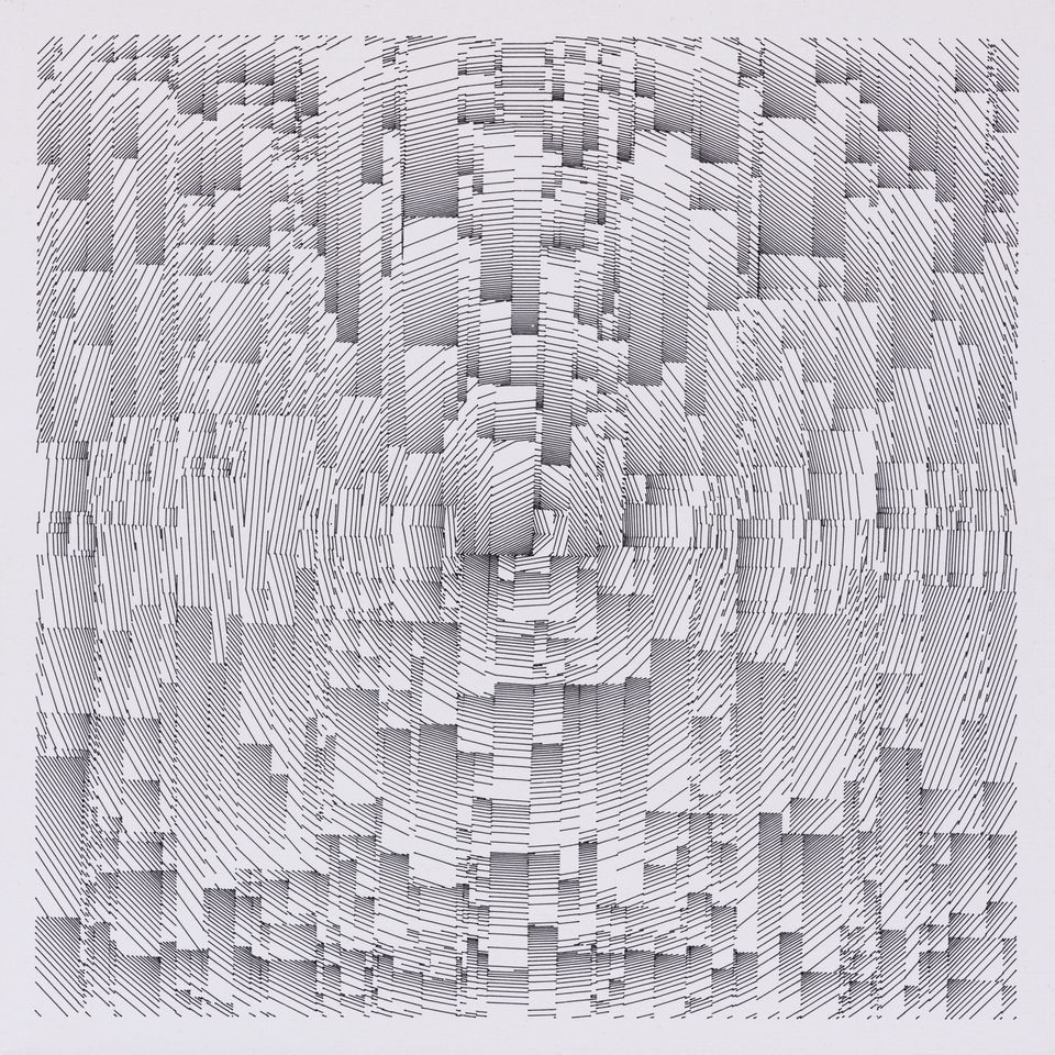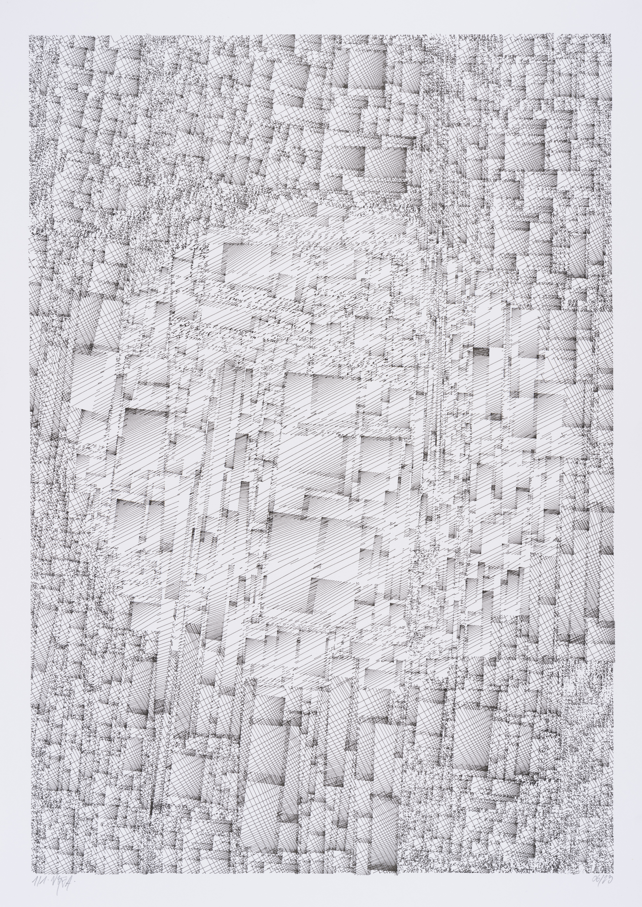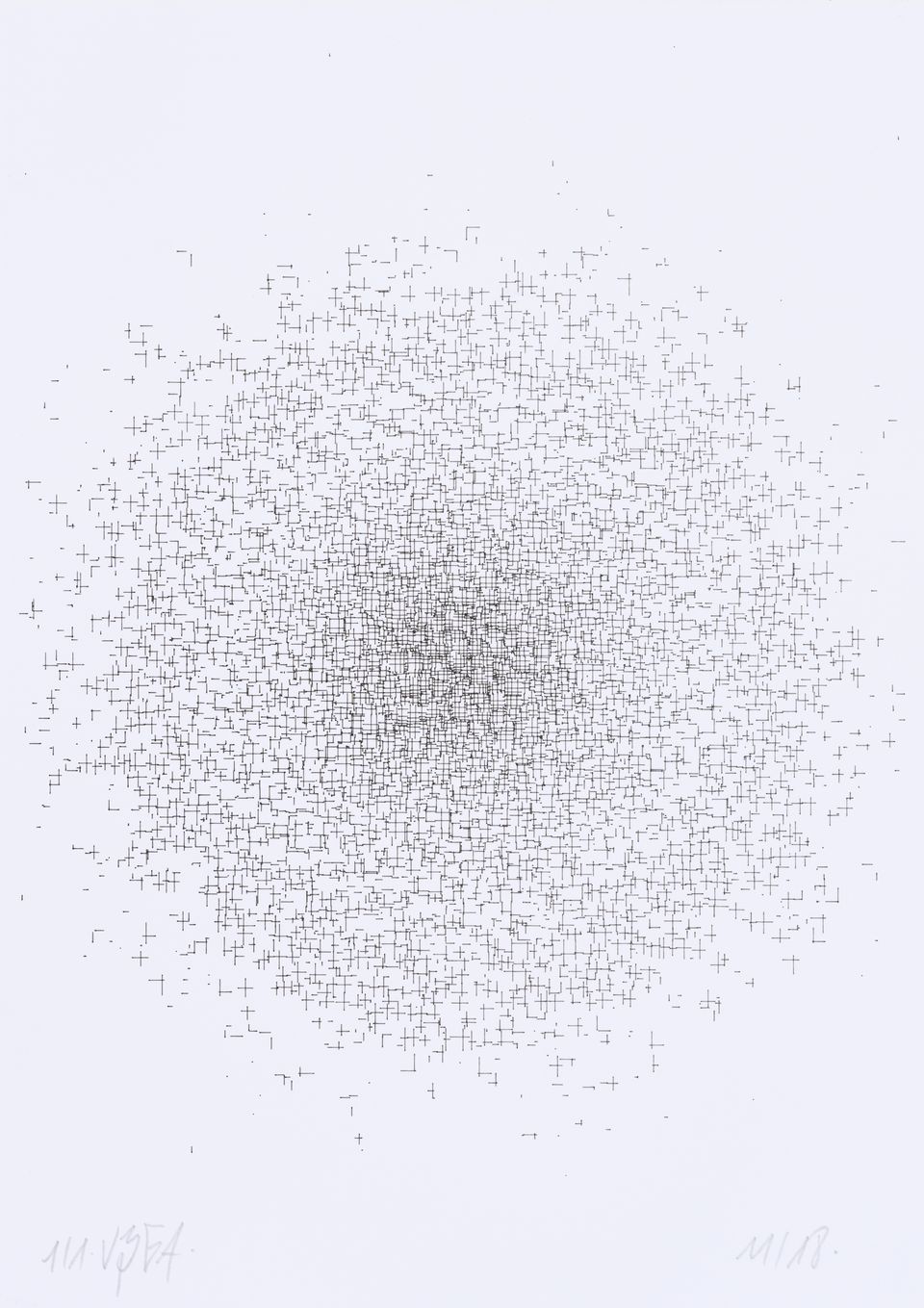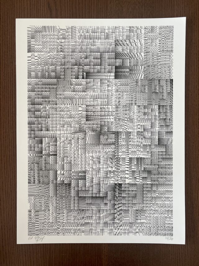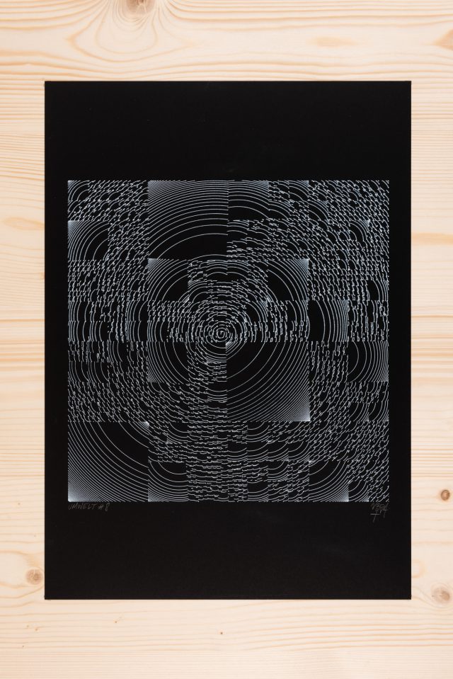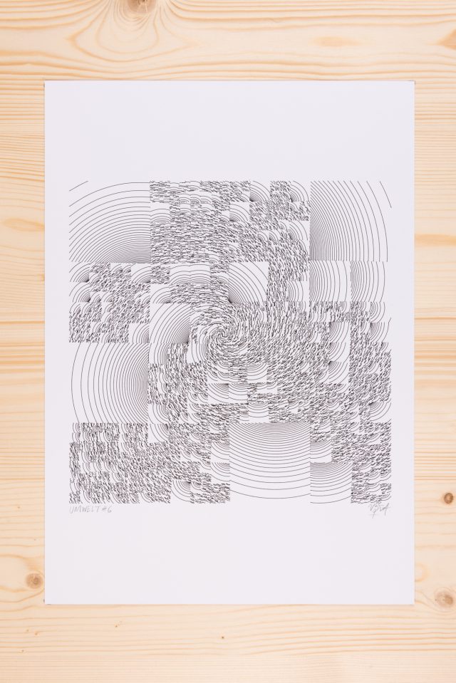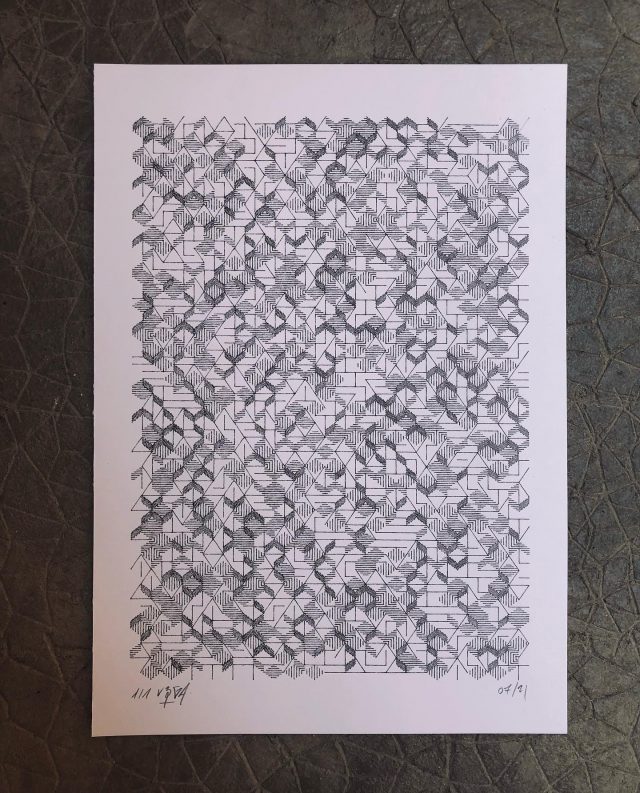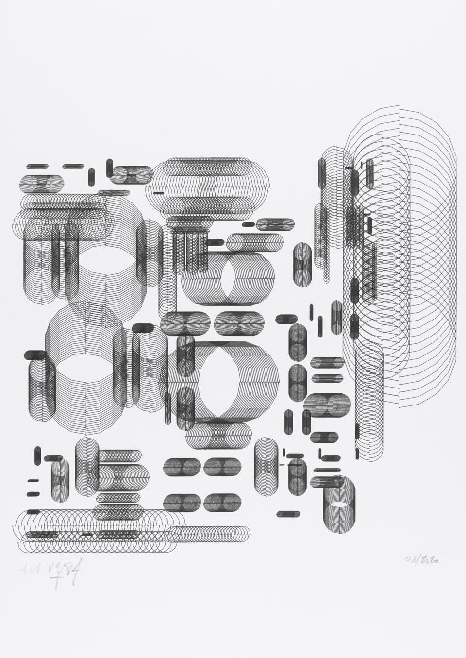 The algorithm used in these artworks starts from a rectangular grid whose cells are filled with lines, the density and orientation of which are modulated depending on their position relative to a epicentre, leading to those rhythmic and symmetrical compositions evoking the propagation of an abstract wave onto the drawing surface.