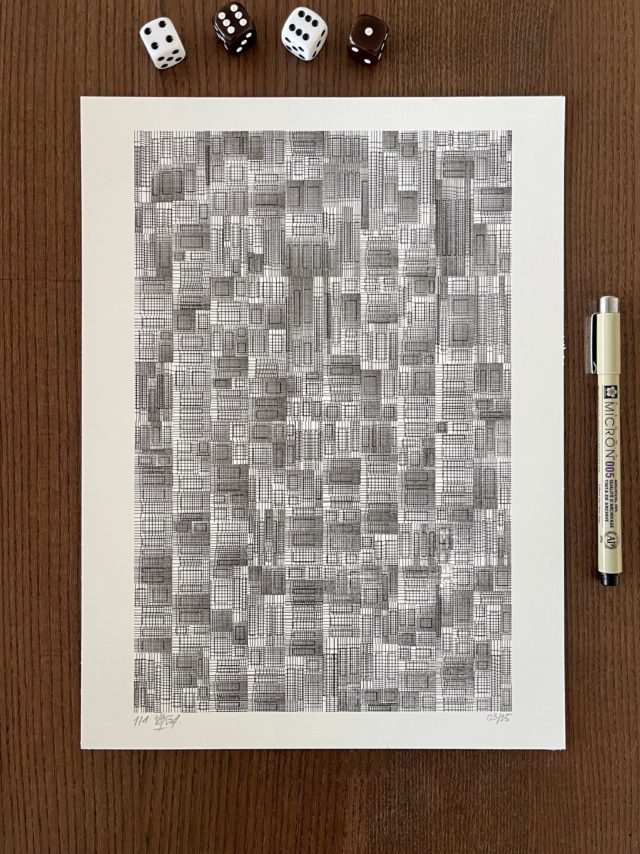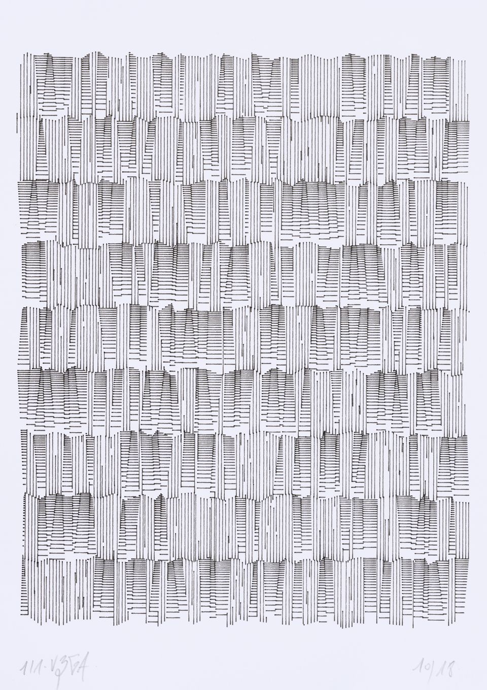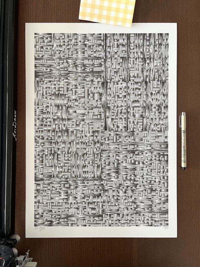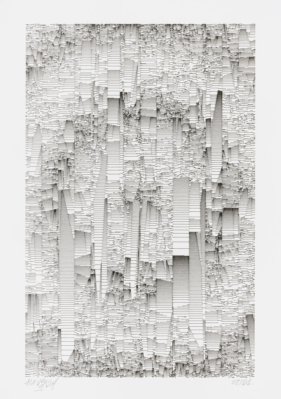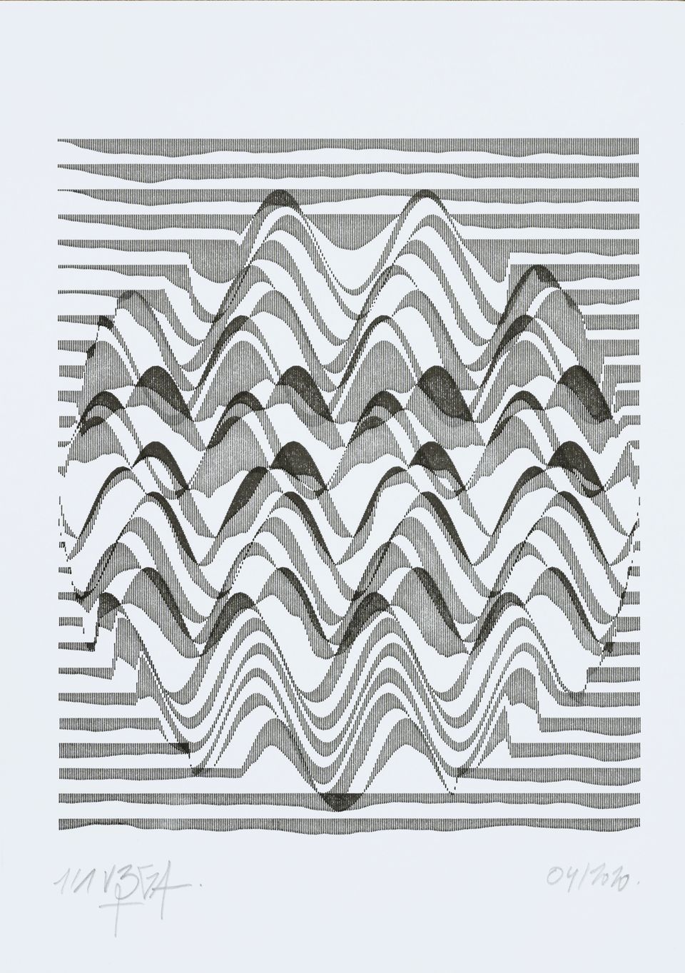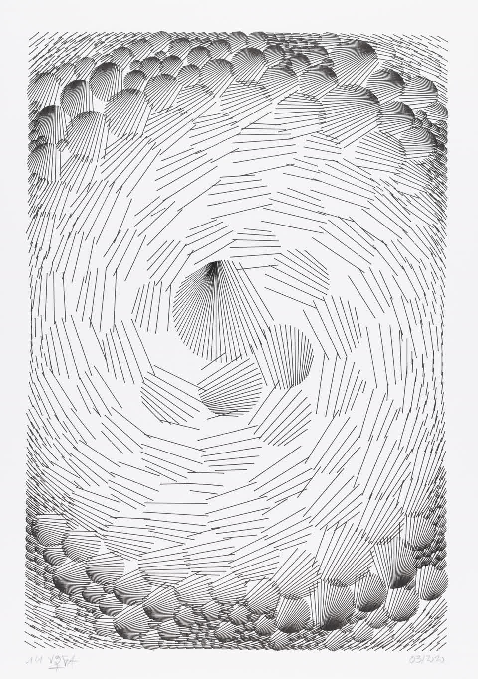 The algorithm used in these artworks starts from a rectangular grid whose cells are filled with lines, the density and orientation of which are modulated depending on their position relative to a epicentre, leading to those rhythmic and symmetrical compositions evoking the propagation of an abstract wave onto the drawing surface.