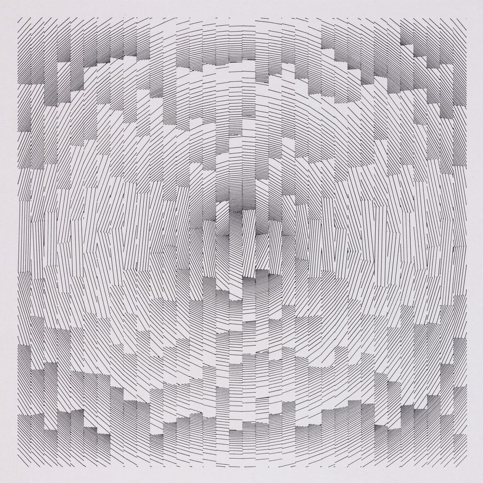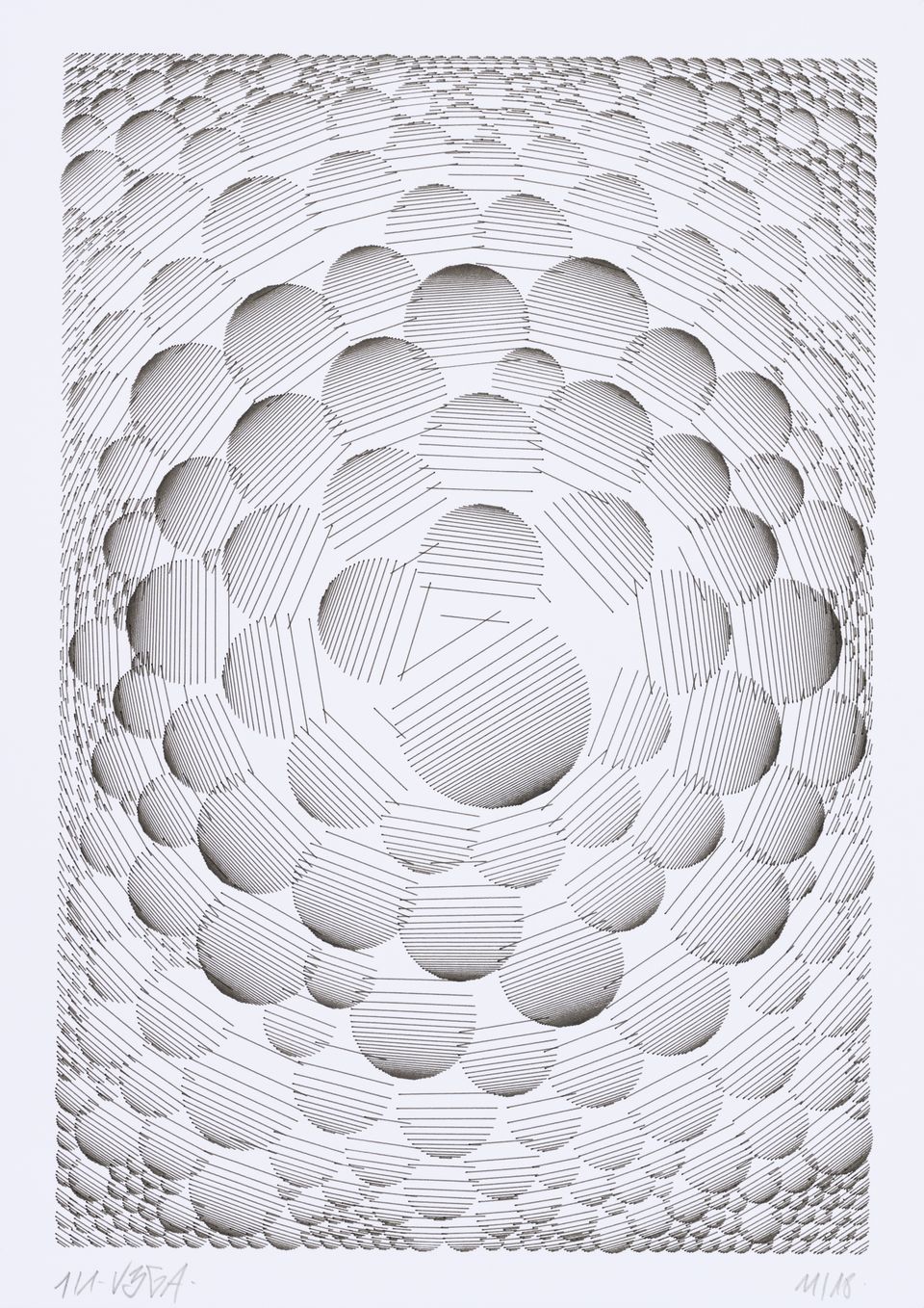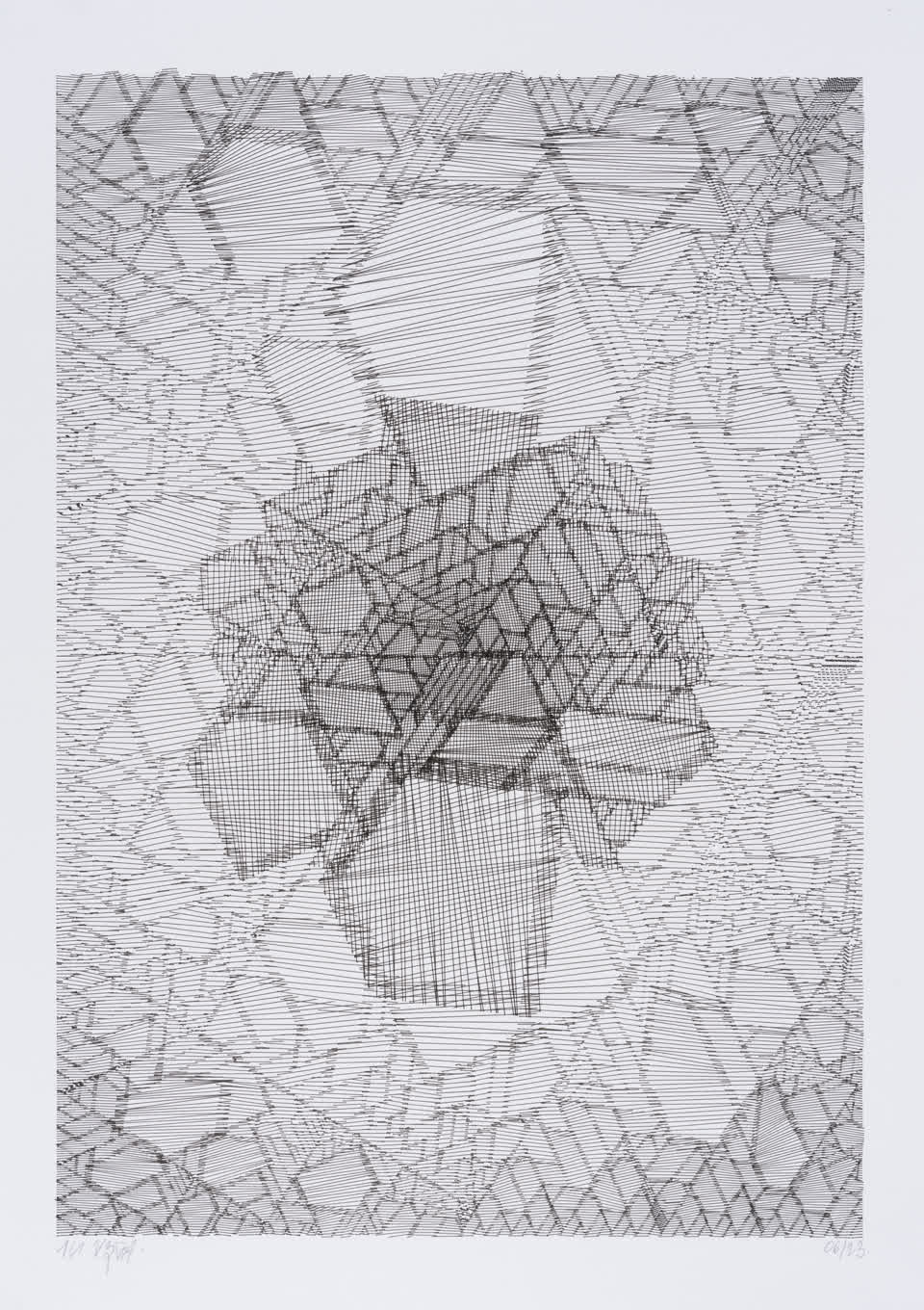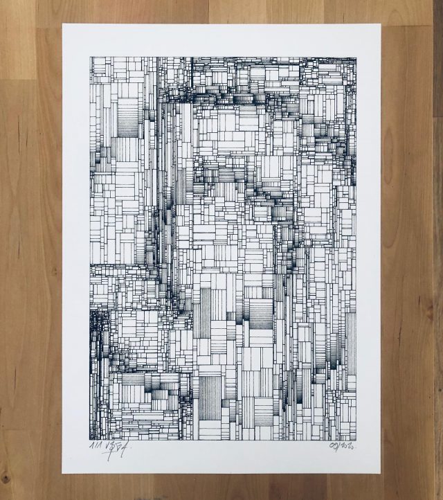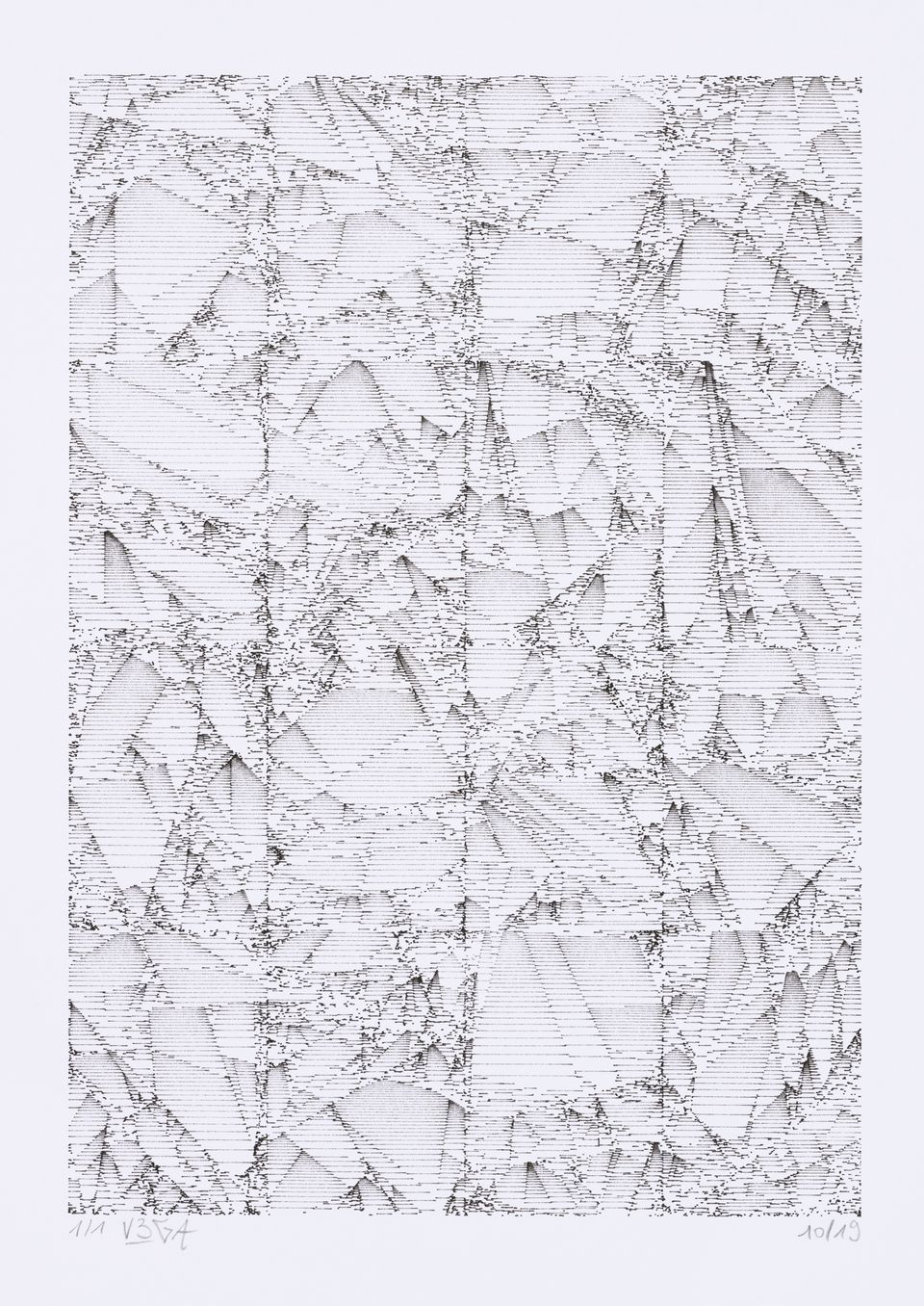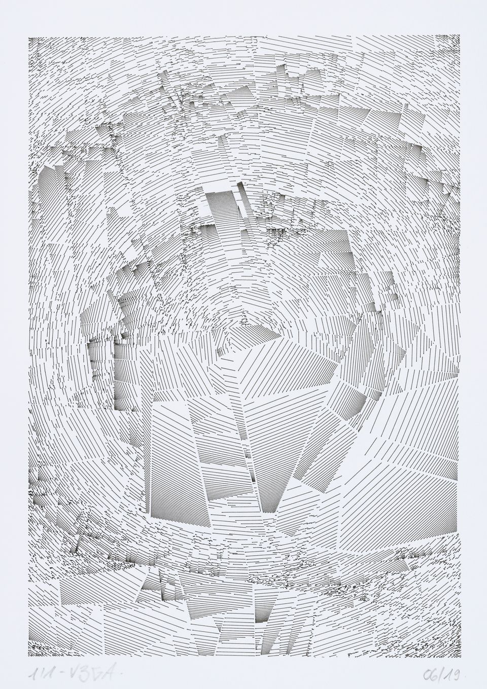 The algorithm used in these artworks starts from a rectangular grid whose cells are filled with lines, the density and orientation of which are modulated depending on their position relative to a epicentre, leading to those rhythmic and symmetrical compositions evoking the propagation of an abstract wave onto the drawing surface.