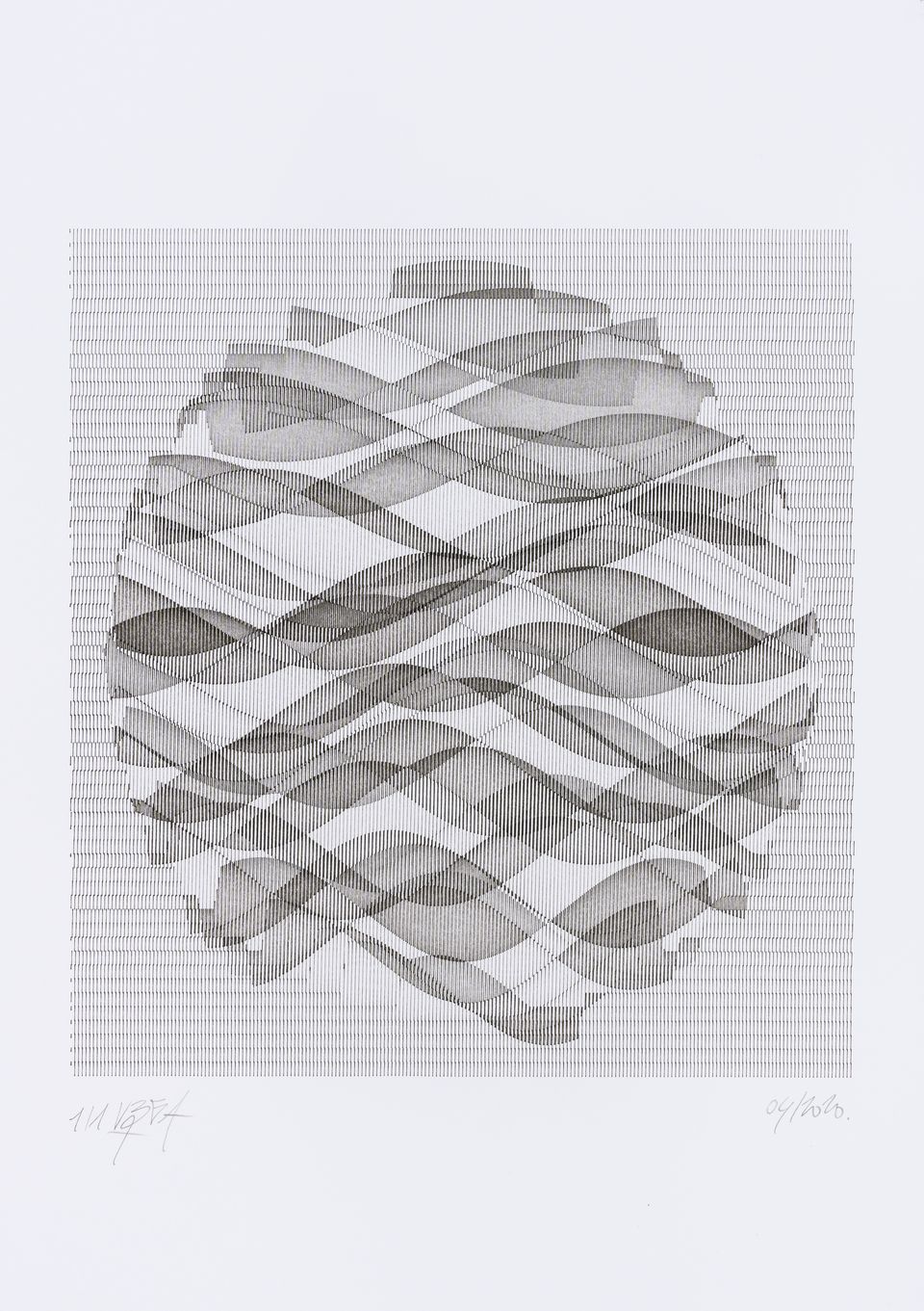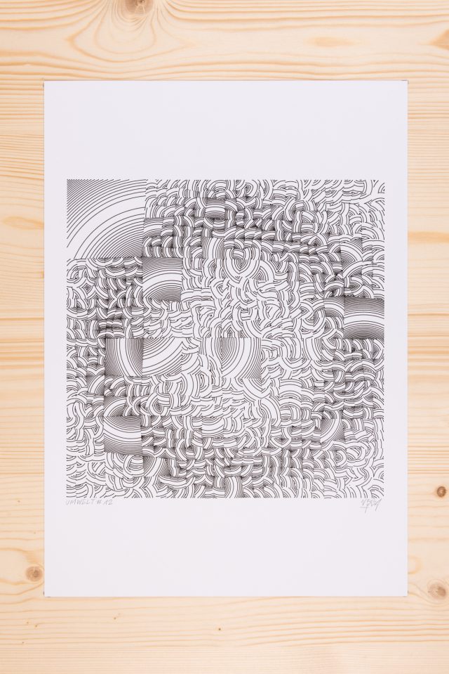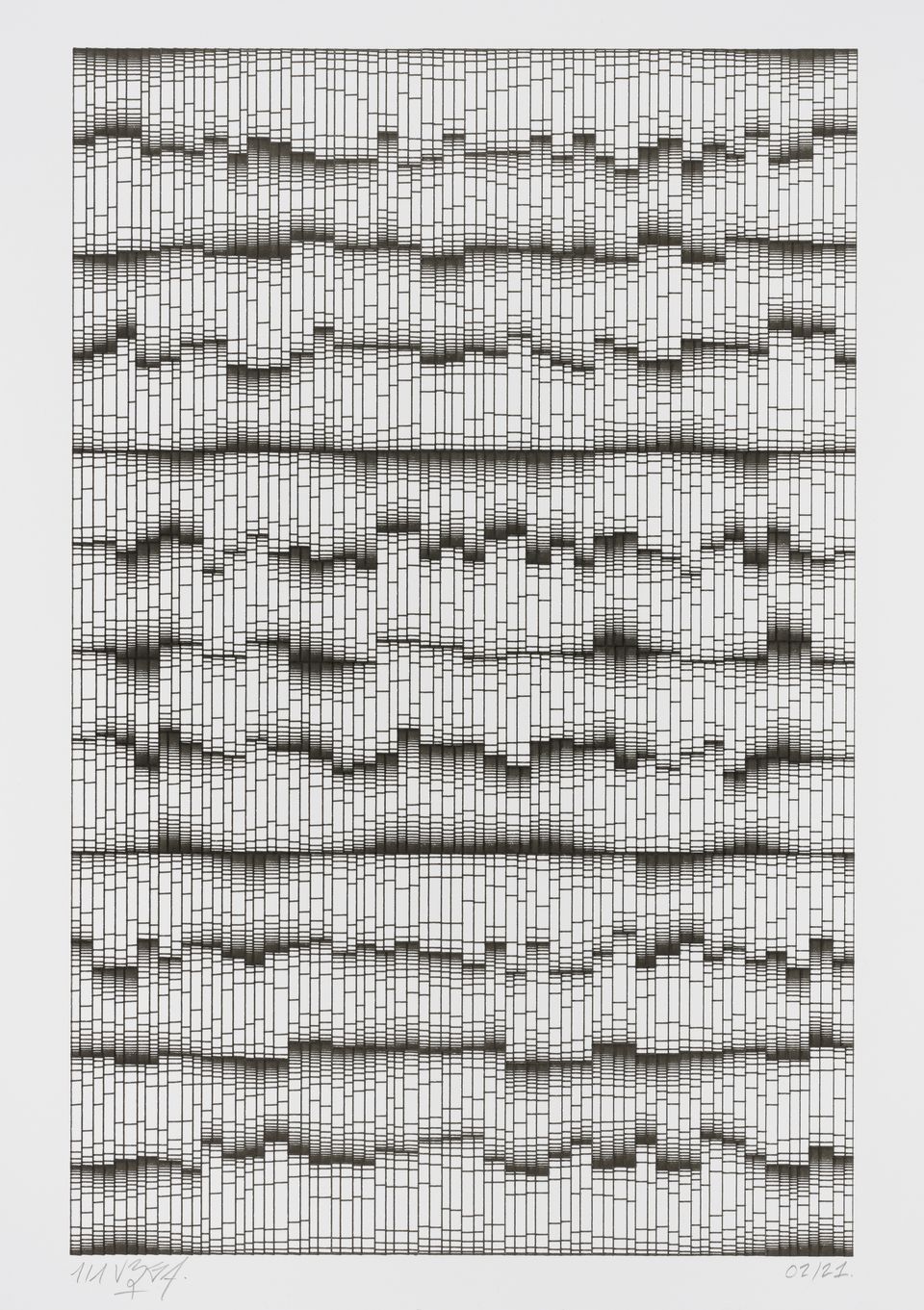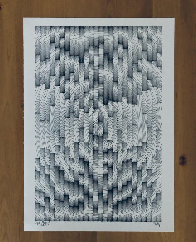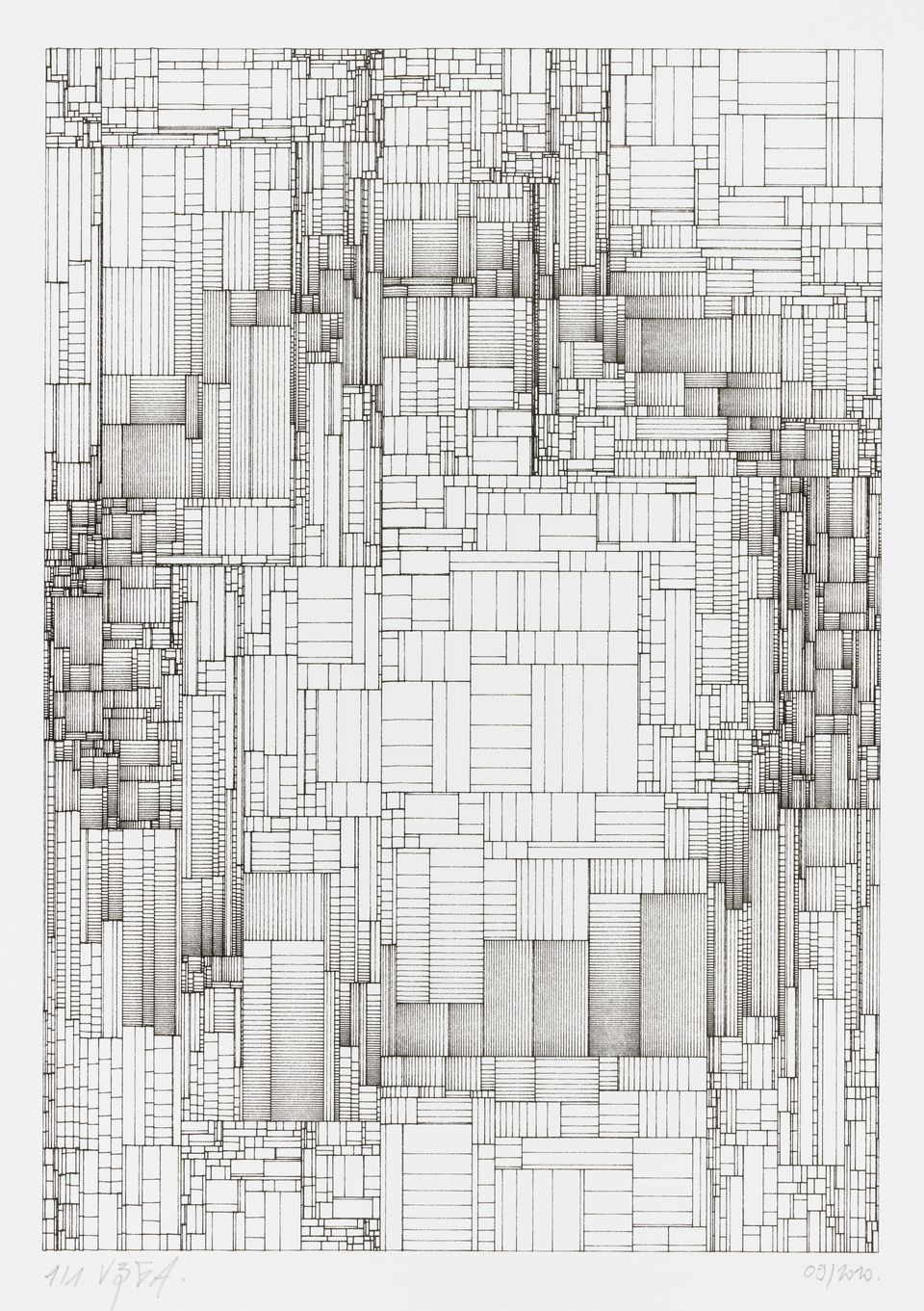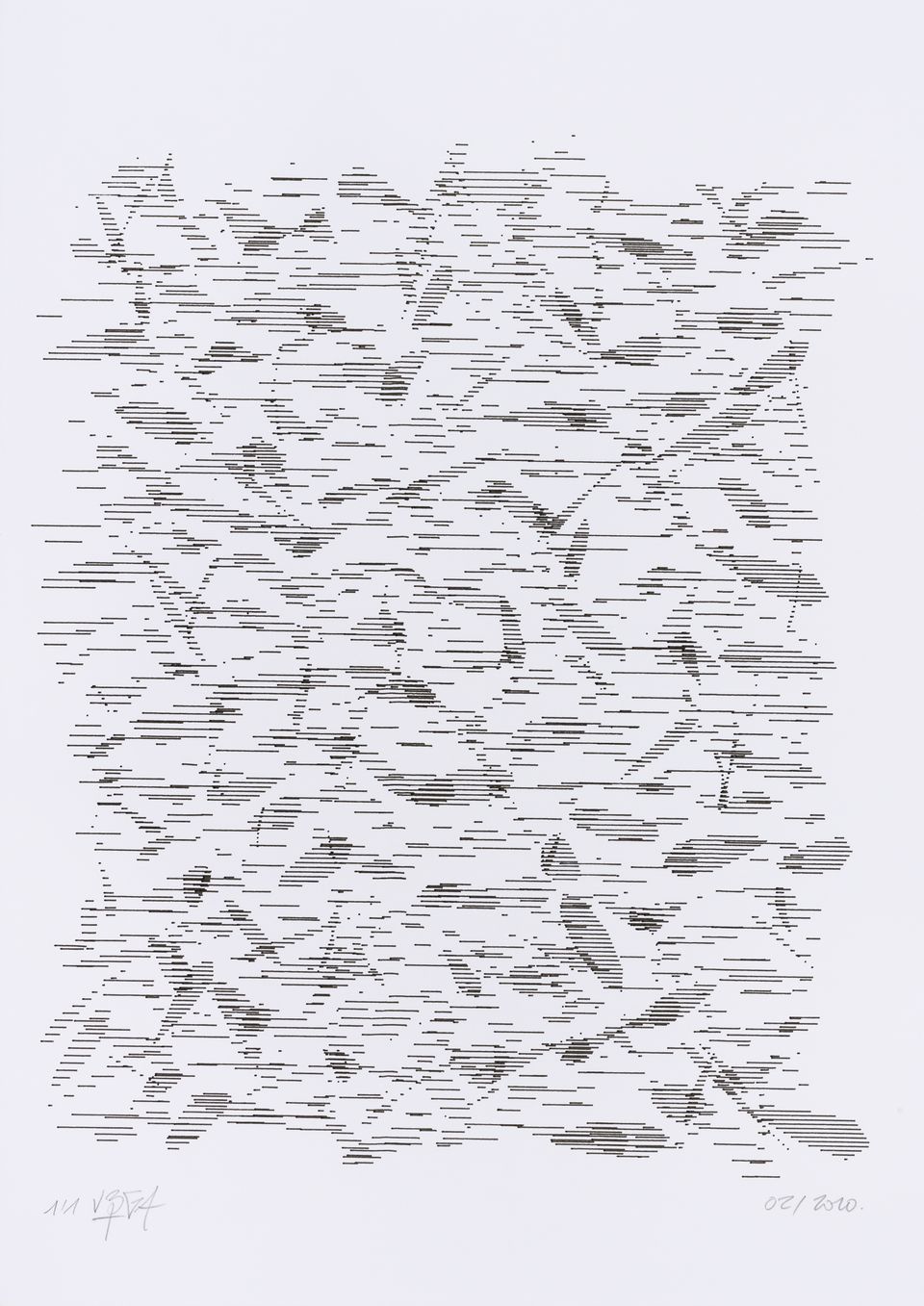 The algorithm used in these artworks starts from a rectangular grid whose cells are filled with lines, the density and orientation of which are modulated depending on their position relative to a epicentre, leading to those rhythmic and symmetrical compositions evoking the propagation of an abstract wave onto the drawing surface.