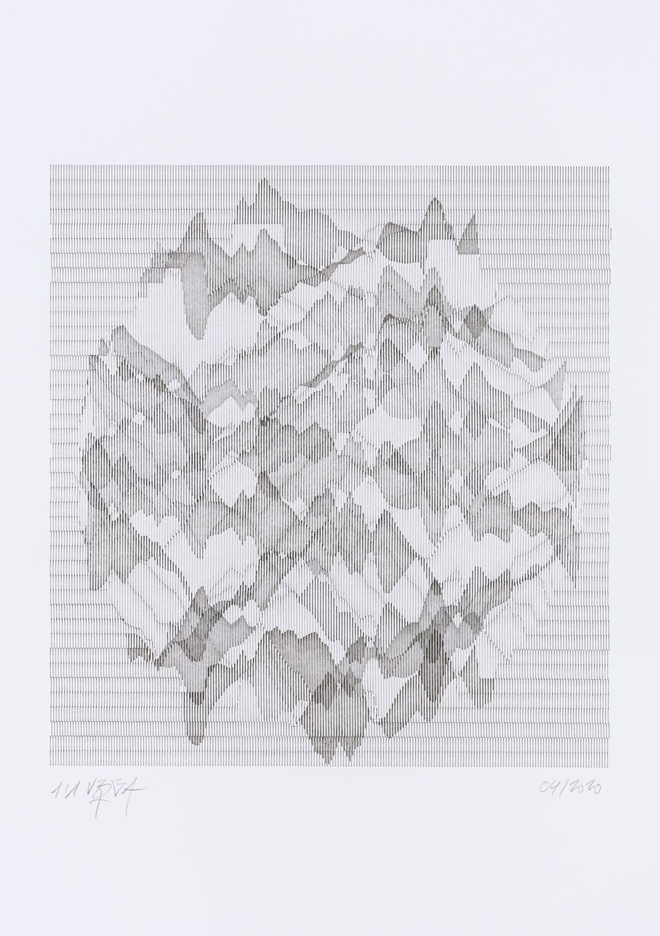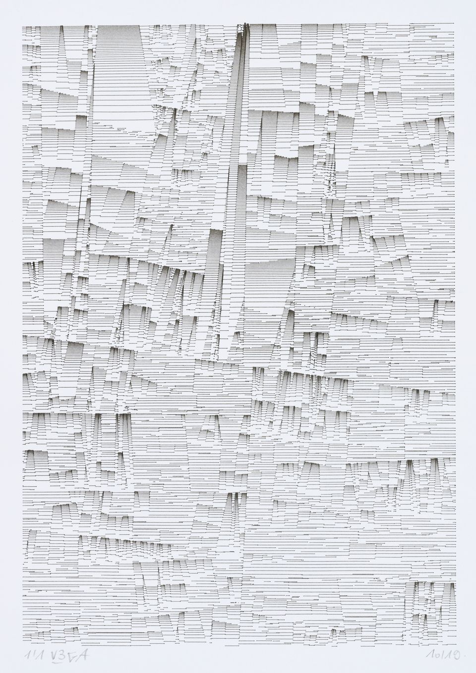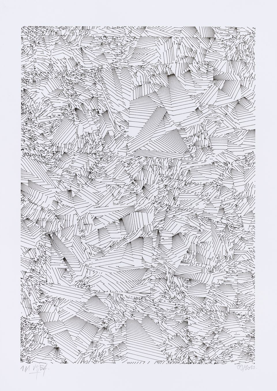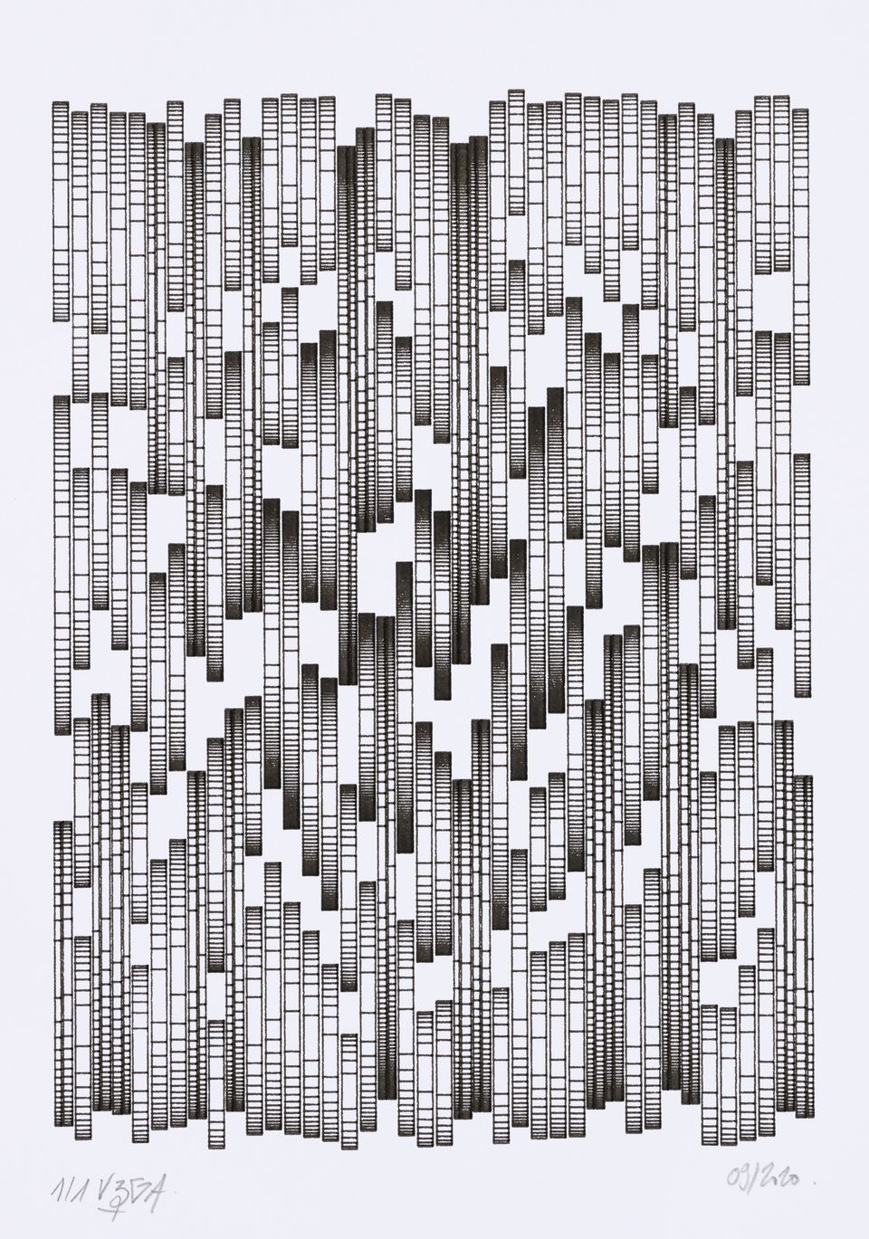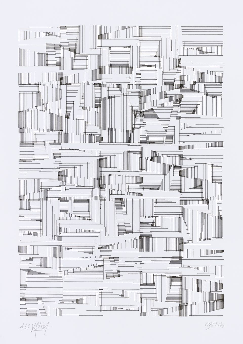 The algorithm used in these artworks starts from a rectangular grid whose cells are filled with lines, the density and orientation of which are modulated depending on their position relative to a epicentre, leading to those rhythmic and symmetrical compositions evoking the propagation of an abstract wave onto the drawing surface.
