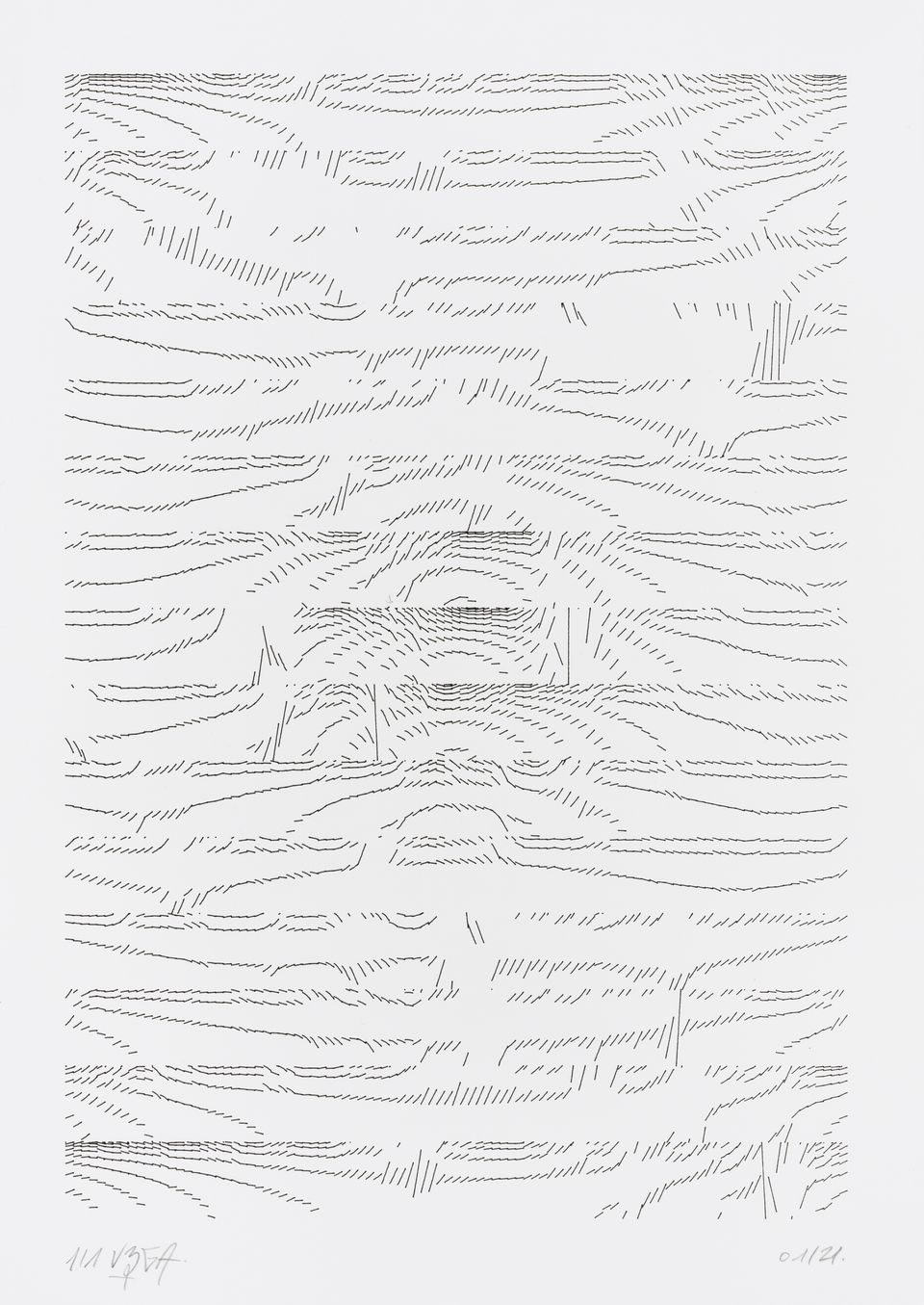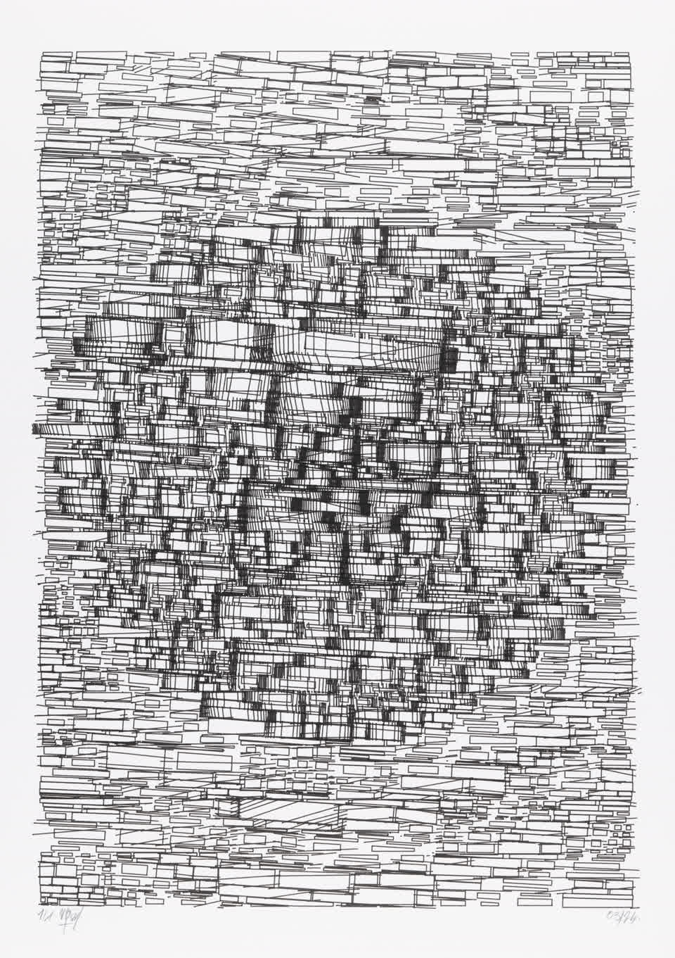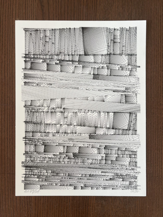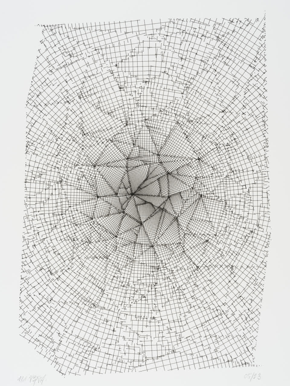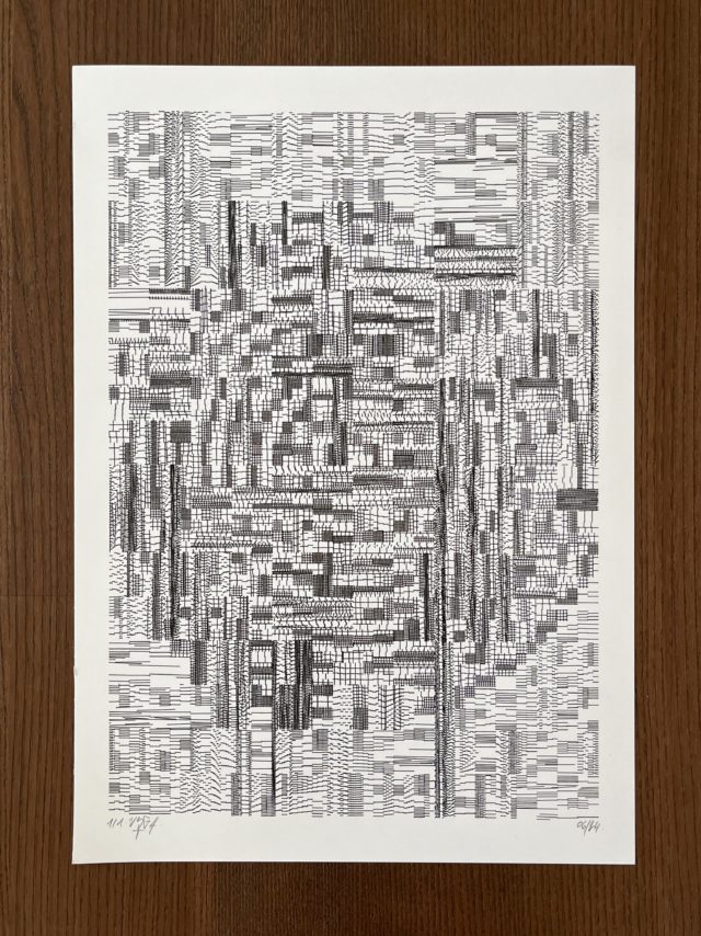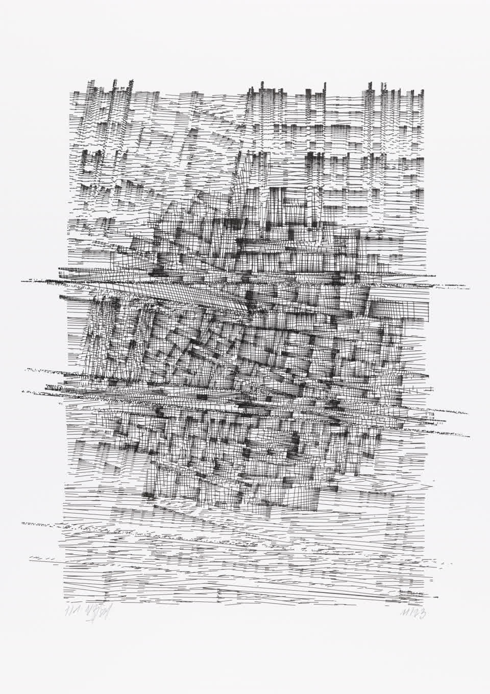 The algorithm used in these artworks starts from a rectangular grid whose cells are filled with lines, the density and orientation of which are modulated depending on their position relative to a epicentre, leading to those rhythmic and symmetrical compositions evoking the propagation of an abstract wave onto the drawing surface.