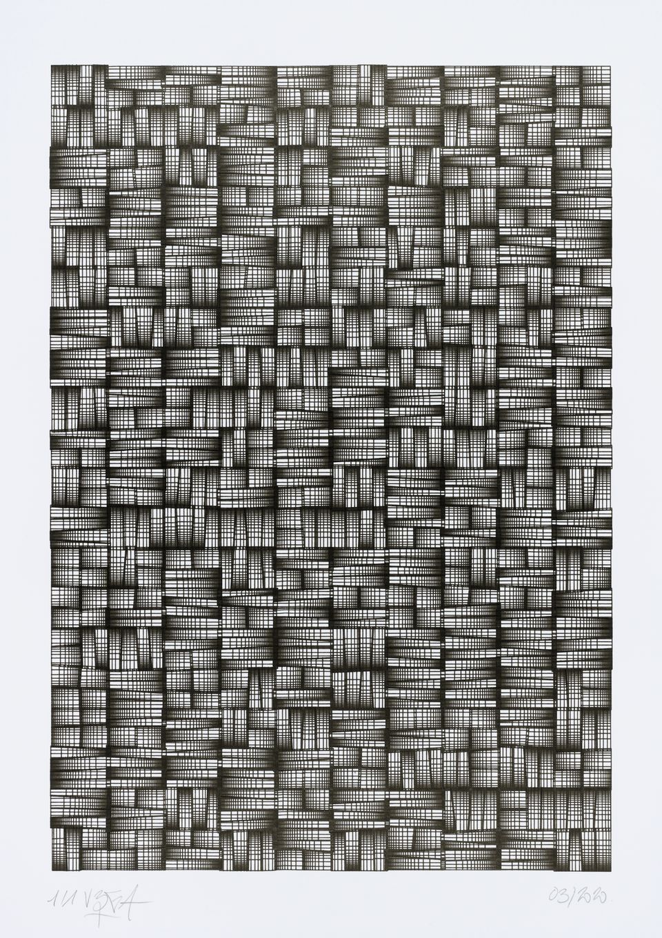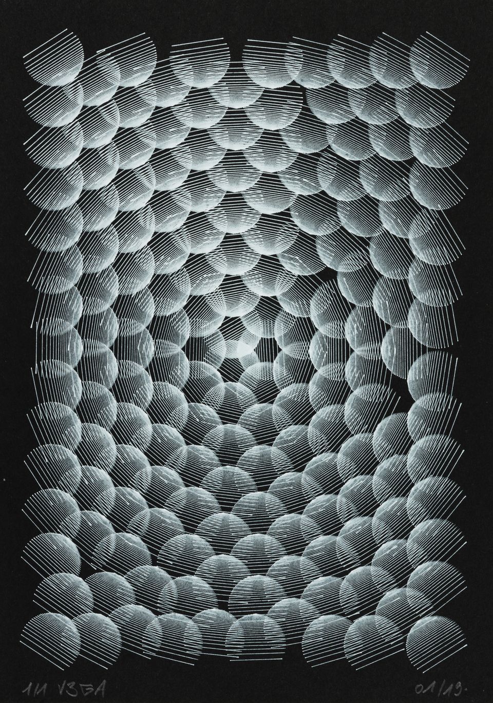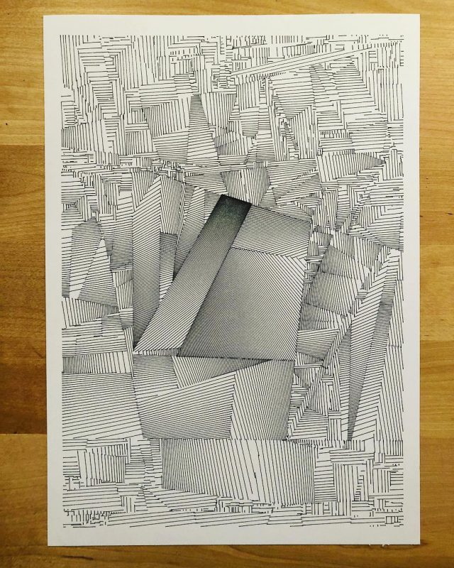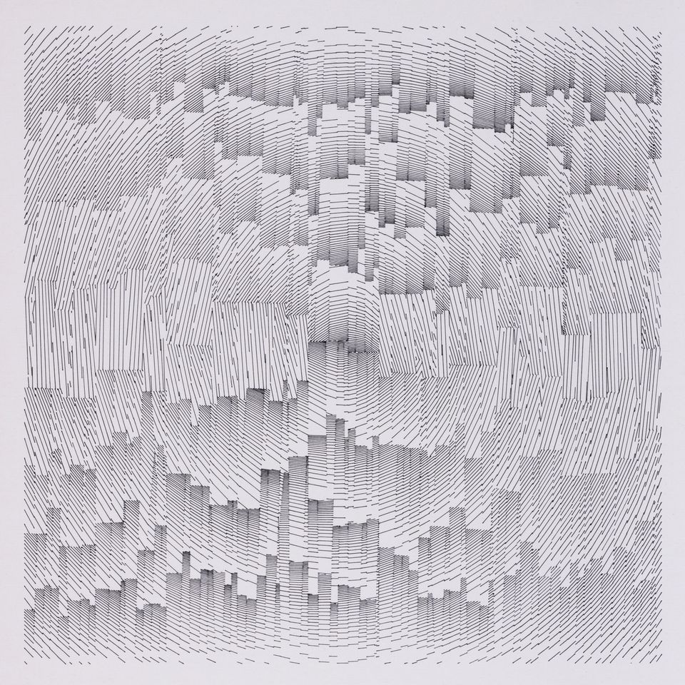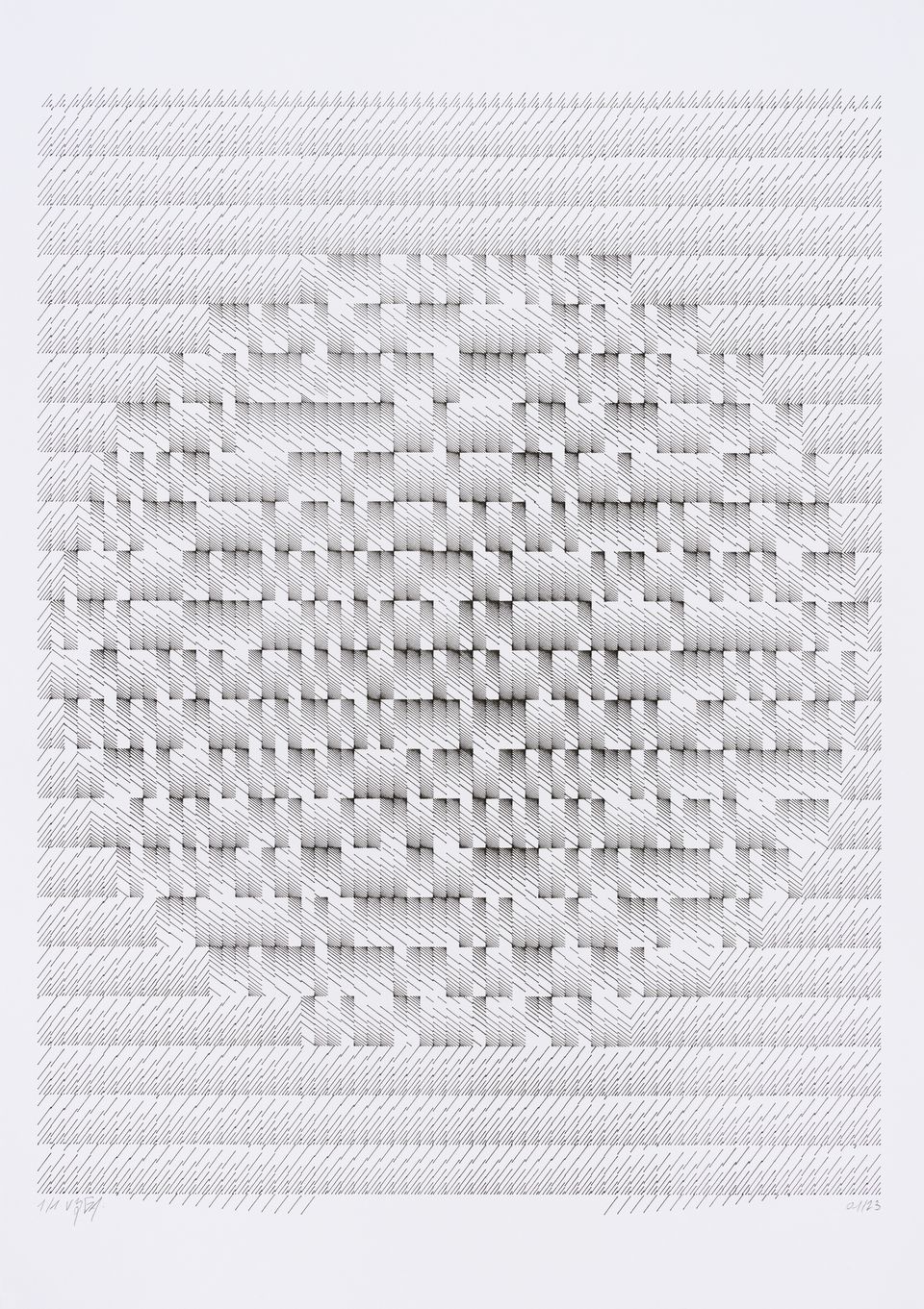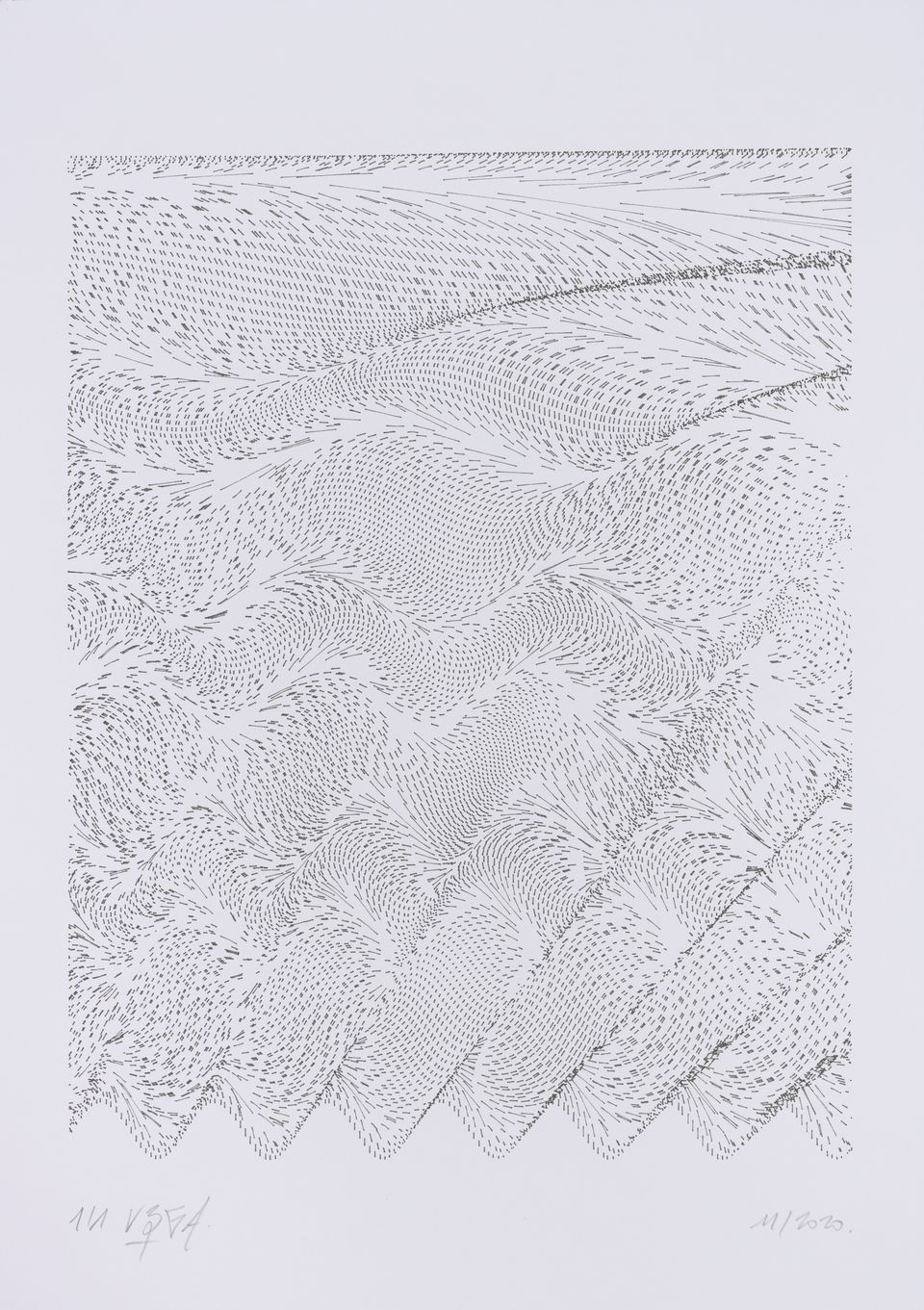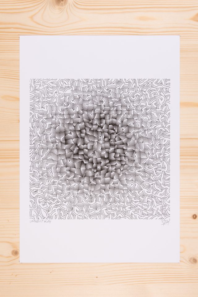 The algorithm used in these artworks starts from a rectangular grid whose cells are filled with lines, the density and orientation of which are modulated depending on their position relative to a epicentre, leading to those rhythmic and symmetrical compositions evoking the propagation of an abstract wave onto the drawing surface.