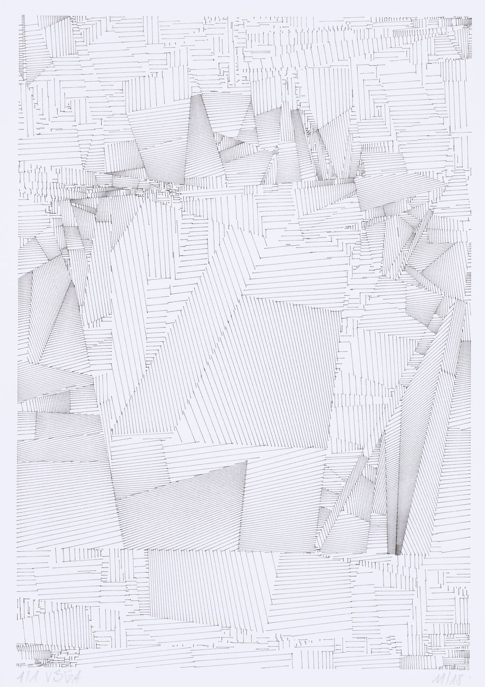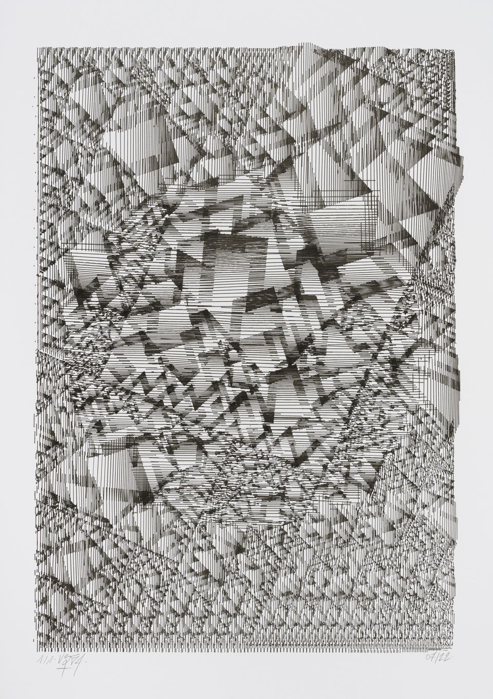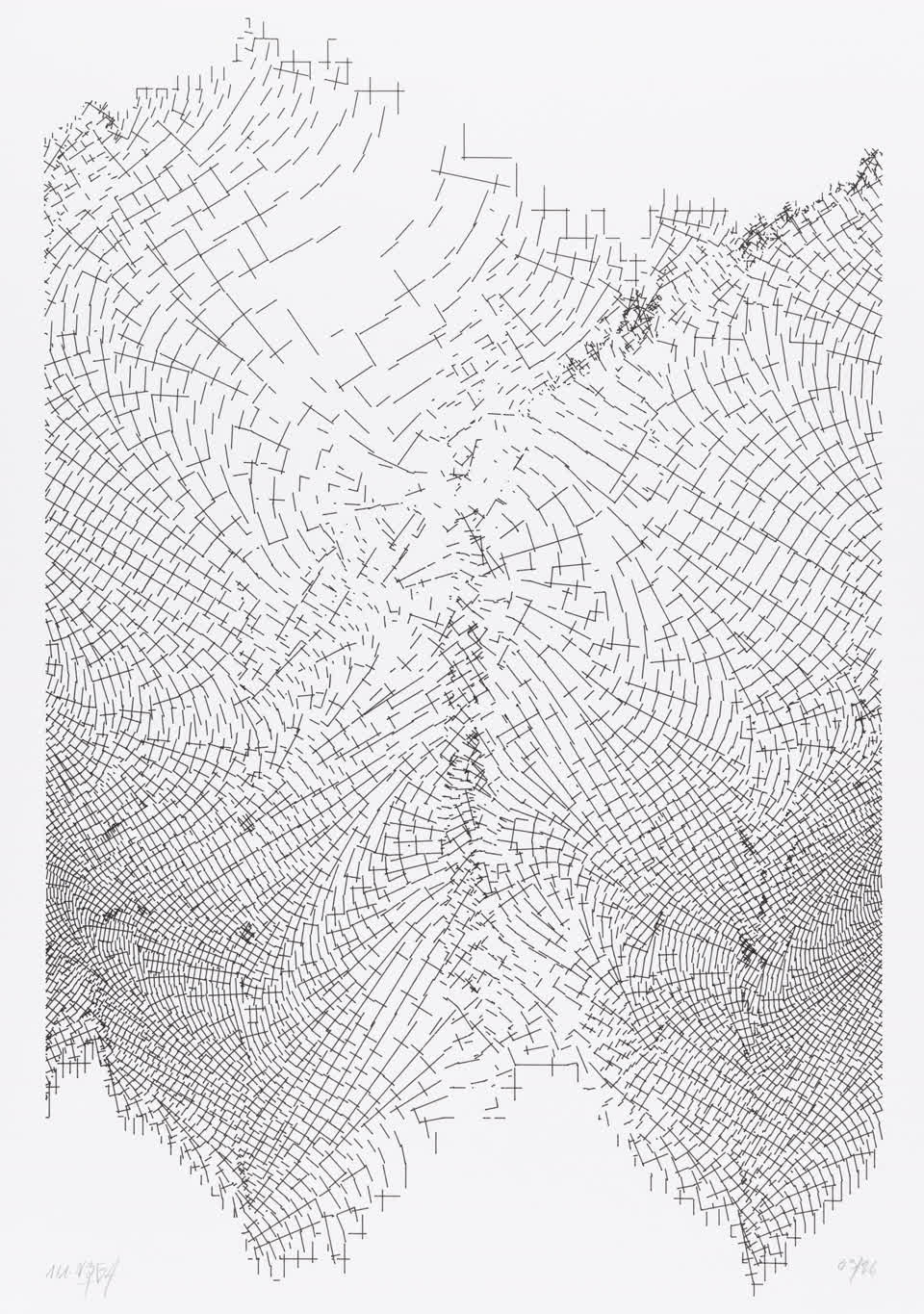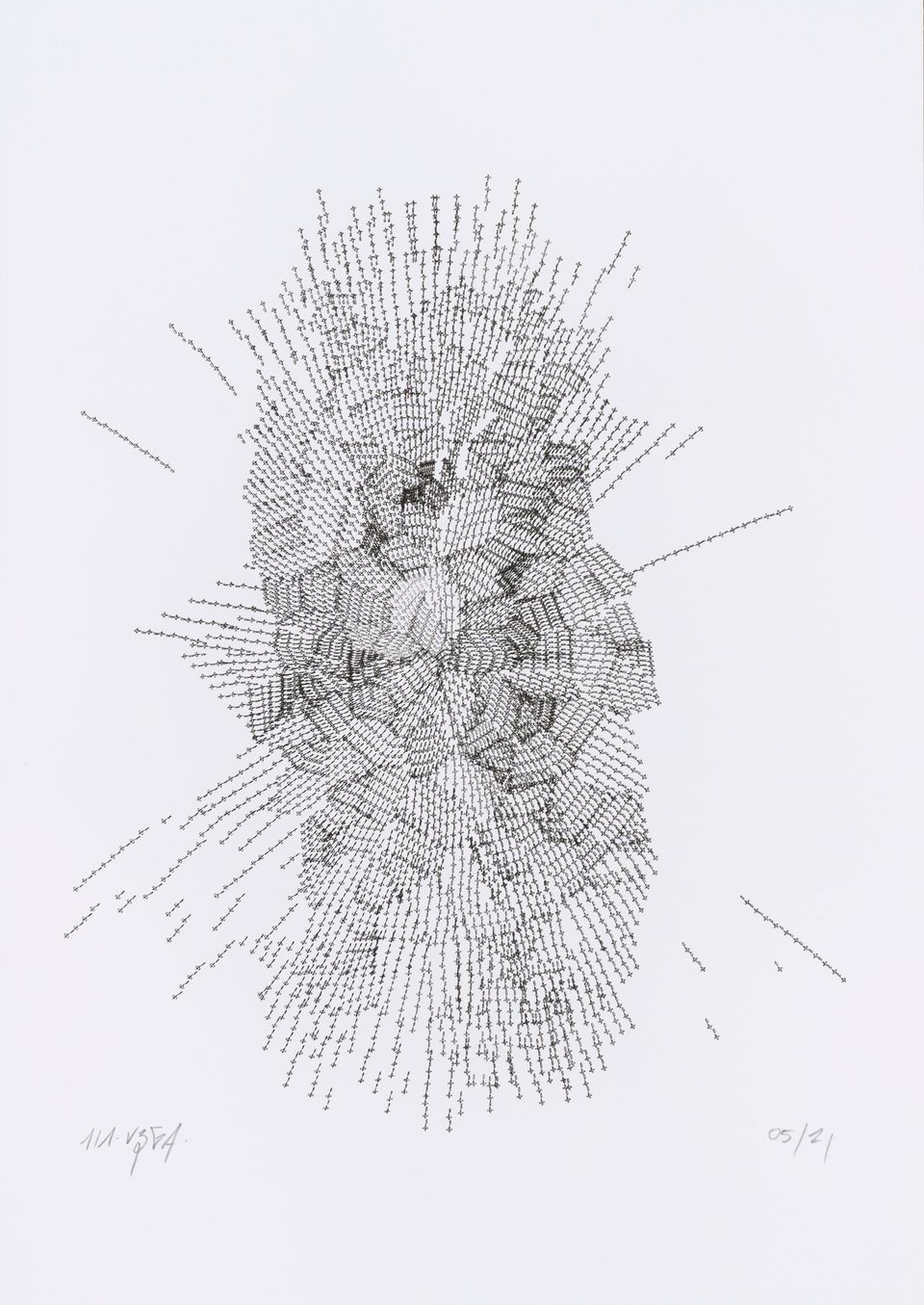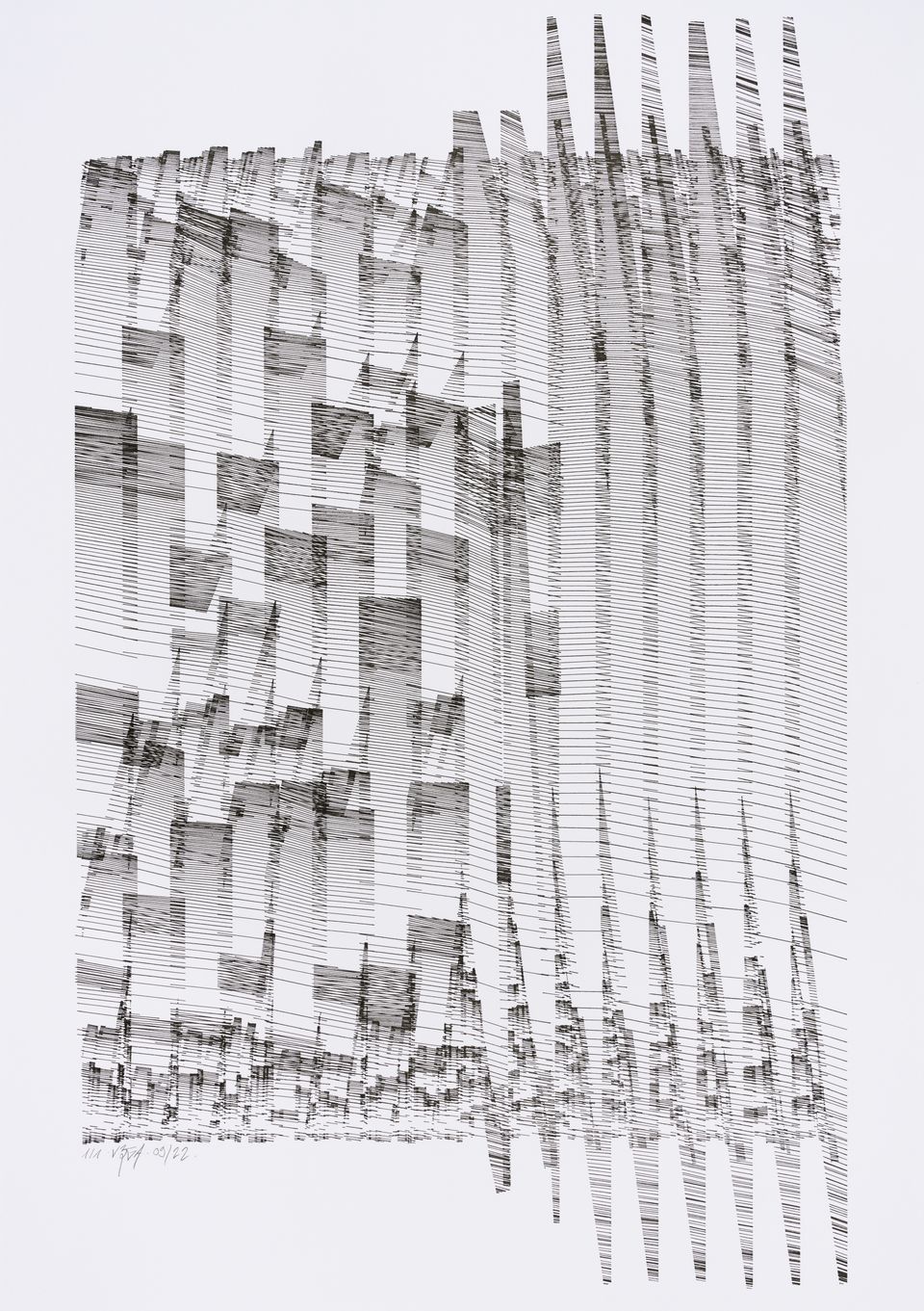 The algorithm used in these artworks starts from a rectangular grid whose cells are filled with lines, the density and orientation of which are modulated depending on their position relative to a epicentre, leading to those rhythmic and symmetrical compositions evoking the propagation of an abstract wave onto the drawing surface.