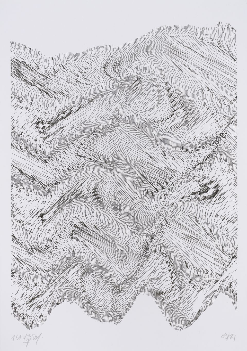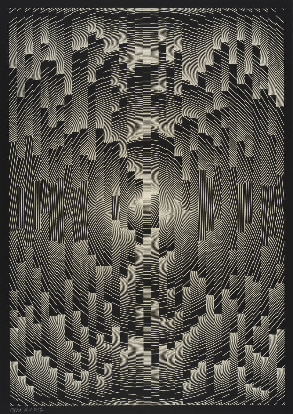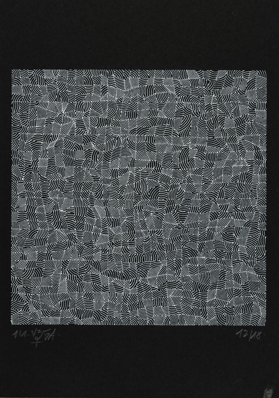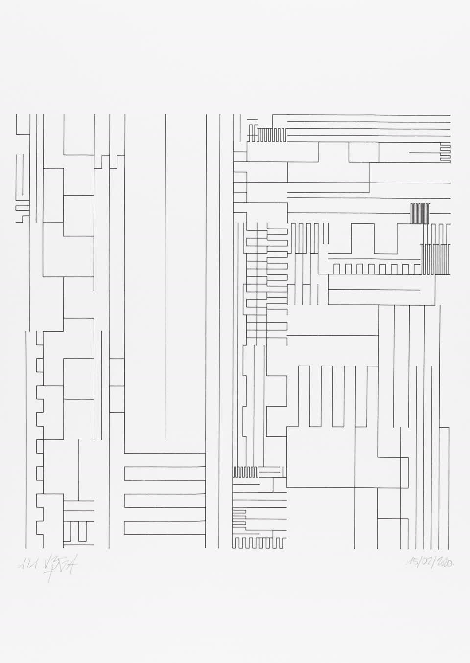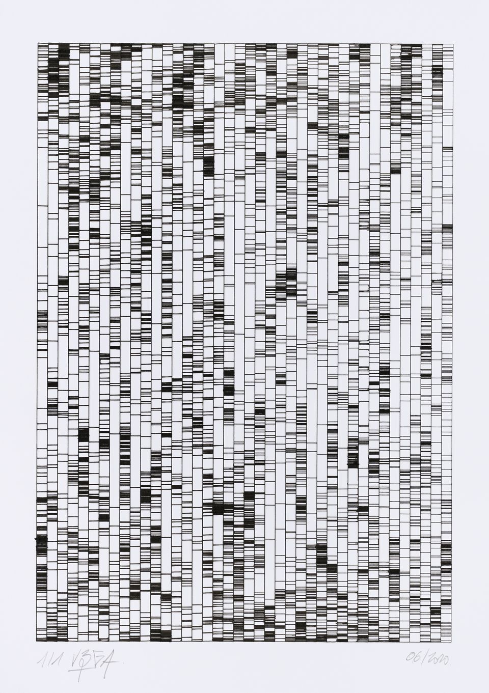 The algorithm used in these artworks starts from a rectangular grid whose cells are filled with lines, the density and orientation of which are modulated depending on their position relative to a epicentre, leading to those rhythmic and symmetrical compositions evoking the propagation of an abstract wave onto the drawing surface.