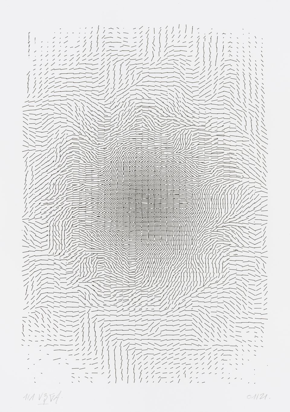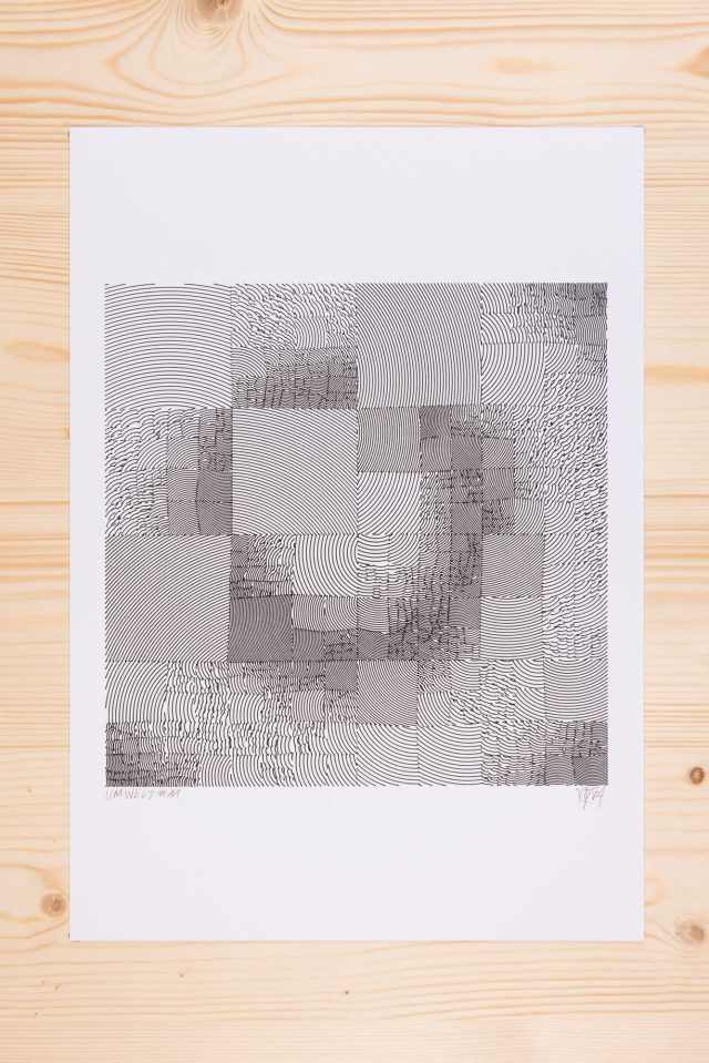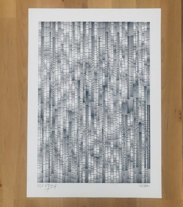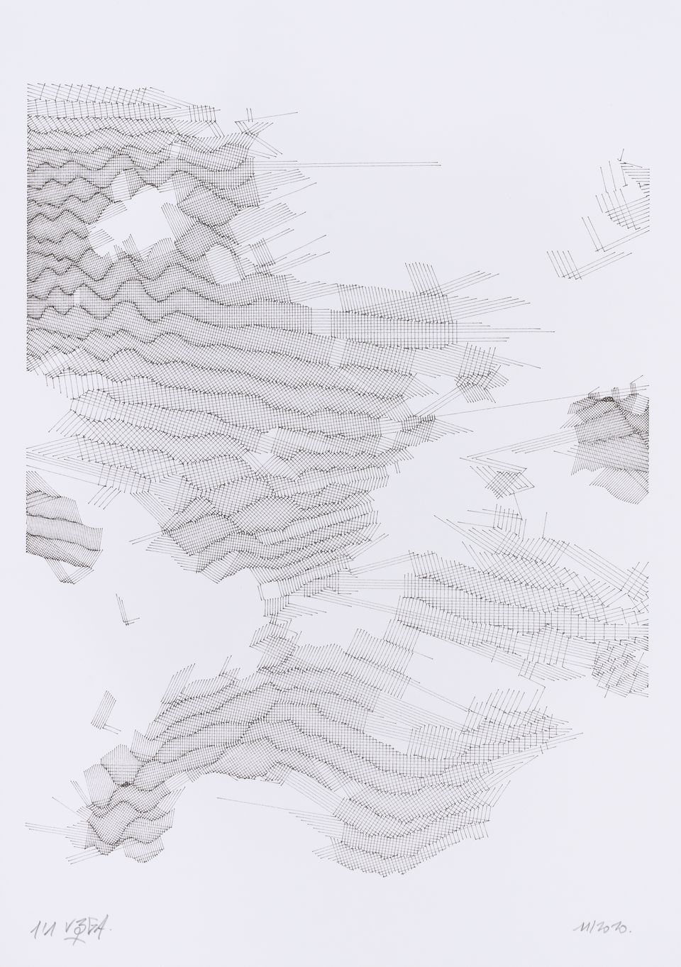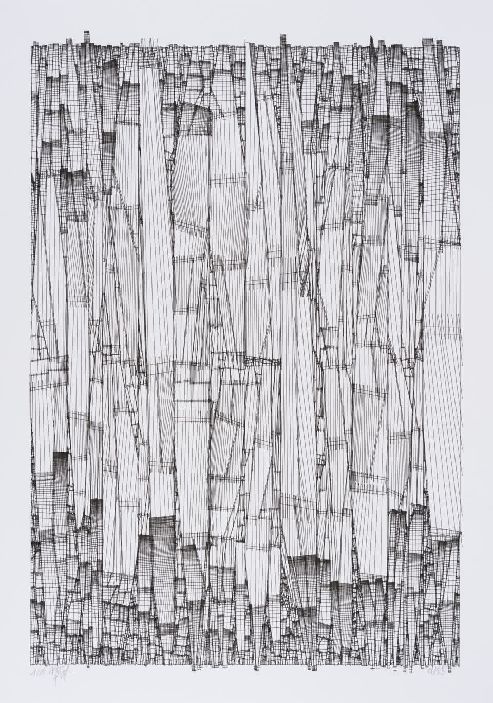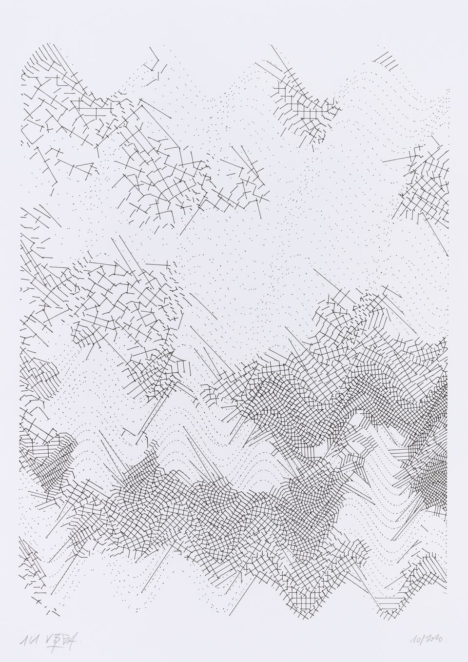 The algorithm used in these artworks starts from a rectangular grid whose cells are filled with lines, the density and orientation of which are modulated depending on their position relative to a epicentre, leading to those rhythmic and symmetrical compositions evoking the propagation of an abstract wave onto the drawing surface.