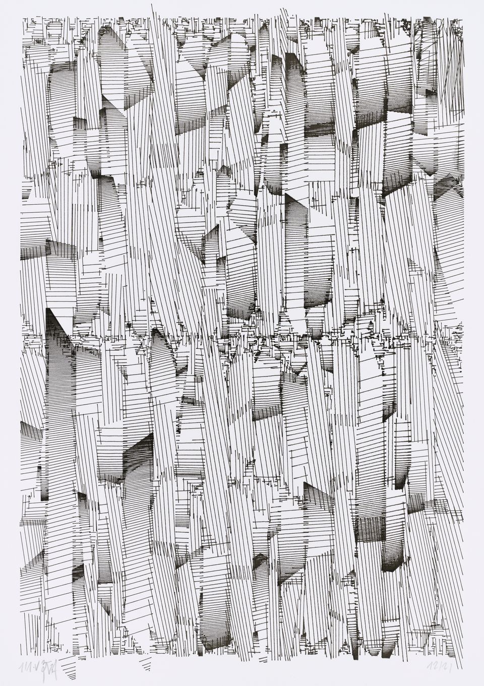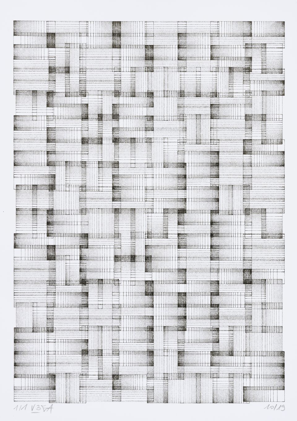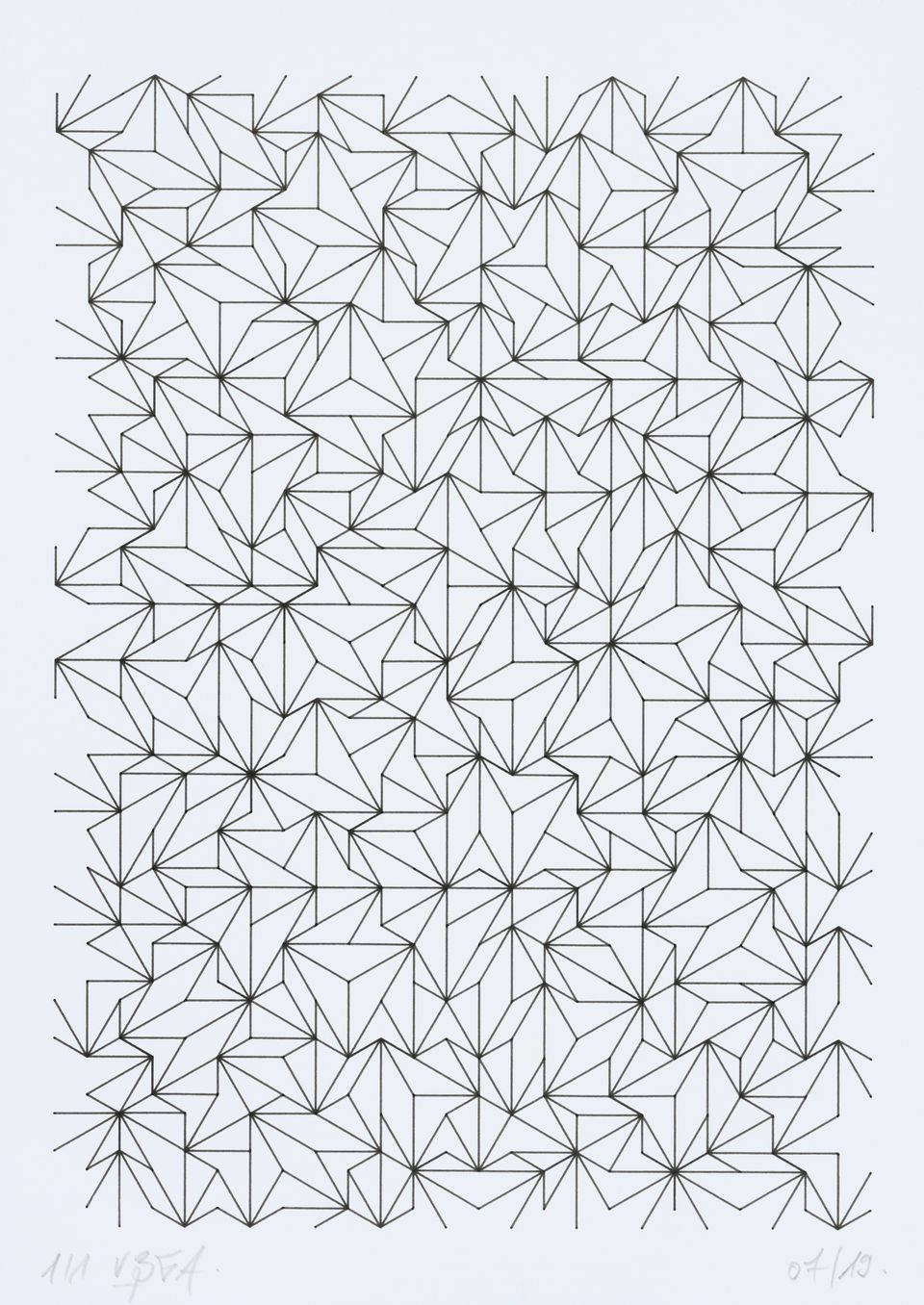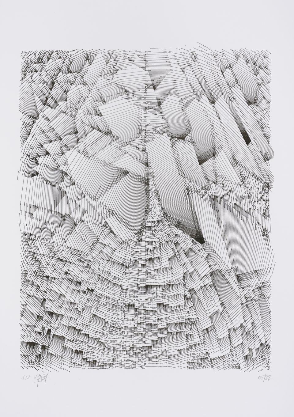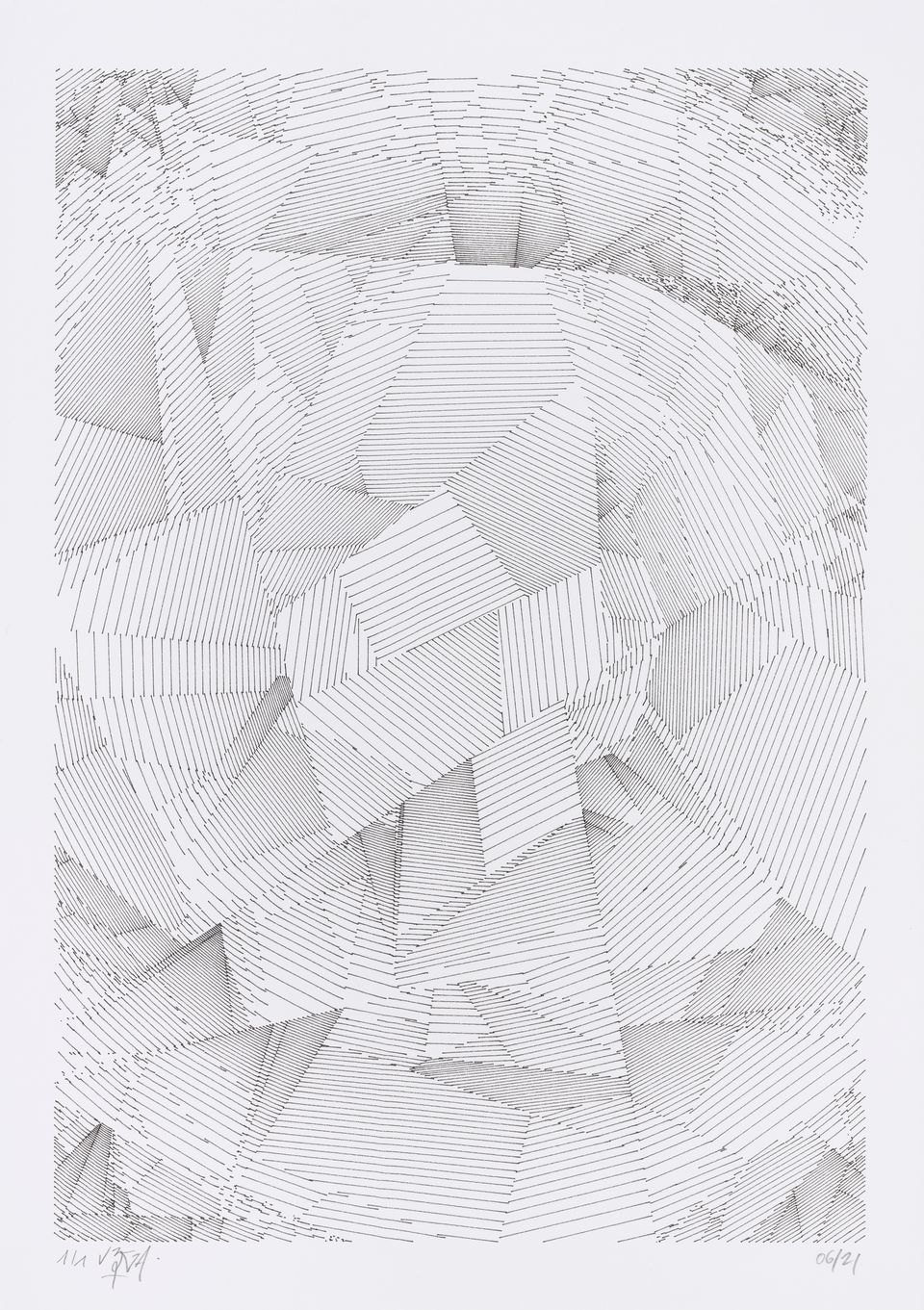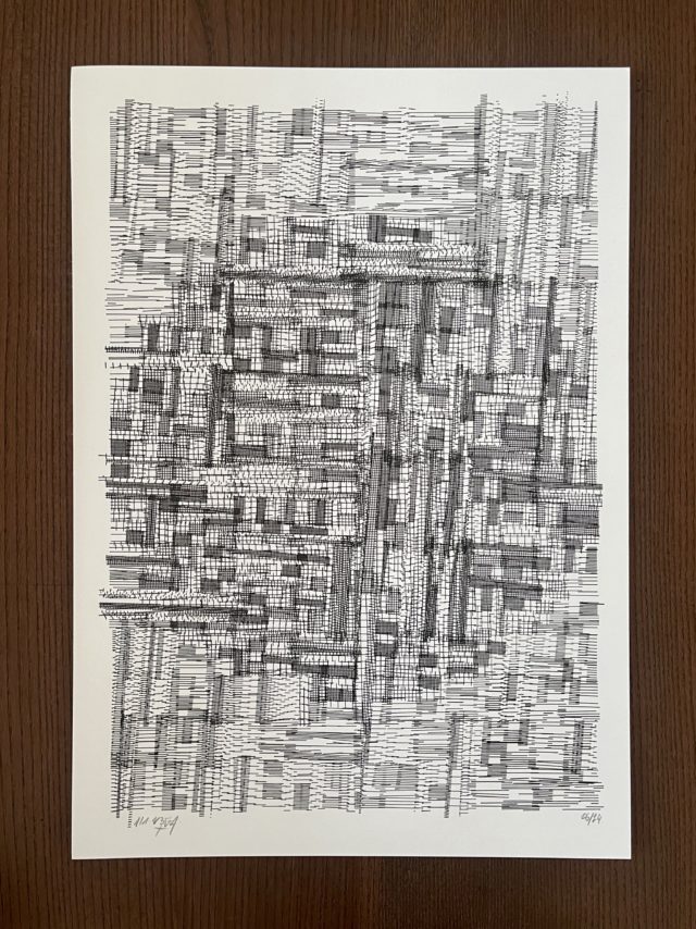 The algorithm used in these artworks starts from a rectangular grid whose cells are filled with lines, the density and orientation of which are modulated depending on their position relative to a epicentre, leading to those rhythmic and symmetrical compositions evoking the propagation of an abstract wave onto the drawing surface.