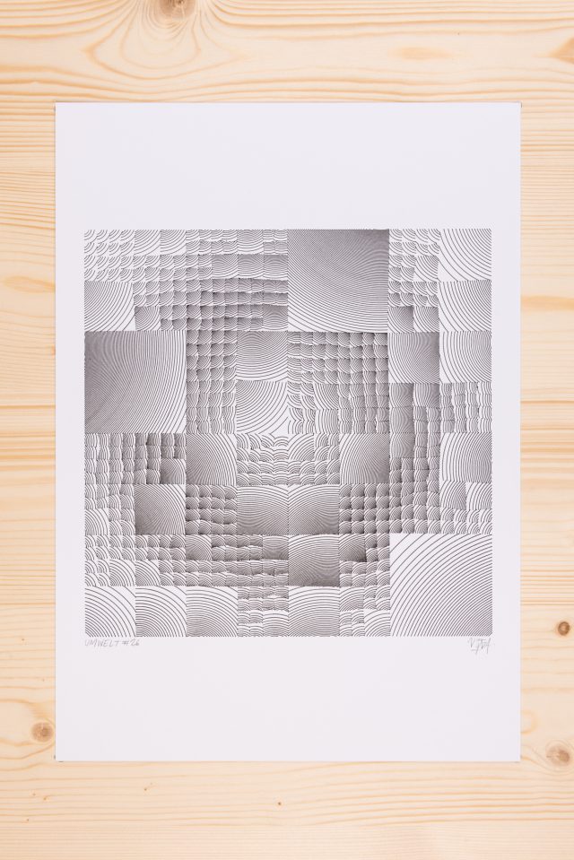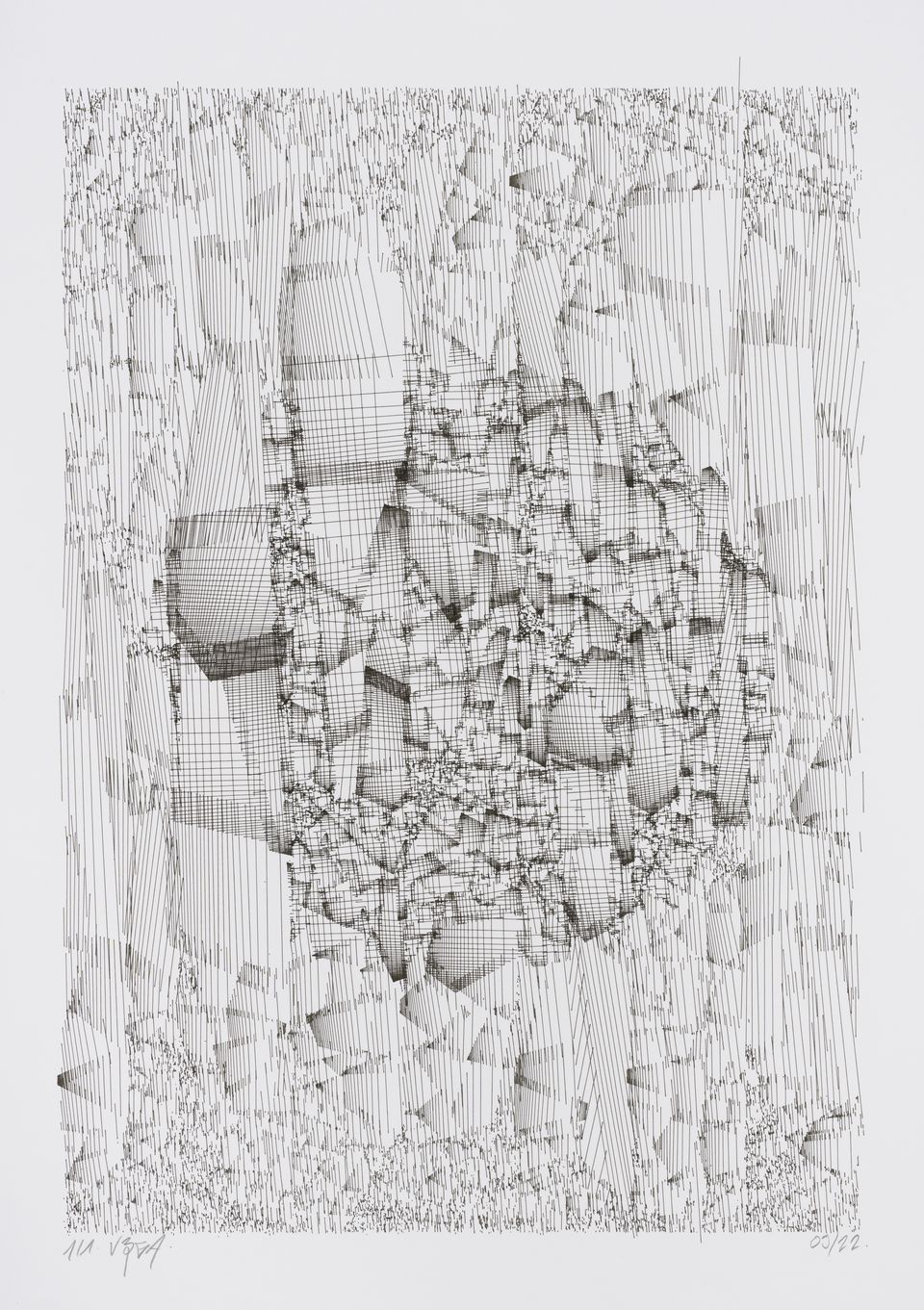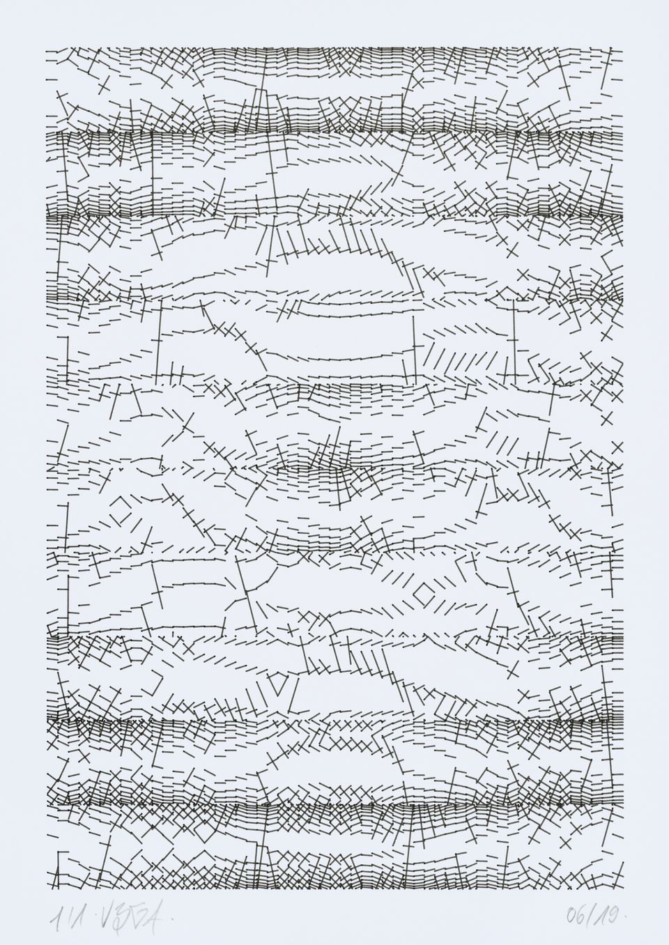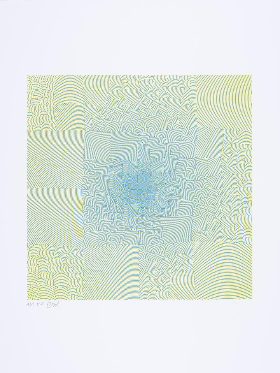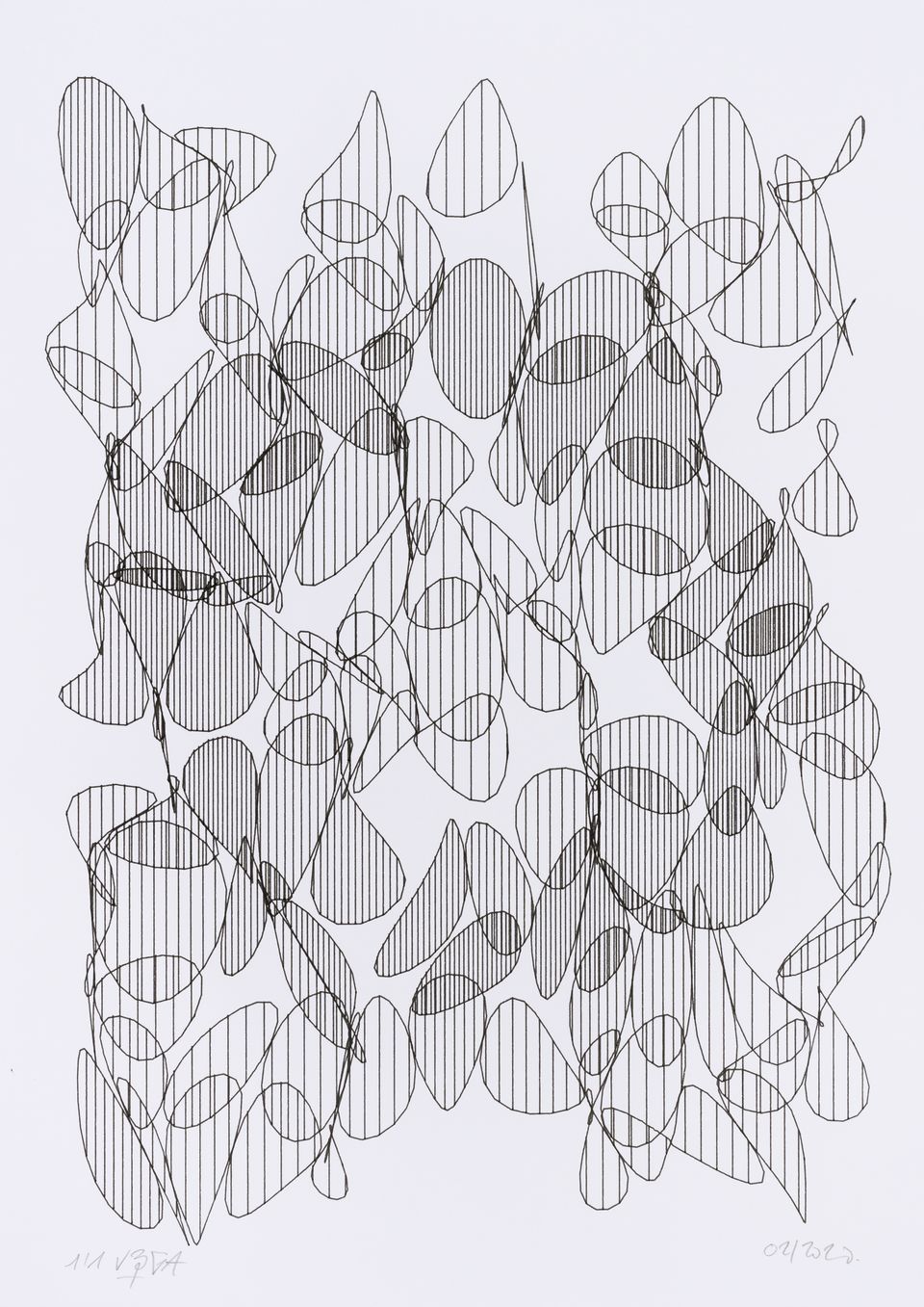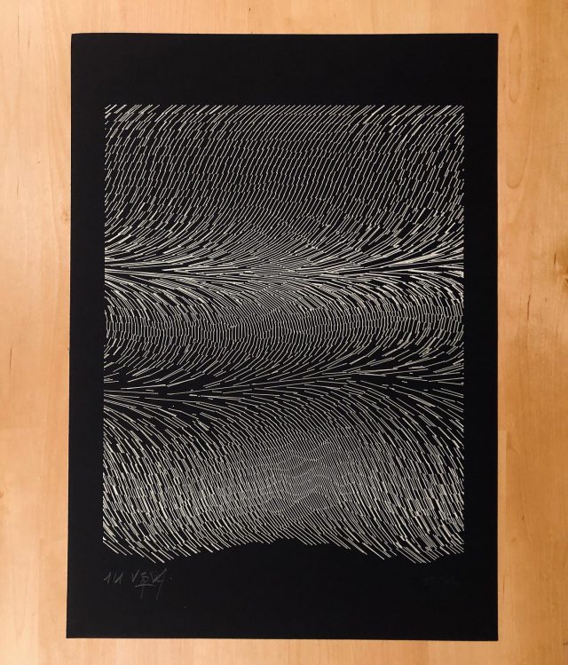 The algorithm used in these artworks starts from a rectangular grid whose cells are filled with lines, the density and orientation of which are modulated depending on their position relative to a epicentre, leading to those rhythmic and symmetrical compositions evoking the propagation of an abstract wave onto the drawing surface.