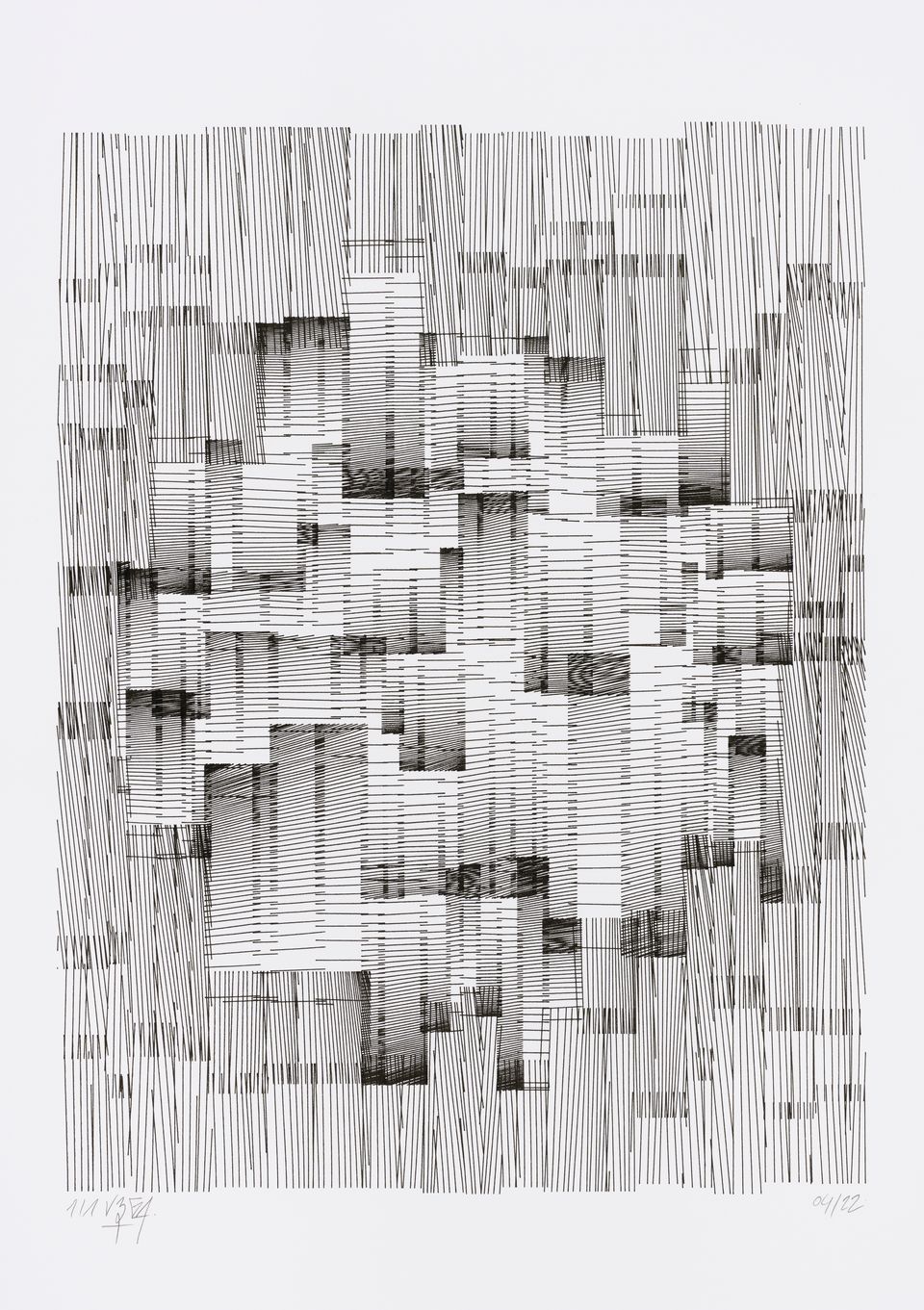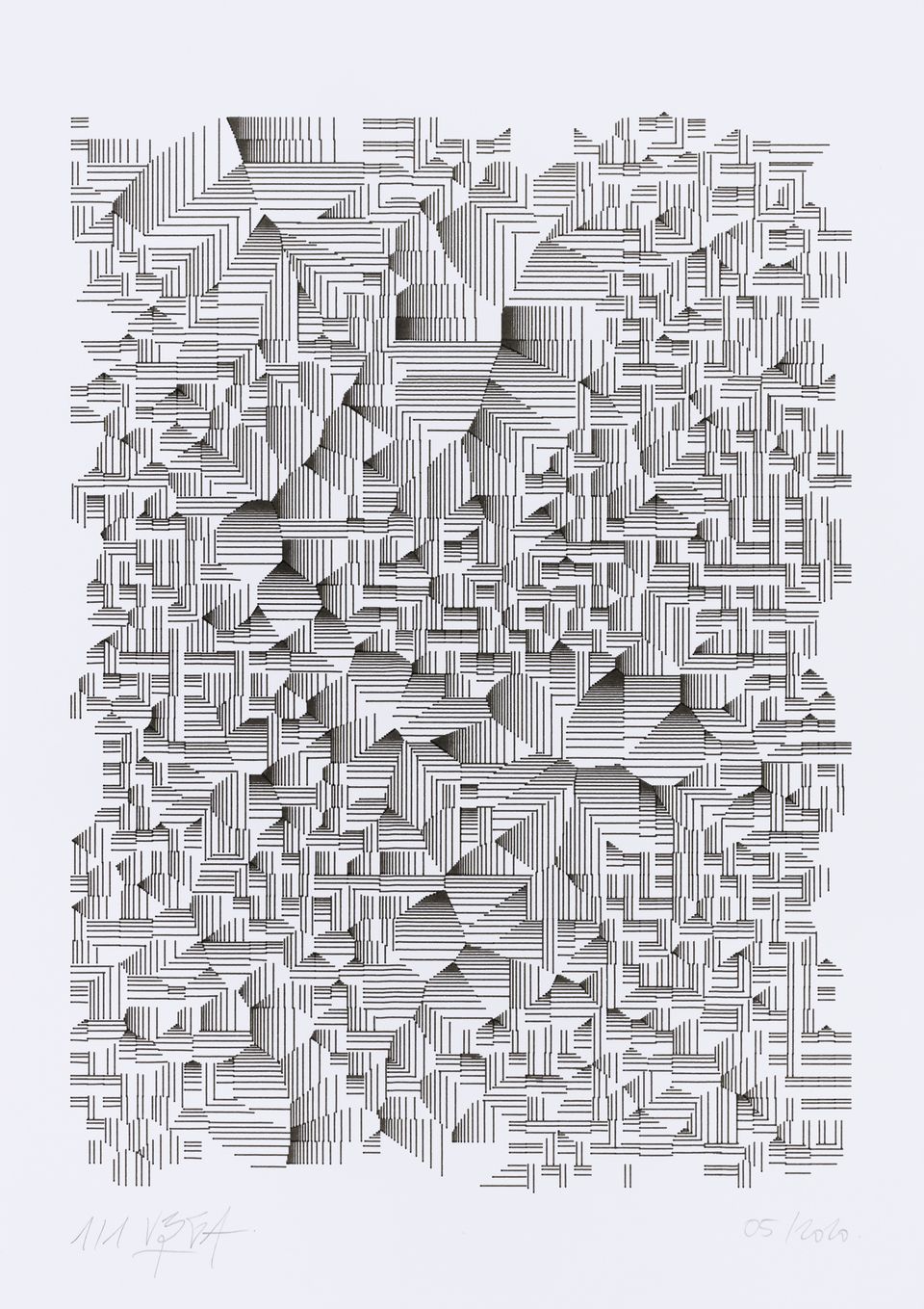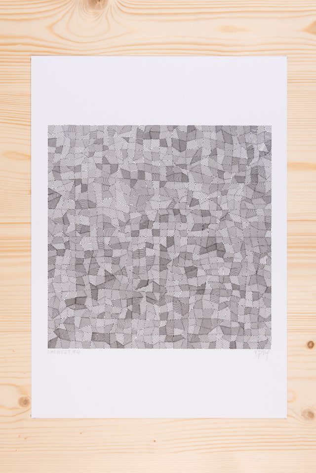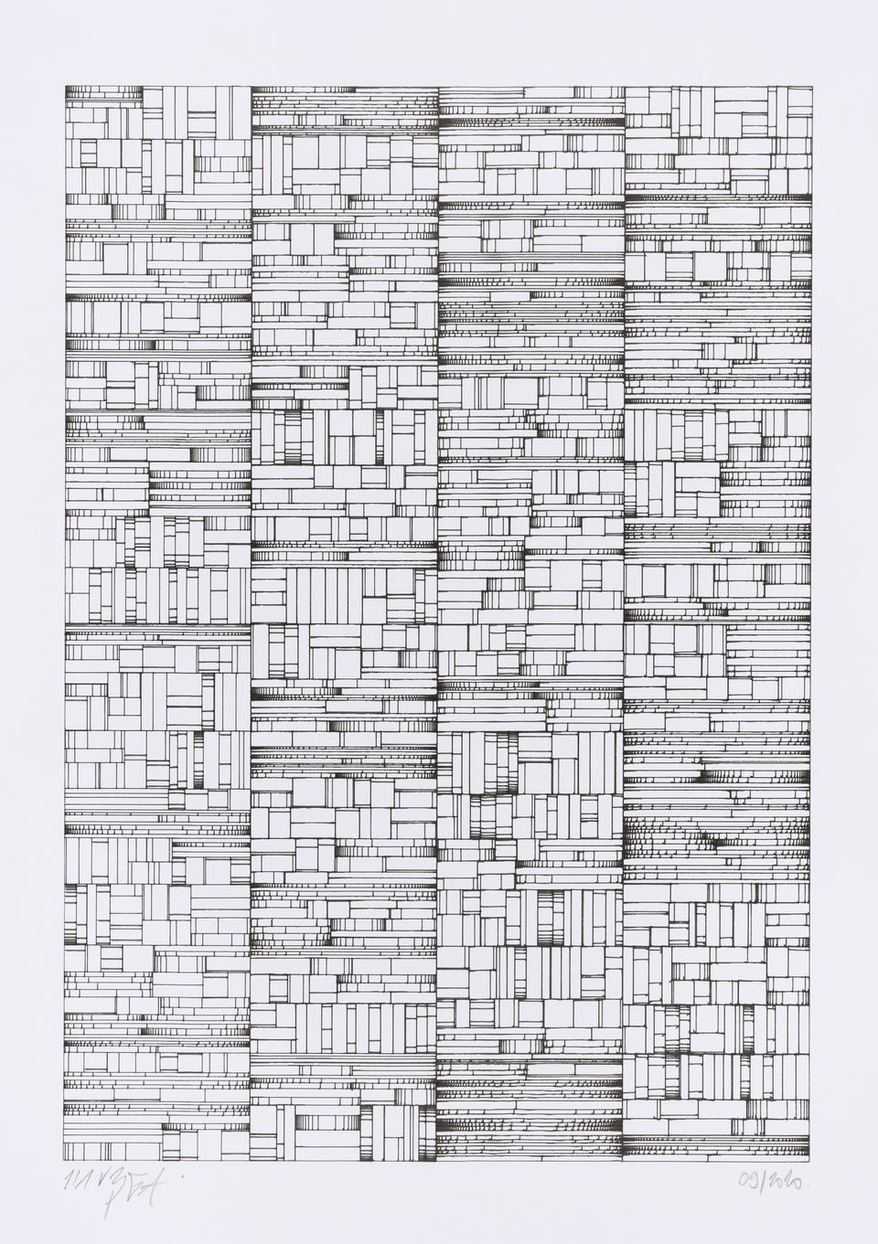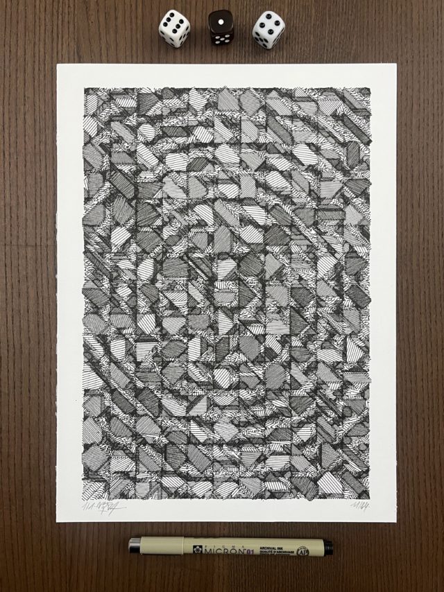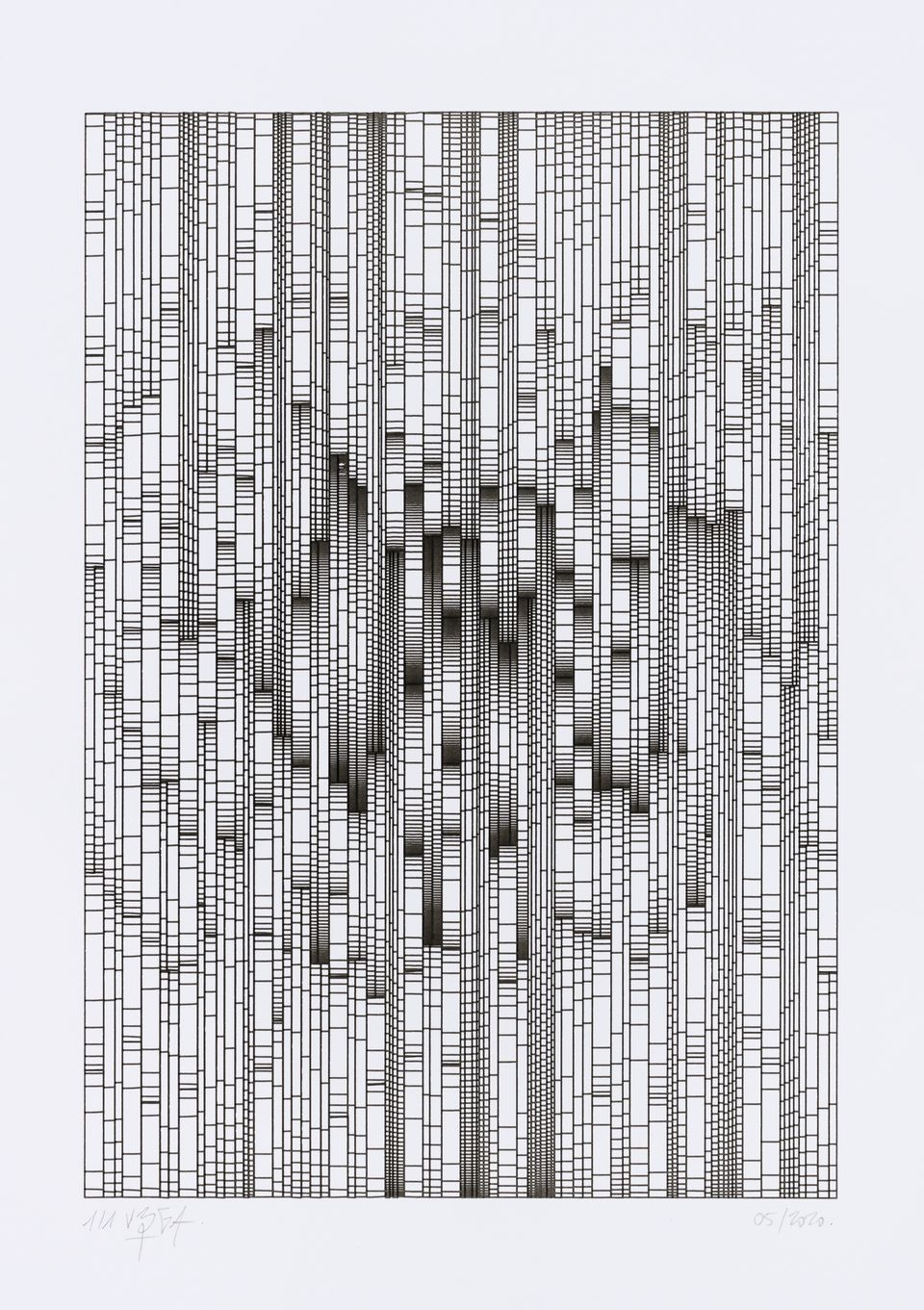 The algorithm used in these artworks starts from a rectangular grid whose cells are filled with lines, the density and orientation of which are modulated depending on their position relative to a epicentre, leading to those rhythmic and symmetrical compositions evoking the propagation of an abstract wave onto the drawing surface.