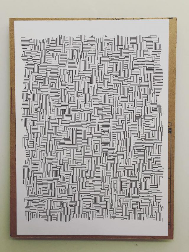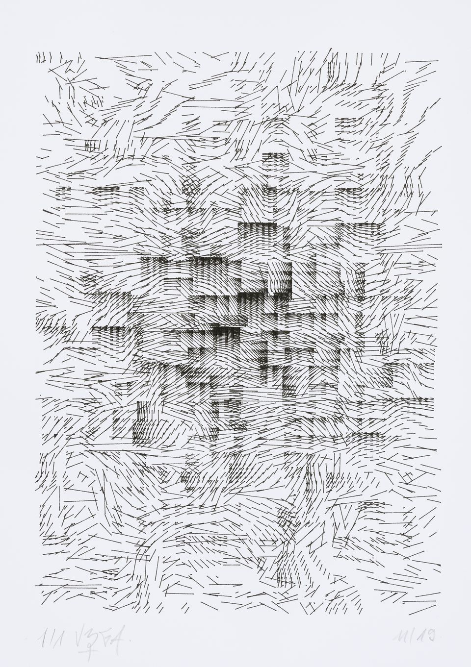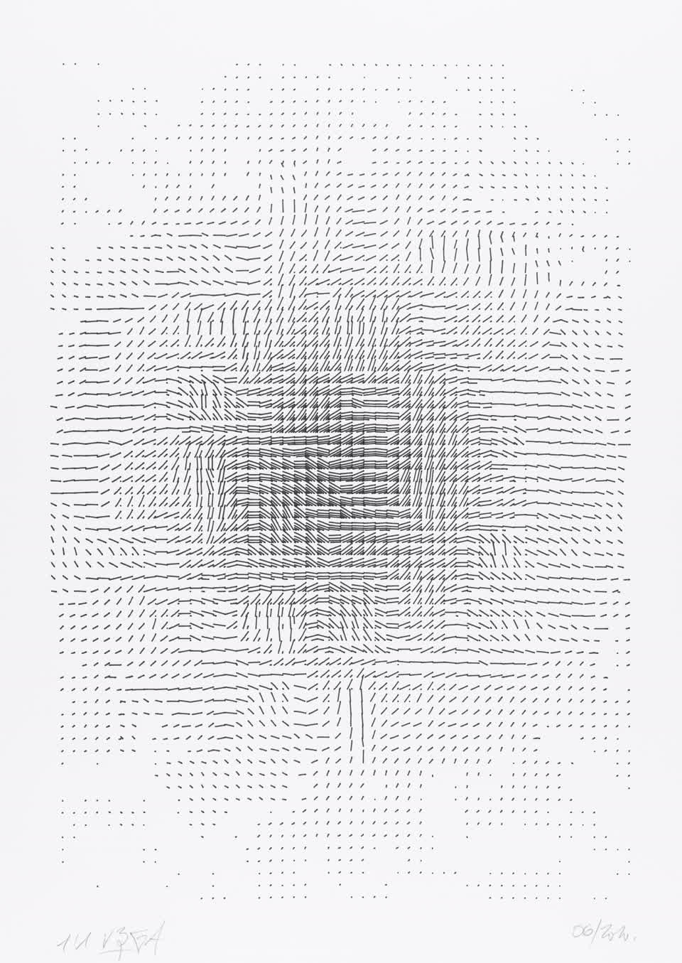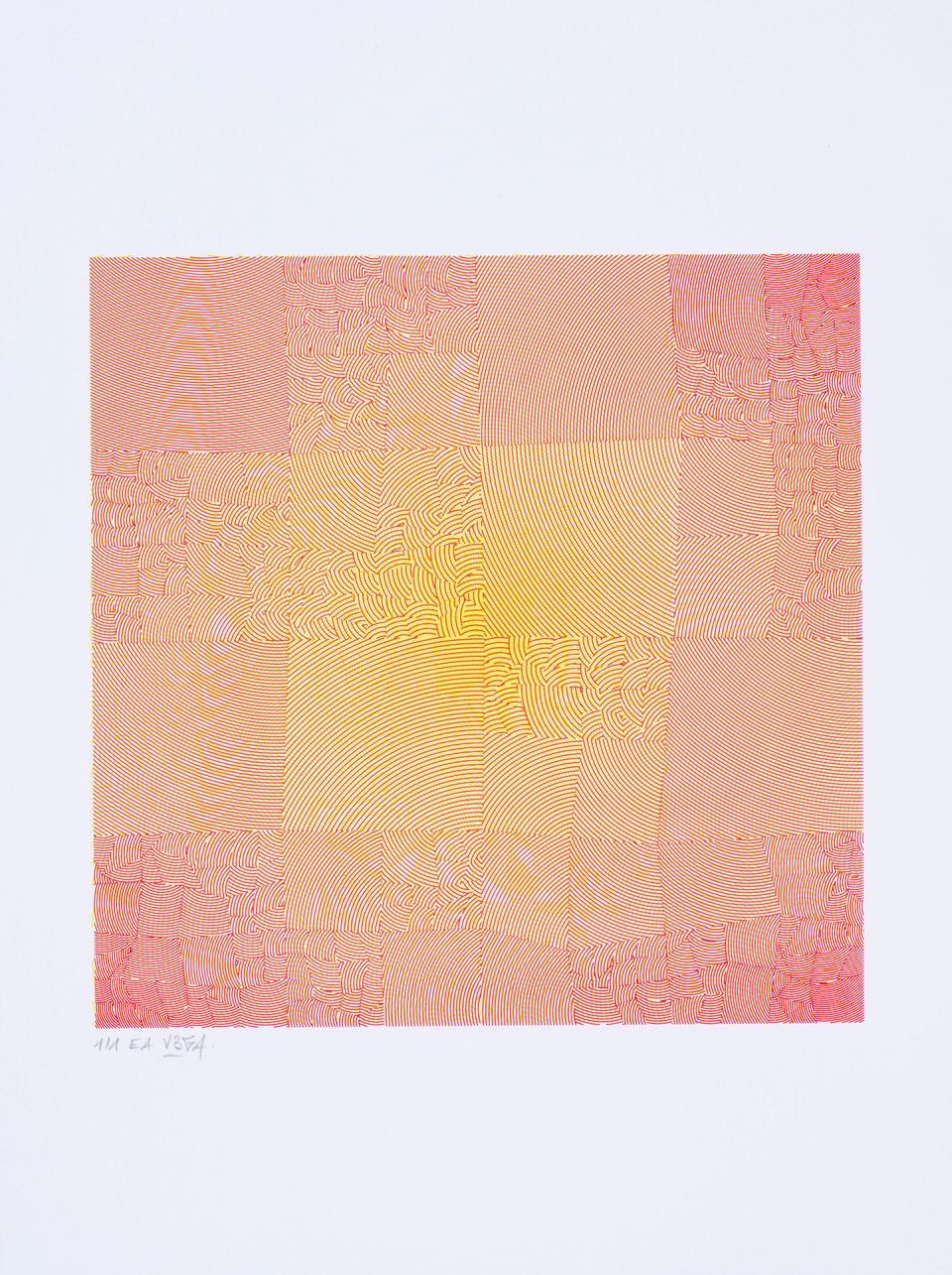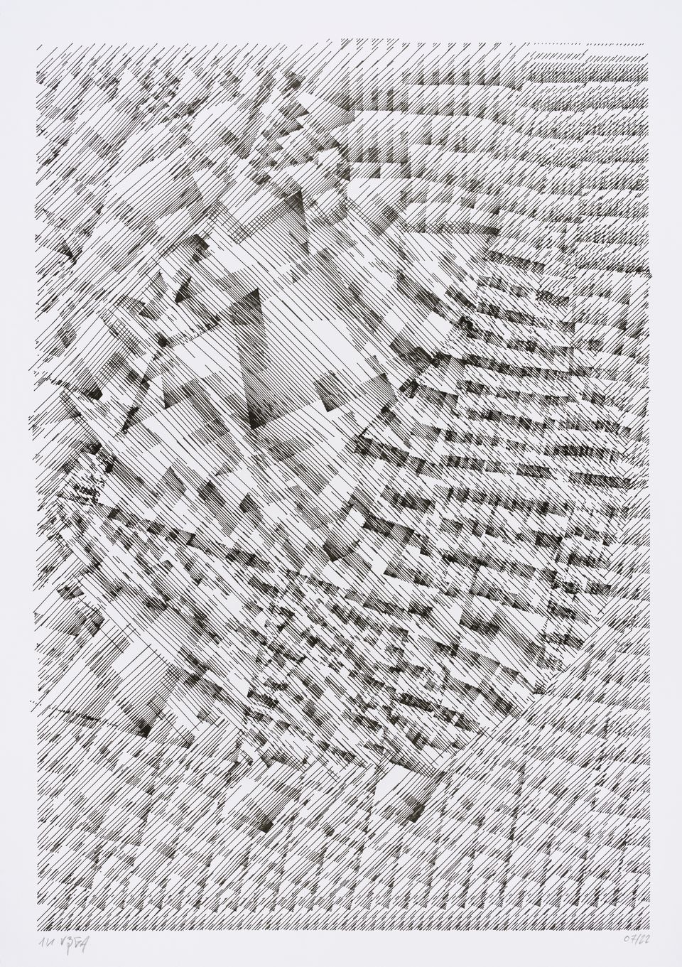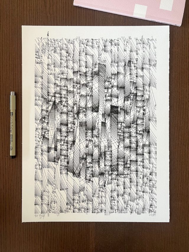 The algorithm used in these artworks starts from a rectangular grid whose cells are filled with lines, the density and orientation of which are modulated depending on their position relative to a epicentre, leading to those rhythmic and symmetrical compositions evoking the propagation of an abstract wave onto the drawing surface.