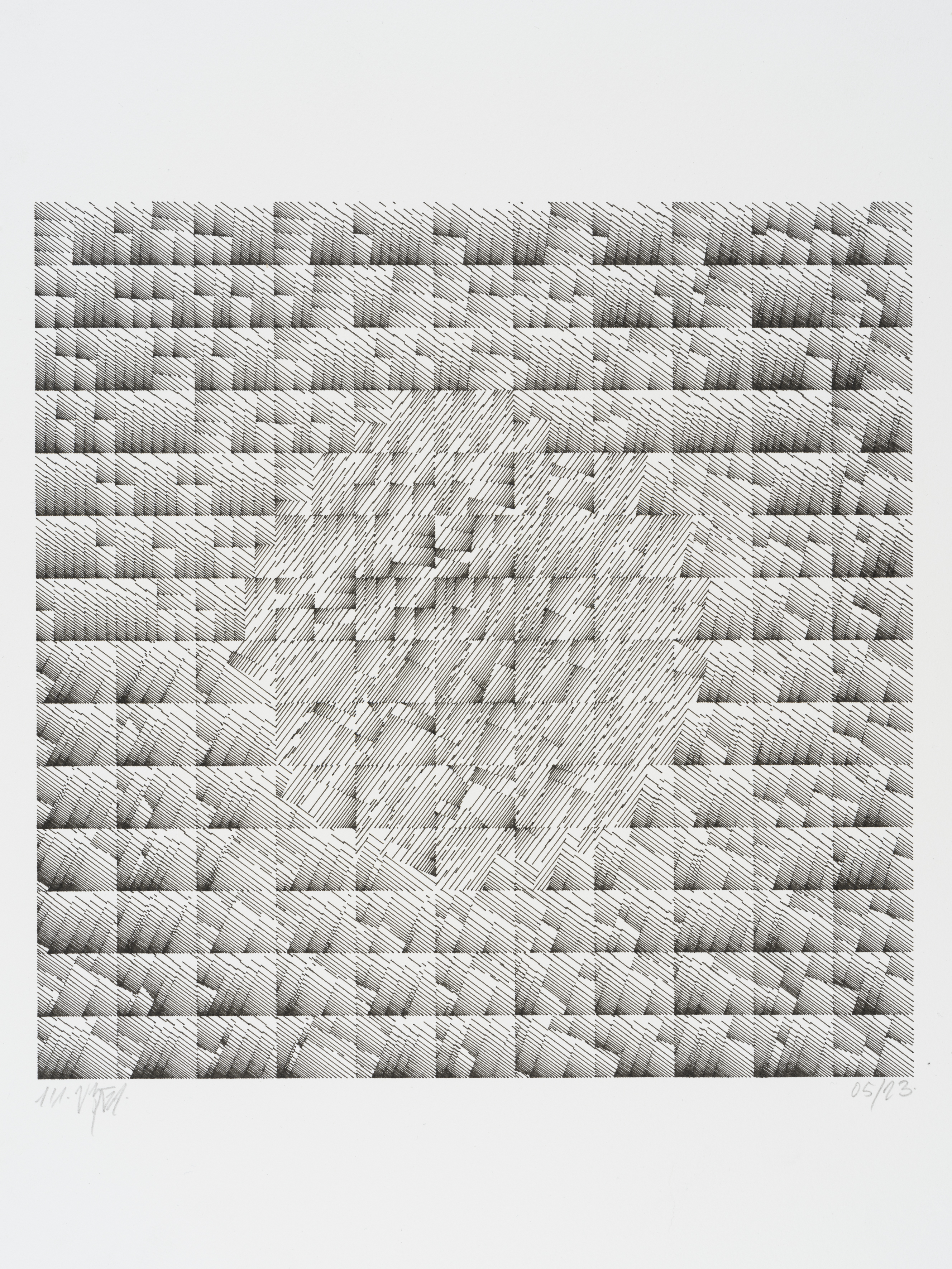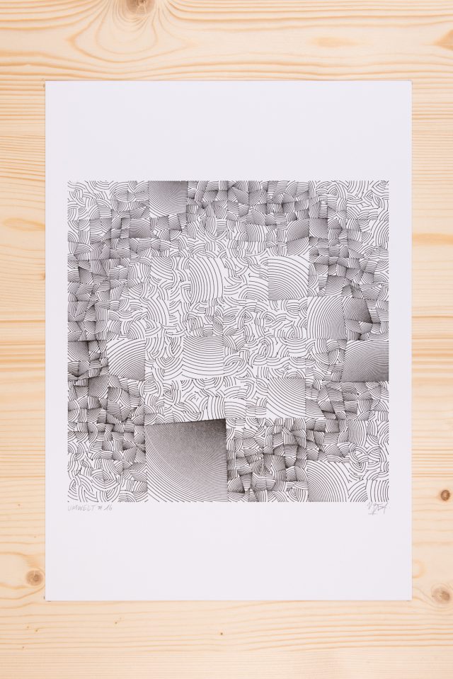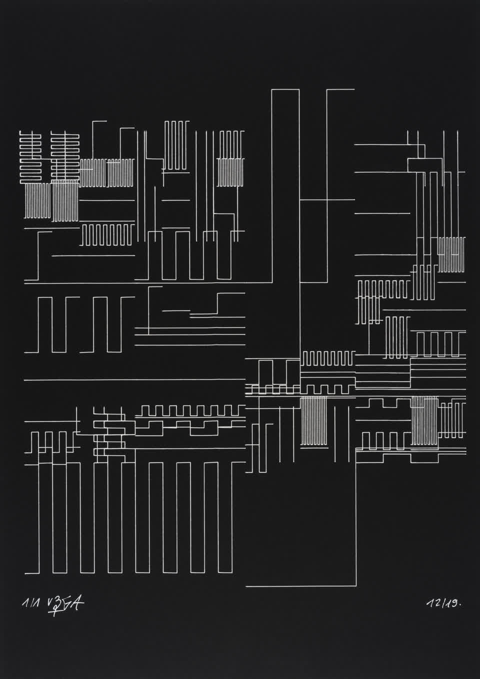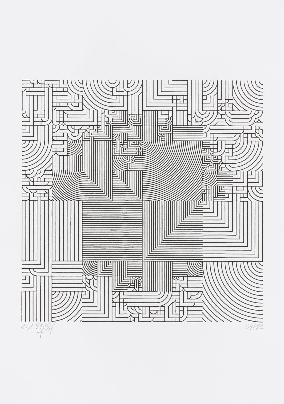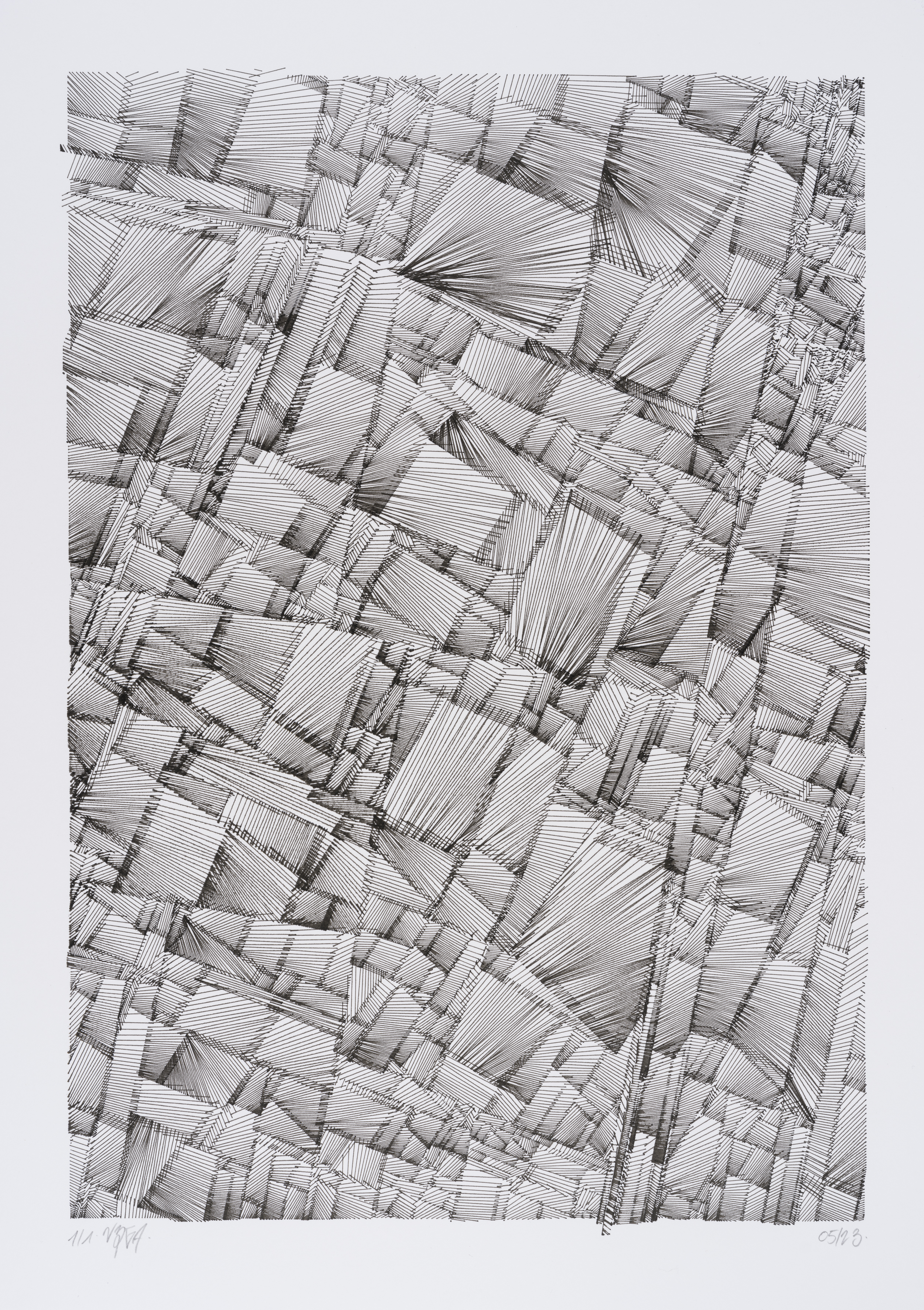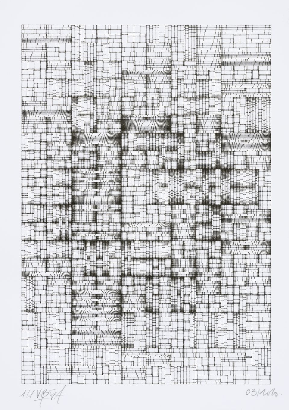 The algorithm used in these artworks starts from a rectangular grid whose cells are filled with lines, the density and orientation of which are modulated depending on their position relative to a epicentre, leading to those rhythmic and symmetrical compositions evoking the propagation of an abstract wave onto the drawing surface.