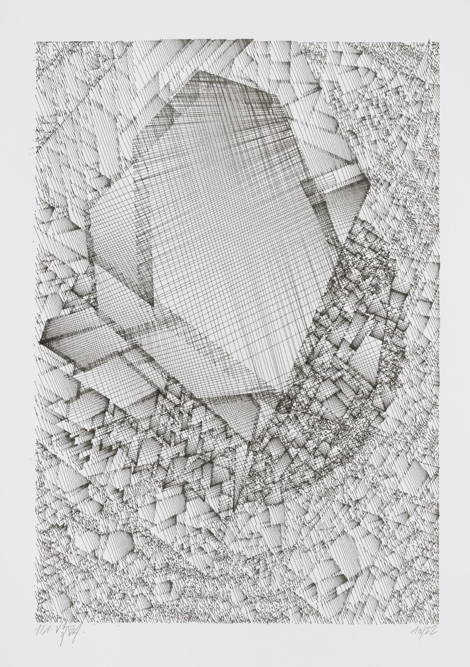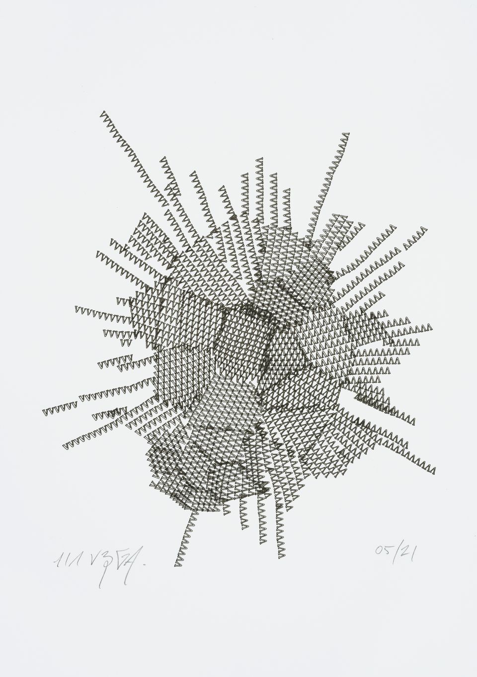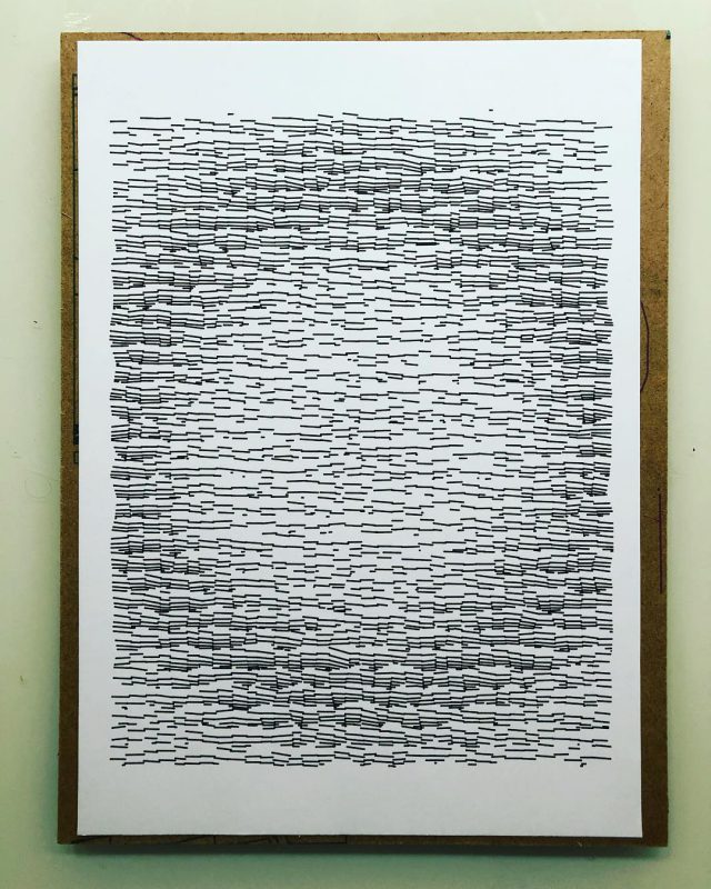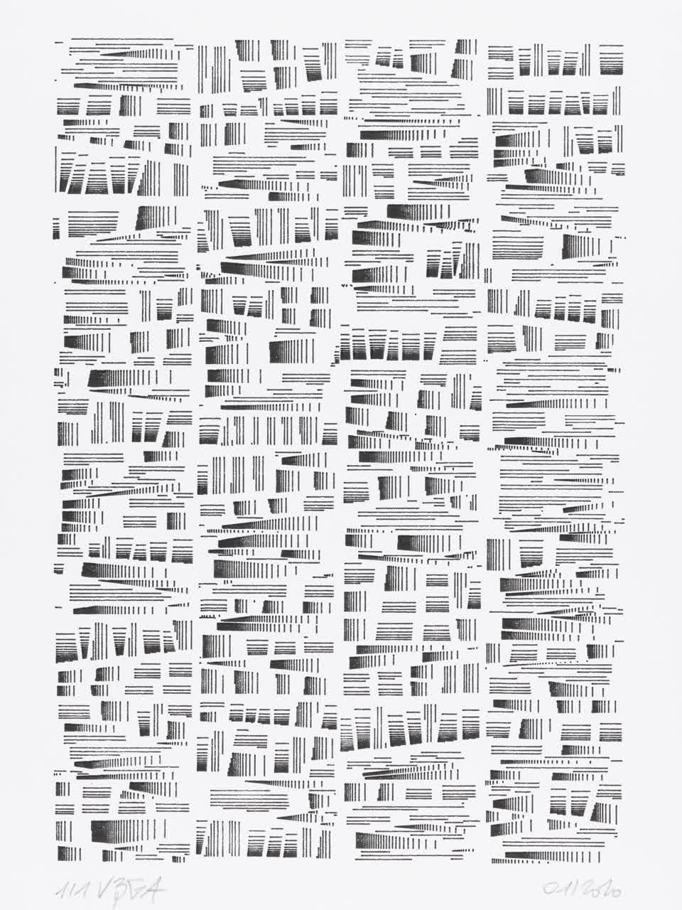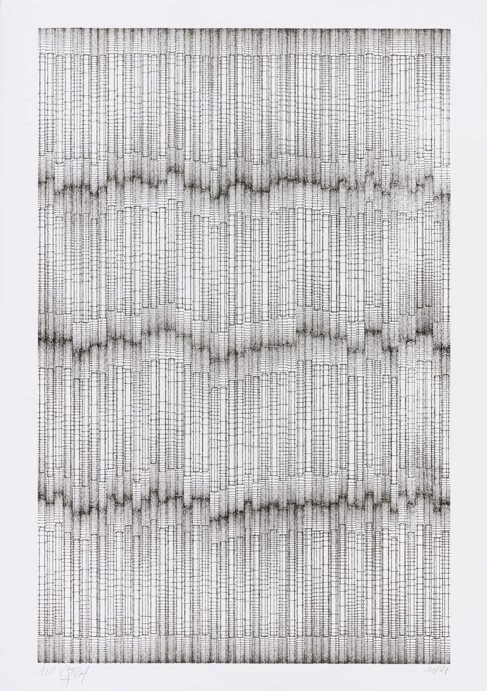 The algorithm used in these artworks starts from a rectangular grid whose cells are filled with lines, the density and orientation of which are modulated depending on their position relative to a epicentre, leading to those rhythmic and symmetrical compositions evoking the propagation of an abstract wave onto the drawing surface.