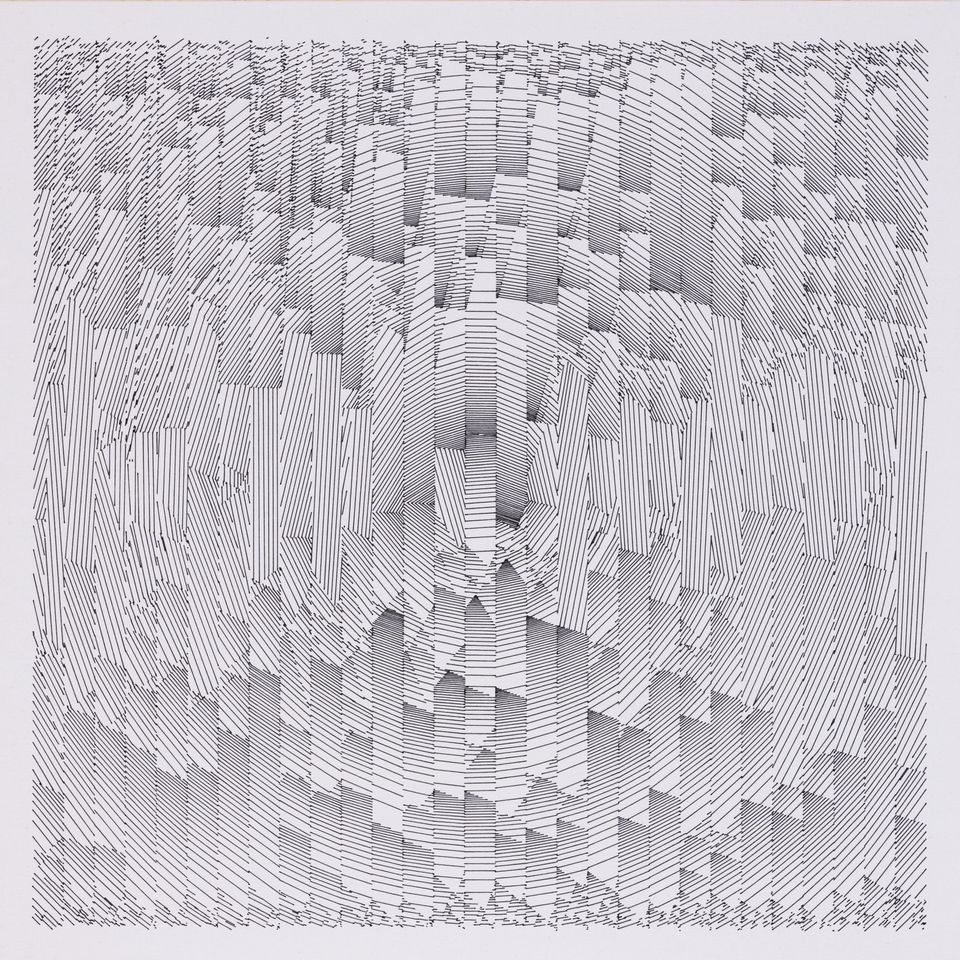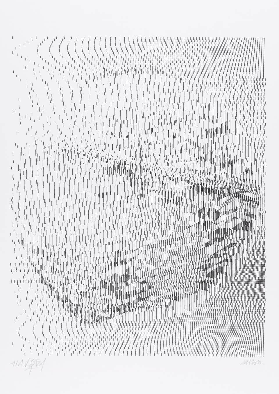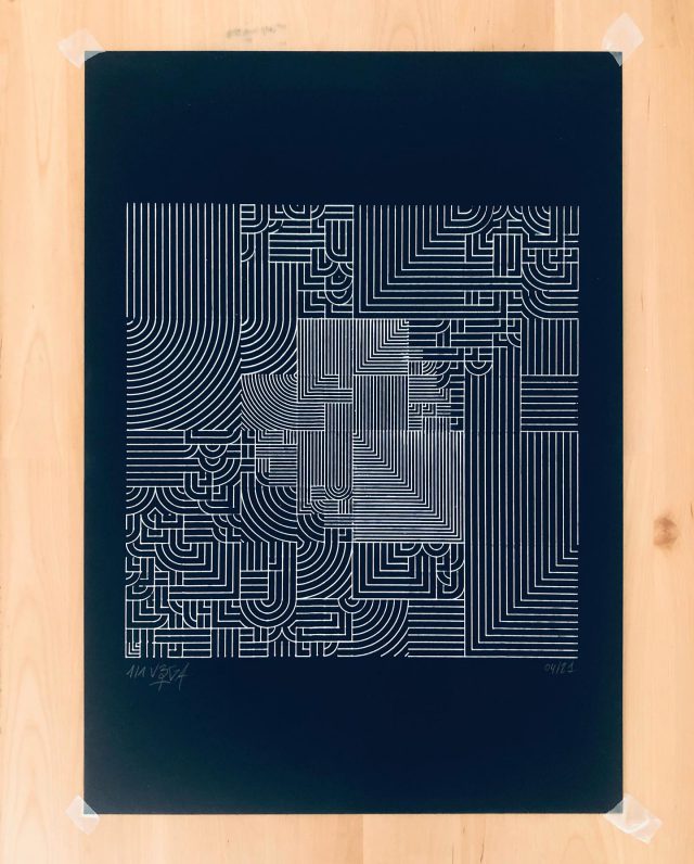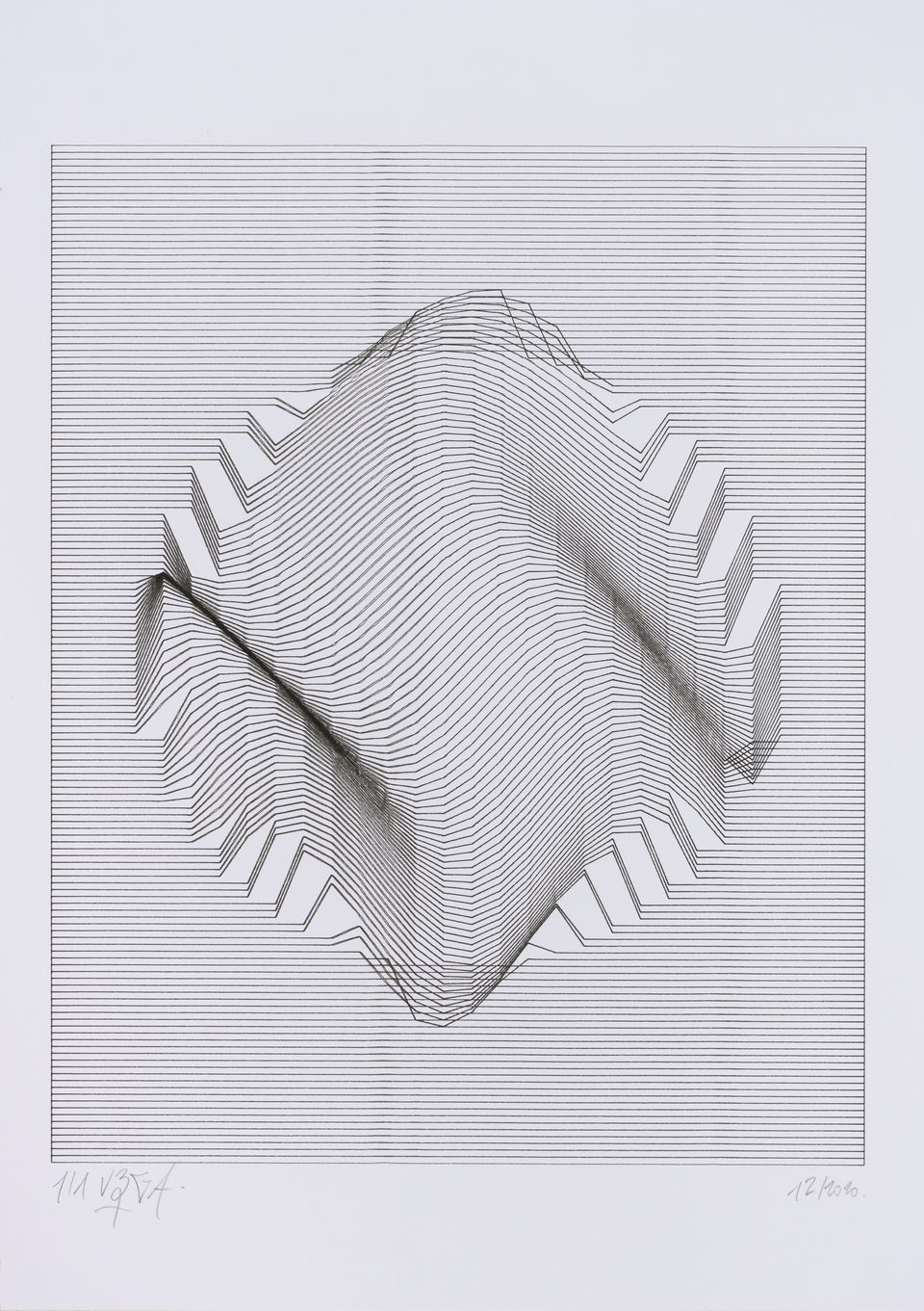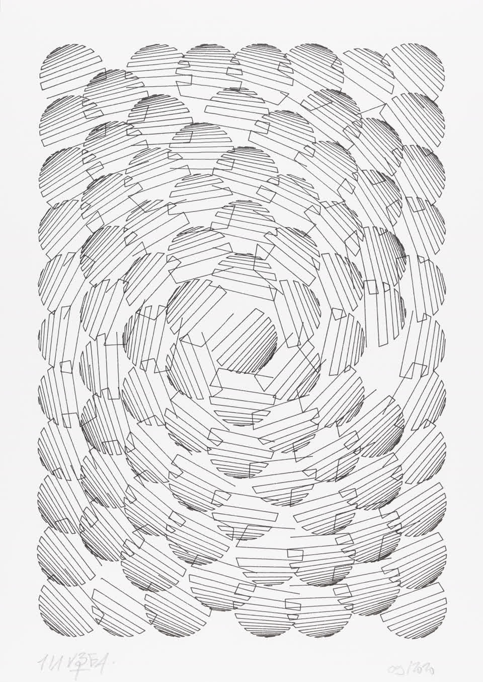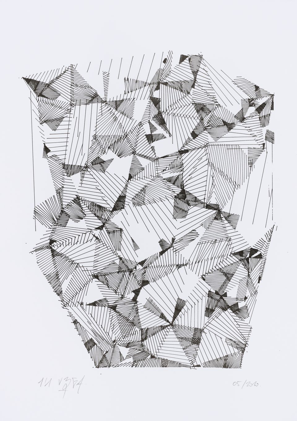 The algorithm used in these artworks starts from a rectangular grid whose cells are filled with lines, the density and orientation of which are modulated depending on their position relative to a epicentre, leading to those rhythmic and symmetrical compositions evoking the propagation of an abstract wave onto the drawing surface.