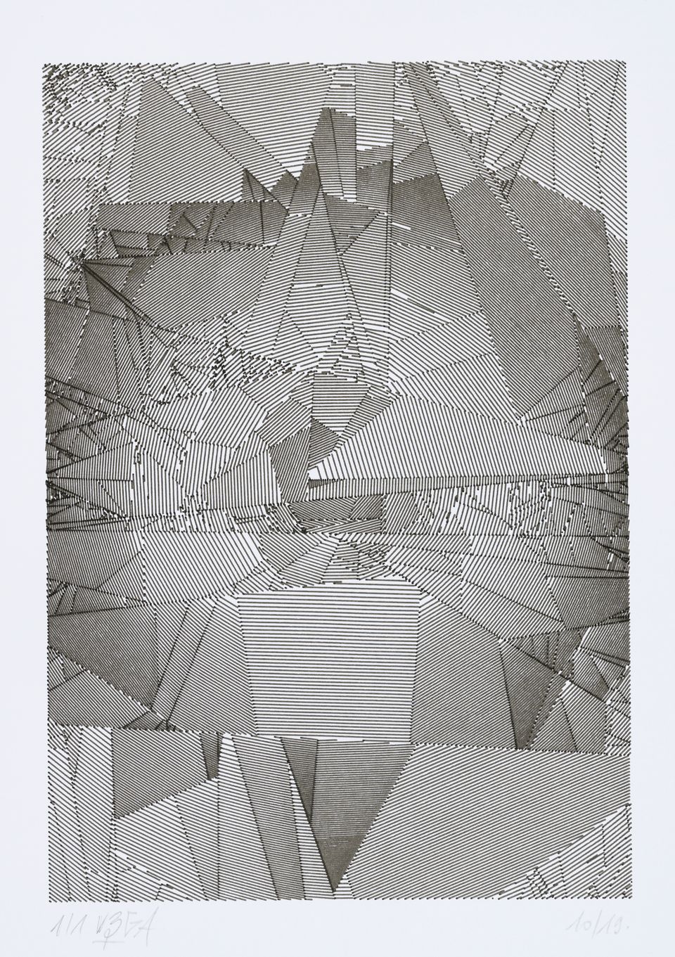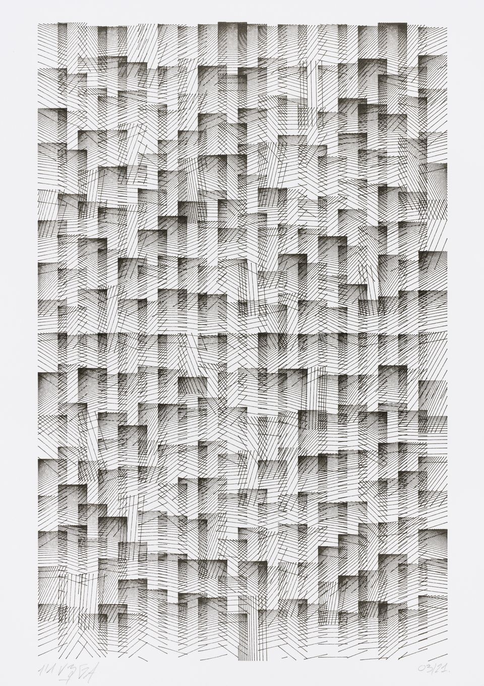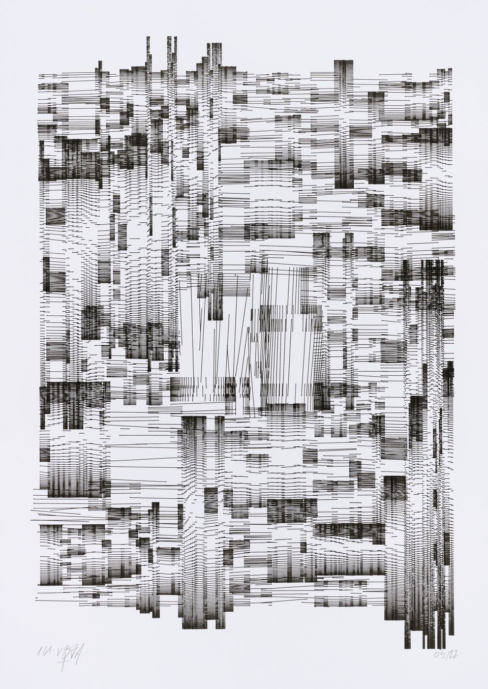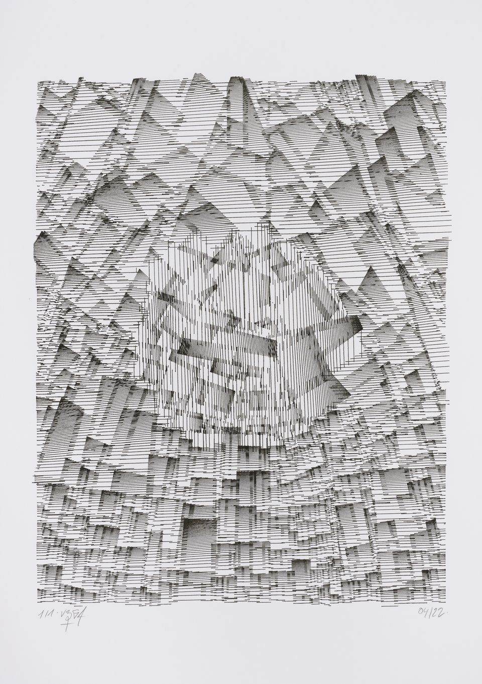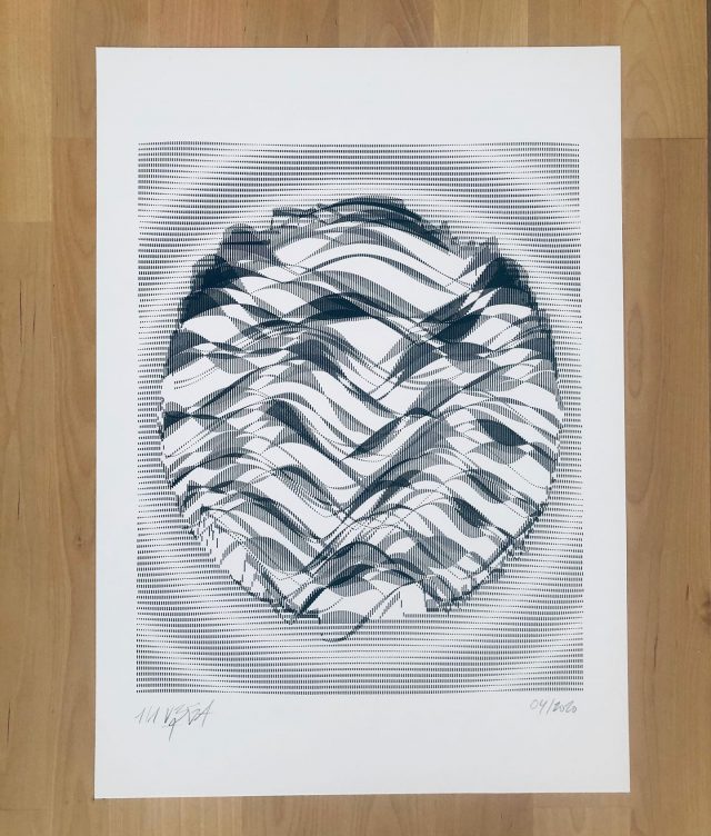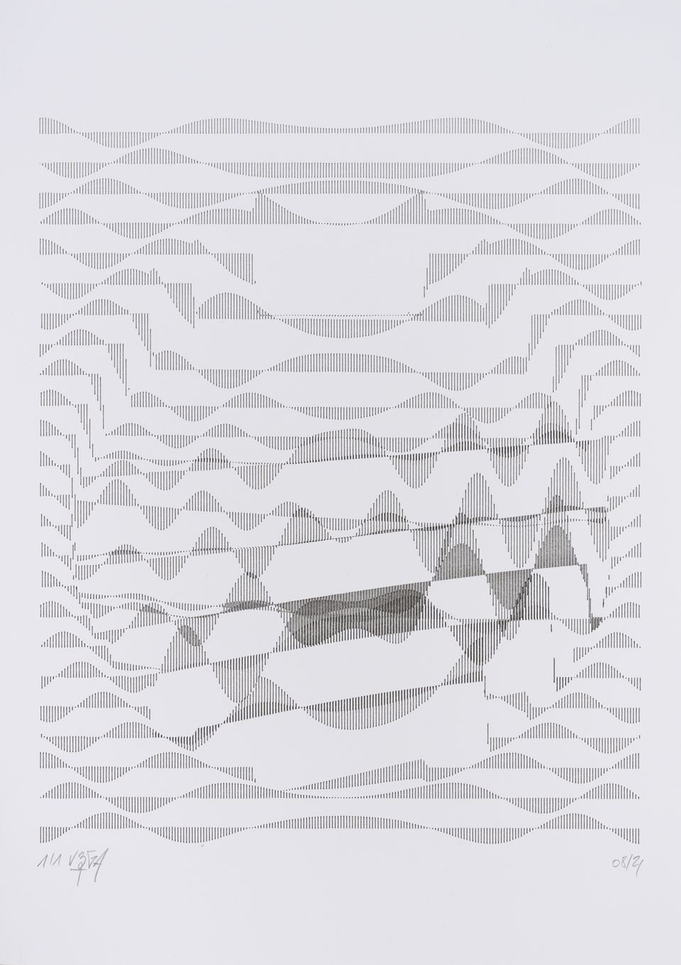 The algorithm used in these artworks starts from a rectangular grid whose cells are filled with lines, the density and orientation of which are modulated depending on their position relative to a epicentre, leading to those rhythmic and symmetrical compositions evoking the propagation of an abstract wave onto the drawing surface.