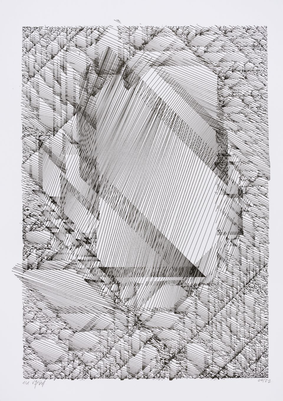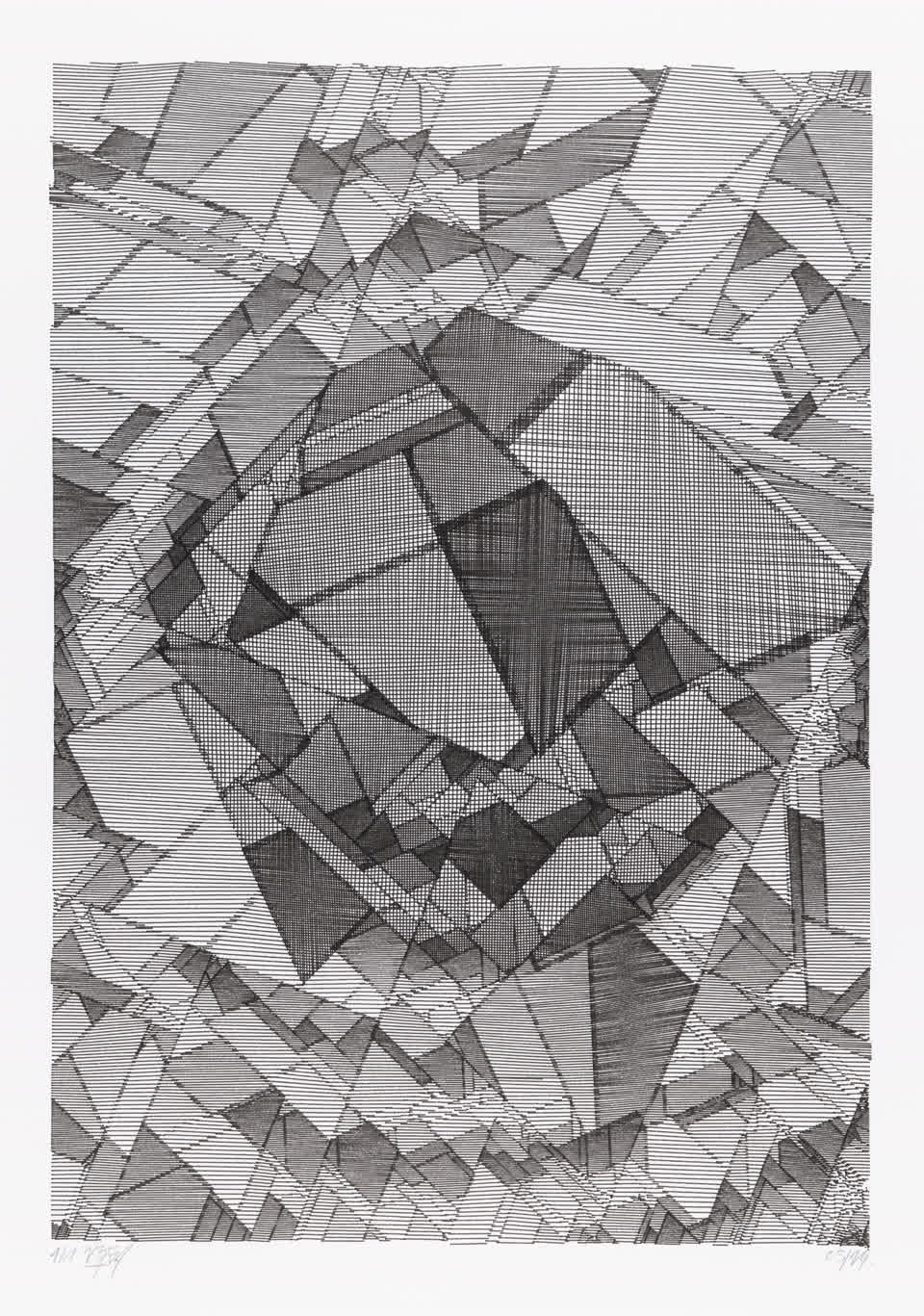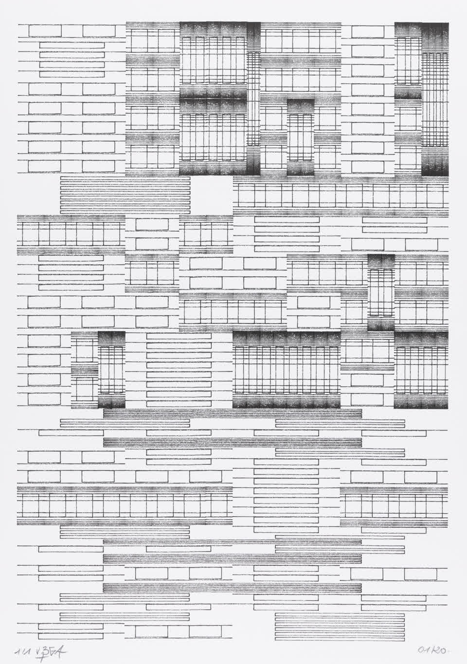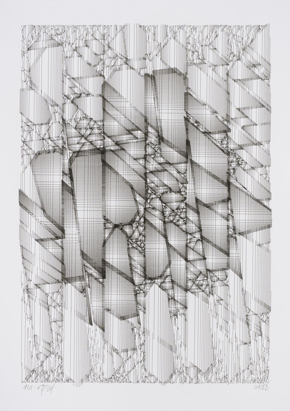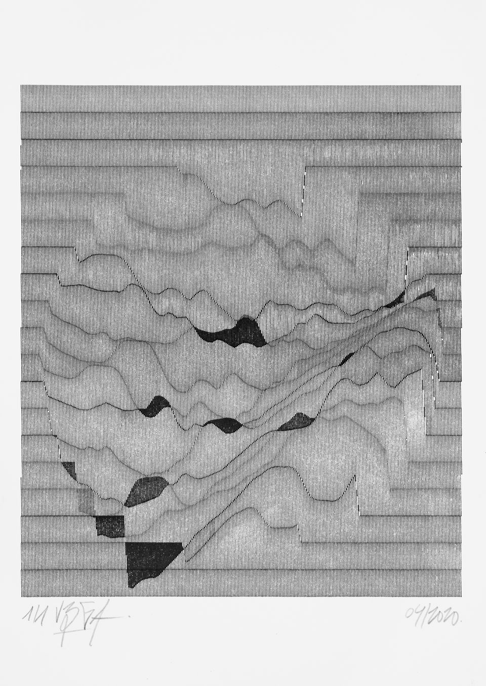 The algorithm used in these artworks starts from a rectangular grid whose cells are filled with lines, the density and orientation of which are modulated depending on their position relative to a epicentre, leading to those rhythmic and symmetrical compositions evoking the propagation of an abstract wave onto the drawing surface.