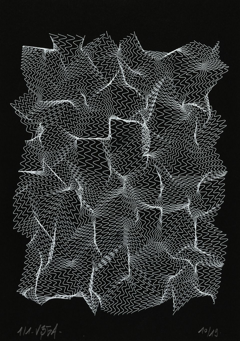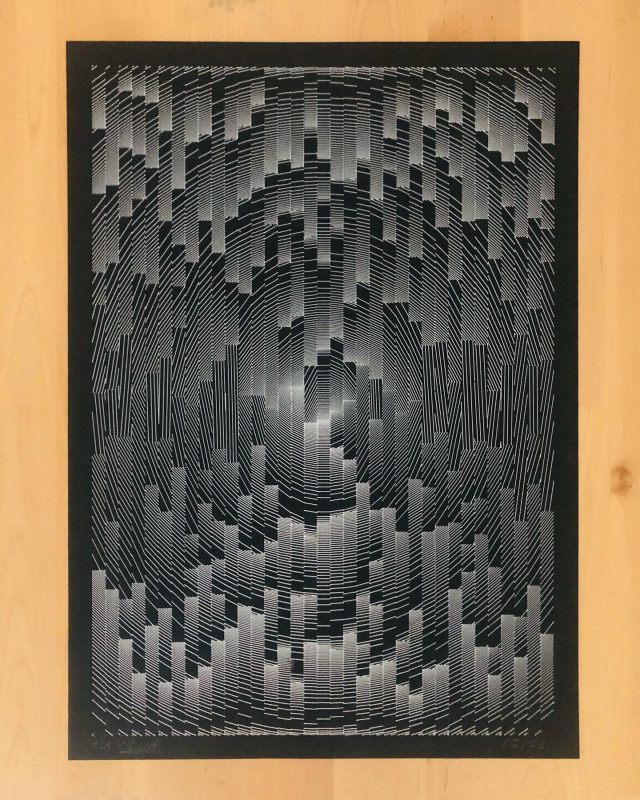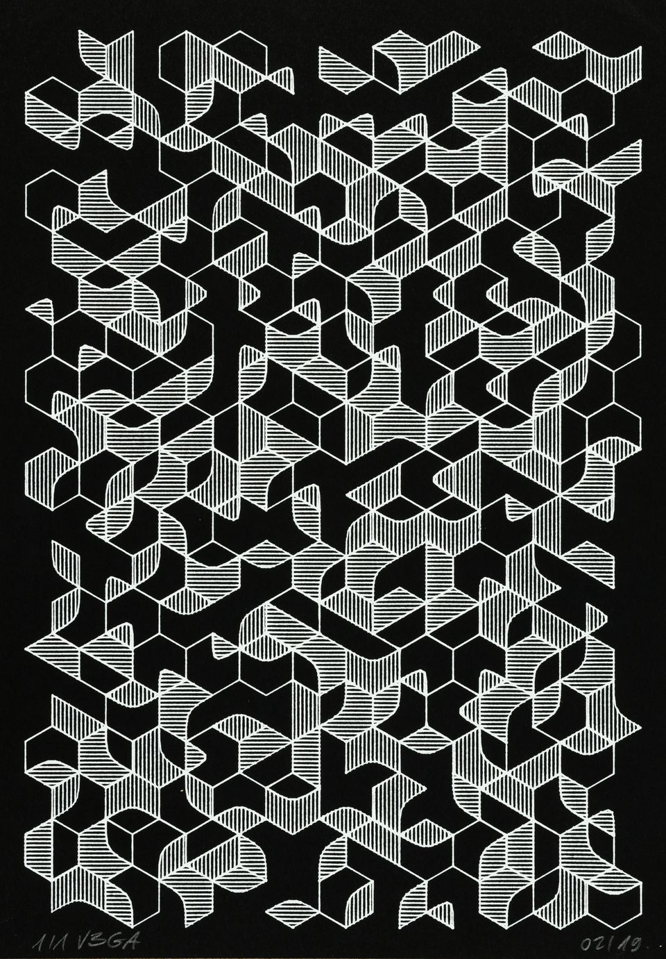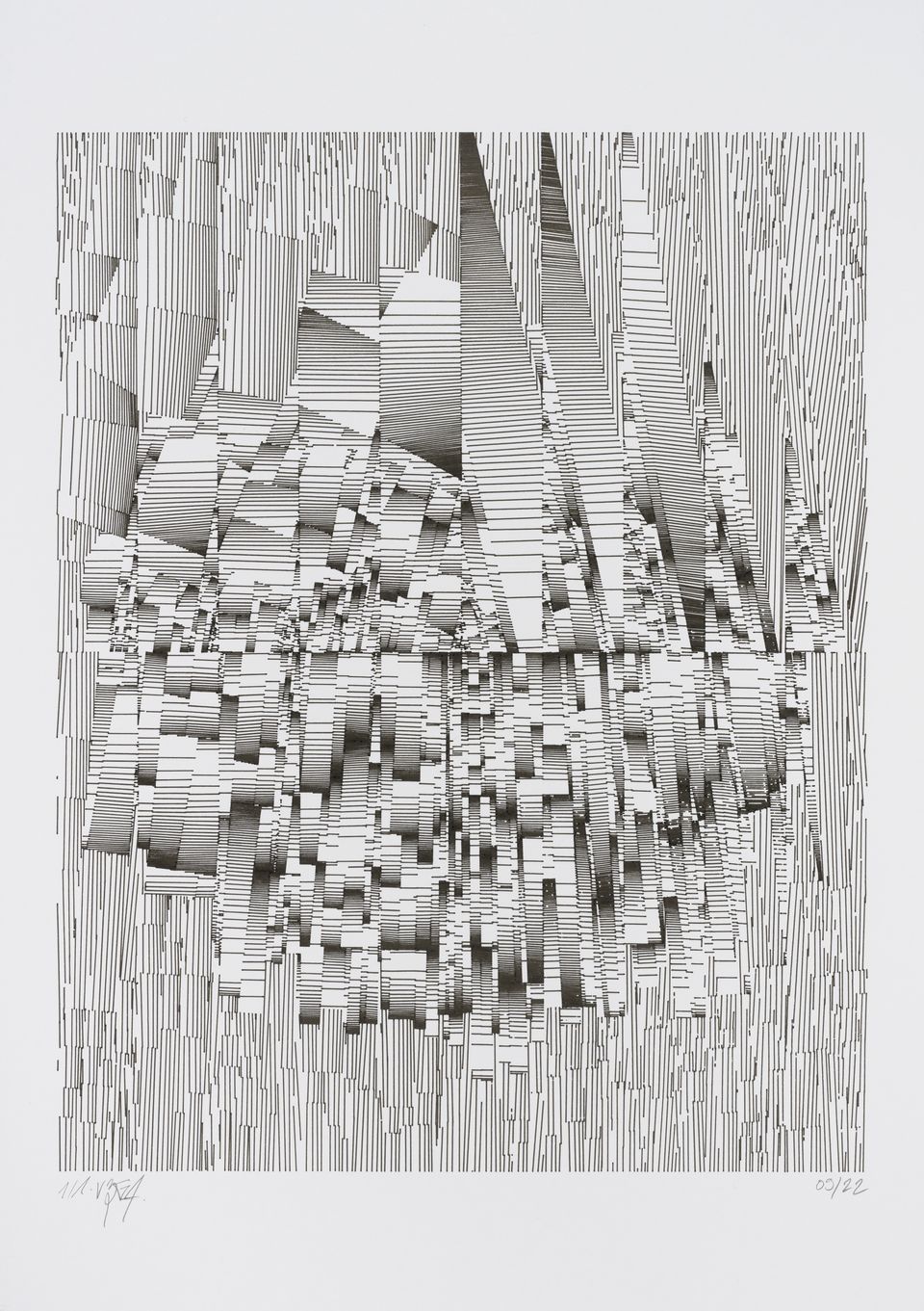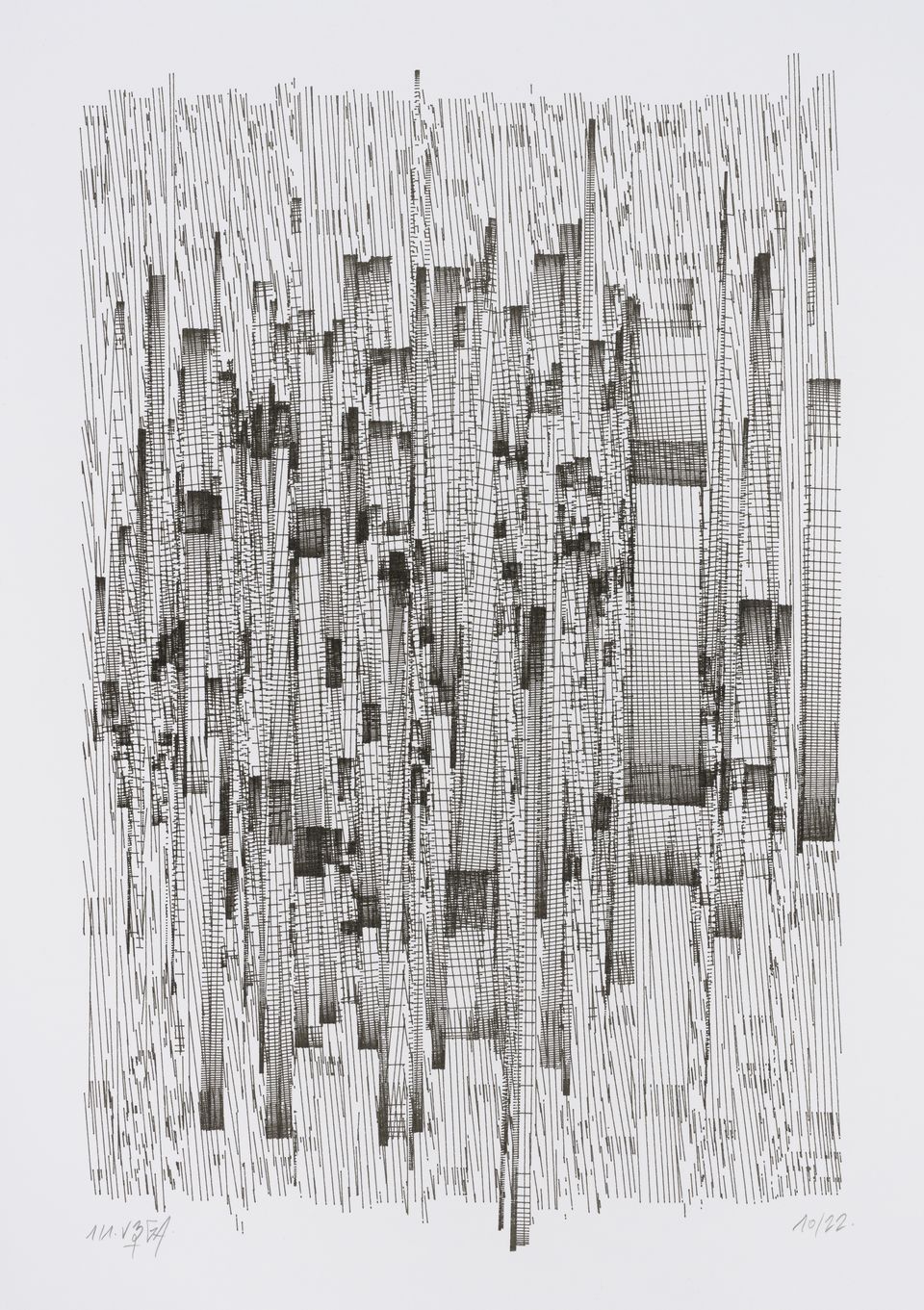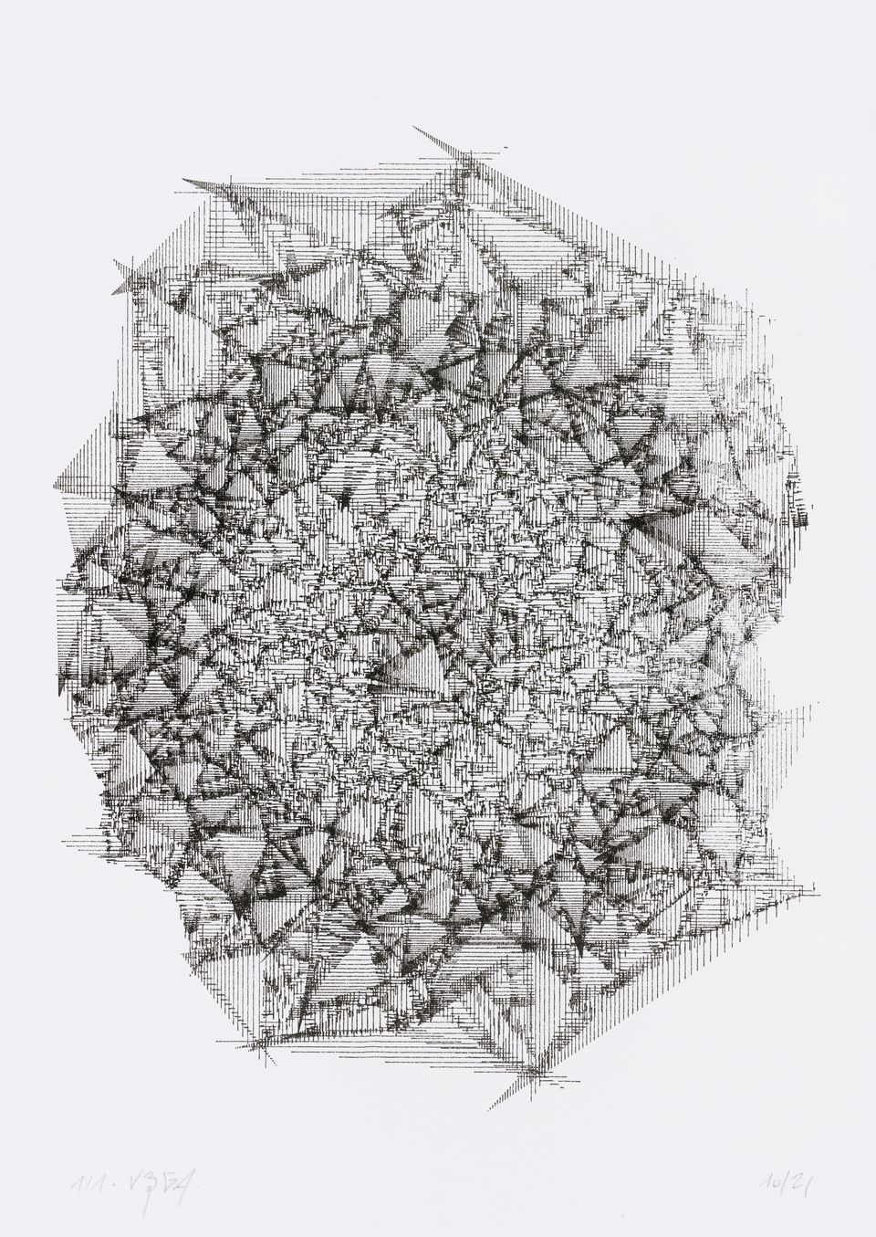 The algorithm used in these artworks starts from a rectangular grid whose cells are filled with lines, the density and orientation of which are modulated depending on their position relative to a epicentre, leading to those rhythmic and symmetrical compositions evoking the propagation of an abstract wave onto the drawing surface.