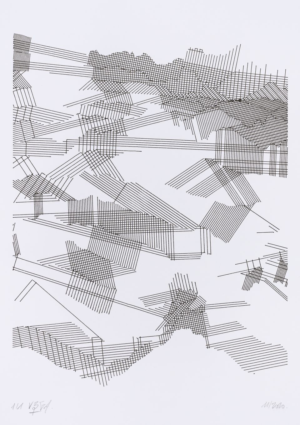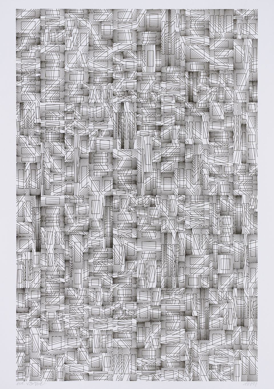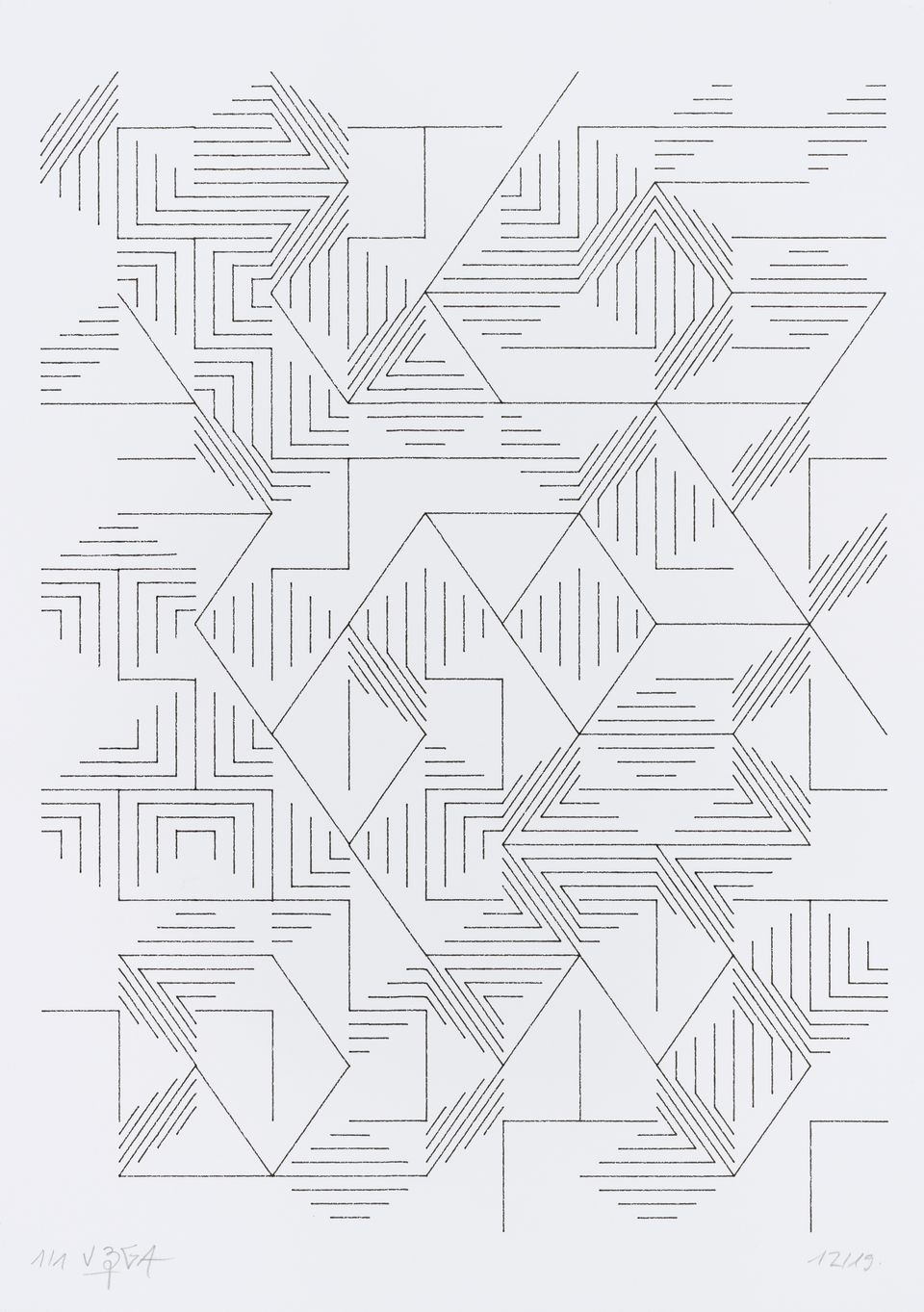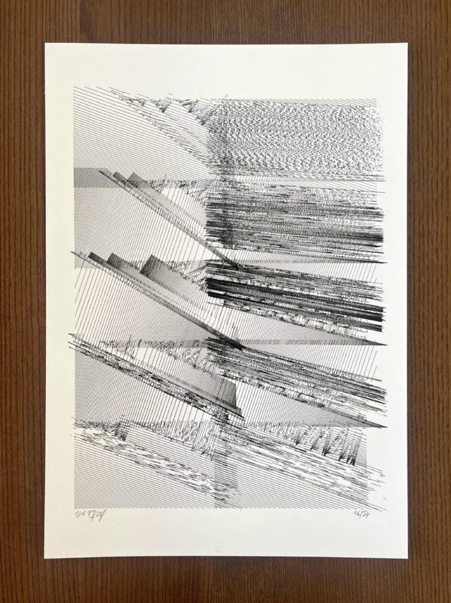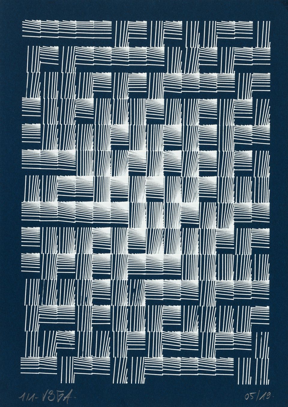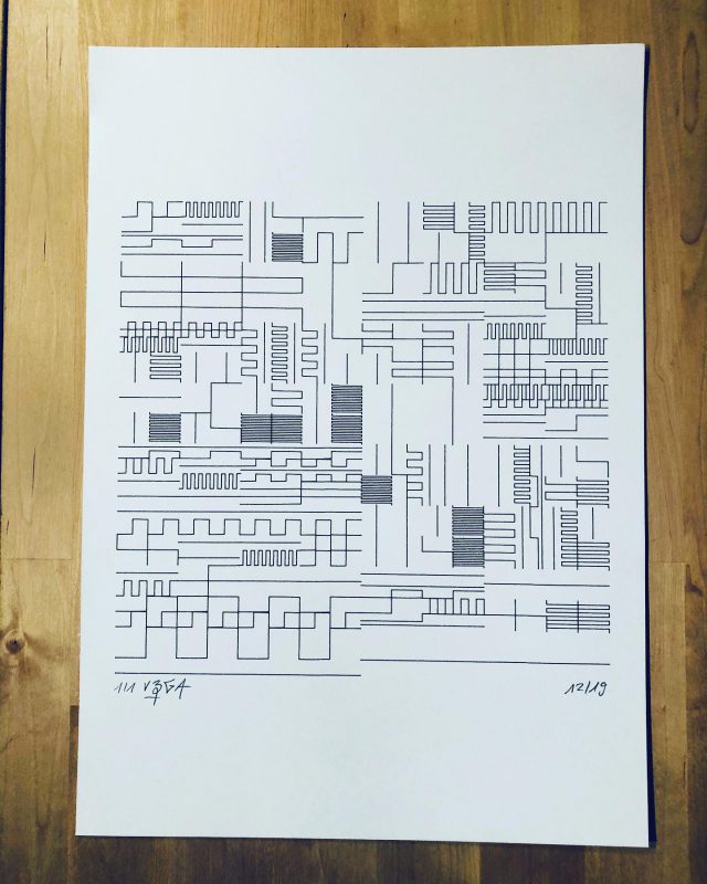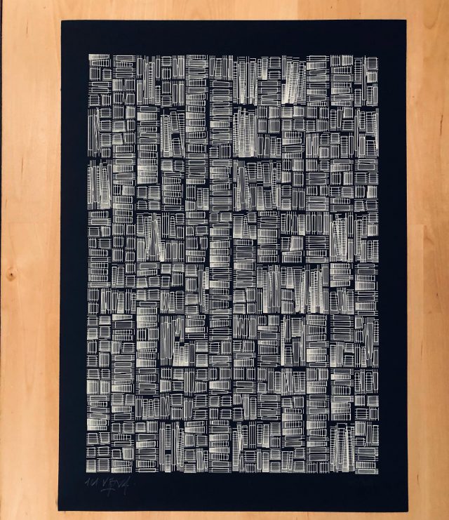 The algorithm used in these artworks starts from a rectangular grid whose cells are filled with lines, the density and orientation of which are modulated depending on their position relative to a epicentre, leading to those rhythmic and symmetrical compositions evoking the propagation of an abstract wave onto the drawing surface.