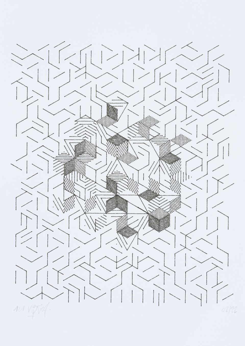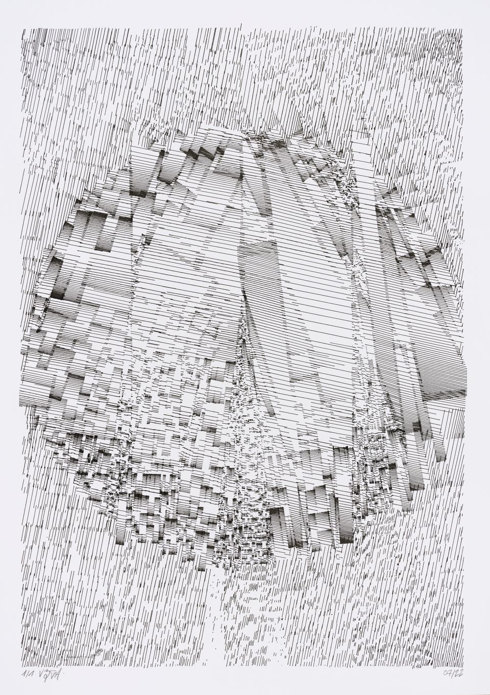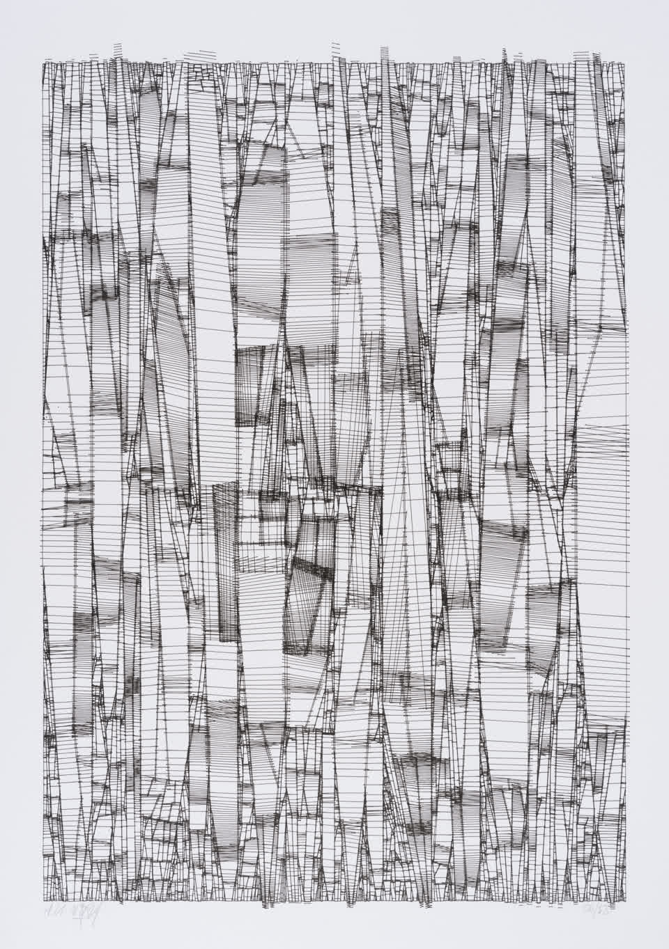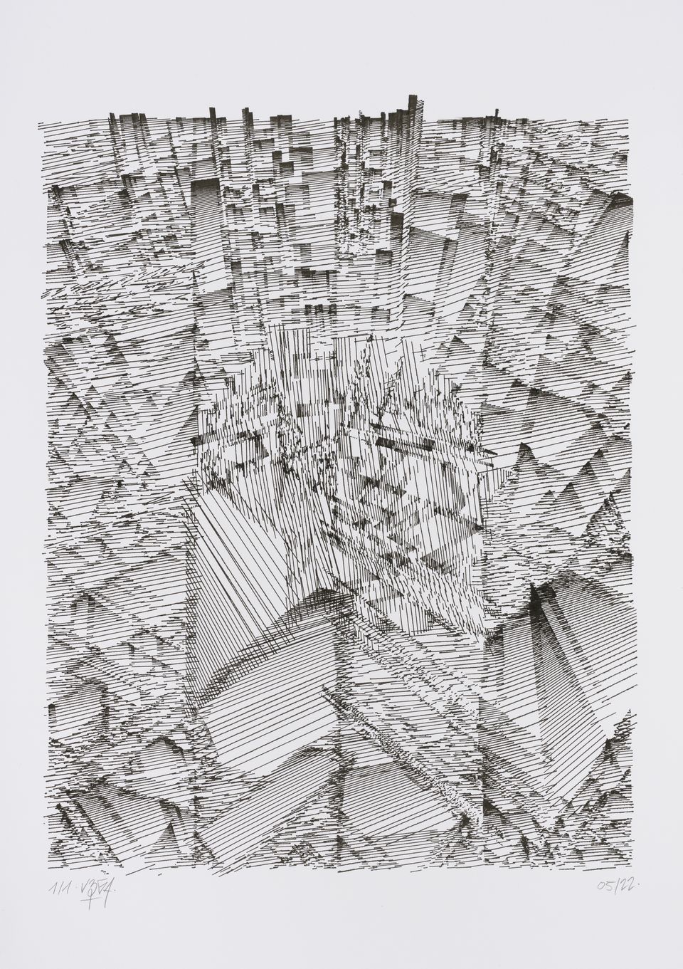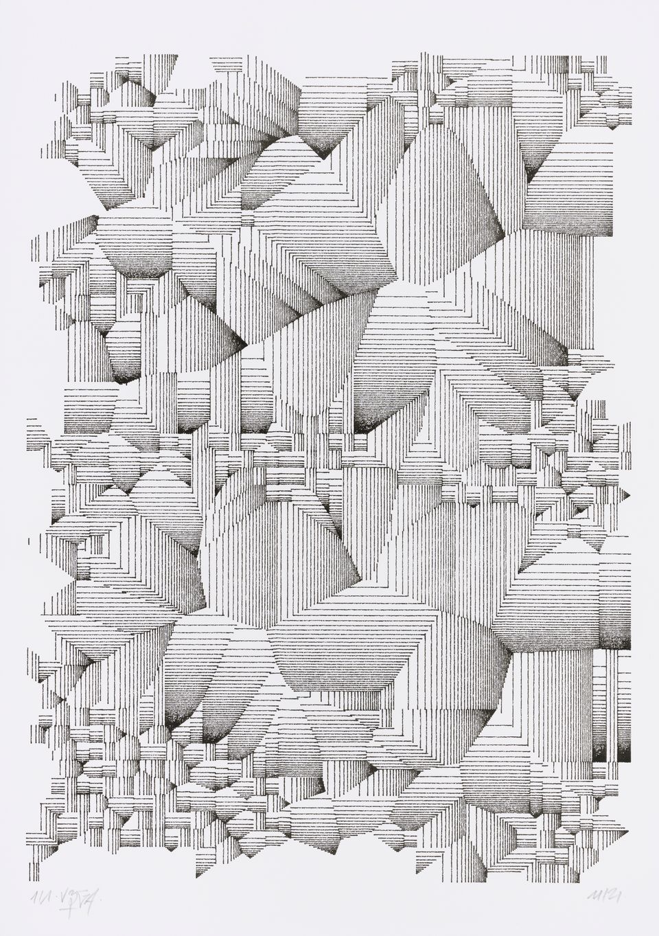 The algorithm used in these artworks starts from a rectangular grid whose cells are filled with lines, the density and orientation of which are modulated depending on their position relative to a epicentre, leading to those rhythmic and symmetrical compositions evoking the propagation of an abstract wave onto the drawing surface.