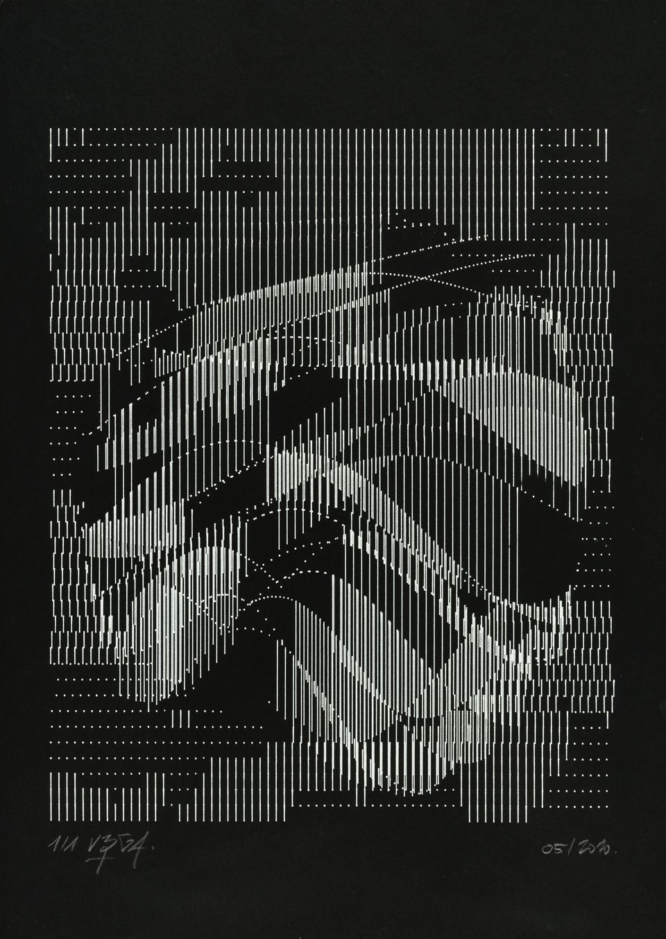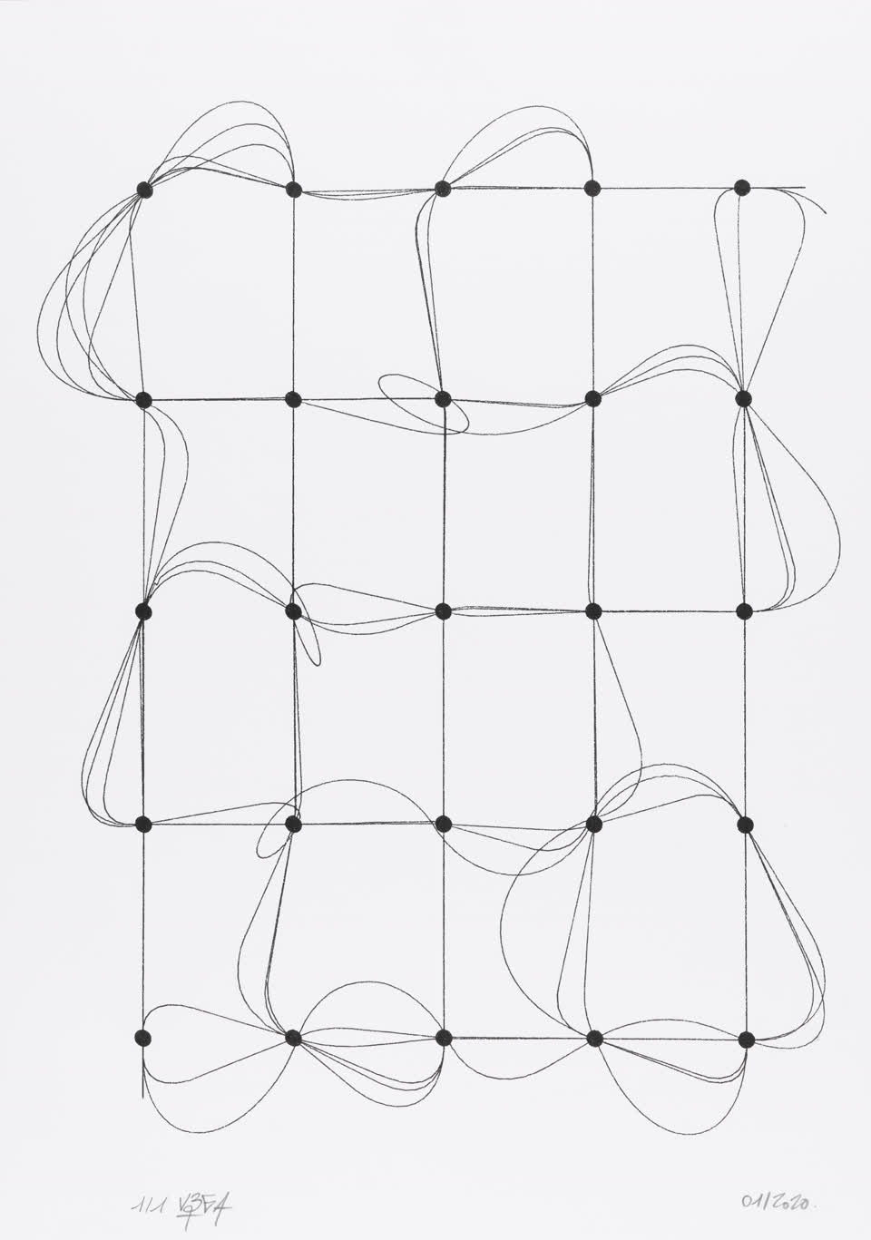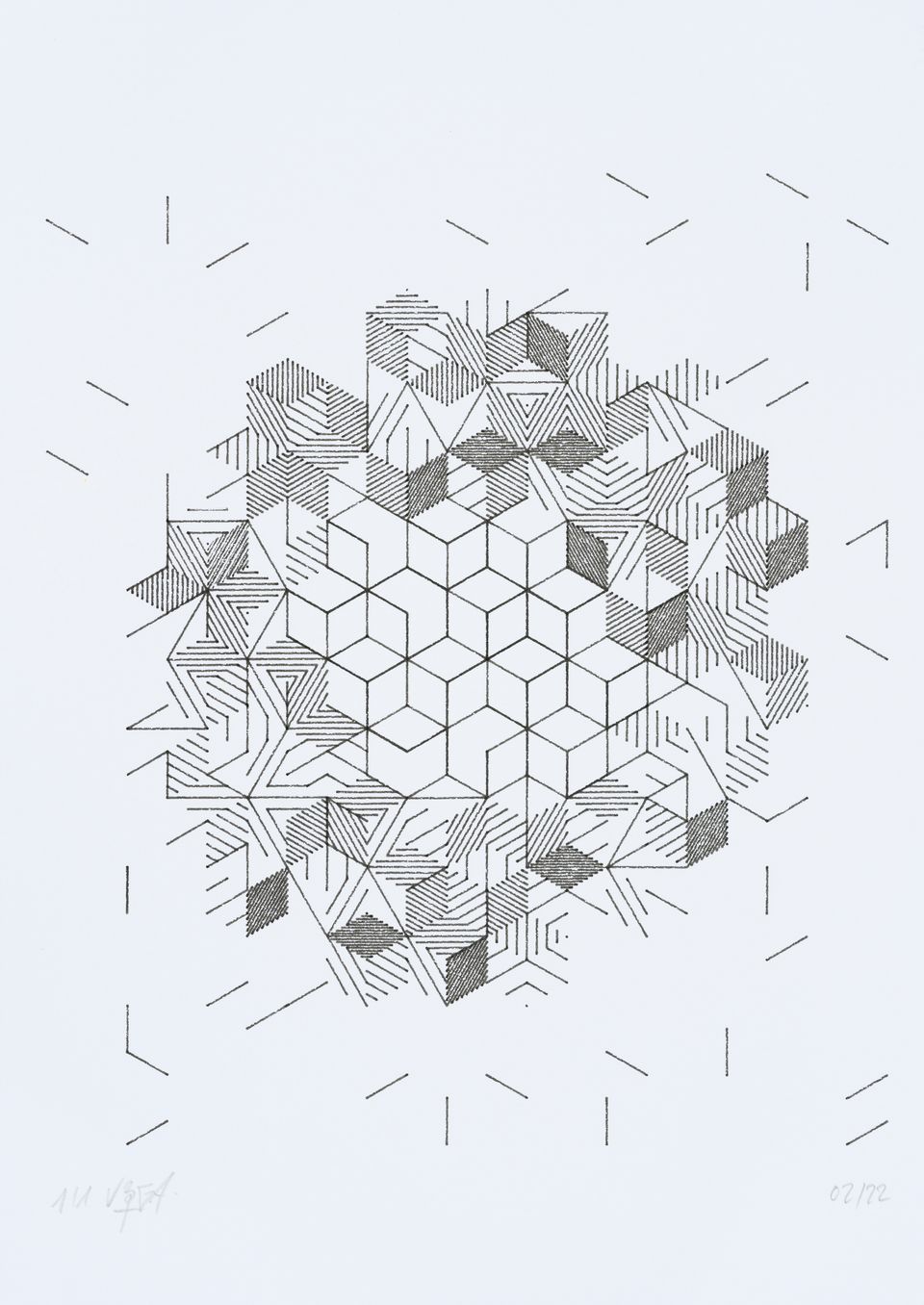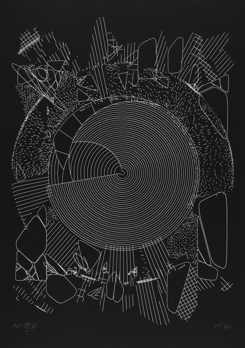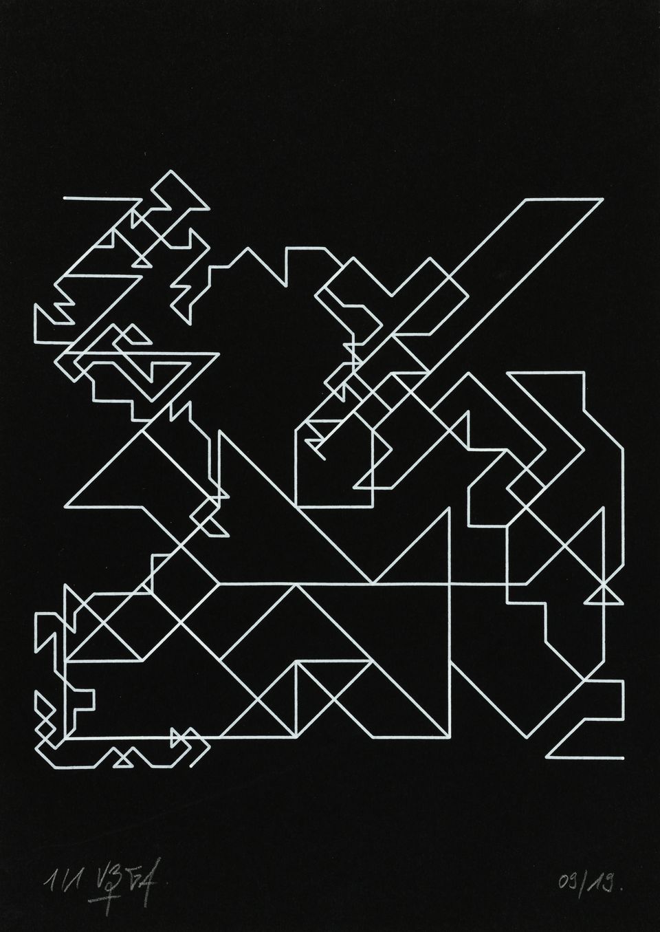 The algorithm used in these artworks starts from a rectangular grid whose cells are filled with lines, the density and orientation of which are modulated depending on their position relative to a epicentre, leading to those rhythmic and symmetrical compositions evoking the propagation of an abstract wave onto the drawing surface.