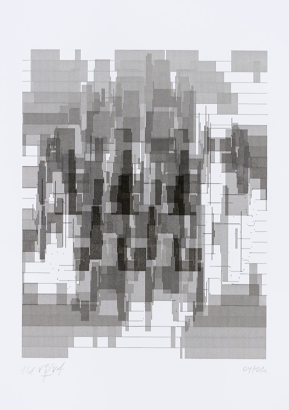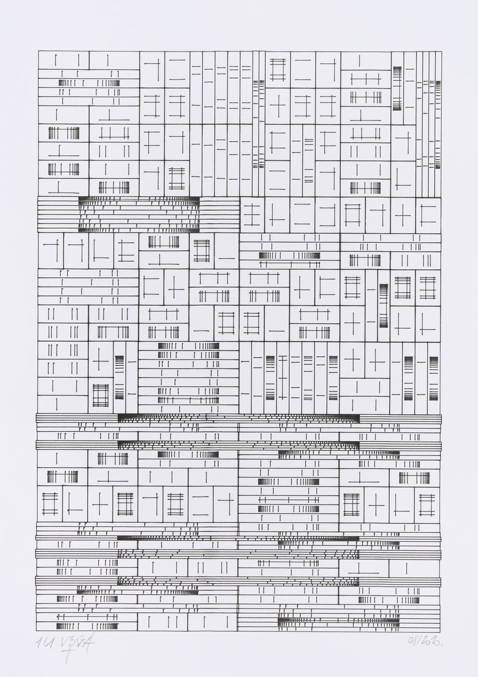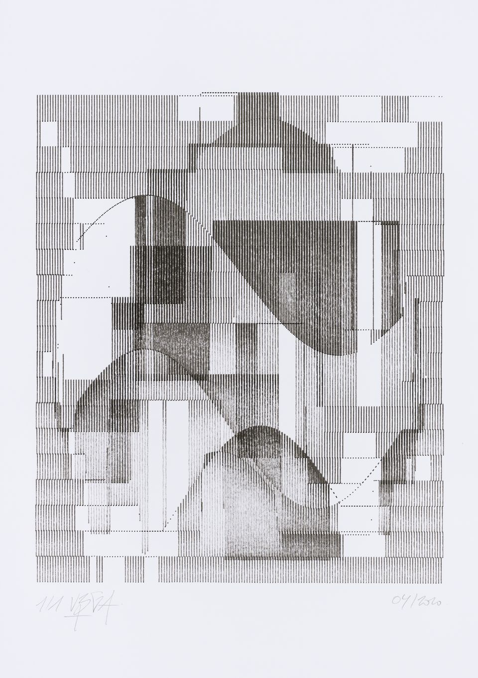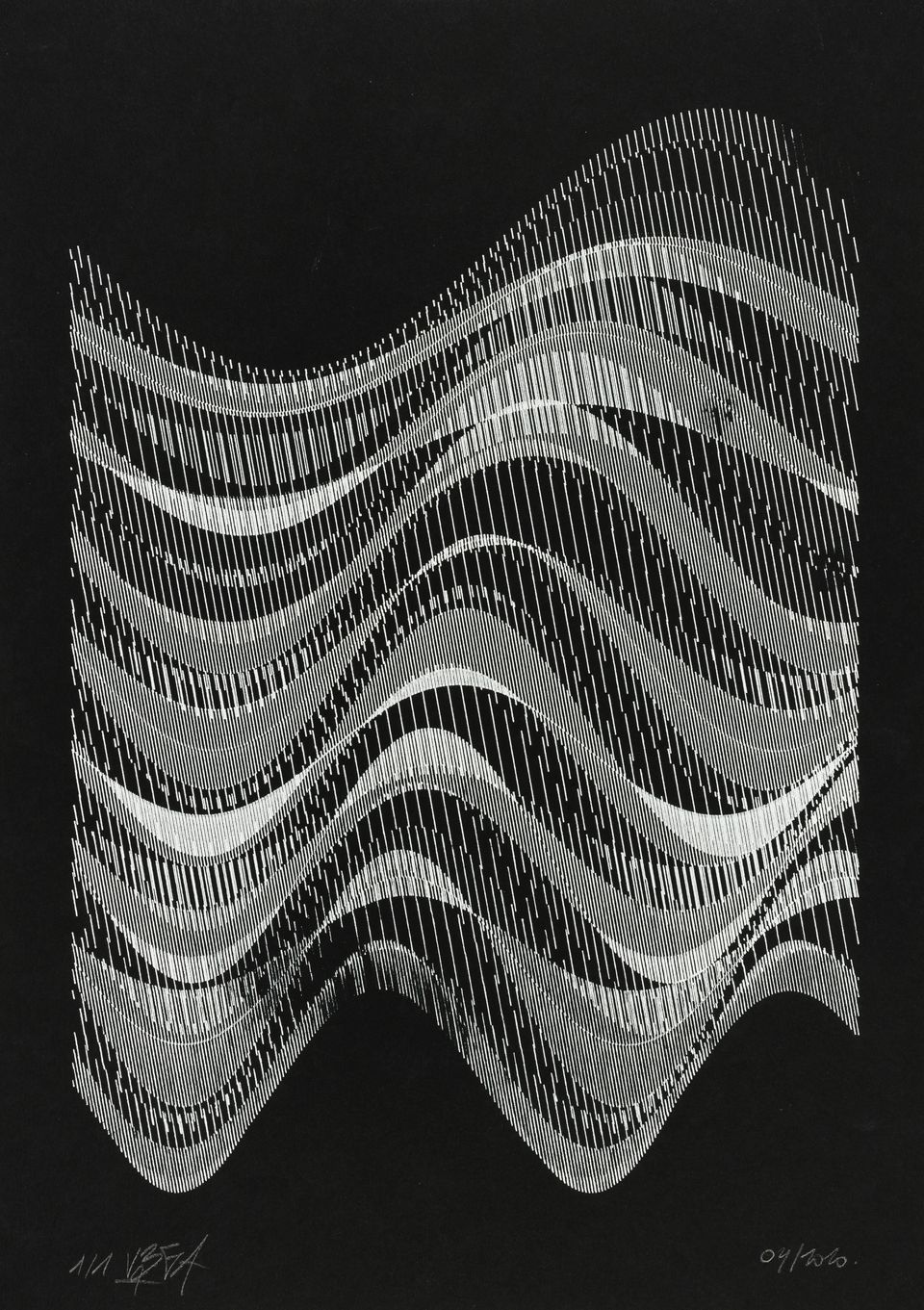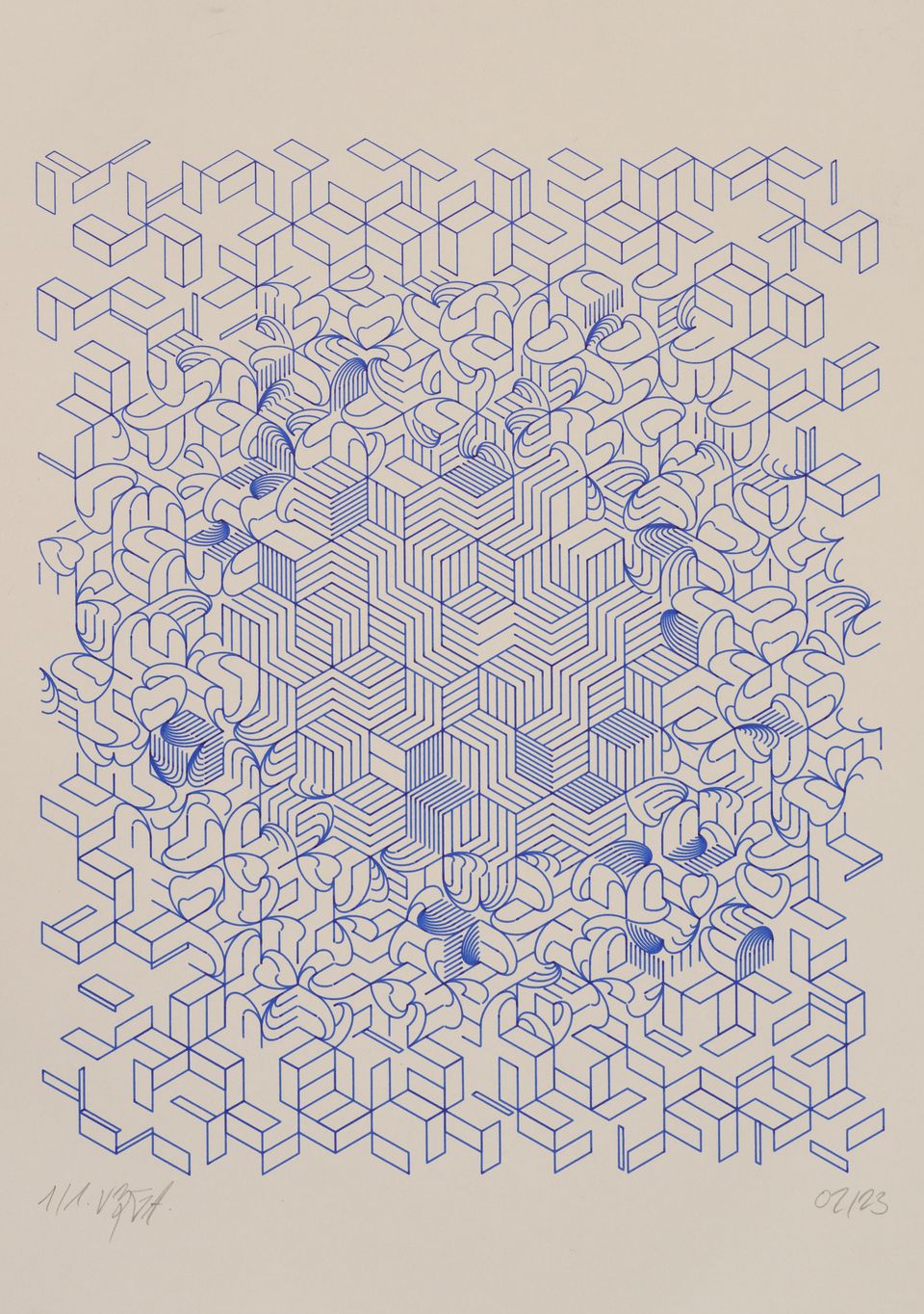 The algorithm used in these artworks starts from a rectangular grid whose cells are filled with lines, the density and orientation of which are modulated depending on their position relative to a epicentre, leading to those rhythmic and symmetrical compositions evoking the propagation of an abstract wave onto the drawing surface.