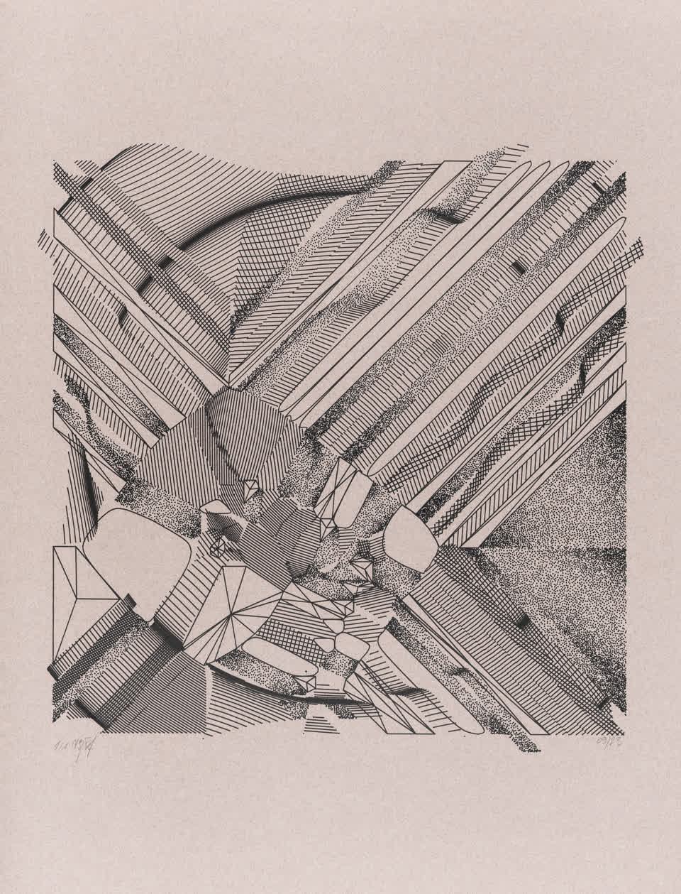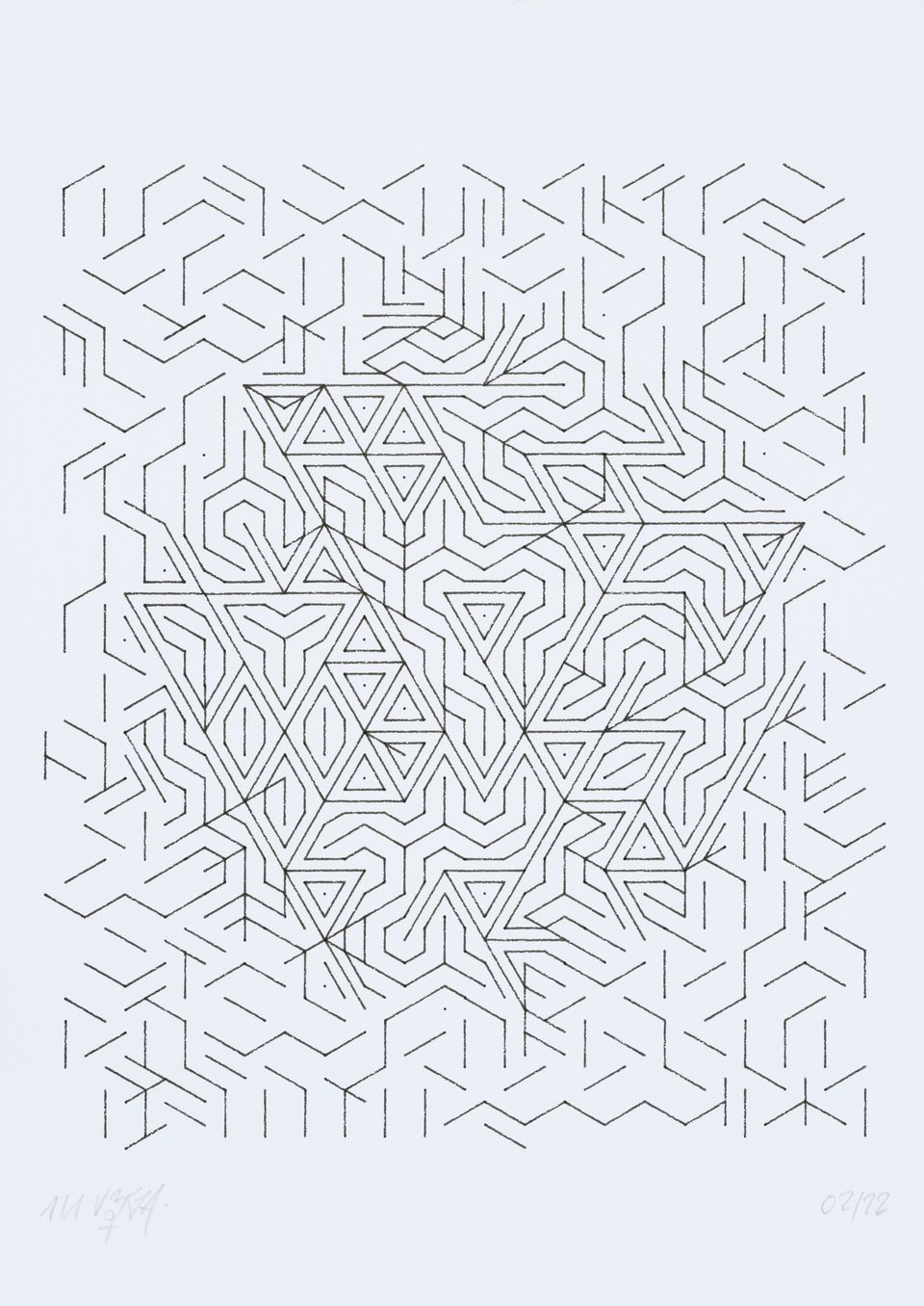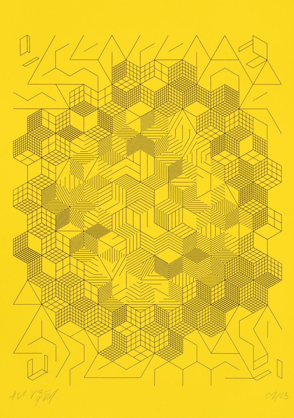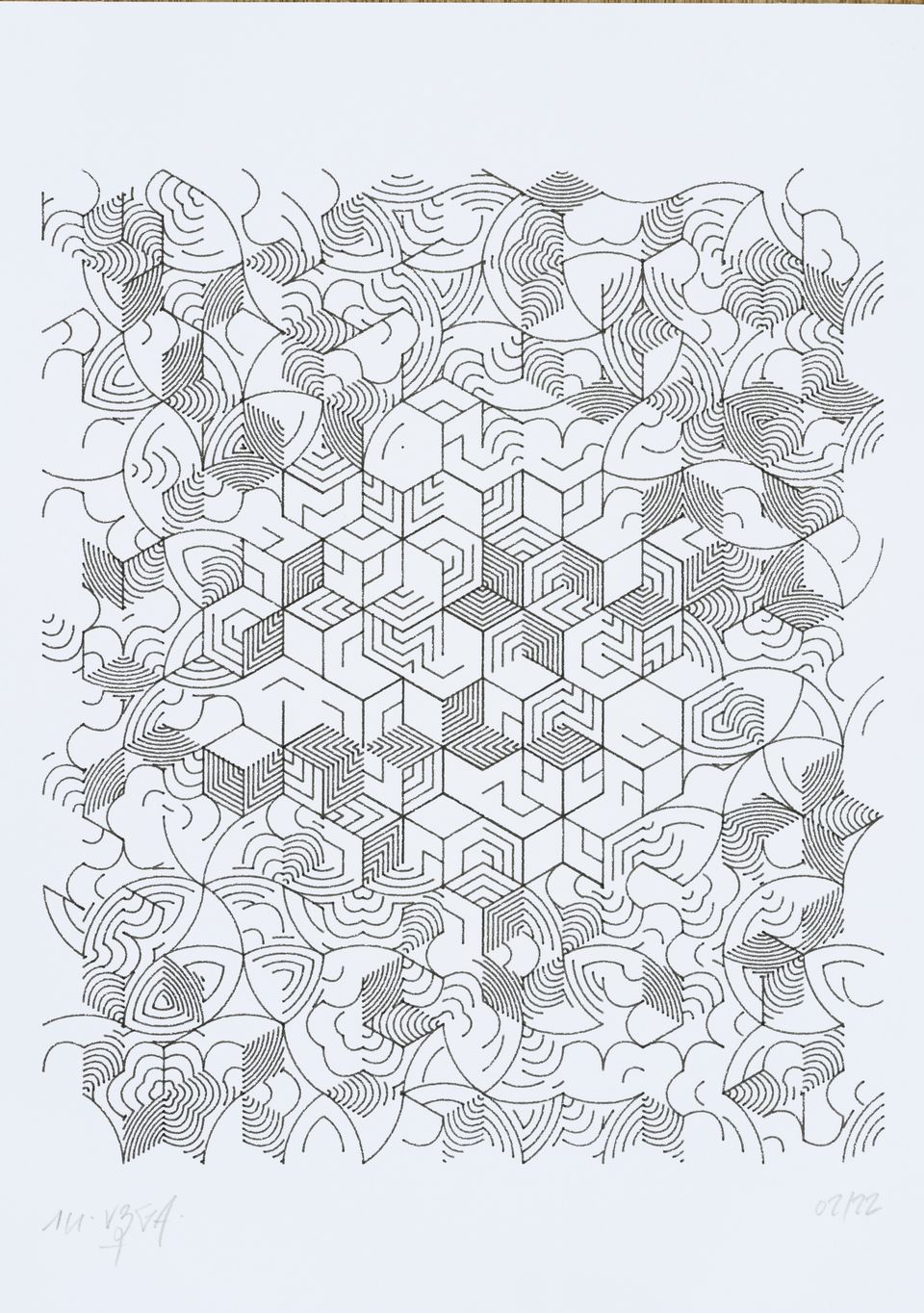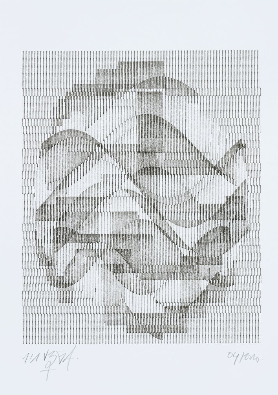 The algorithm used in these artworks starts from a rectangular grid whose cells are filled with lines, the density and orientation of which are modulated depending on their position relative to a epicentre, leading to those rhythmic and symmetrical compositions evoking the propagation of an abstract wave onto the drawing surface.