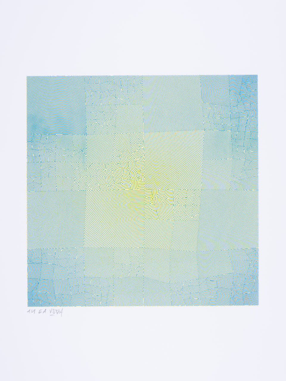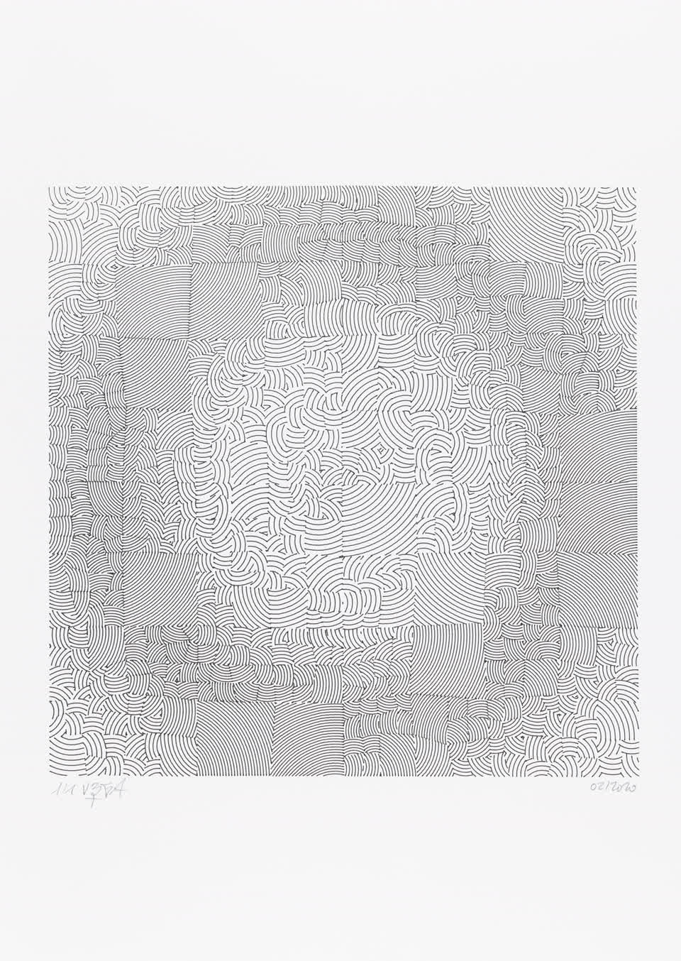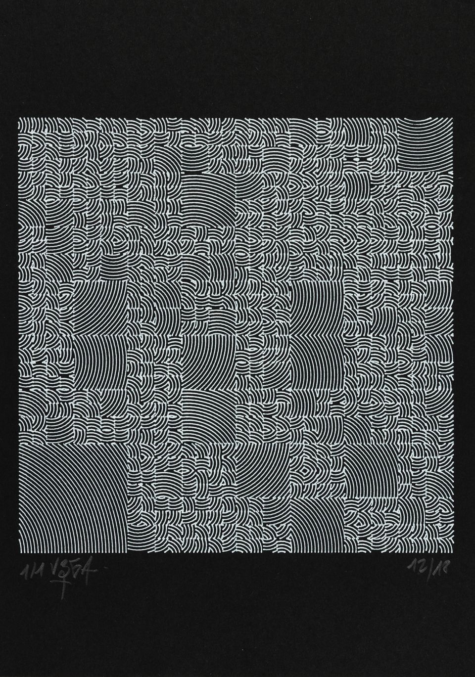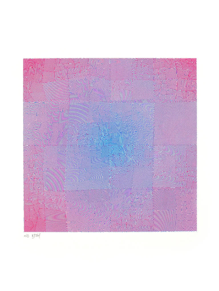 Each artwork is the result of partitioning a square into a series of smaller squares and then filling those with a dense group of curved lines. The spacing of these lines, their orientation, and their precise curvature are defined by wave functions that create rhythms within a spatial geometric melody.