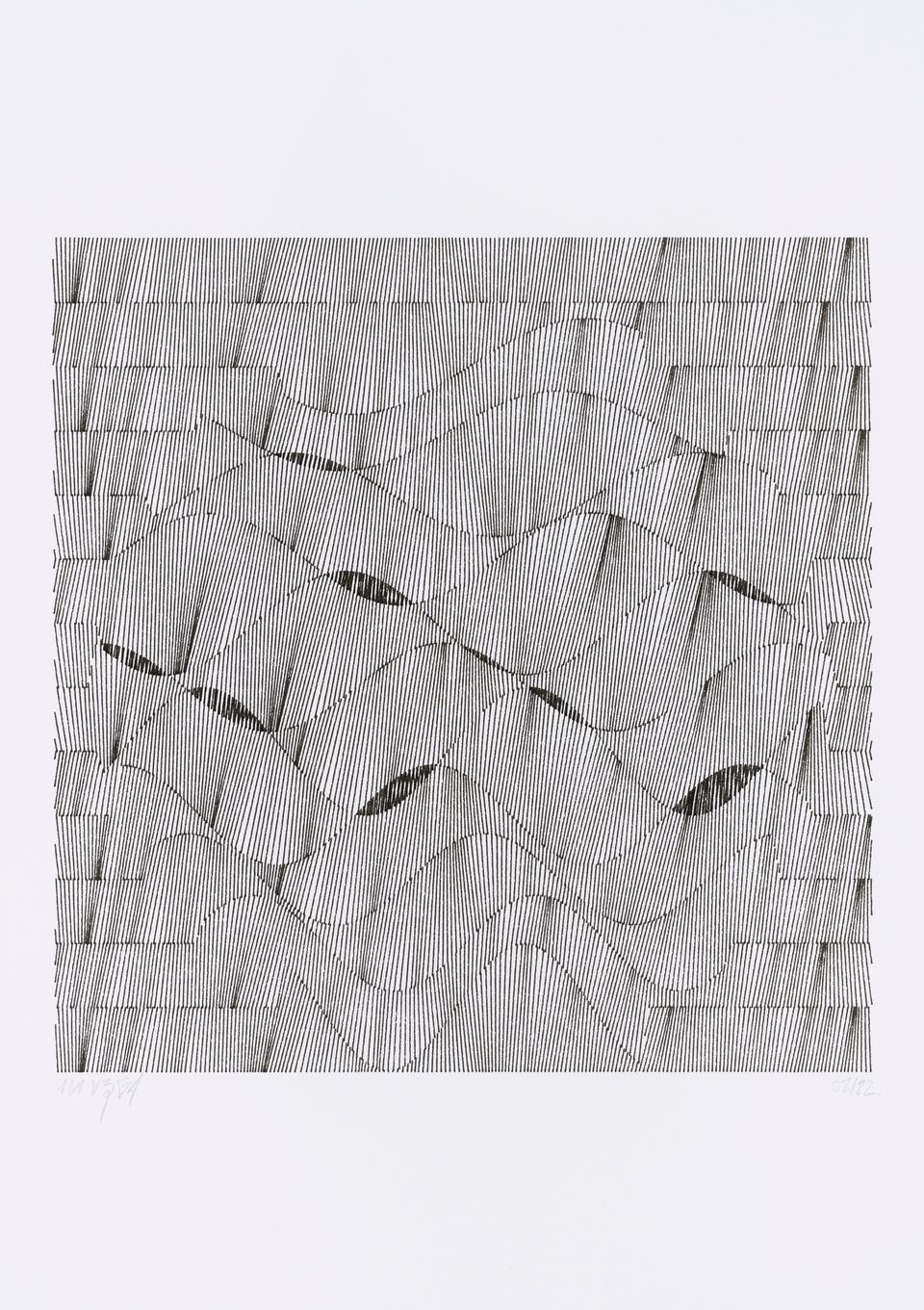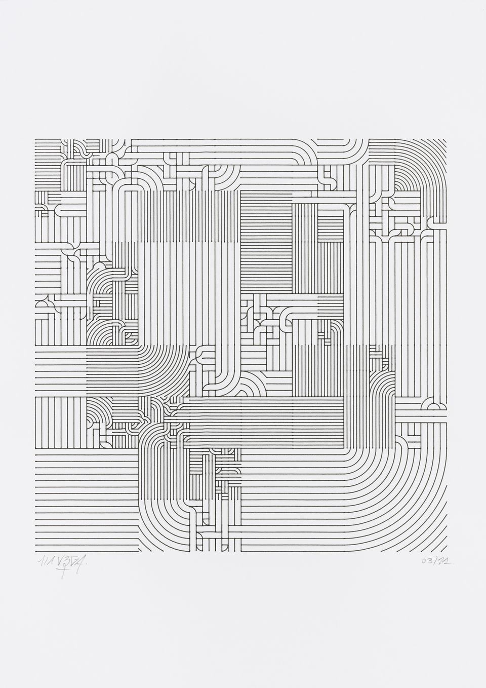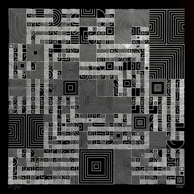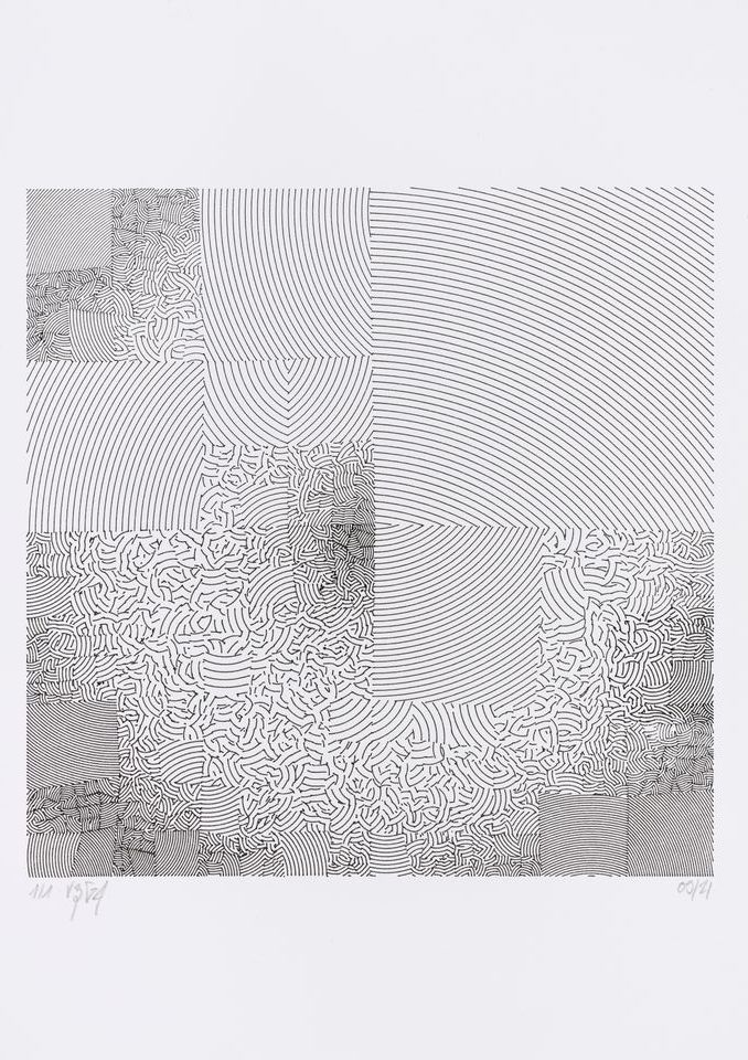 Each artwork is the result of partitioning a square into a series of smaller squares and then filling those with a dense group of curved lines. The spacing of these lines, their orientation, and their precise curvature are defined by wave functions that create rhythms within a spatial geometric melody.