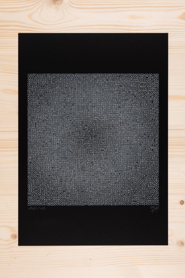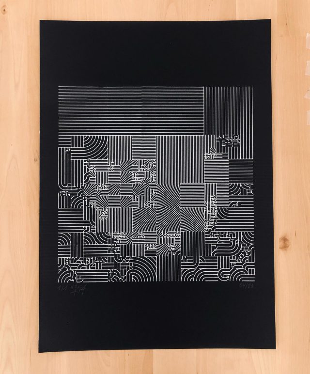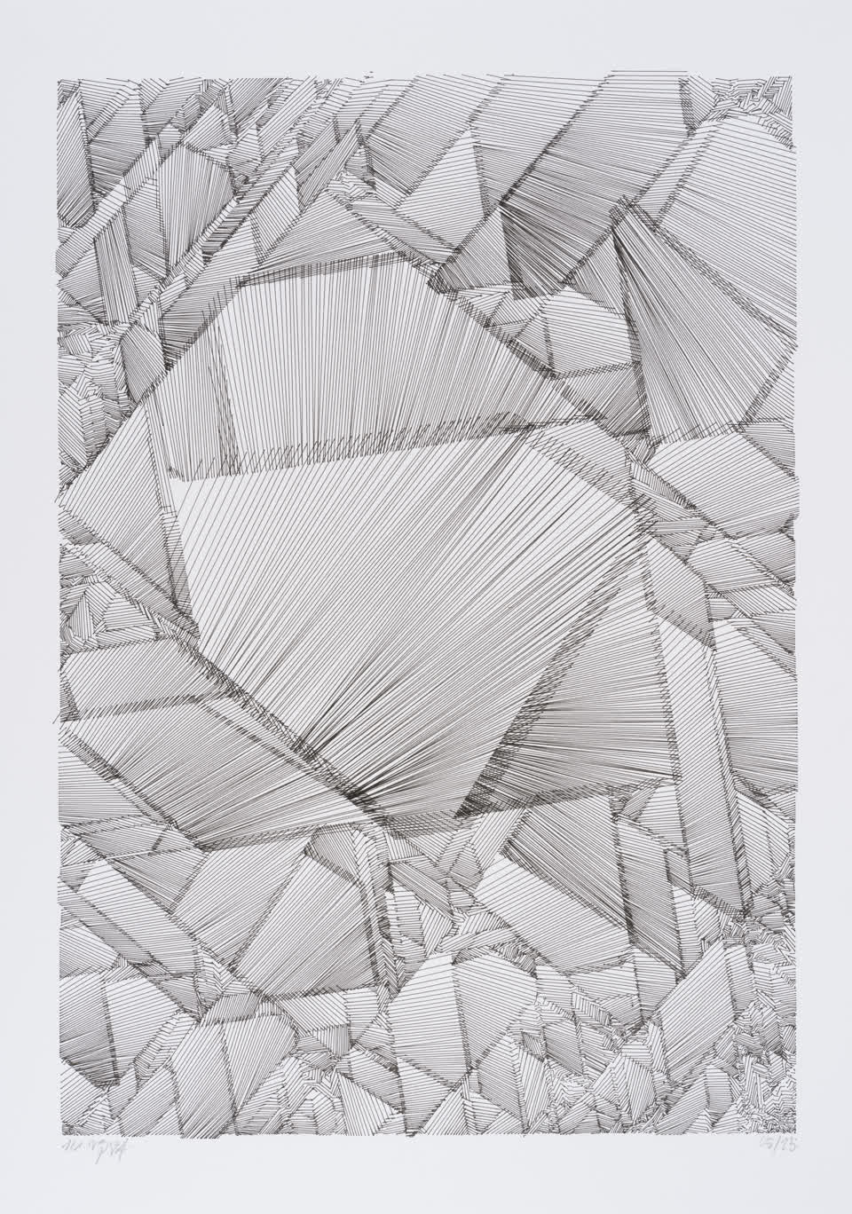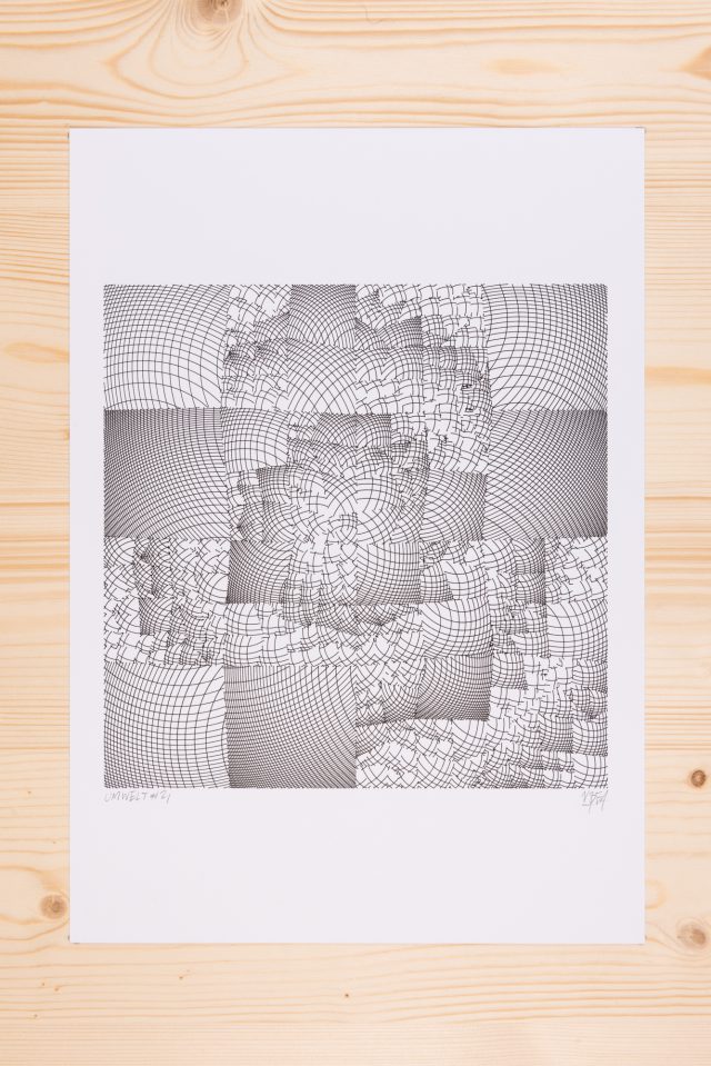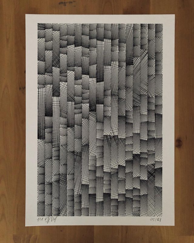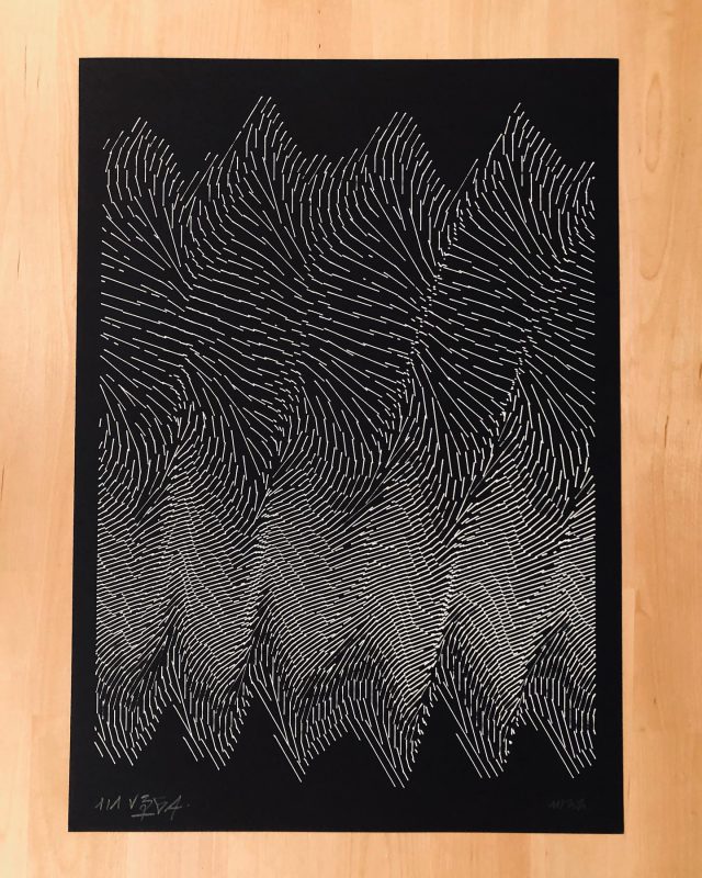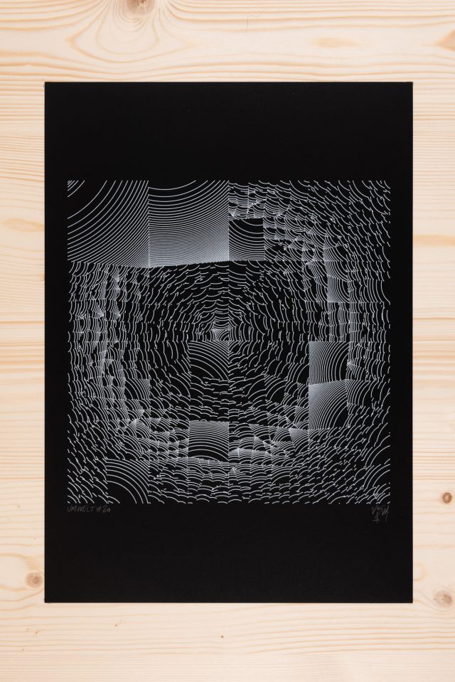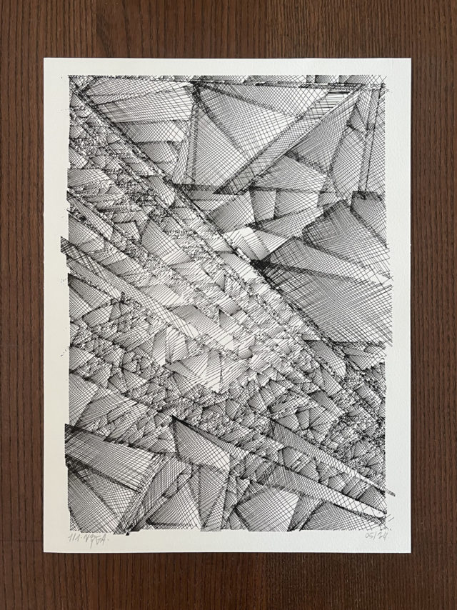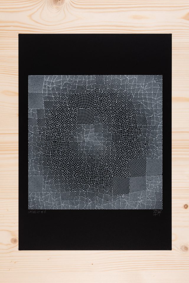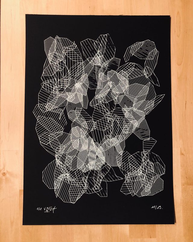 “Over the years, Julien Gachadoat has perfected working with minimal grids of thin white lines on black paper. With “Mineral” he pushes this exploration further by extending his work with a range of artificial life simulations and distortions. The result is a series of dynamic forms that fit together as a series, but where each image is distinct through different layers of texture and form. “Mineral” uses the structure of a grid as a playground for autonomous agents to wander around according to simple, discrete movement rules. Their local interactions lead to the creation of unpredictable sparse or dense geometric areas filled with lines. The images have many references from spiderwebs to broken glass, but they aren’t based on any specific natural phenomena. The forms emerge through the code that Julien created for building his own worlds.”