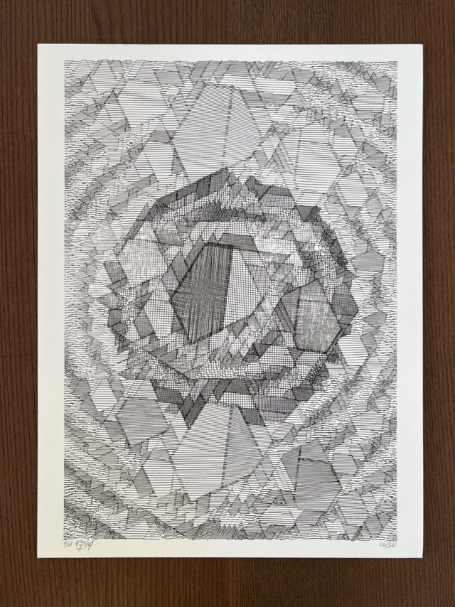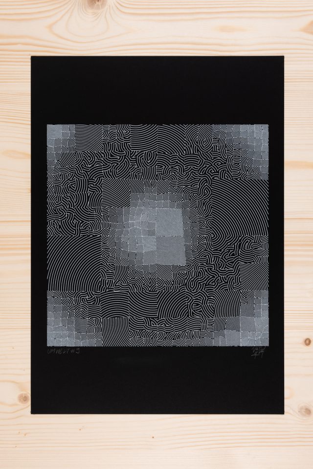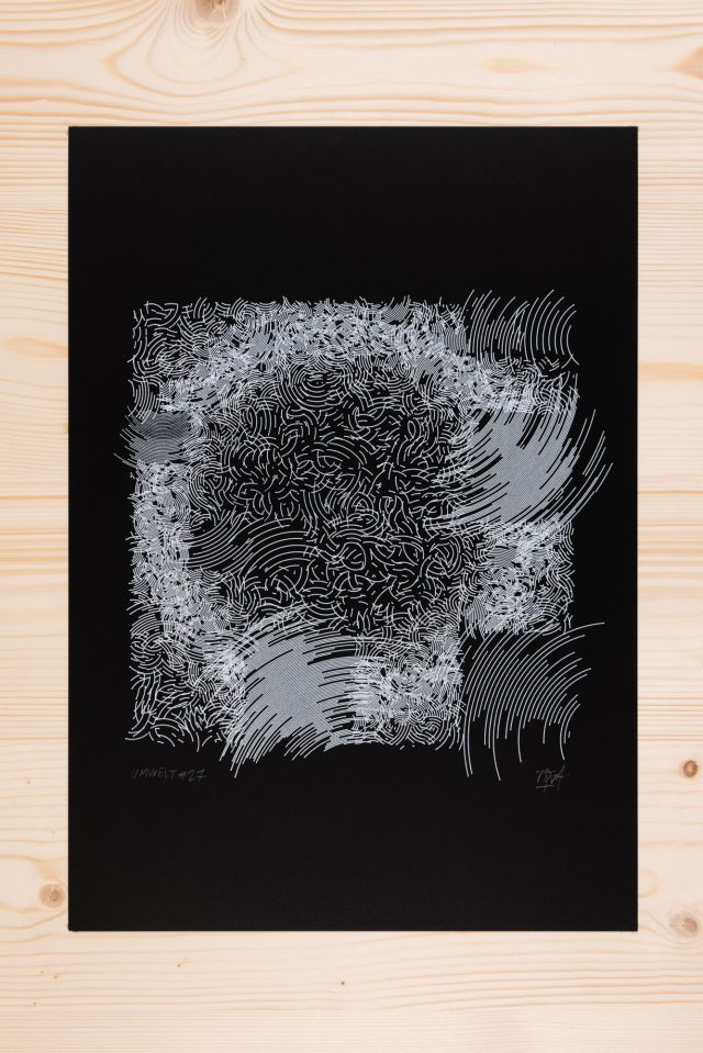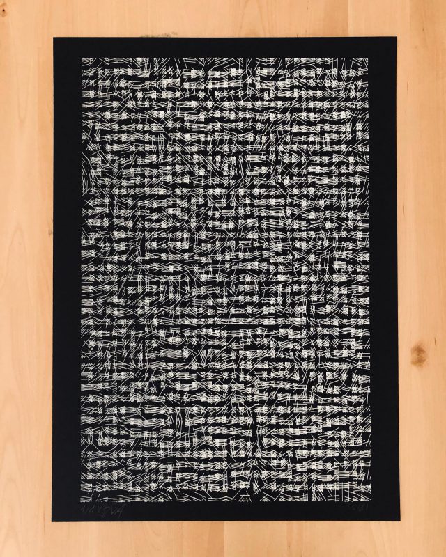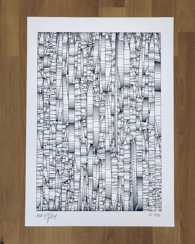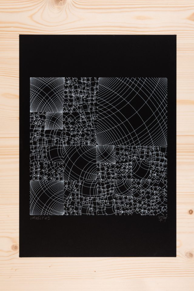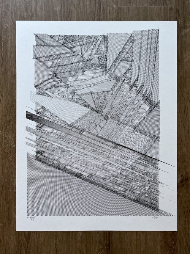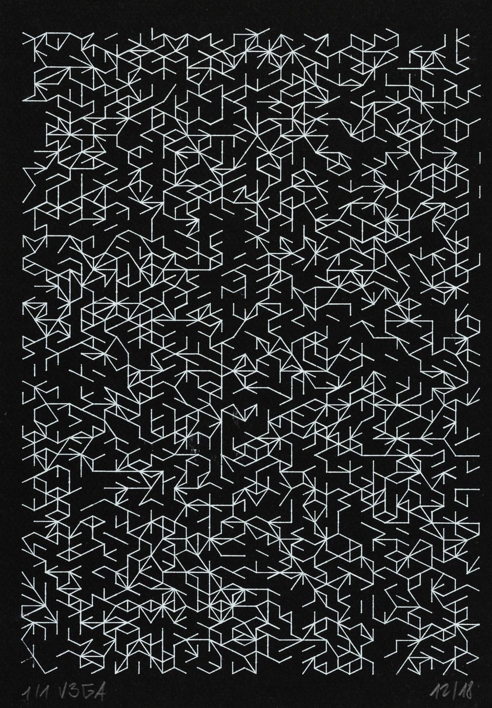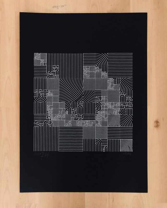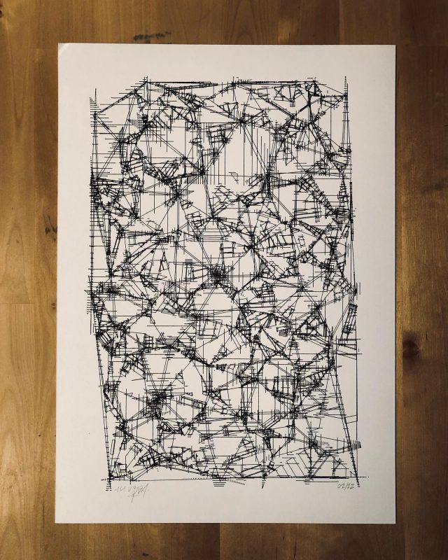 “Over the years, Julien Gachadoat has perfected working with minimal grids of thin white lines on black paper. With “Mineral” he pushes this exploration further by extending his work with a range of artificial life simulations and distortions. The result is a series of dynamic forms that fit together as a series, but where each image is distinct through different layers of texture and form. “Mineral” uses the structure of a grid as a playground for autonomous agents to wander around according to simple, discrete movement rules. Their local interactions lead to the creation of unpredictable sparse or dense geometric areas filled with lines. The images have many references from spiderwebs to broken glass, but they aren’t based on any specific natural phenomena. The forms emerge through the code that Julien created for building his own worlds.”