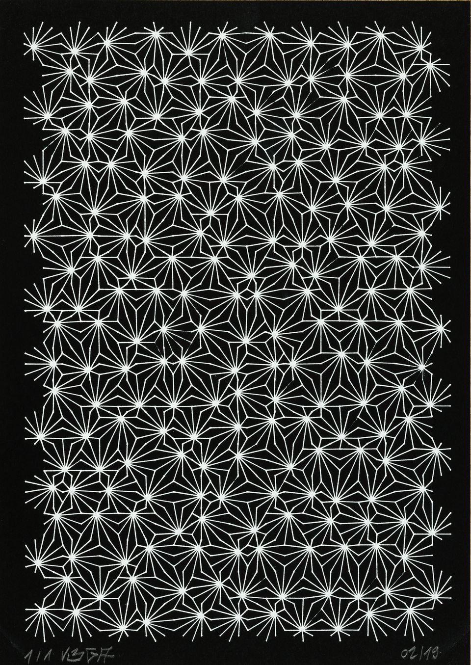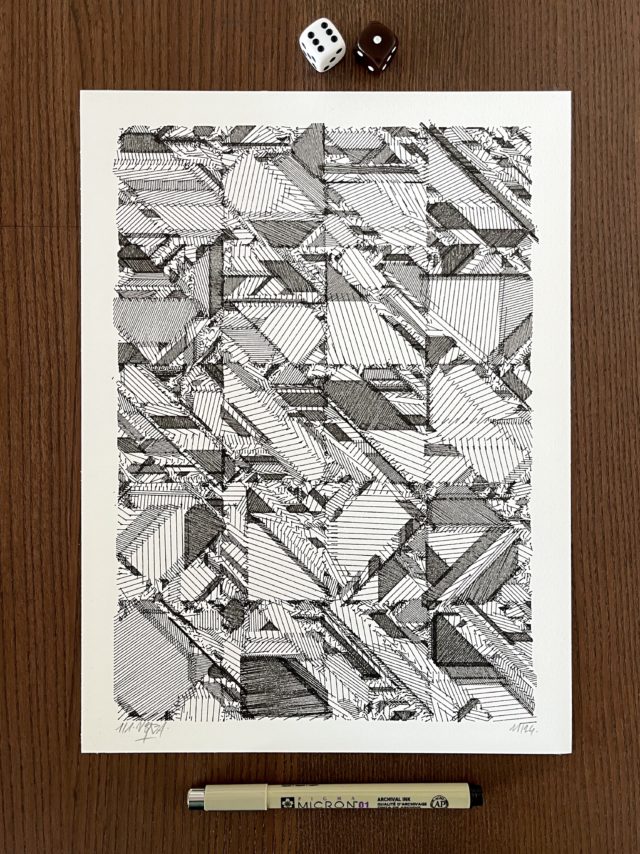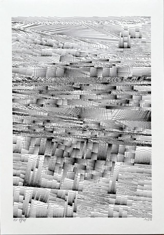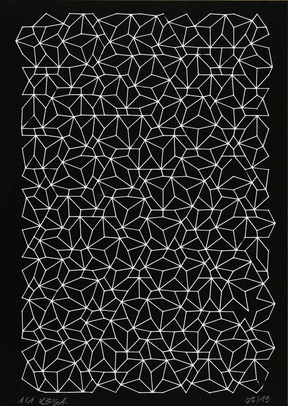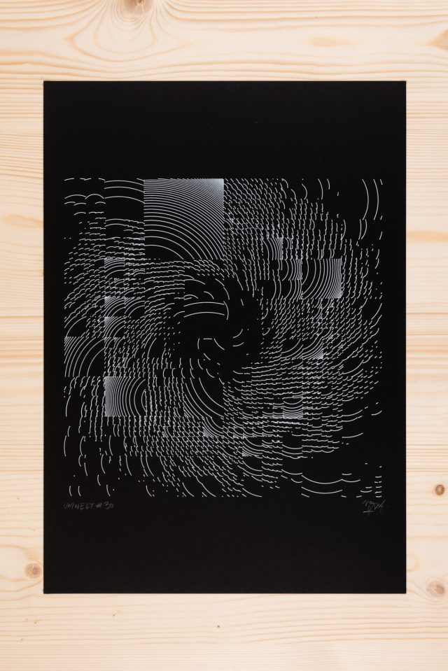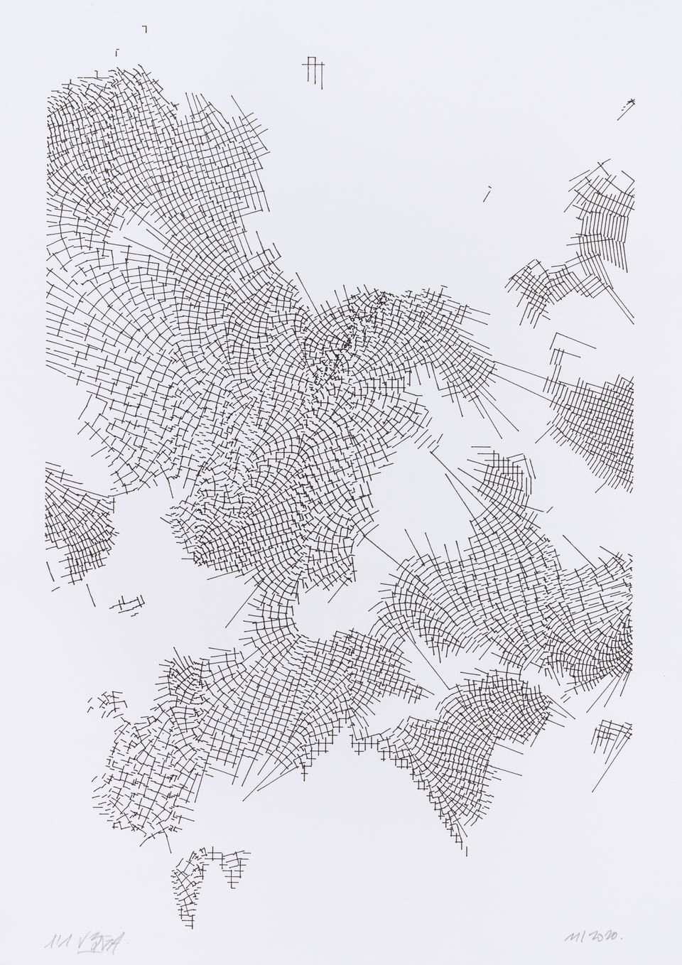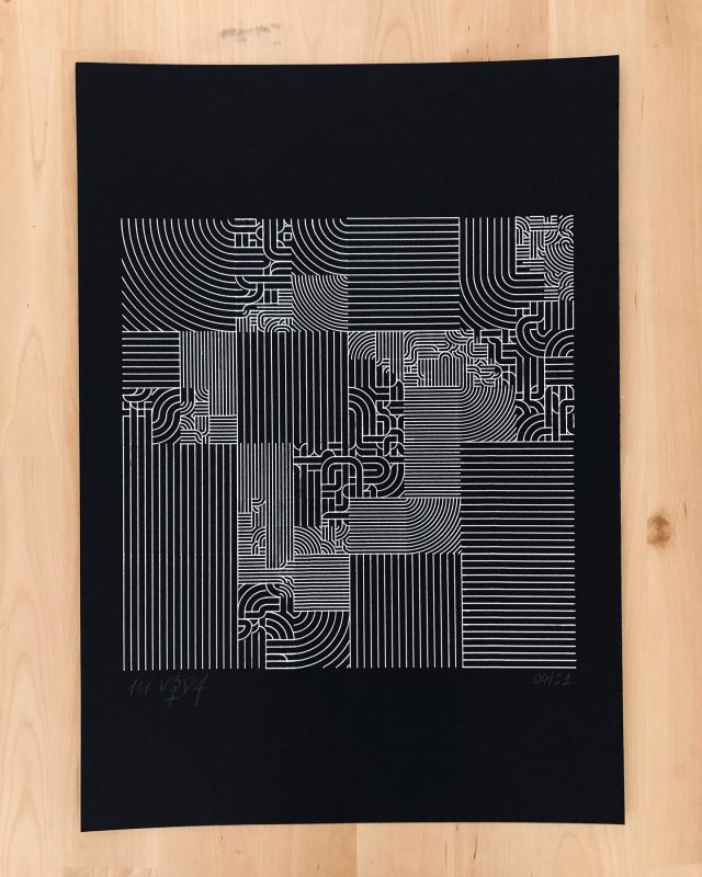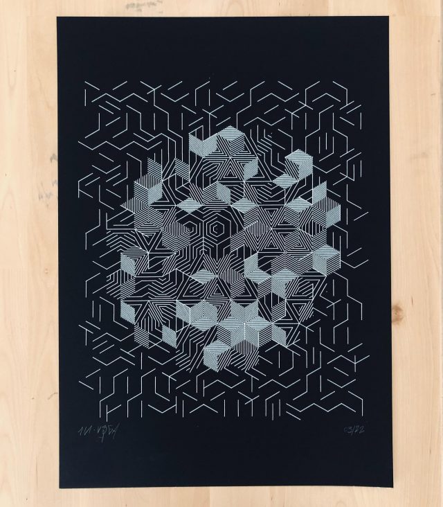 “Over the years, Julien Gachadoat has perfected working with minimal grids of thin white lines on black paper. With “Mineral” he pushes this exploration further by extending his work with a range of artificial life simulations and distortions. The result is a series of dynamic forms that fit together as a series, but where each image is distinct through different layers of texture and form. “Mineral” uses the structure of a grid as a playground for autonomous agents to wander around according to simple, discrete movement rules. Their local interactions lead to the creation of unpredictable sparse or dense geometric areas filled with lines. The images have many references from spiderwebs to broken glass, but they aren’t based on any specific natural phenomena. The forms emerge through the code that Julien created for building his own worlds.”