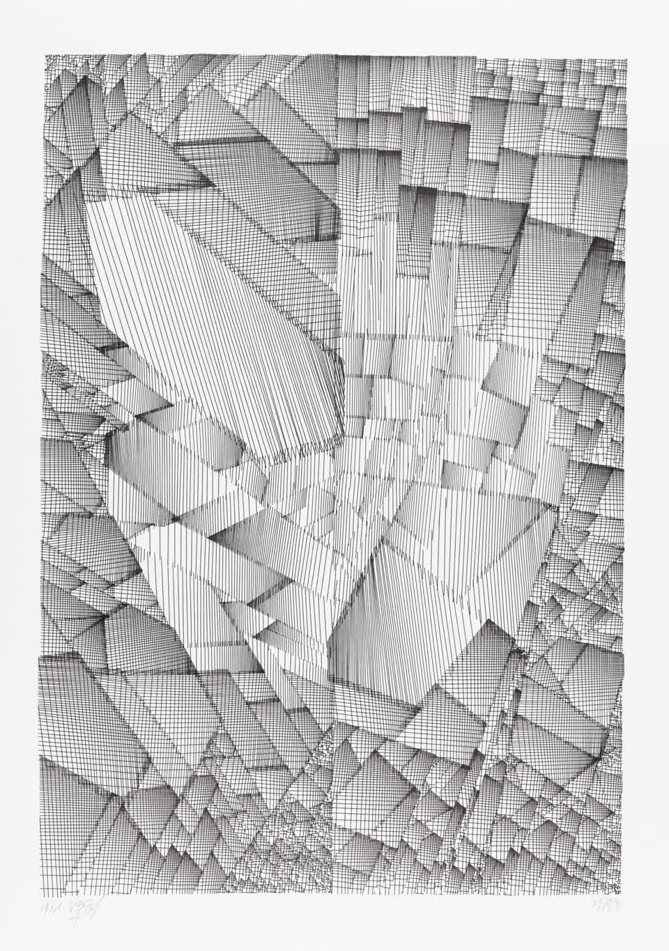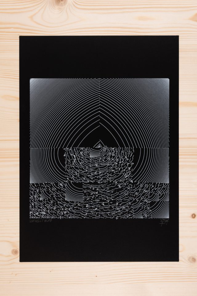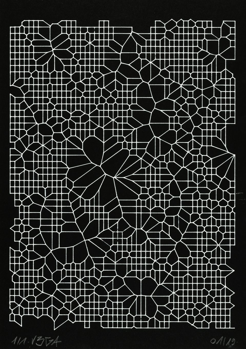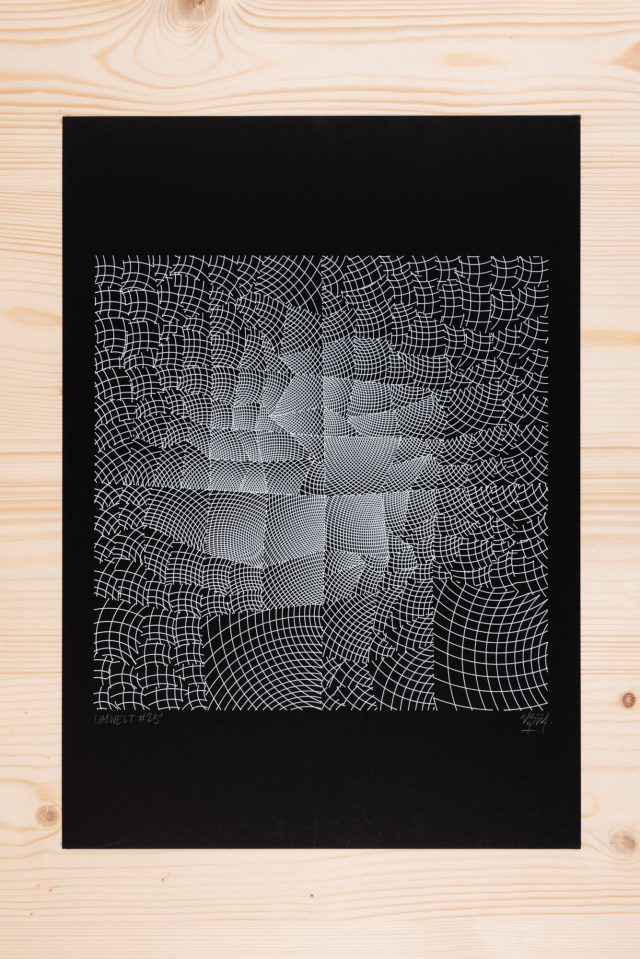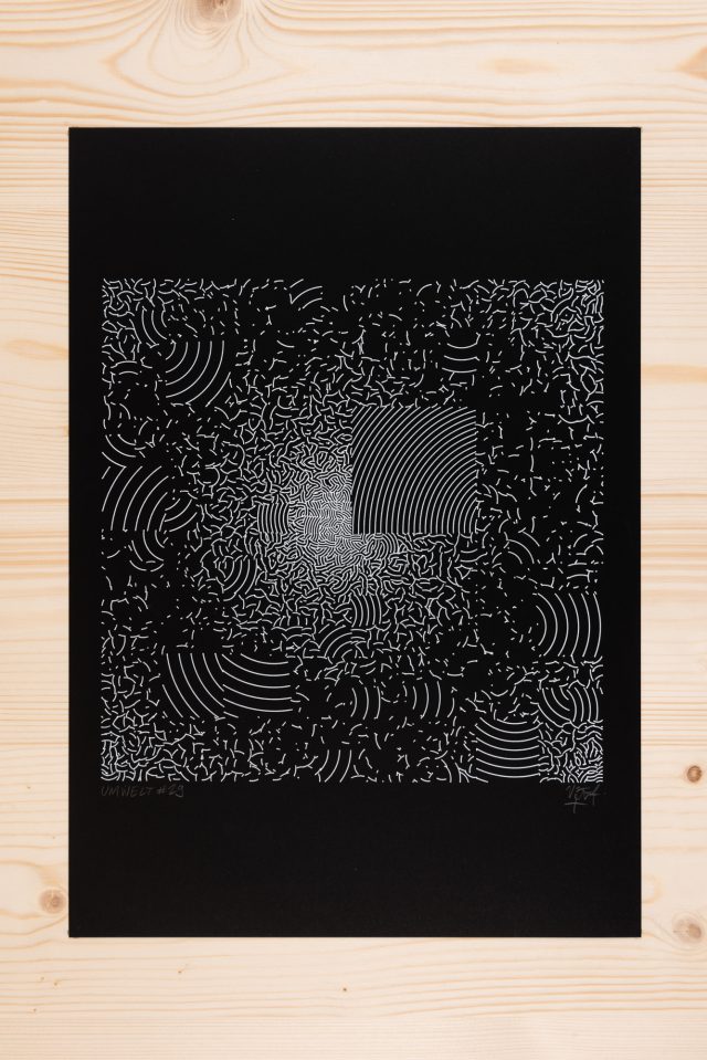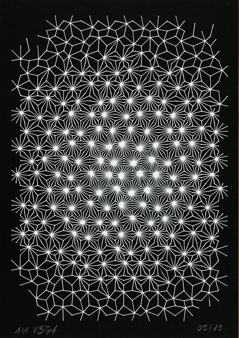 “Over the years, Julien Gachadoat has perfected working with minimal grids of thin white lines on black paper. With “Mineral” he pushes this exploration further by extending his work with a range of artificial life simulations and distortions. The result is a series of dynamic forms that fit together as a series, but where each image is distinct through different layers of texture and form. “Mineral” uses the structure of a grid as a playground for autonomous agents to wander around according to simple, discrete movement rules. Their local interactions lead to the creation of unpredictable sparse or dense geometric areas filled with lines. The images have many references from spiderwebs to broken glass, but they aren’t based on any specific natural phenomena. The forms emerge through the code that Julien created for building his own worlds.”