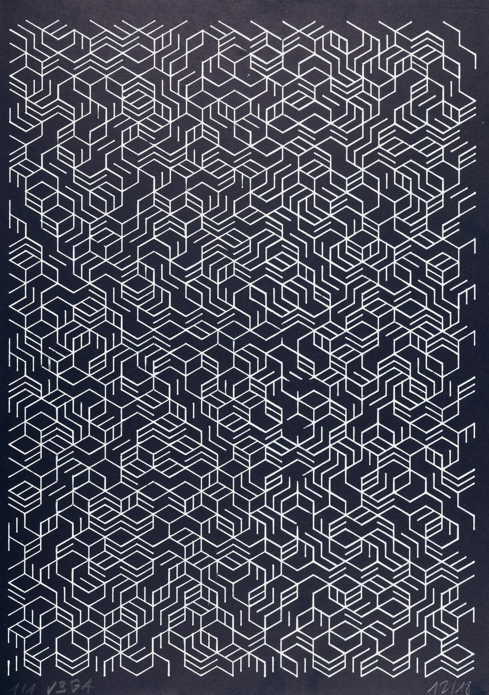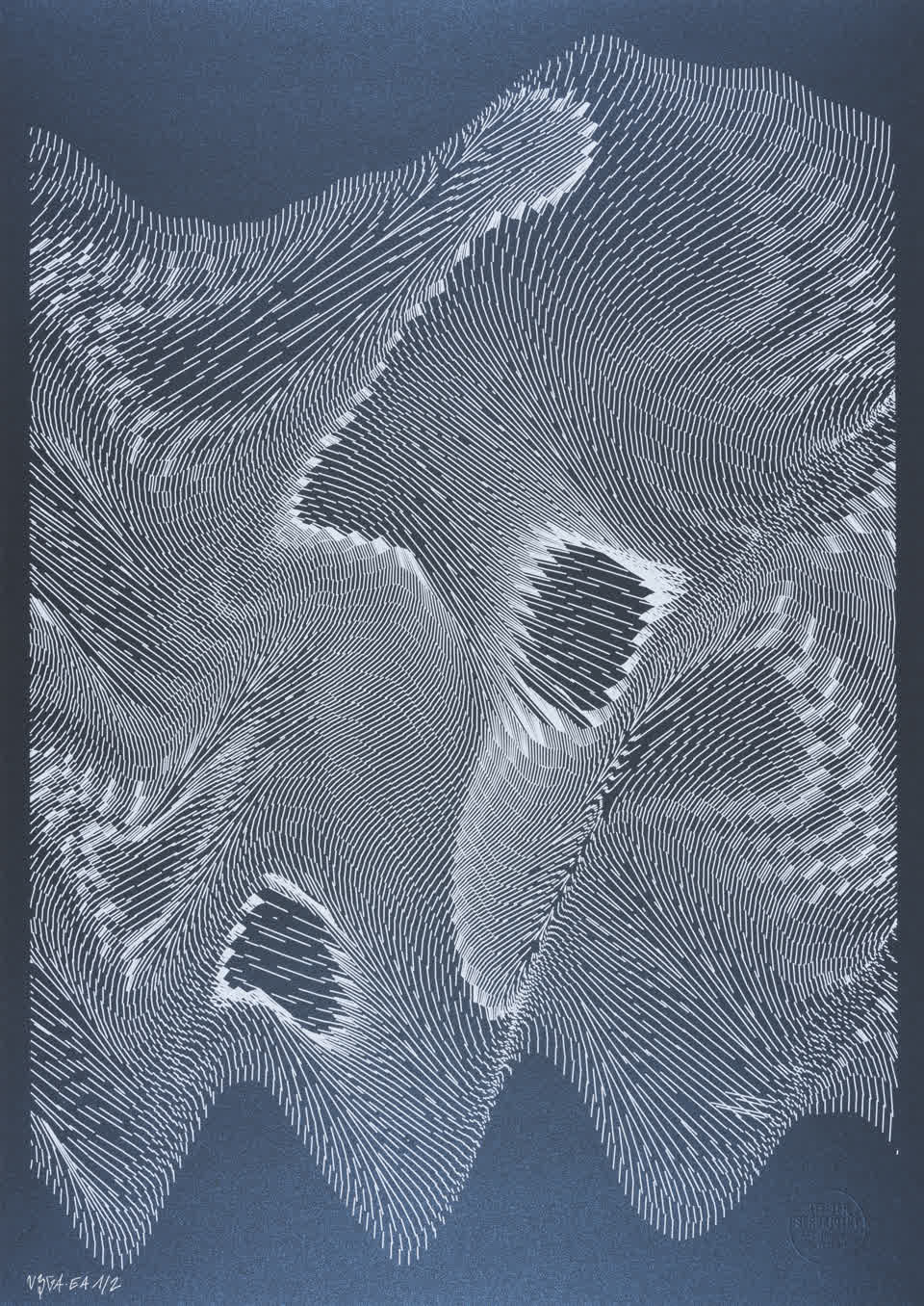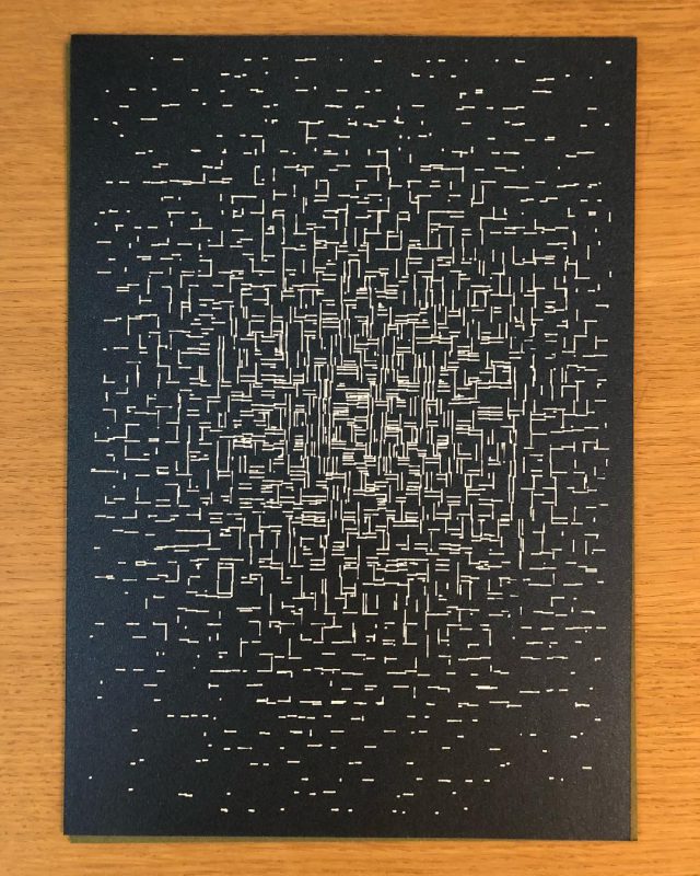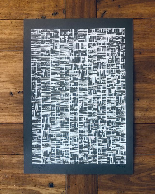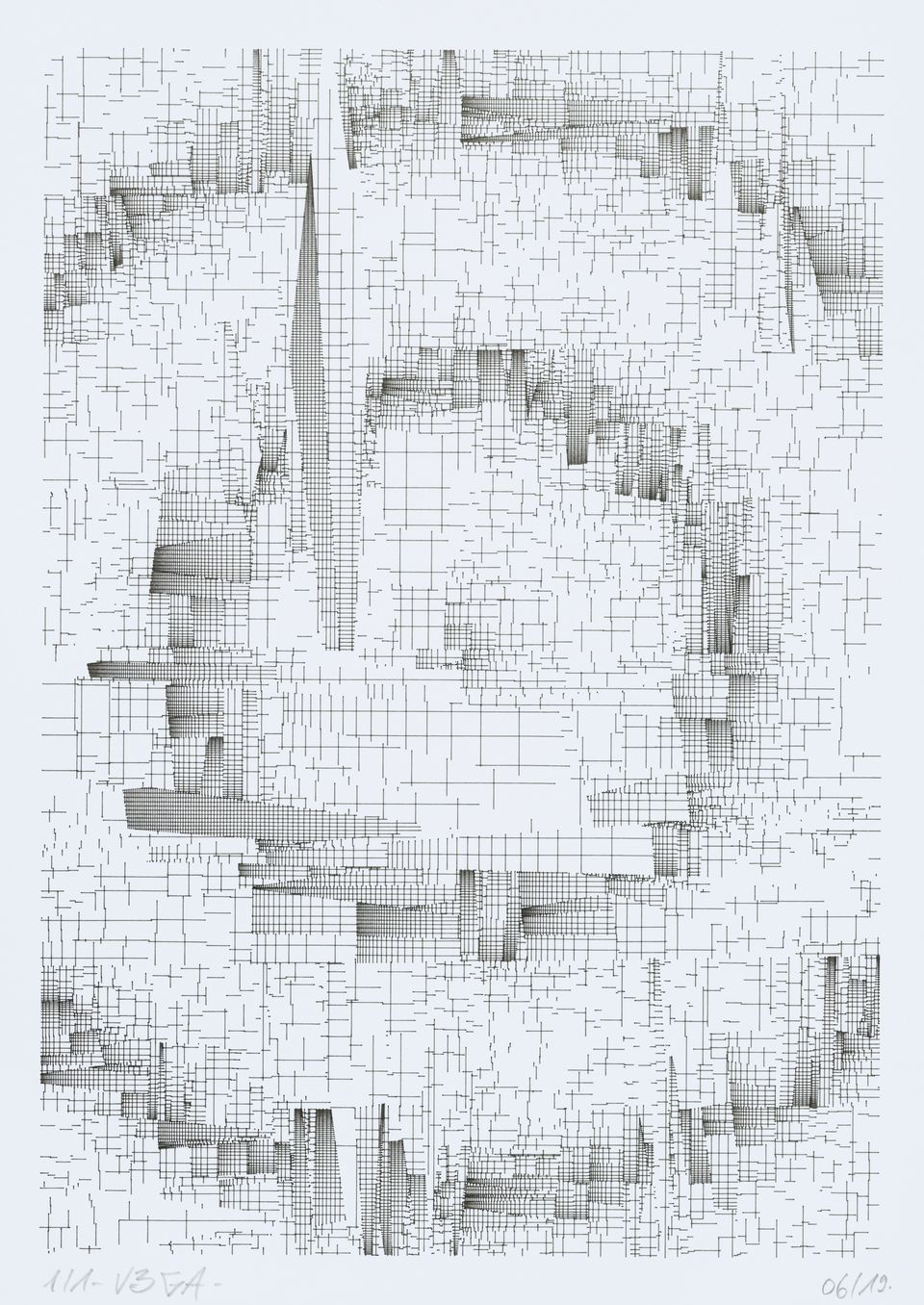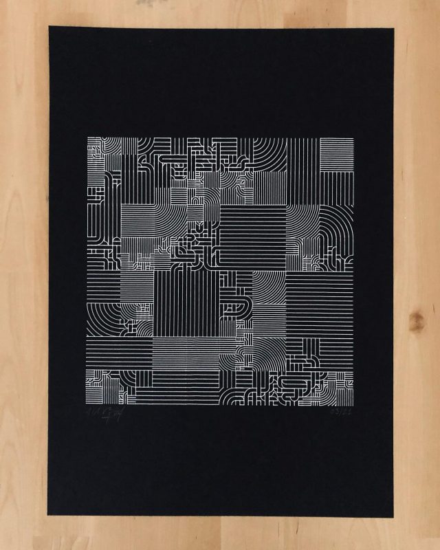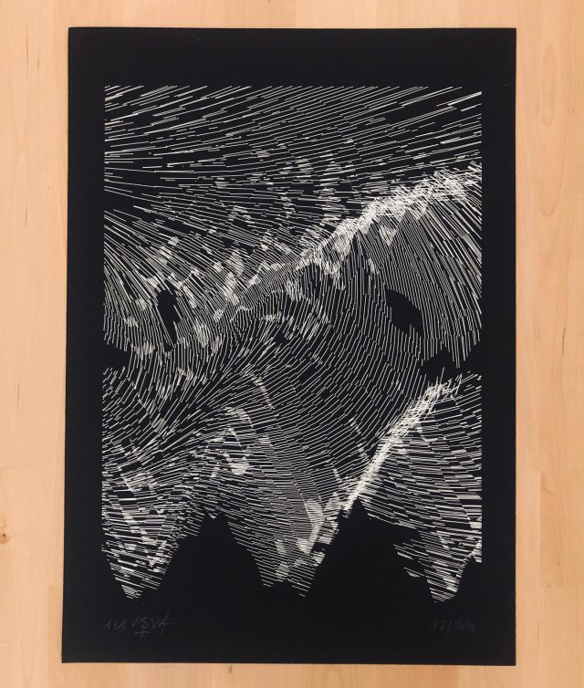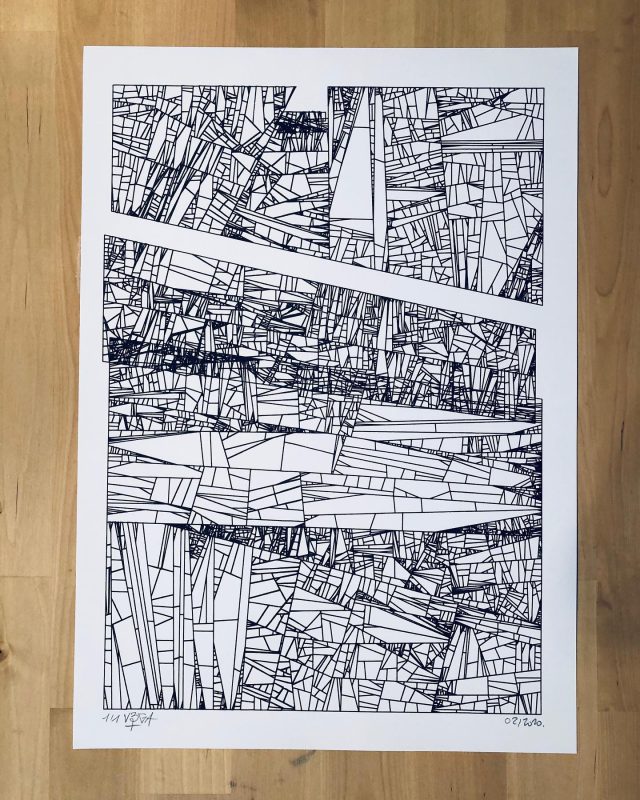 “Over the years, Julien Gachadoat has perfected working with minimal grids of thin white lines on black paper. With “Mineral” he pushes this exploration further by extending his work with a range of artificial life simulations and distortions. The result is a series of dynamic forms that fit together as a series, but where each image is distinct through different layers of texture and form. “Mineral” uses the structure of a grid as a playground for autonomous agents to wander around according to simple, discrete movement rules. Their local interactions lead to the creation of unpredictable sparse or dense geometric areas filled with lines. The images have many references from spiderwebs to broken glass, but they aren’t based on any specific natural phenomena. The forms emerge through the code that Julien created for building his own worlds.”