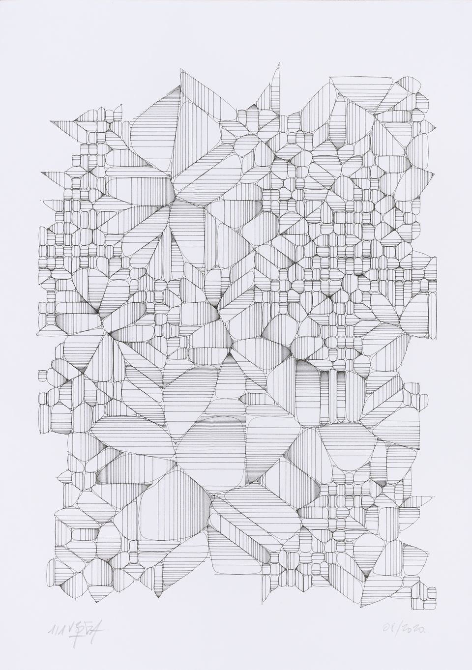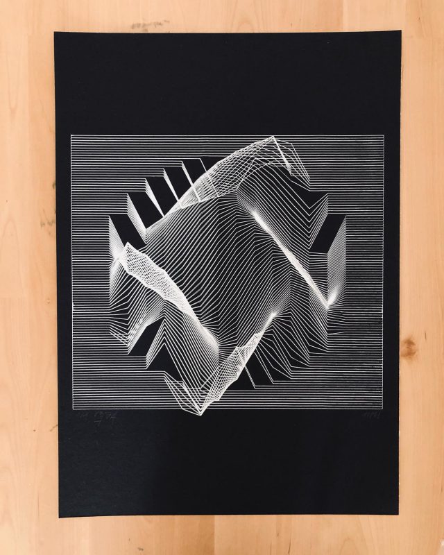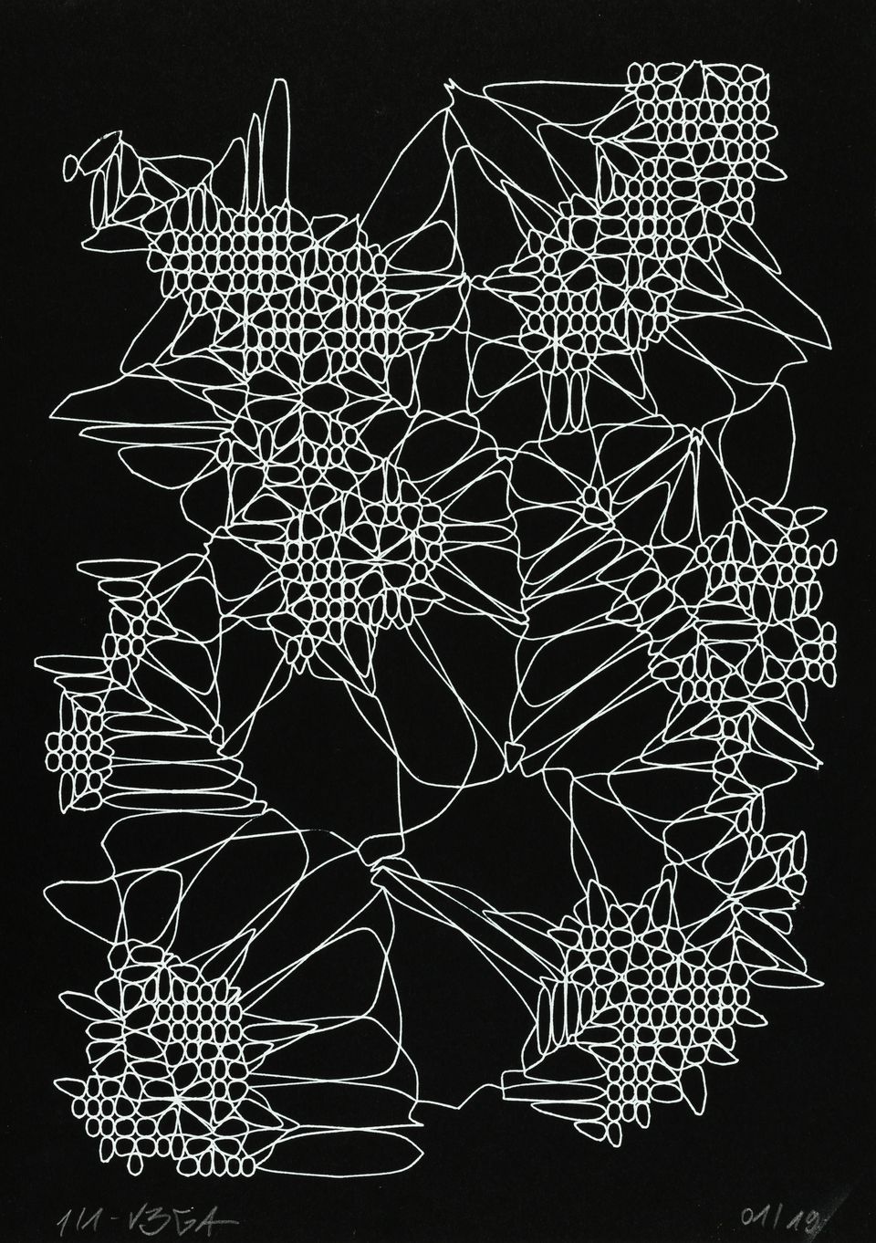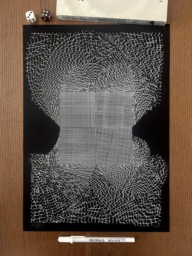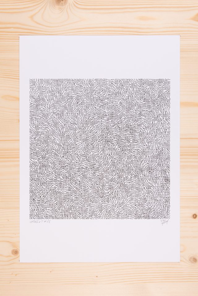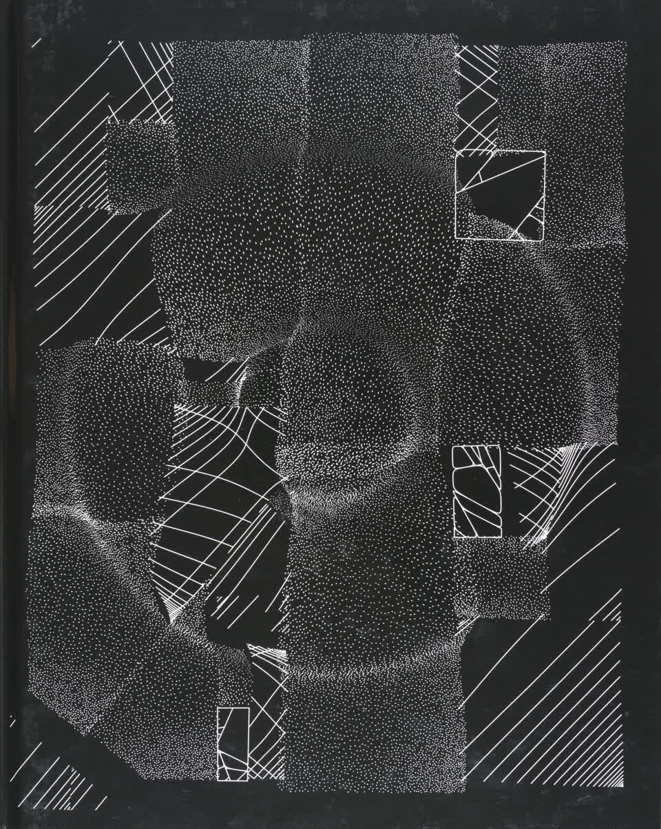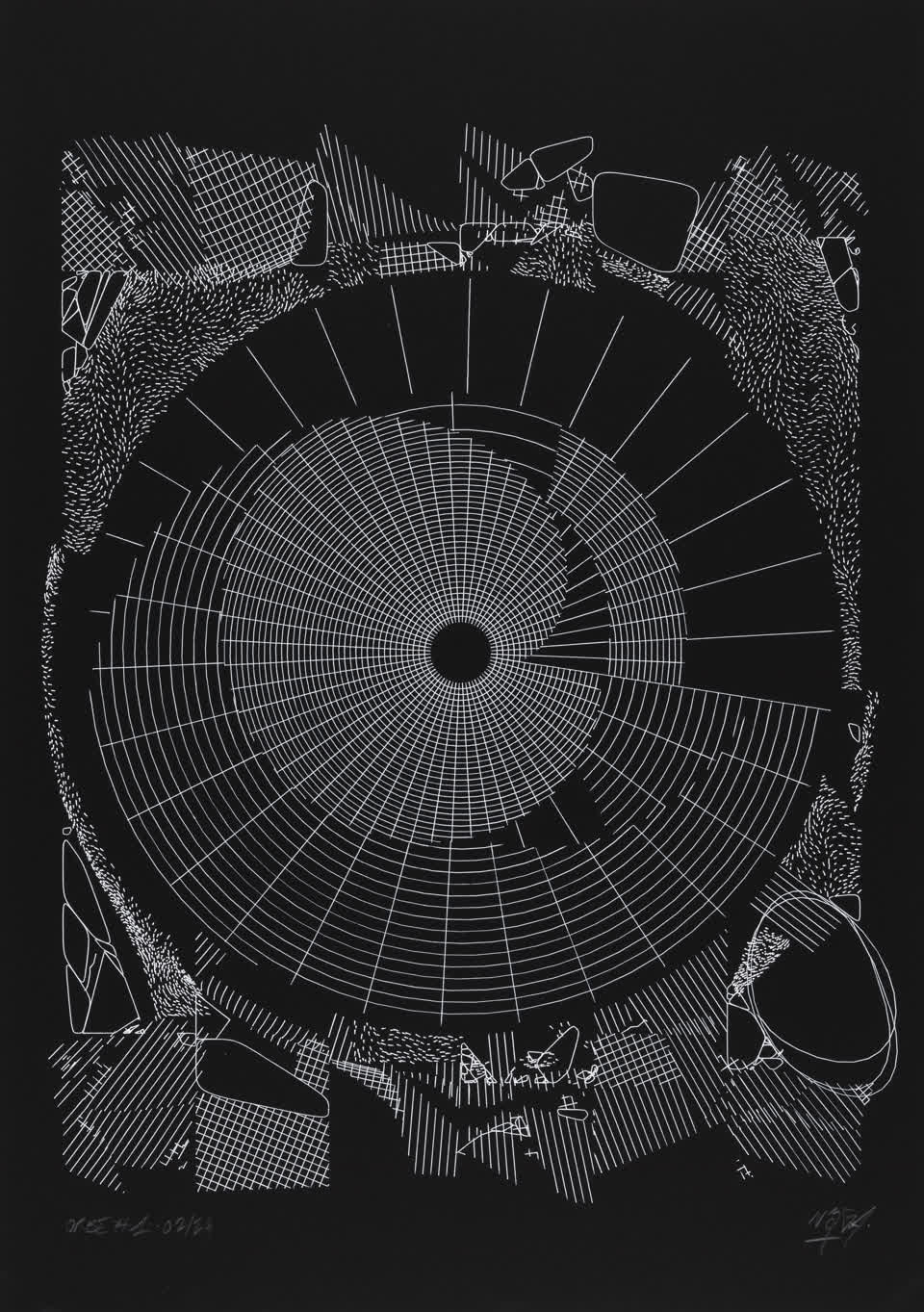 “Over the years, Julien Gachadoat has perfected working with minimal grids of thin white lines on black paper. With “Mineral” he pushes this exploration further by extending his work with a range of artificial life simulations and distortions. The result is a series of dynamic forms that fit together as a series, but where each image is distinct through different layers of texture and form. “Mineral” uses the structure of a grid as a playground for autonomous agents to wander around according to simple, discrete movement rules. Their local interactions lead to the creation of unpredictable sparse or dense geometric areas filled with lines. The images have many references from spiderwebs to broken glass, but they aren’t based on any specific natural phenomena. The forms emerge through the code that Julien created for building his own worlds.”