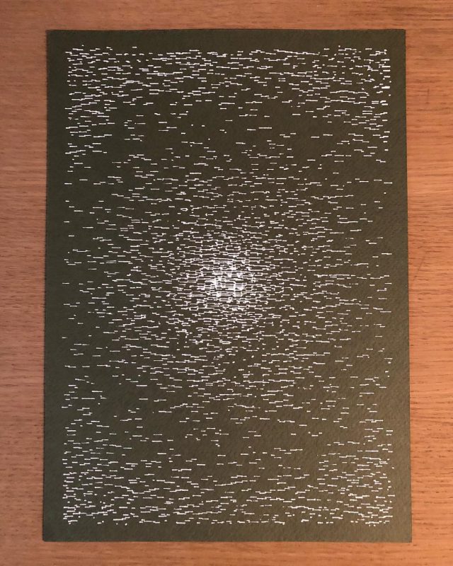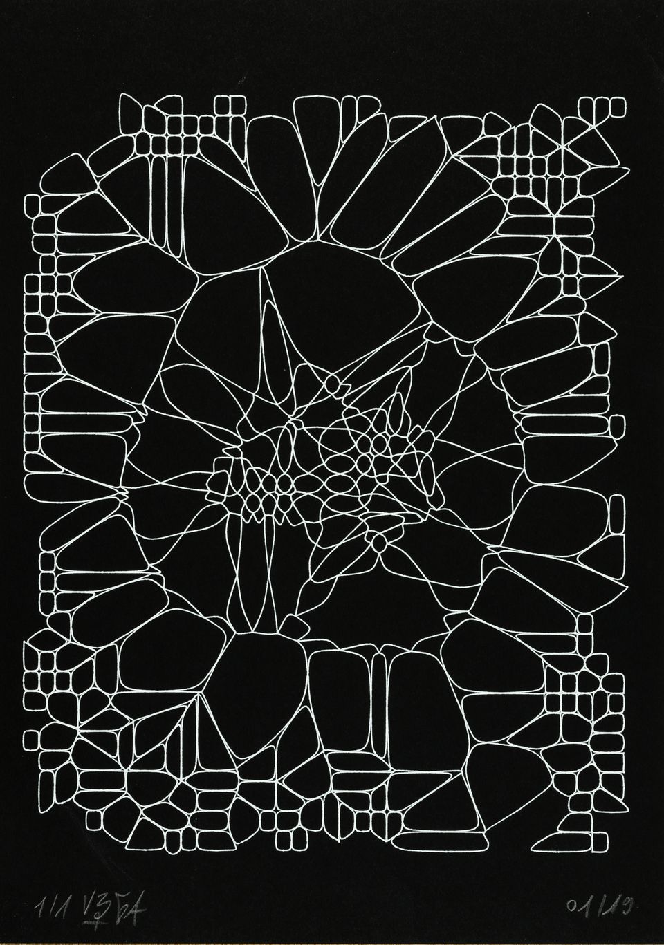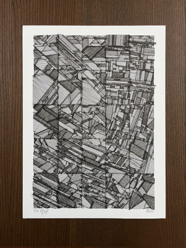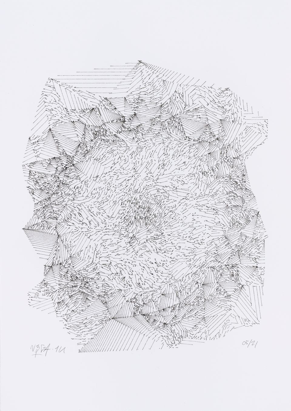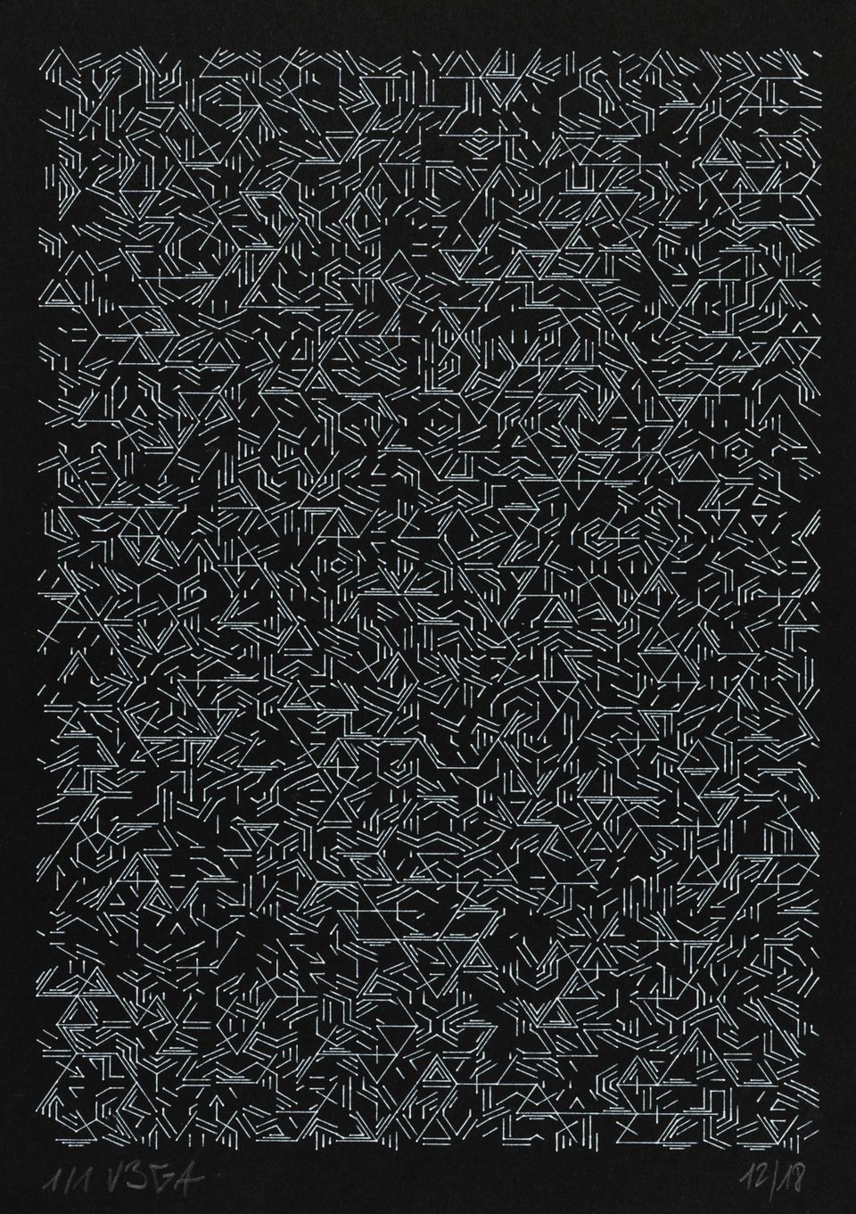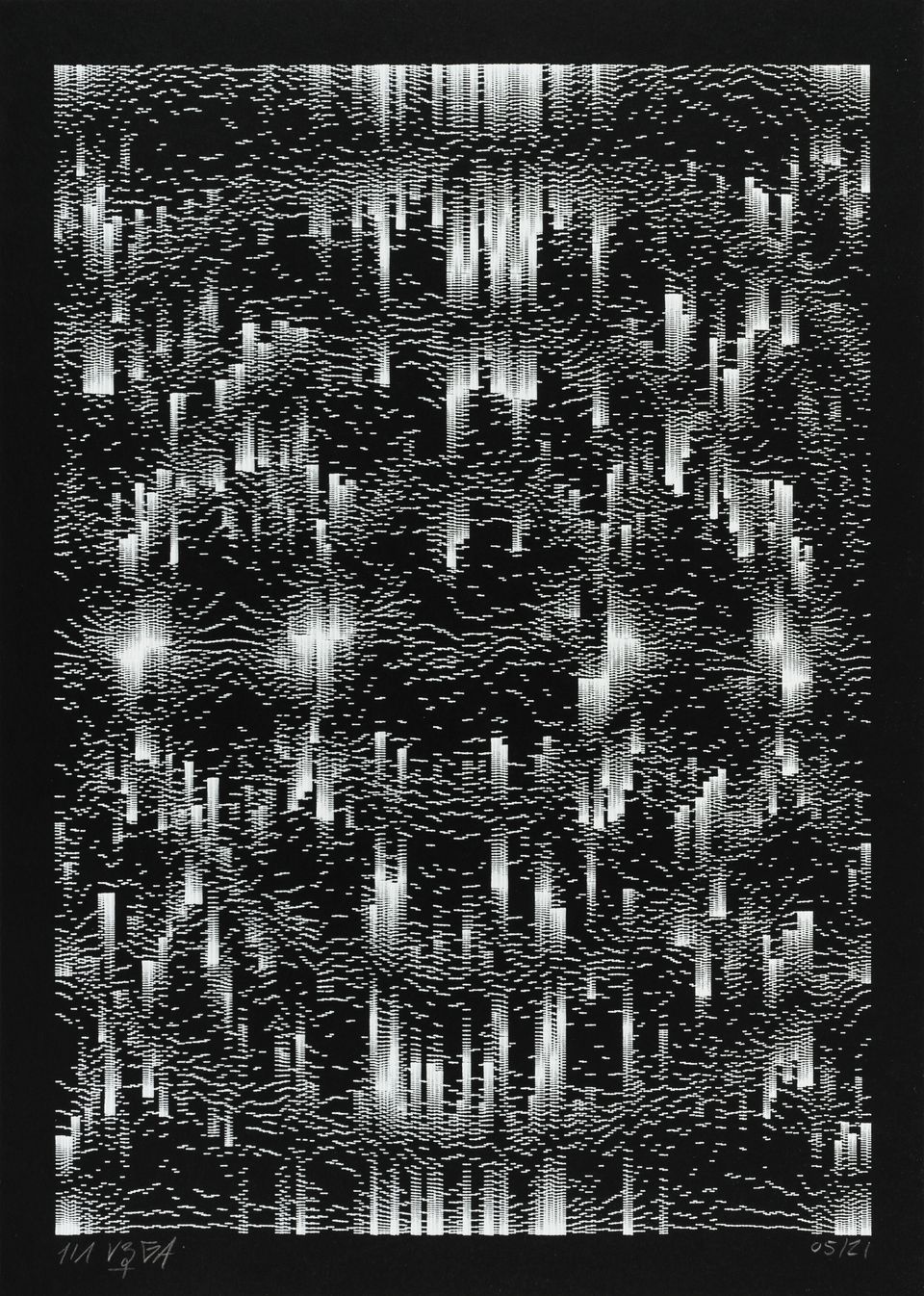 “Over the years, Julien Gachadoat has perfected working with minimal grids of thin white lines on black paper. With “Mineral” he pushes this exploration further by extending his work with a range of artificial life simulations and distortions. The result is a series of dynamic forms that fit together as a series, but where each image is distinct through different layers of texture and form. “Mineral” uses the structure of a grid as a playground for autonomous agents to wander around according to simple, discrete movement rules. Their local interactions lead to the creation of unpredictable sparse or dense geometric areas filled with lines. The images have many references from spiderwebs to broken glass, but they aren’t based on any specific natural phenomena. The forms emerge through the code that Julien created for building his own worlds.”