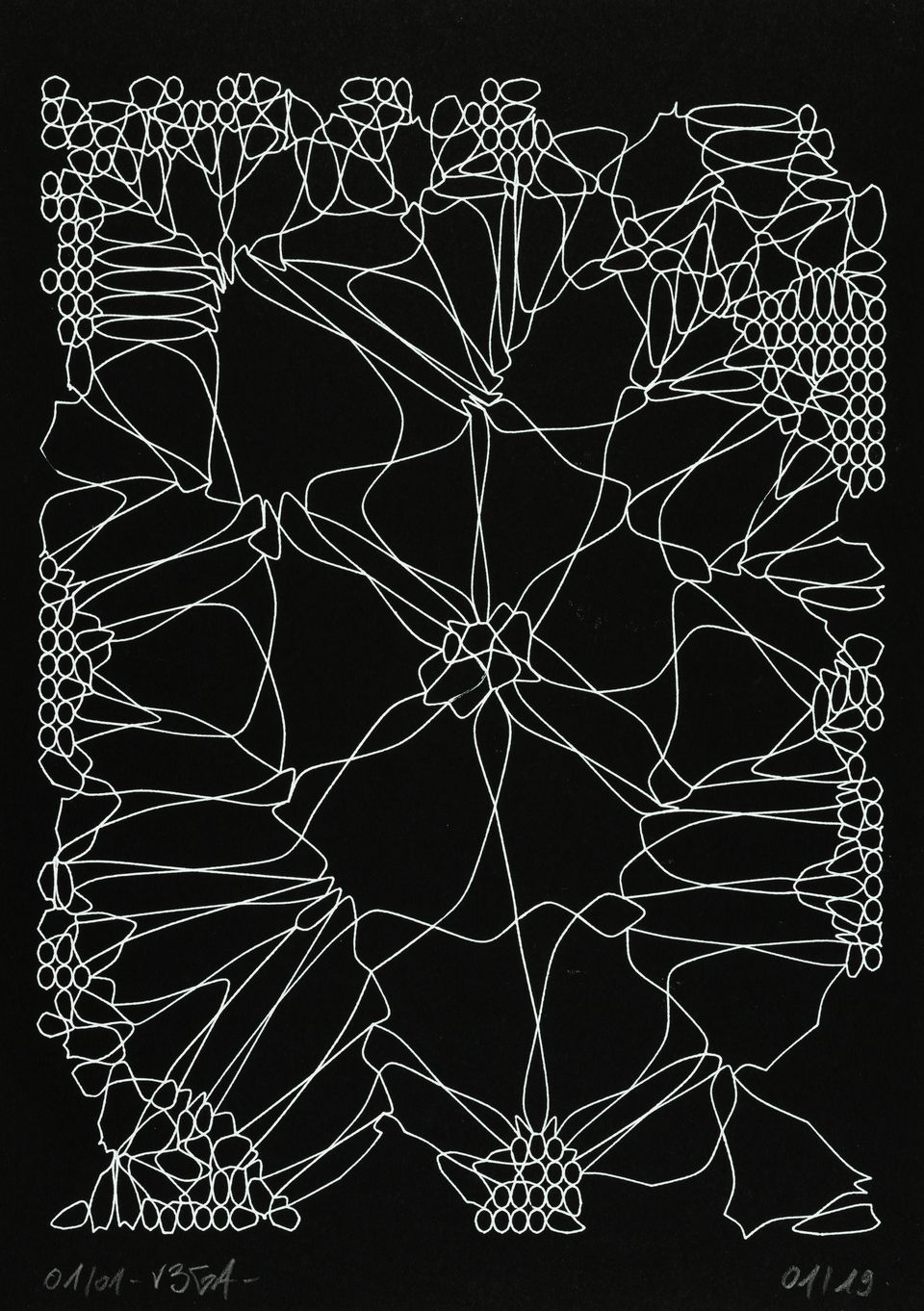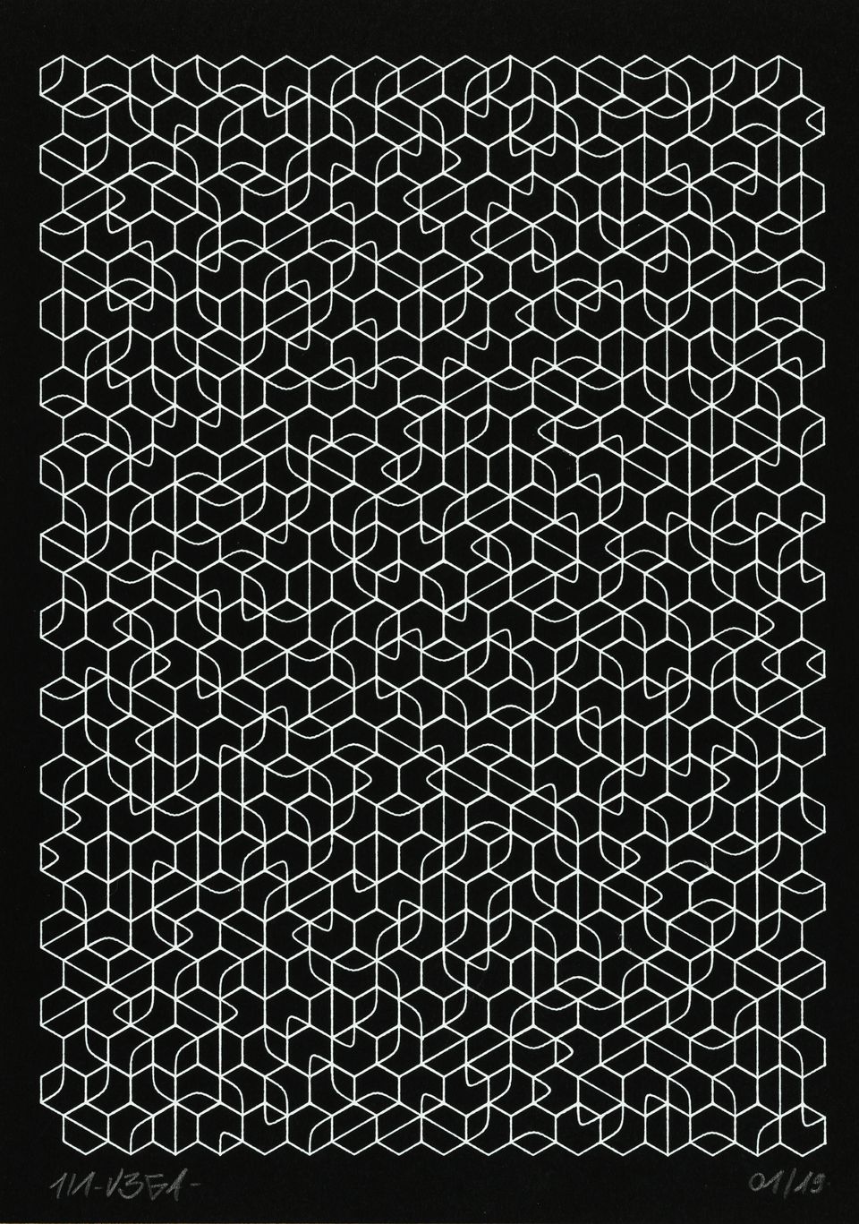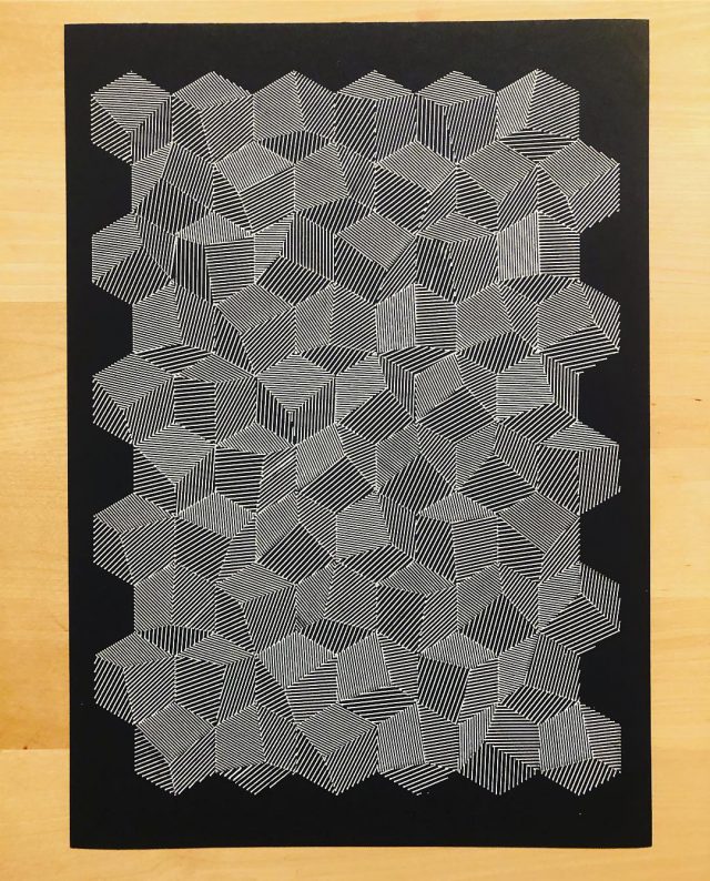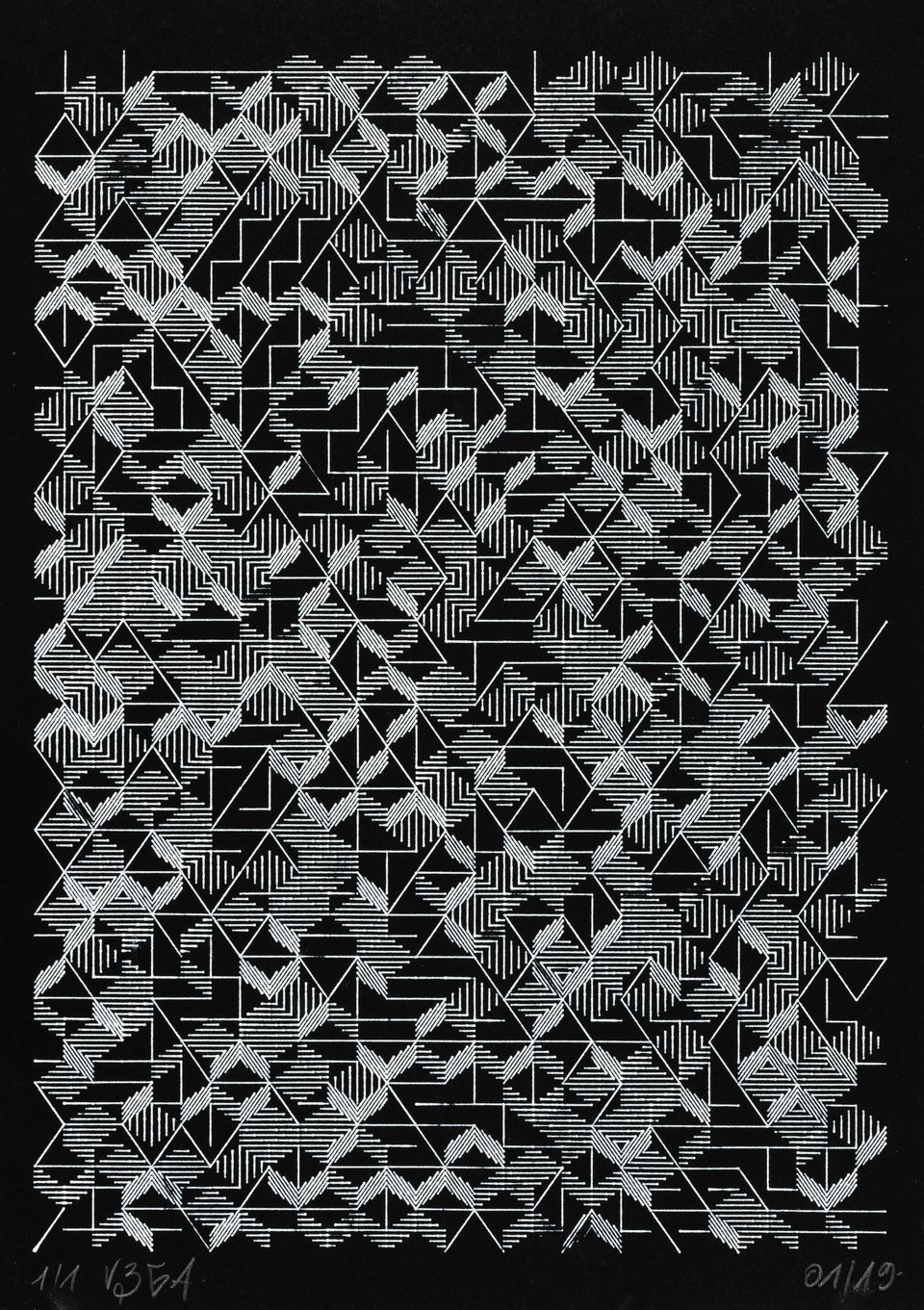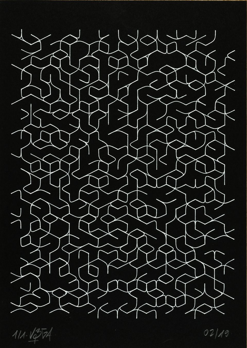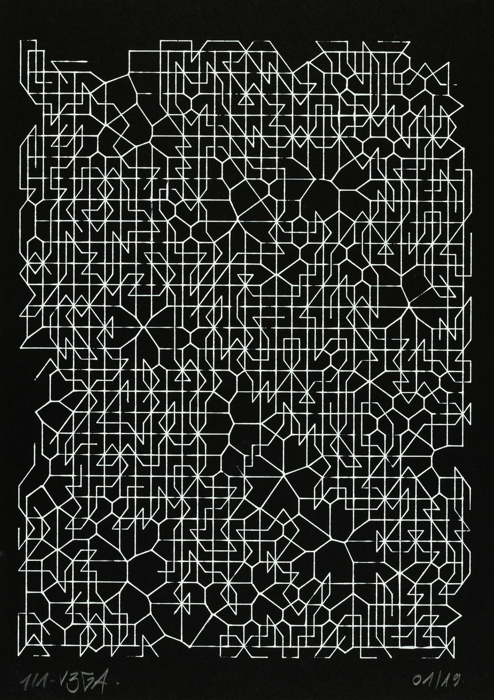 “Over the years, Julien Gachadoat has perfected working with minimal grids of thin white lines on black paper. With “Mineral” he pushes this exploration further by extending his work with a range of artificial life simulations and distortions. The result is a series of dynamic forms that fit together as a series, but where each image is distinct through different layers of texture and form. “Mineral” uses the structure of a grid as a playground for autonomous agents to wander around according to simple, discrete movement rules. Their local interactions lead to the creation of unpredictable sparse or dense geometric areas filled with lines. The images have many references from spiderwebs to broken glass, but they aren’t based on any specific natural phenomena. The forms emerge through the code that Julien created for building his own worlds.”