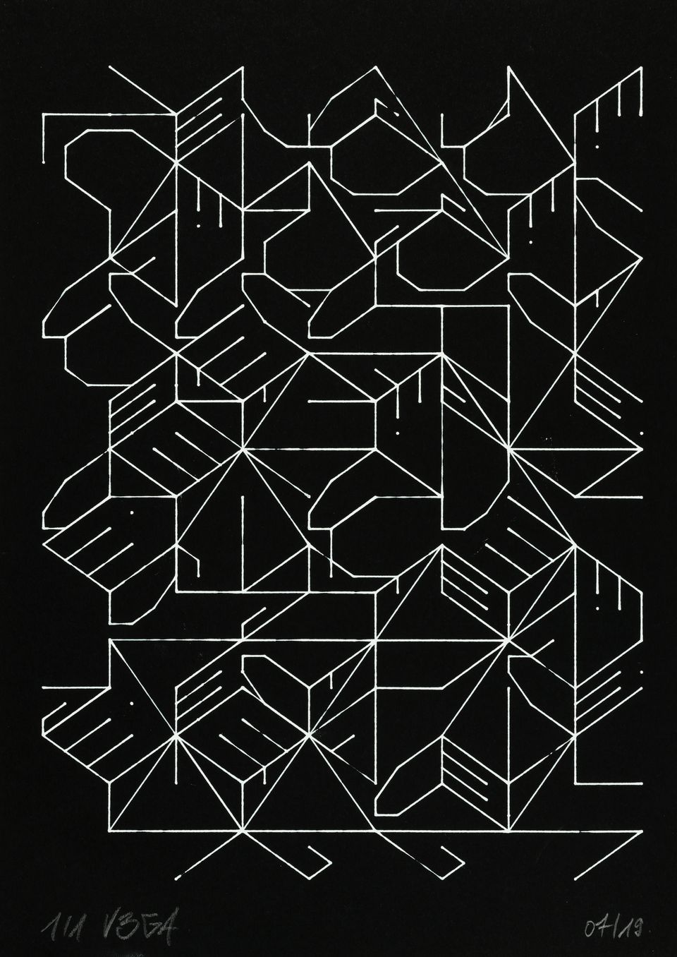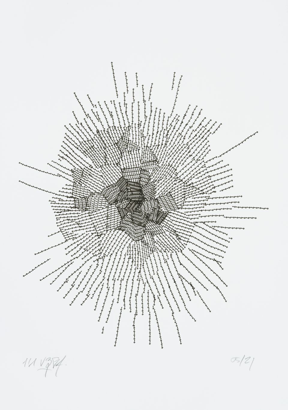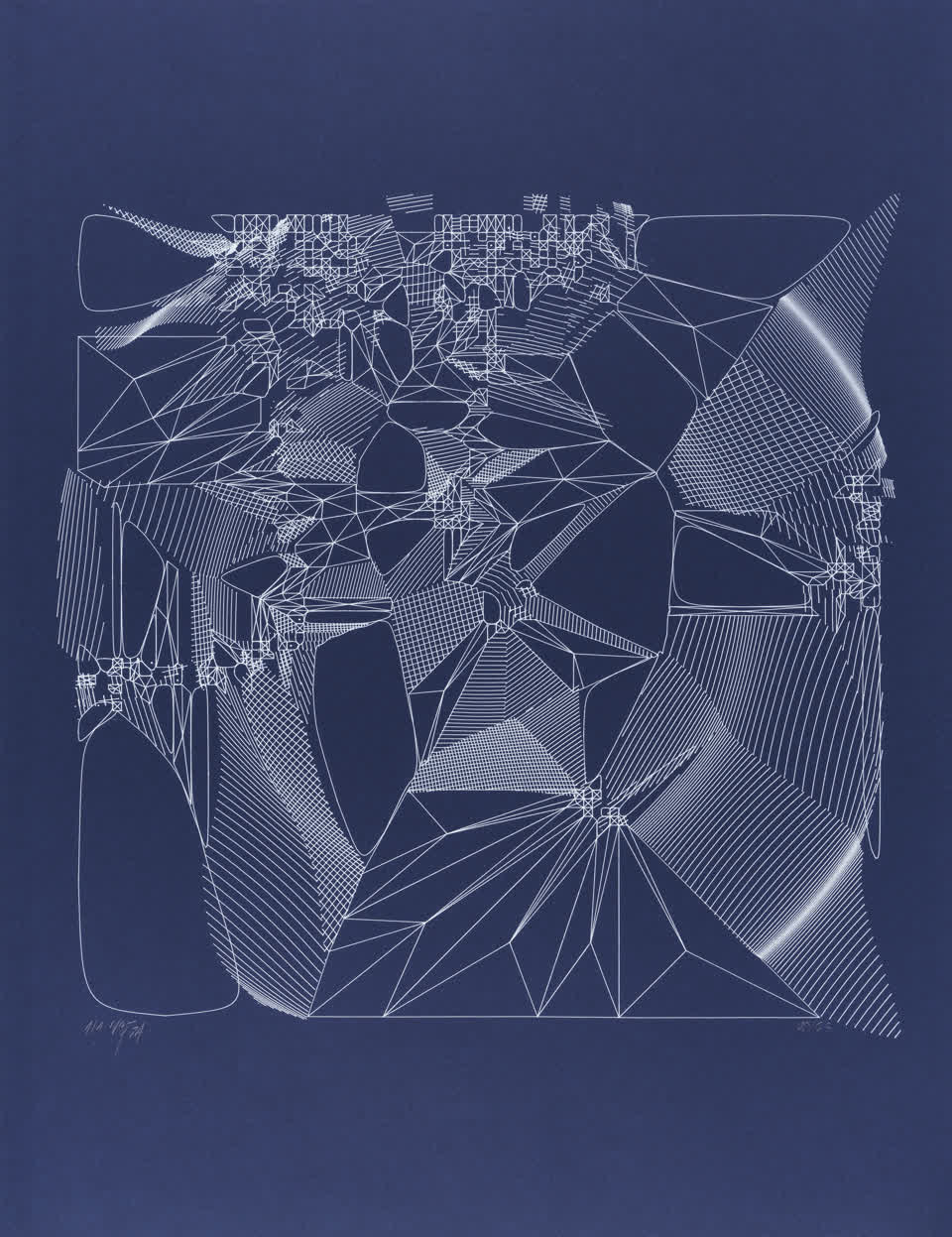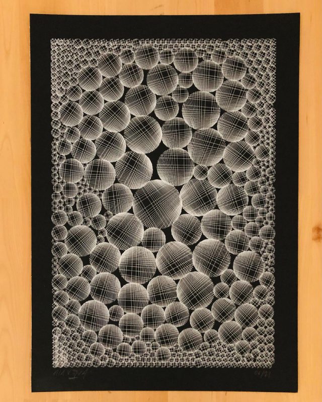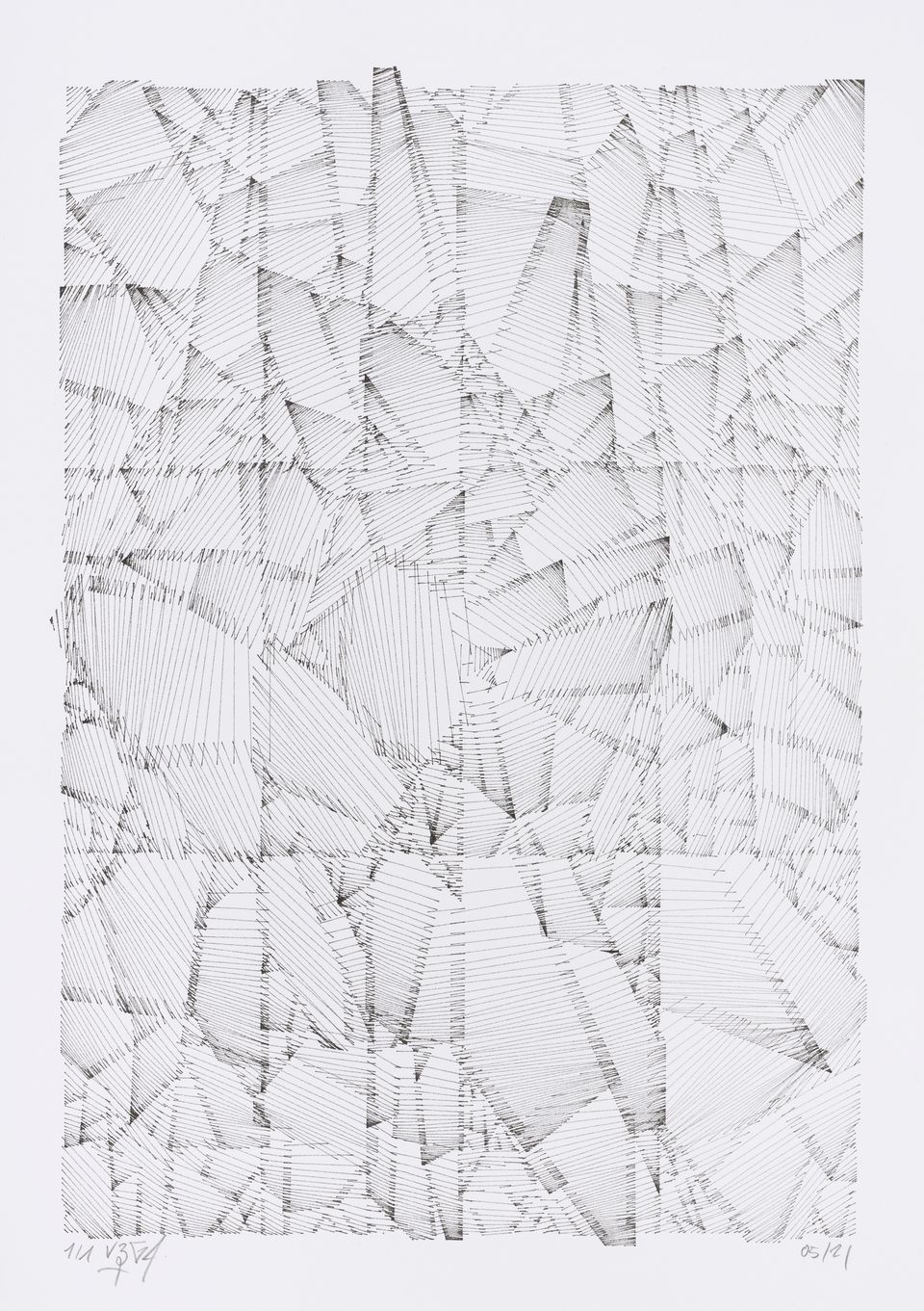 “Over the years, Julien Gachadoat has perfected working with minimal grids of thin white lines on black paper. With “Mineral” he pushes this exploration further by extending his work with a range of artificial life simulations and distortions. The result is a series of dynamic forms that fit together as a series, but where each image is distinct through different layers of texture and form. “Mineral” uses the structure of a grid as a playground for autonomous agents to wander around according to simple, discrete movement rules. Their local interactions lead to the creation of unpredictable sparse or dense geometric areas filled with lines. The images have many references from spiderwebs to broken glass, but they aren’t based on any specific natural phenomena. The forms emerge through the code that Julien created for building his own worlds.”
