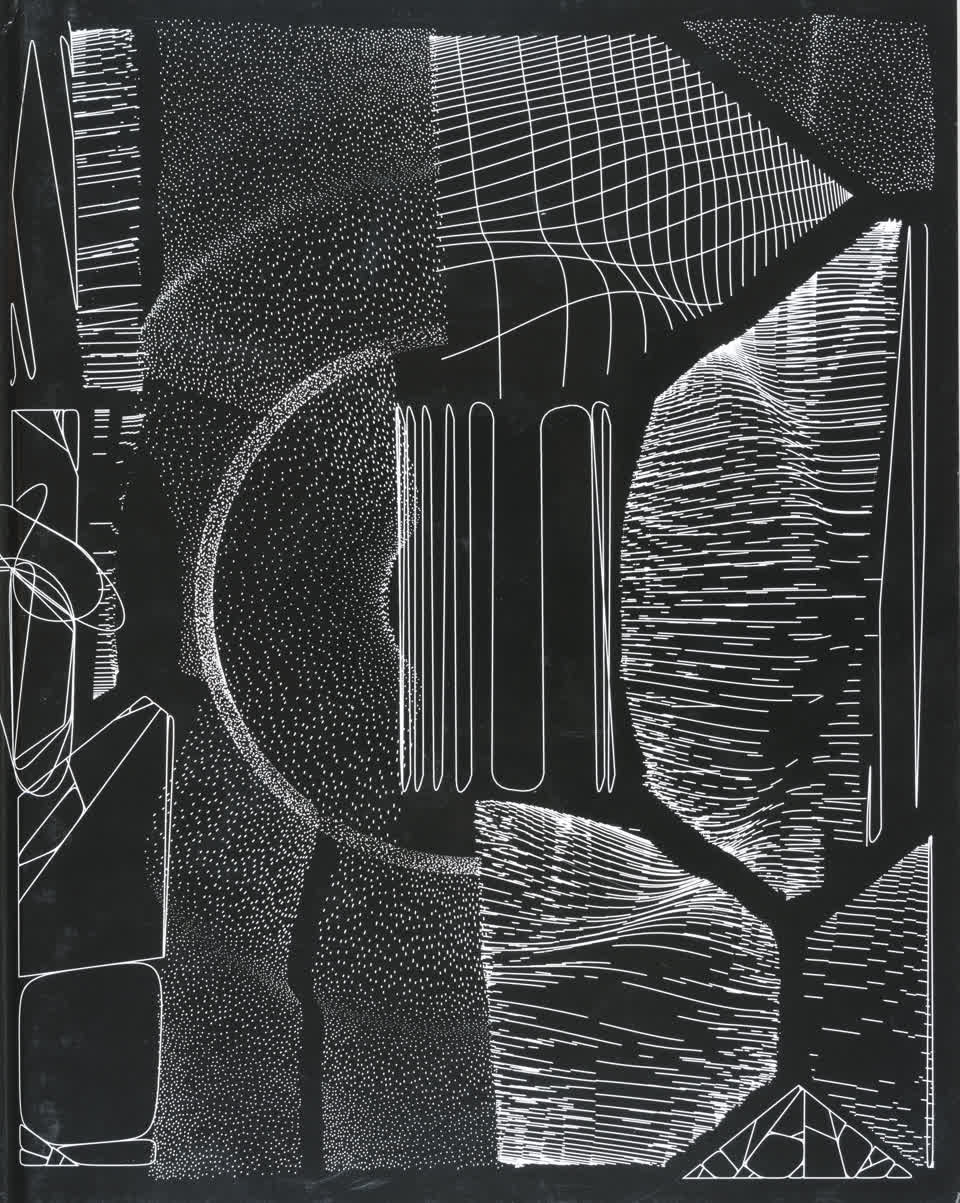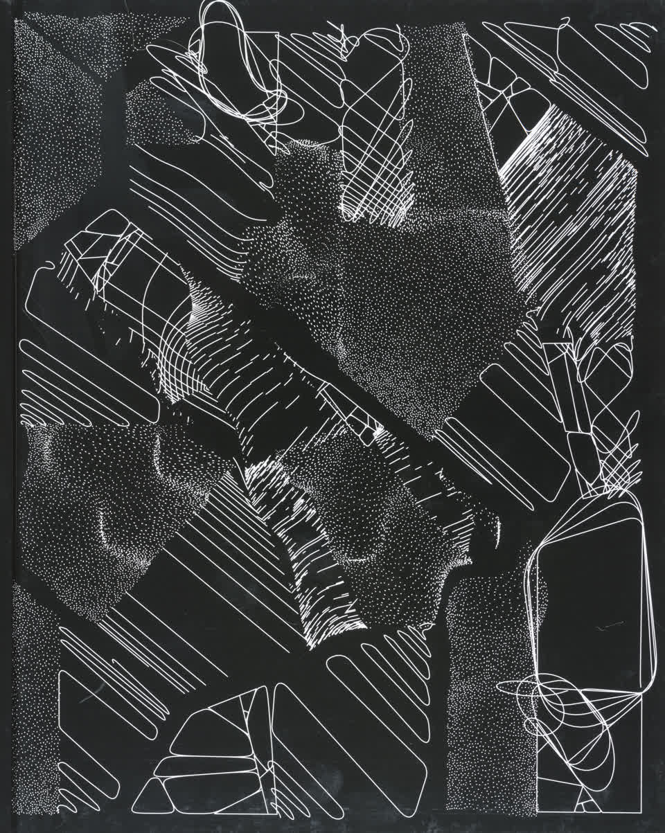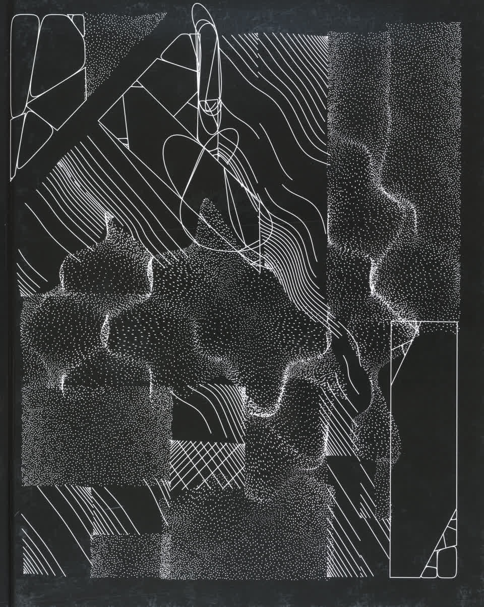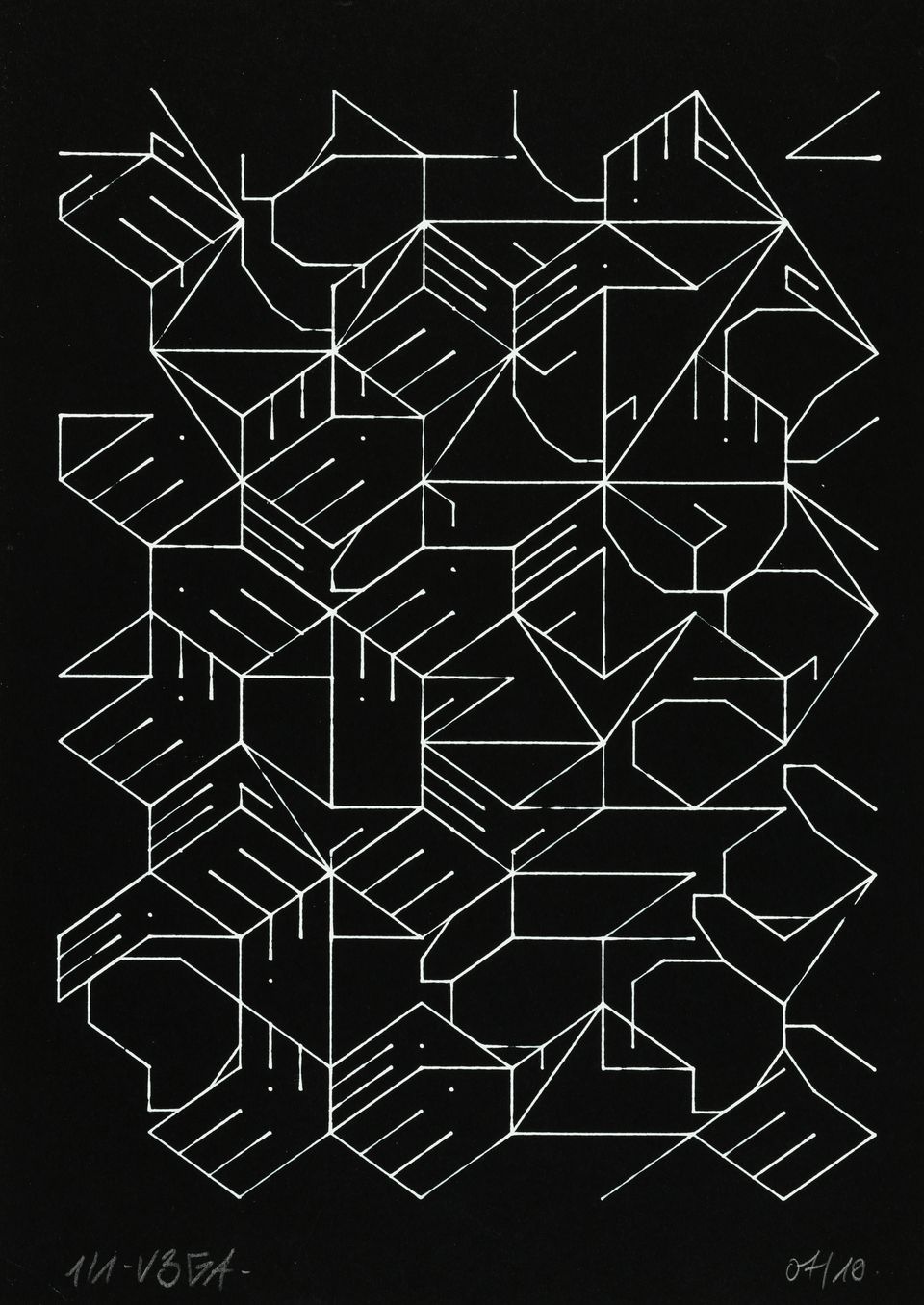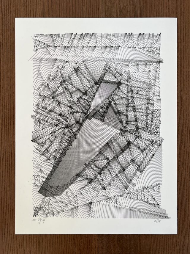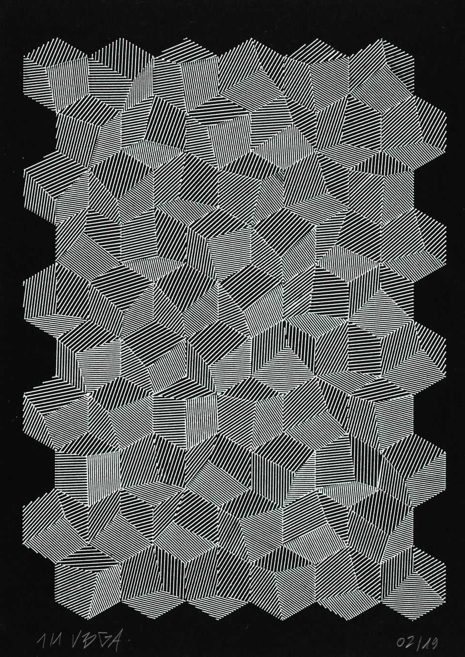 “Over the years, Julien Gachadoat has perfected working with minimal grids of thin white lines on black paper. With “Mineral” he pushes this exploration further by extending his work with a range of artificial life simulations and distortions. The result is a series of dynamic forms that fit together as a series, but where each image is distinct through different layers of texture and form. “Mineral” uses the structure of a grid as a playground for autonomous agents to wander around according to simple, discrete movement rules. Their local interactions lead to the creation of unpredictable sparse or dense geometric areas filled with lines. The images have many references from spiderwebs to broken glass, but they aren’t based on any specific natural phenomena. The forms emerge through the code that Julien created for building his own worlds.”
