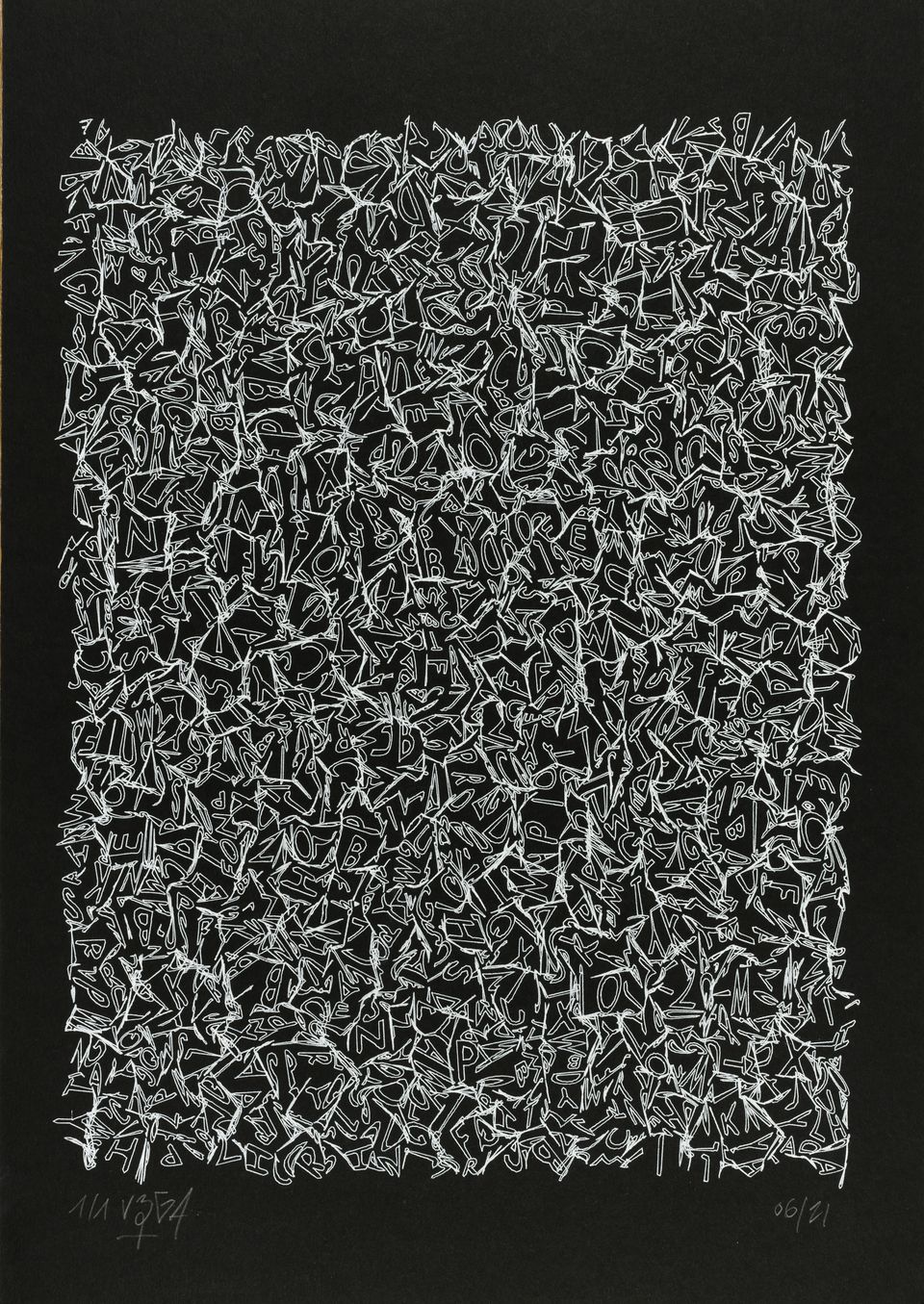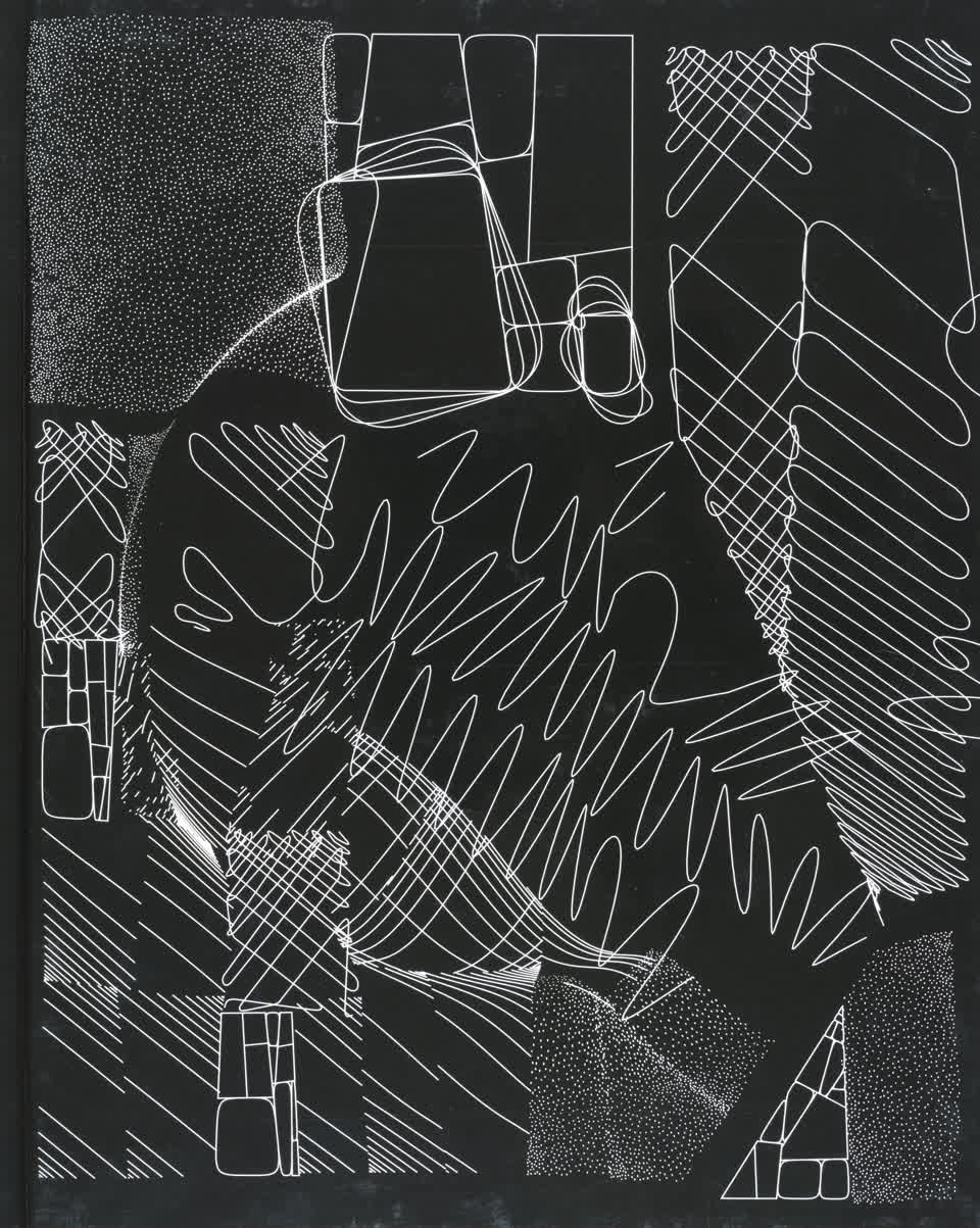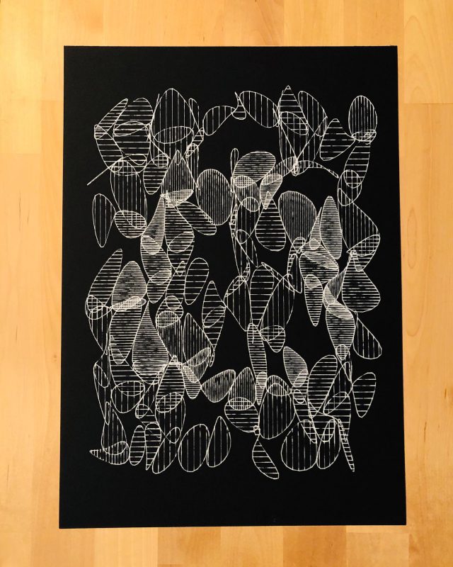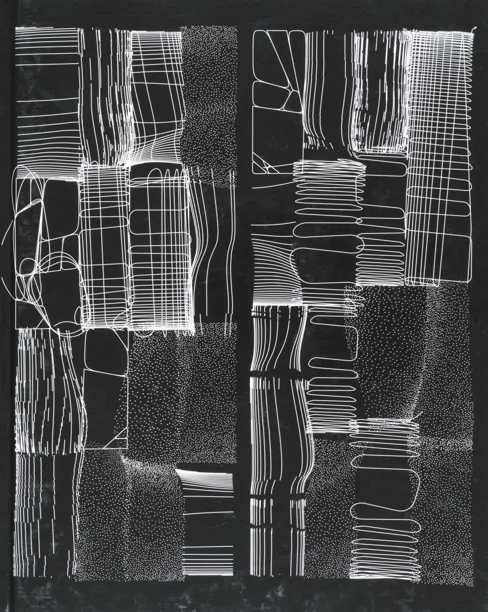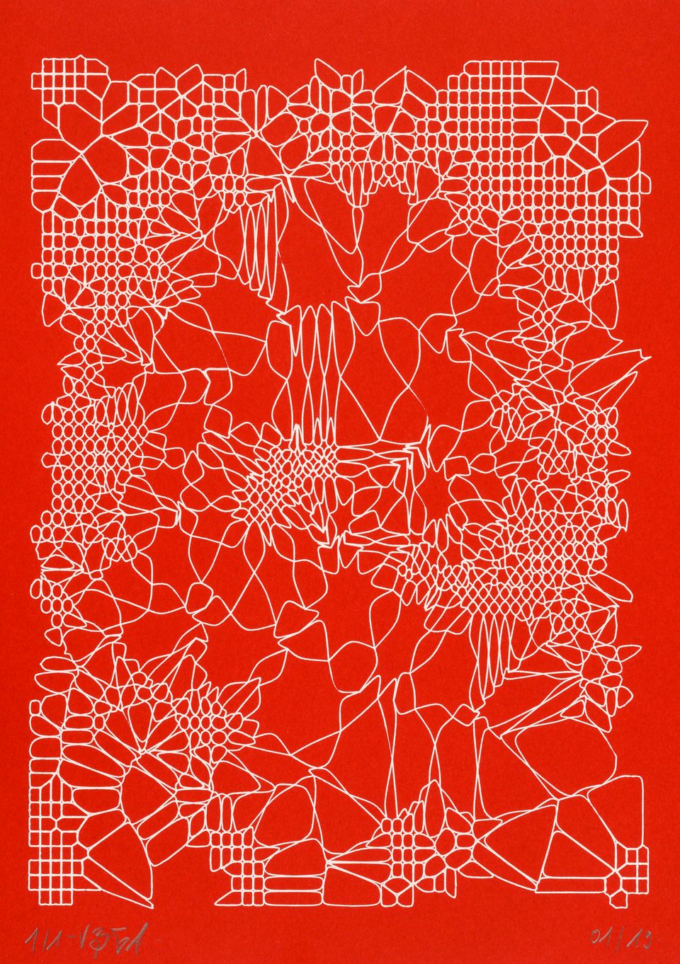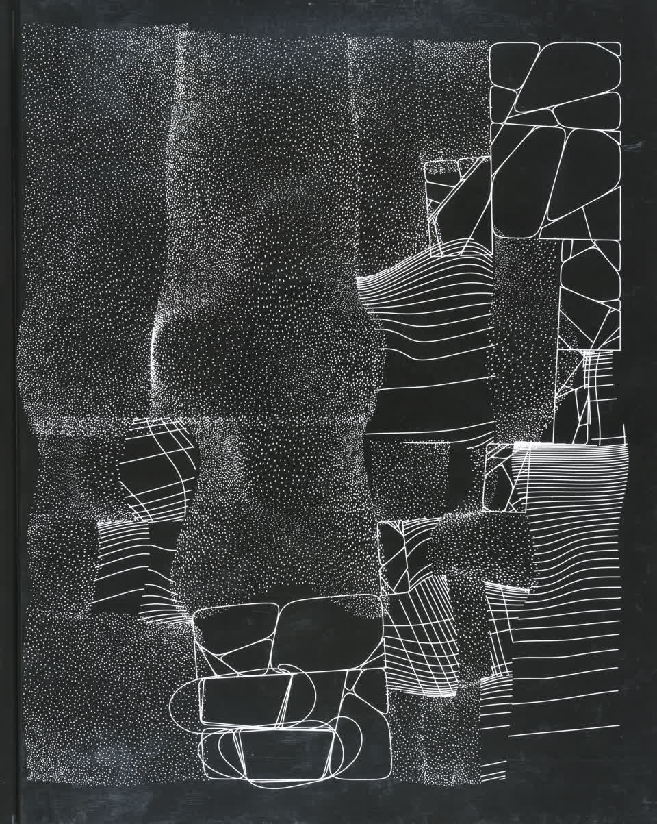 “Over the years, Julien Gachadoat has perfected working with minimal grids of thin white lines on black paper. With “Mineral” he pushes this exploration further by extending his work with a range of artificial life simulations and distortions. The result is a series of dynamic forms that fit together as a series, but where each image is distinct through different layers of texture and form. “Mineral” uses the structure of a grid as a playground for autonomous agents to wander around according to simple, discrete movement rules. Their local interactions lead to the creation of unpredictable sparse or dense geometric areas filled with lines. The images have many references from spiderwebs to broken glass, but they aren’t based on any specific natural phenomena. The forms emerge through the code that Julien created for building his own worlds.”