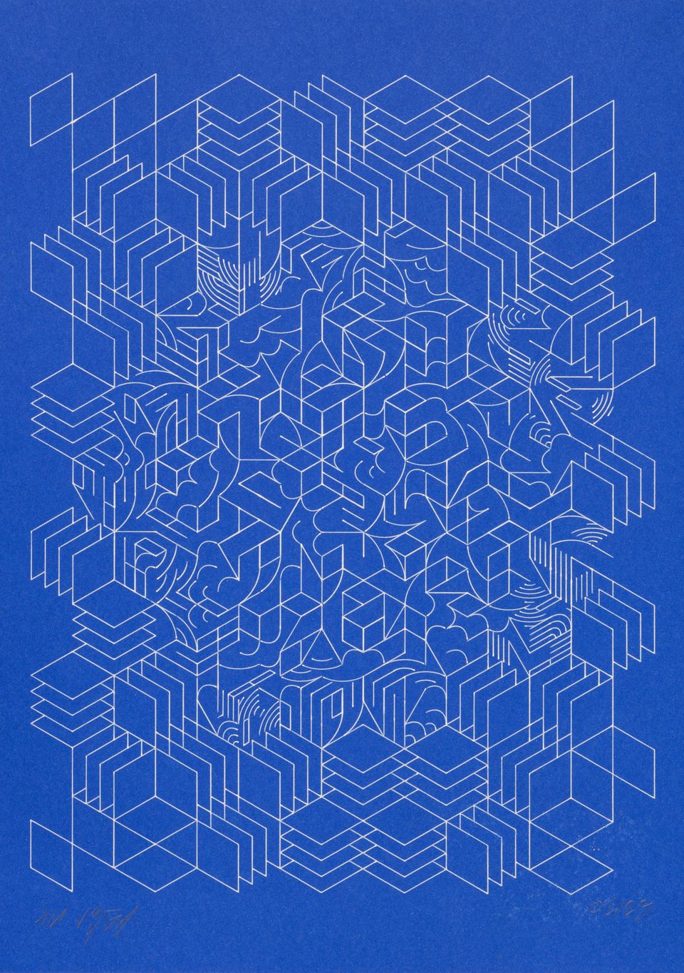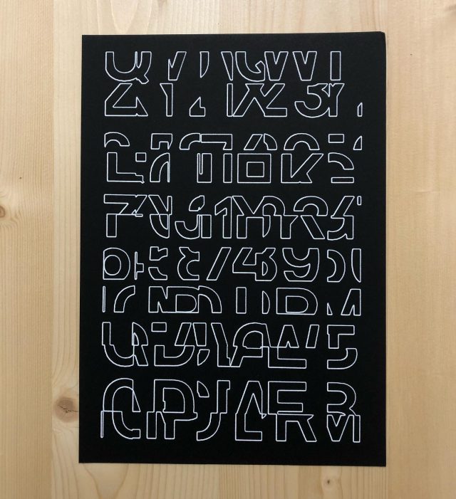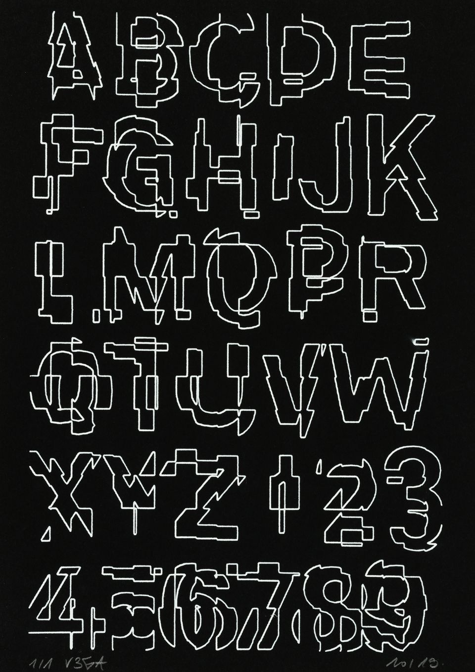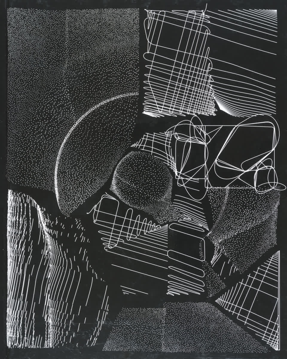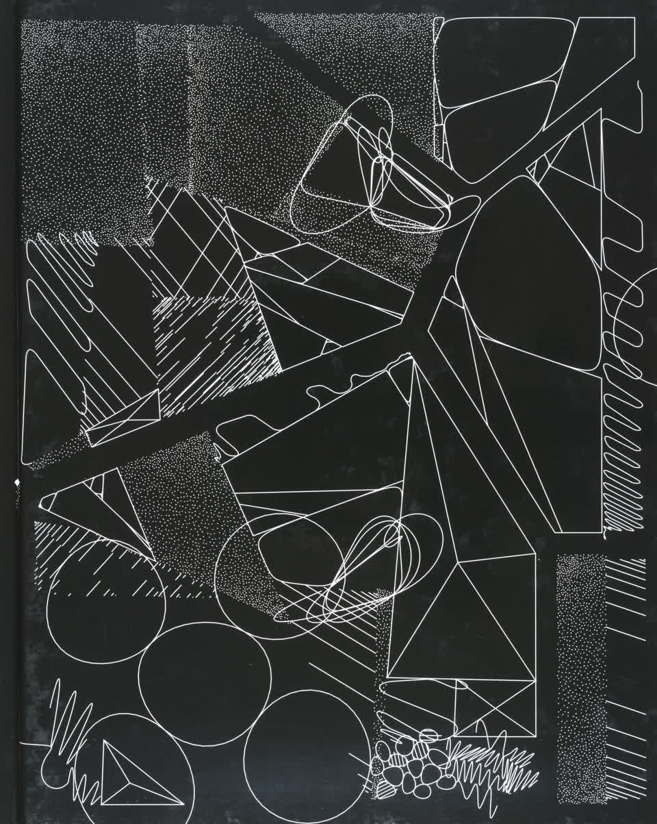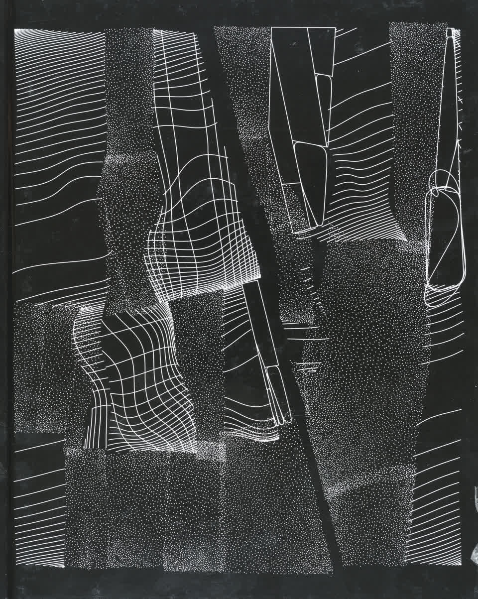 The forms that are subdivided with lines are made from the contours of letters drawn from the Futura font.