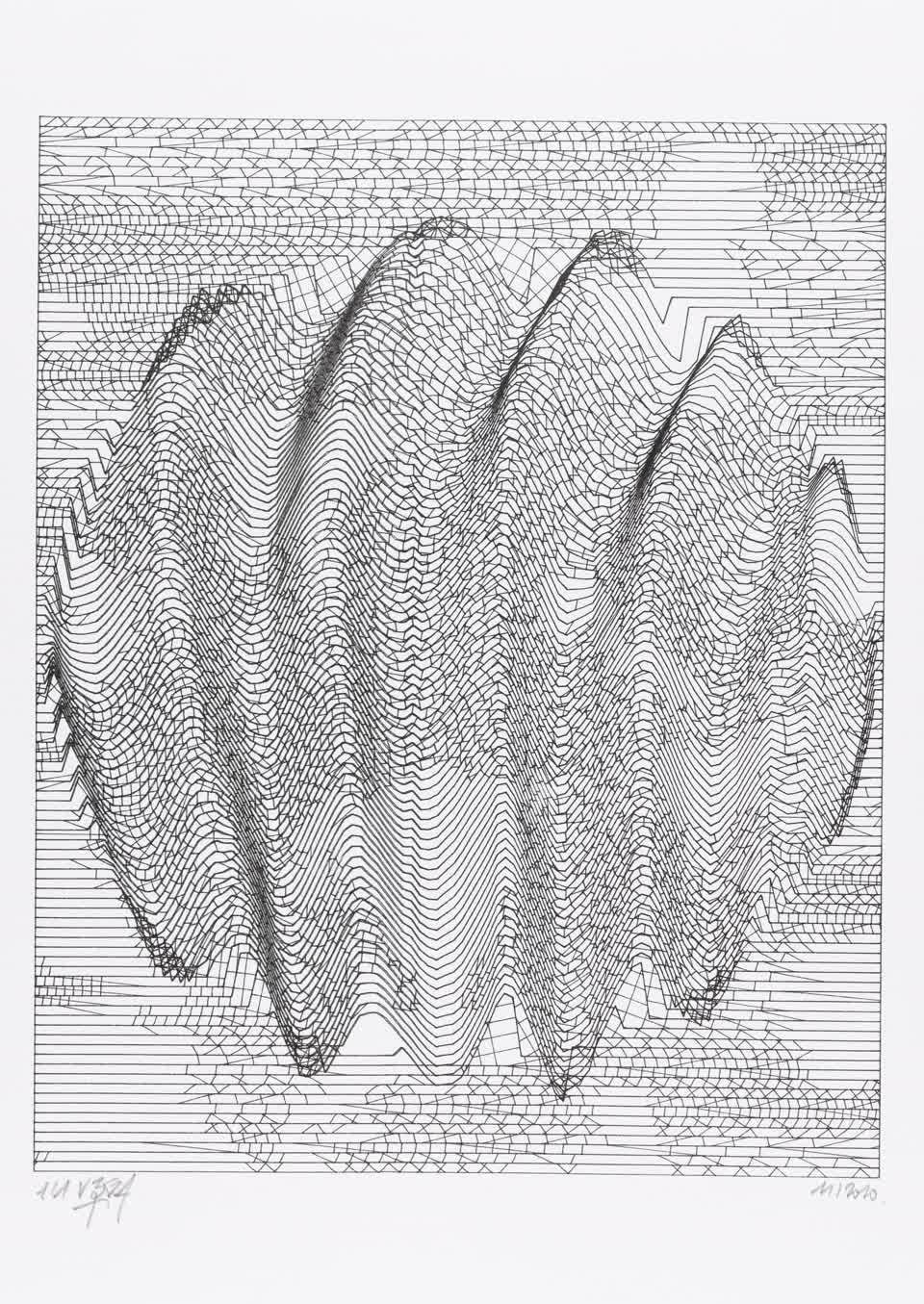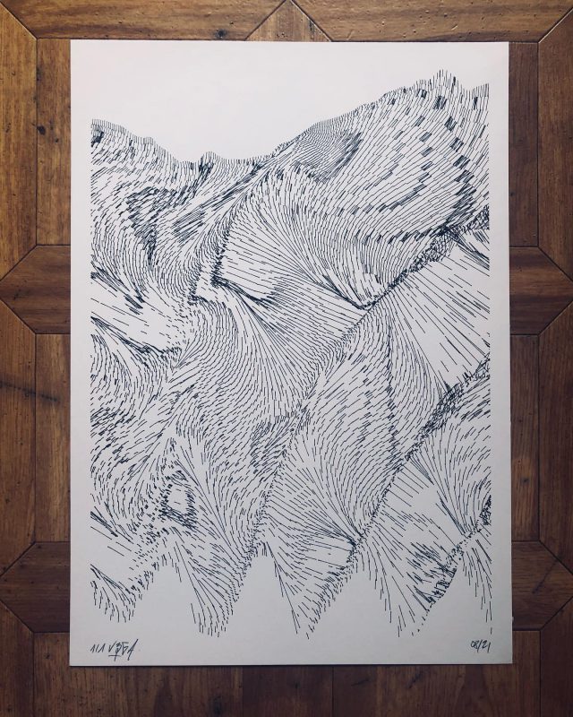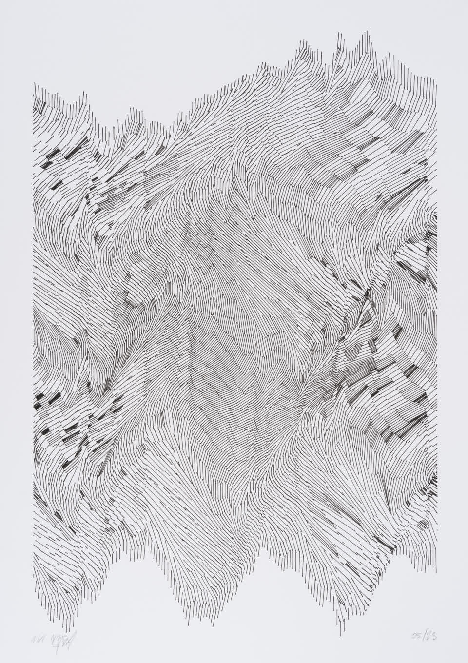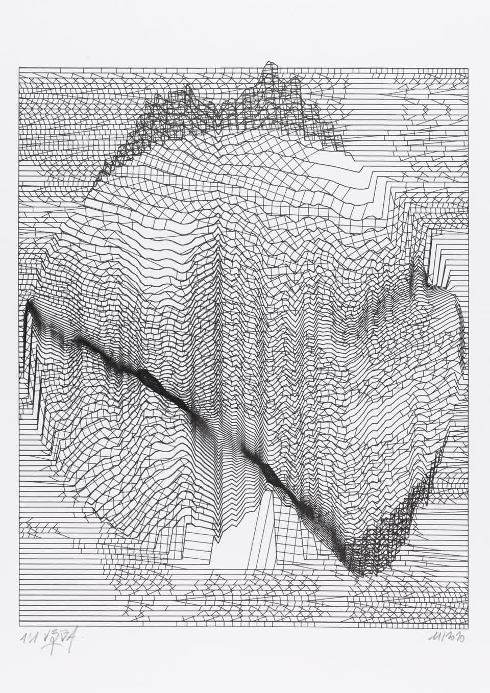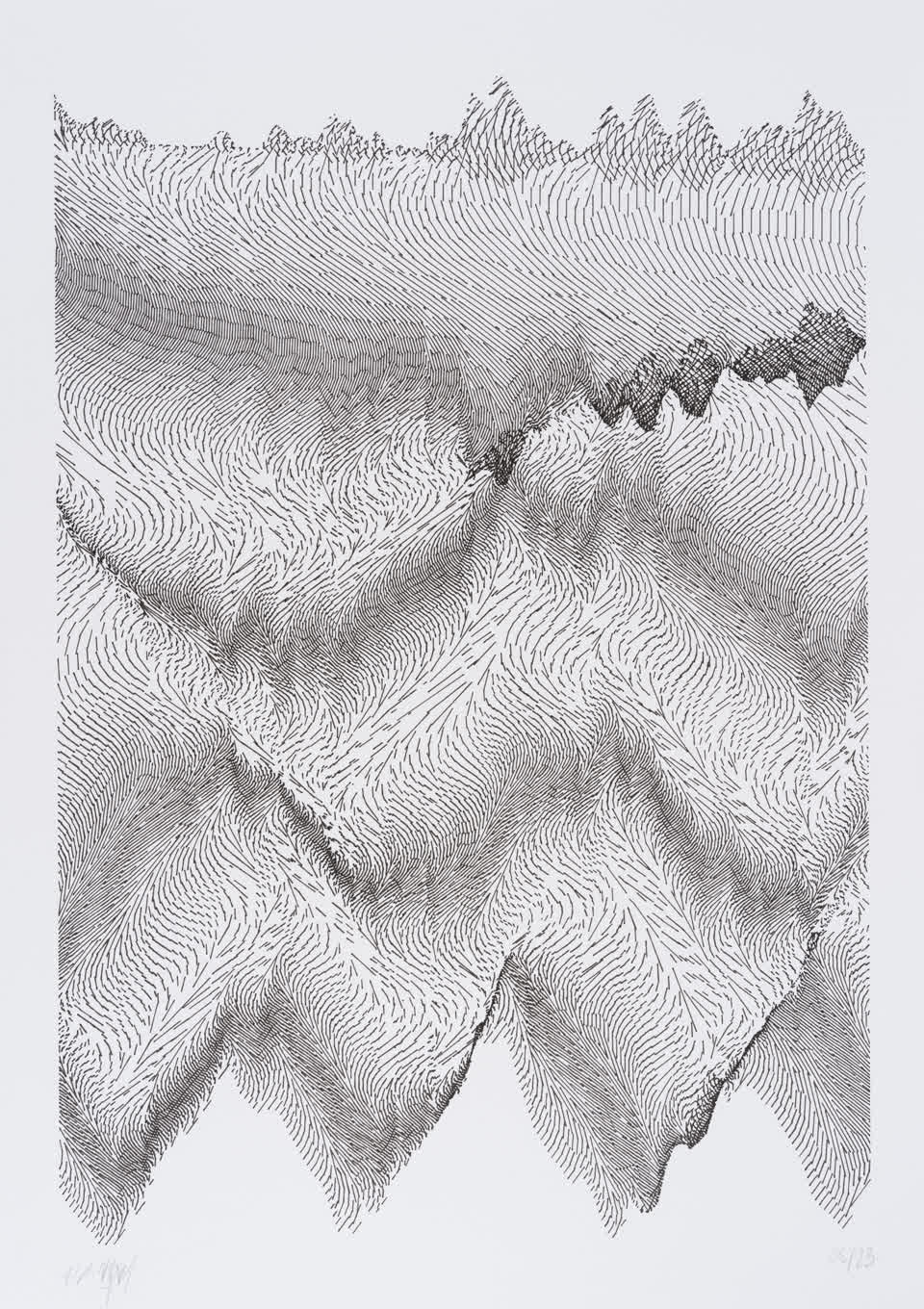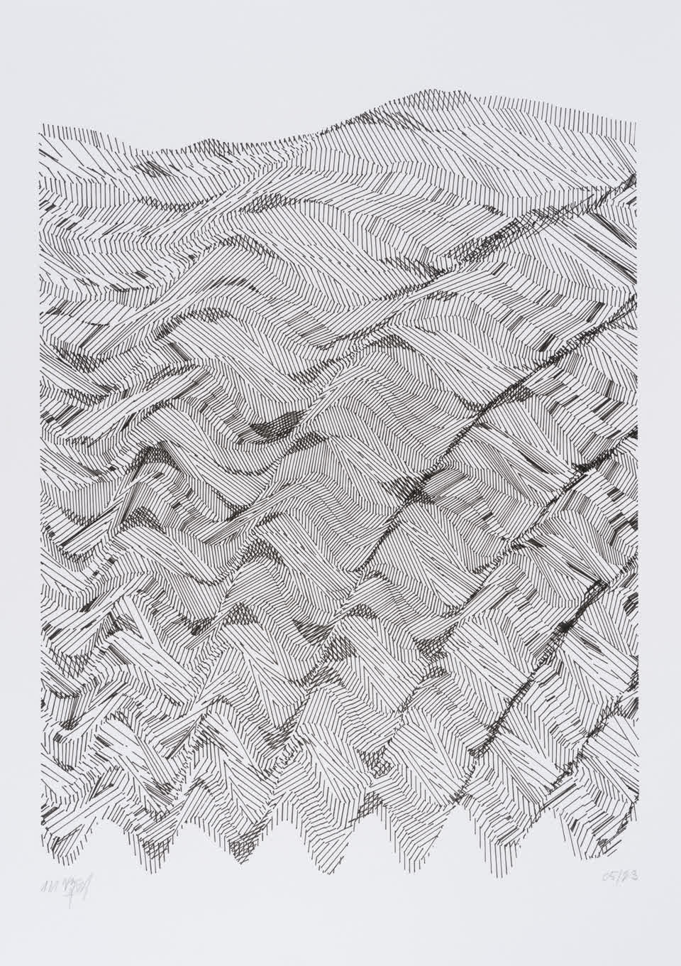 The interstices between two sine waves are then filled with vertical stripes whose orientation and density depend on some spatial rules, but also random numbers which introduce irregularities and breakage areas, resulting in mountain-like drawings.